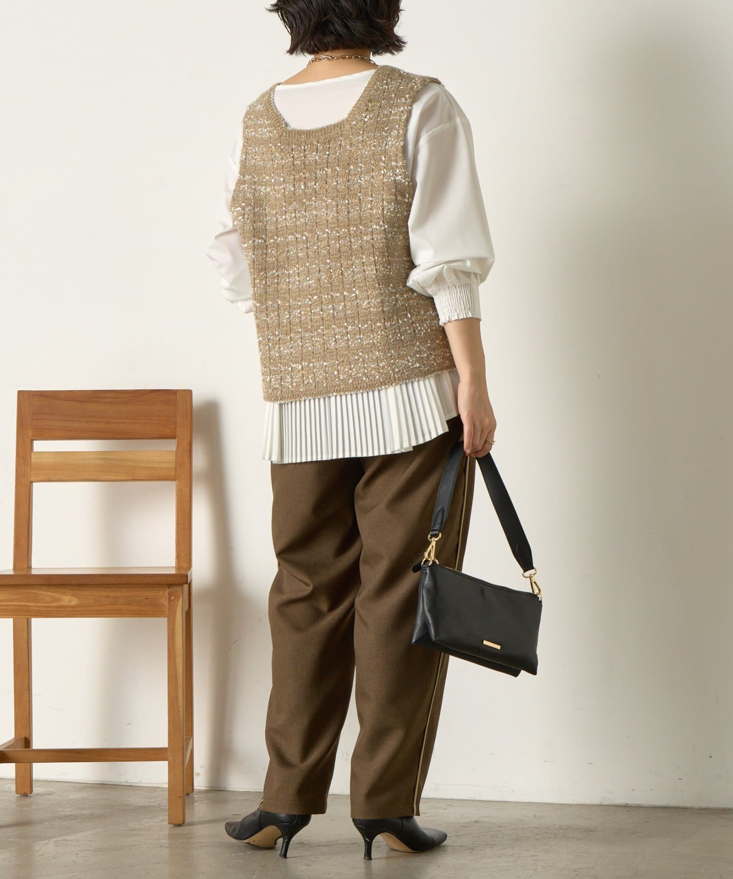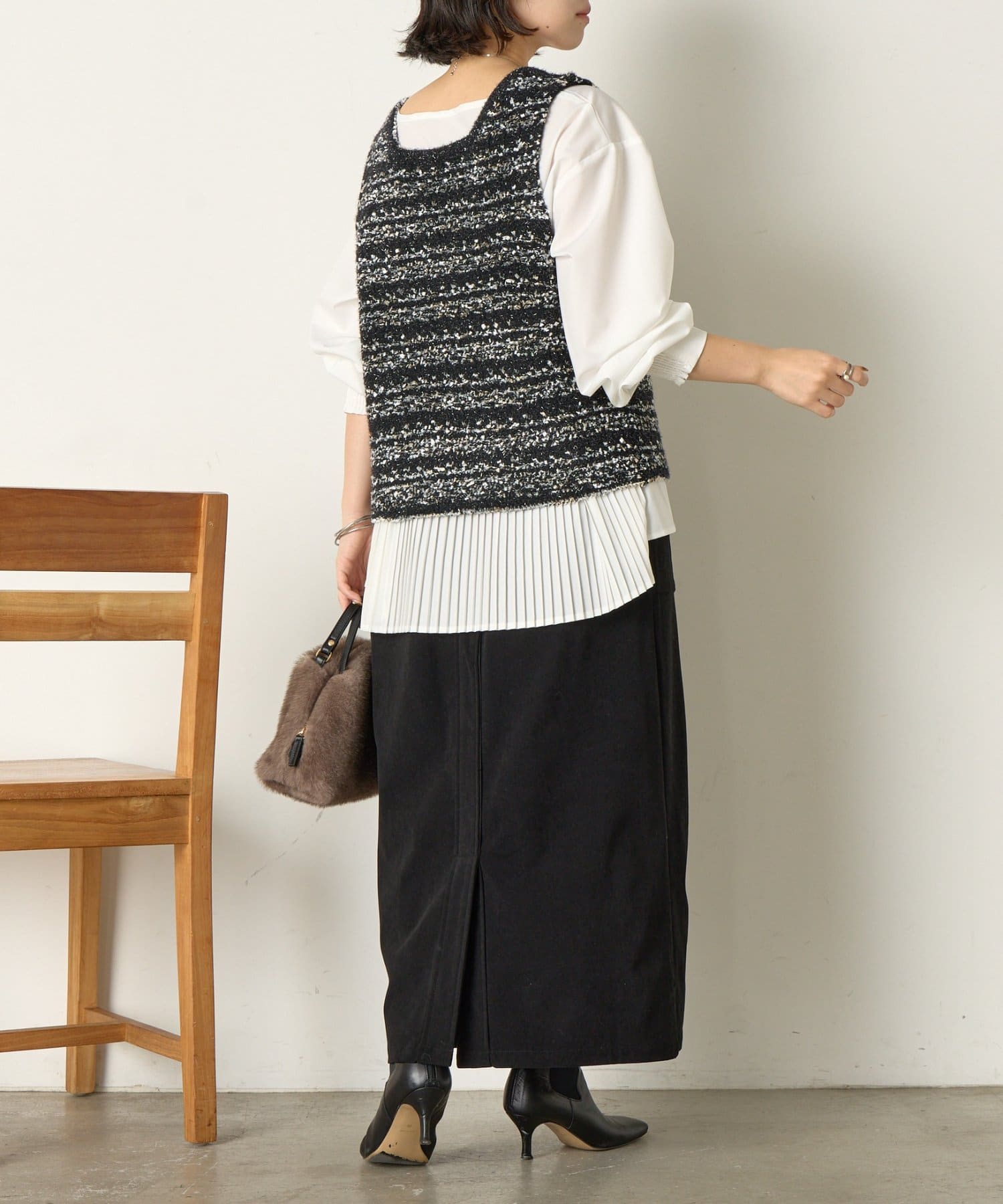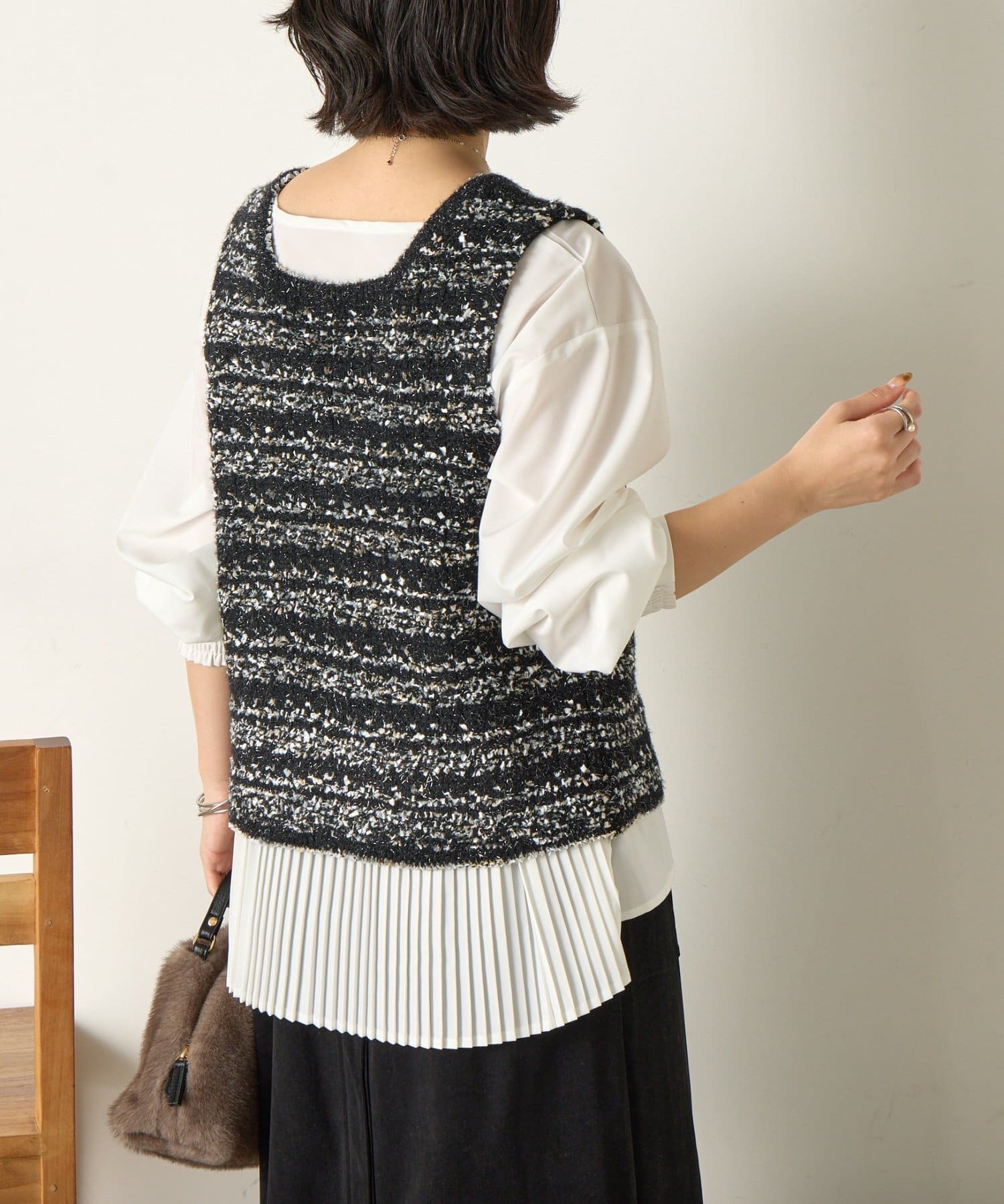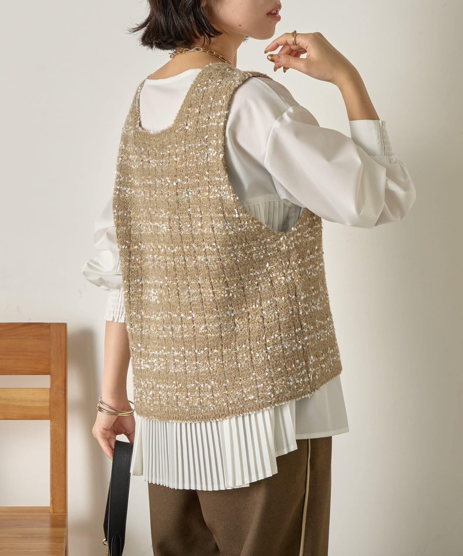 後ろのプリーツがスタイリングに動きを加えお洒落な表情に。
