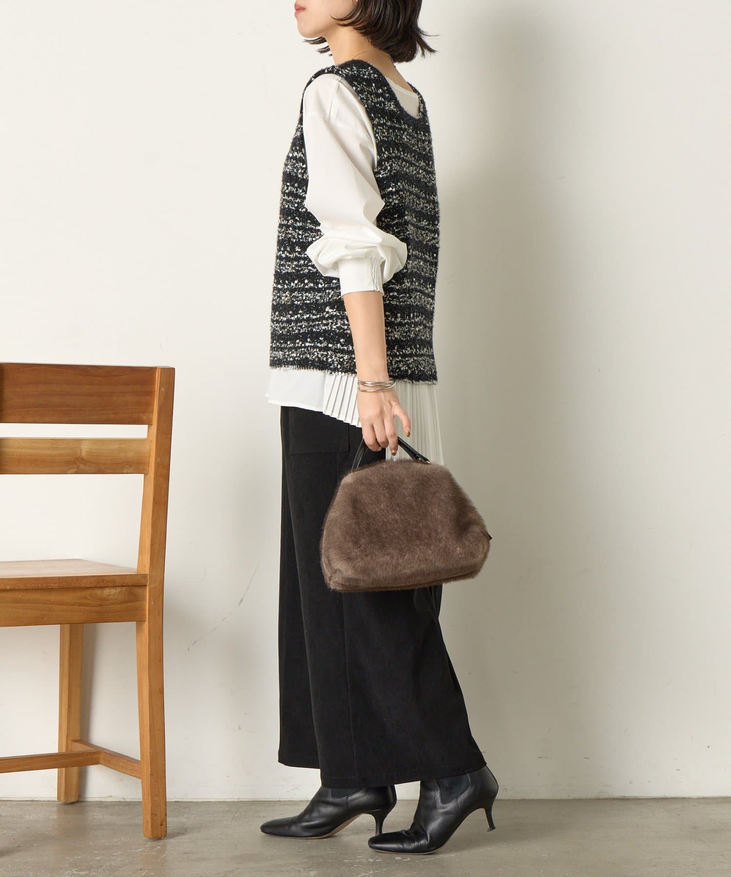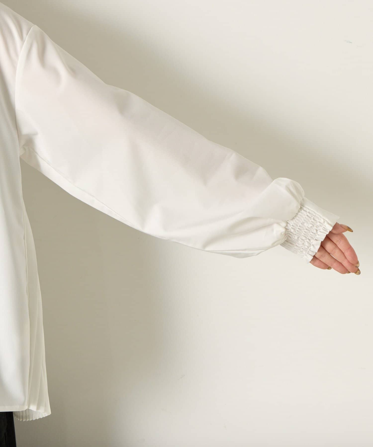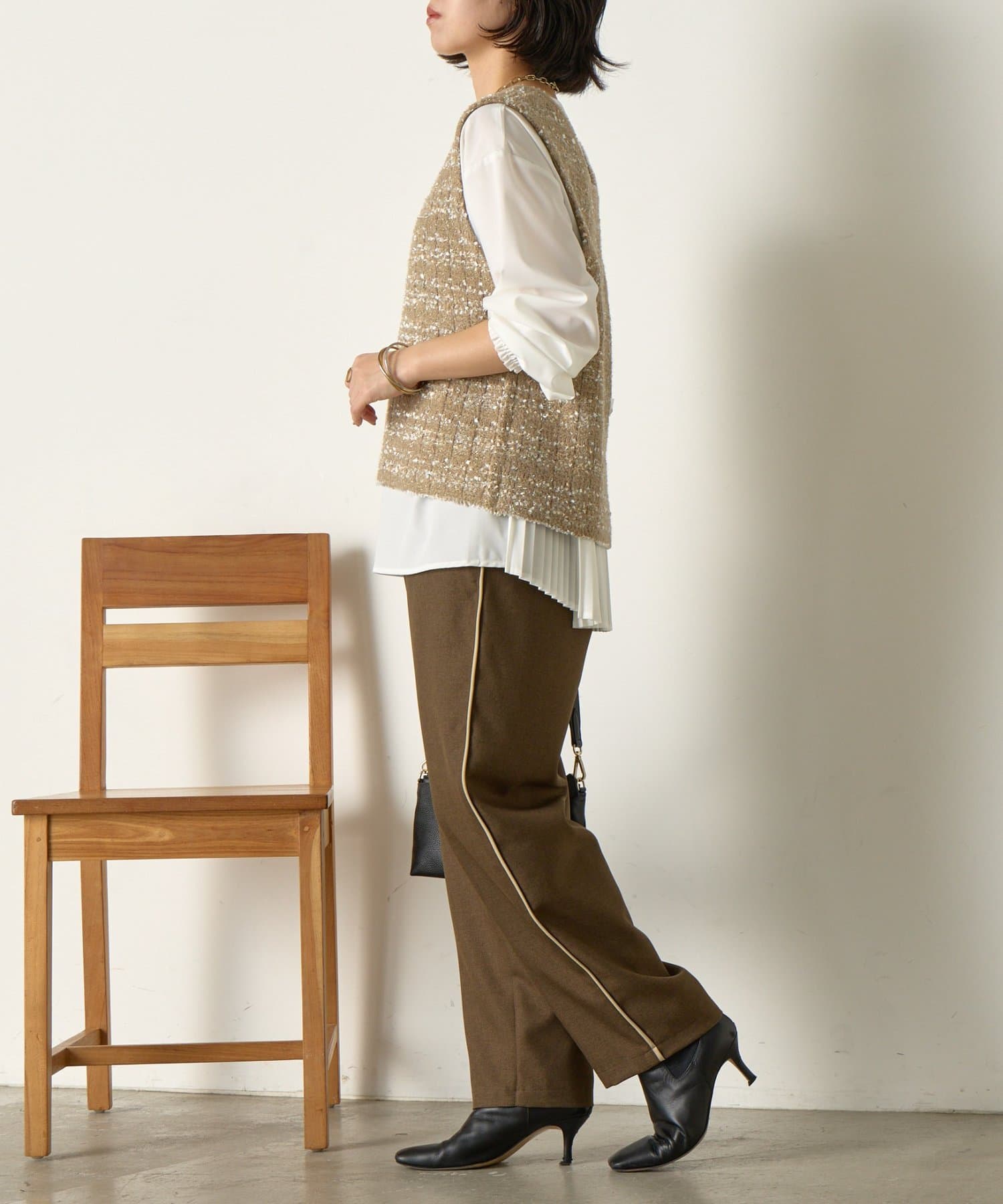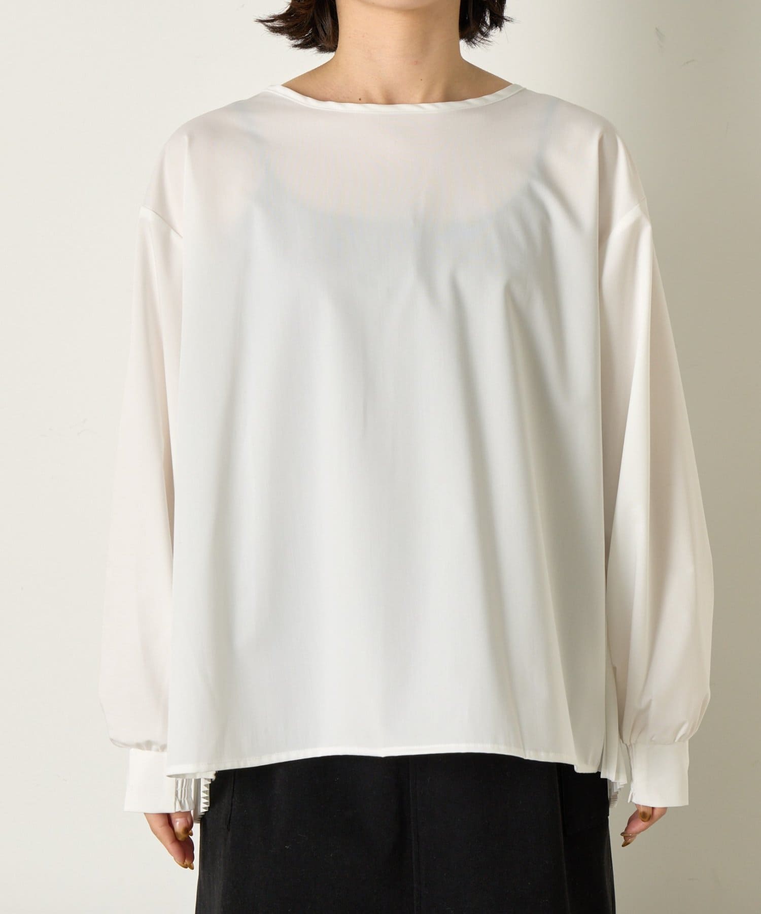 後ろのプリーツがスタイリングに動きを加えお洒落な表情に。