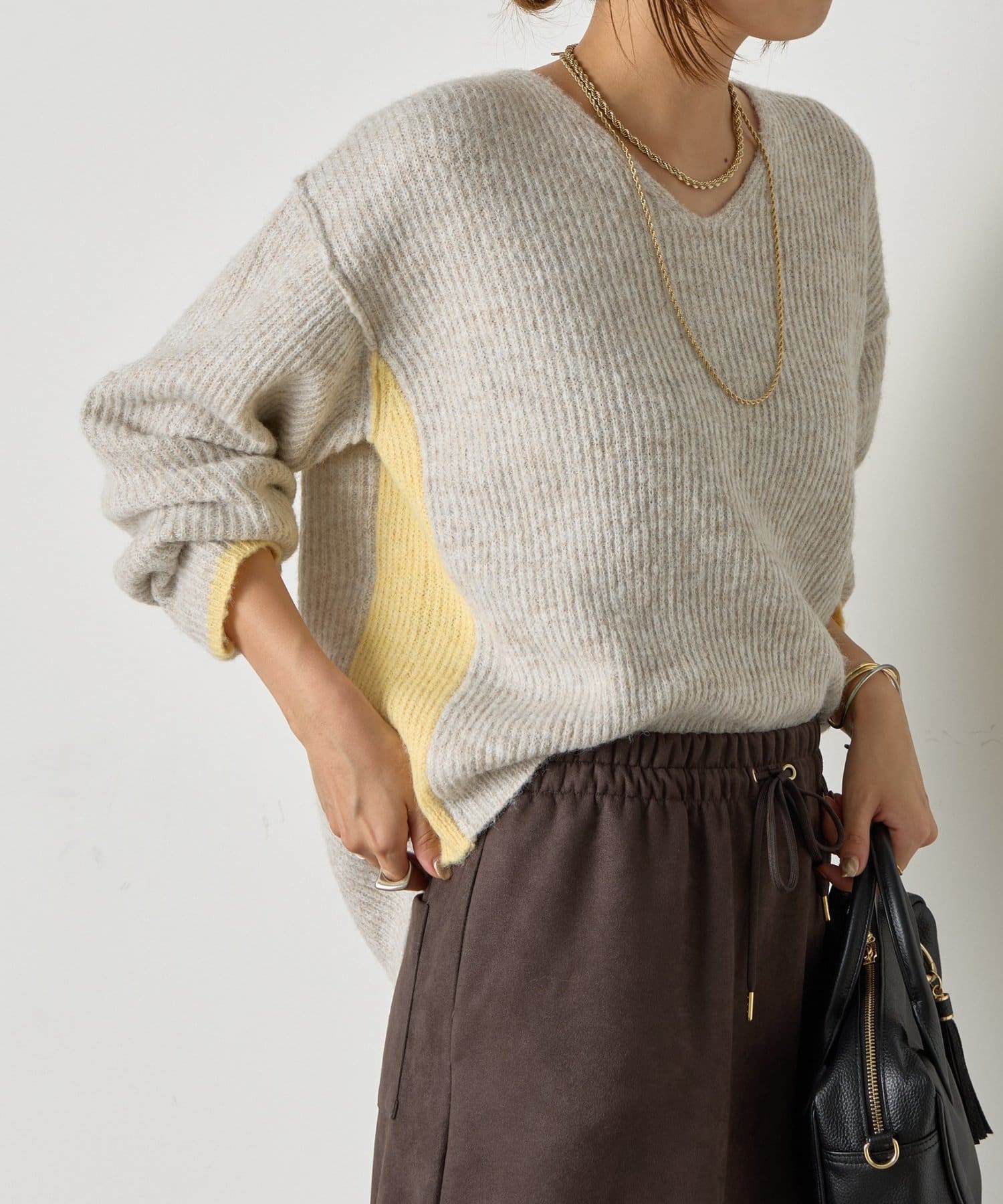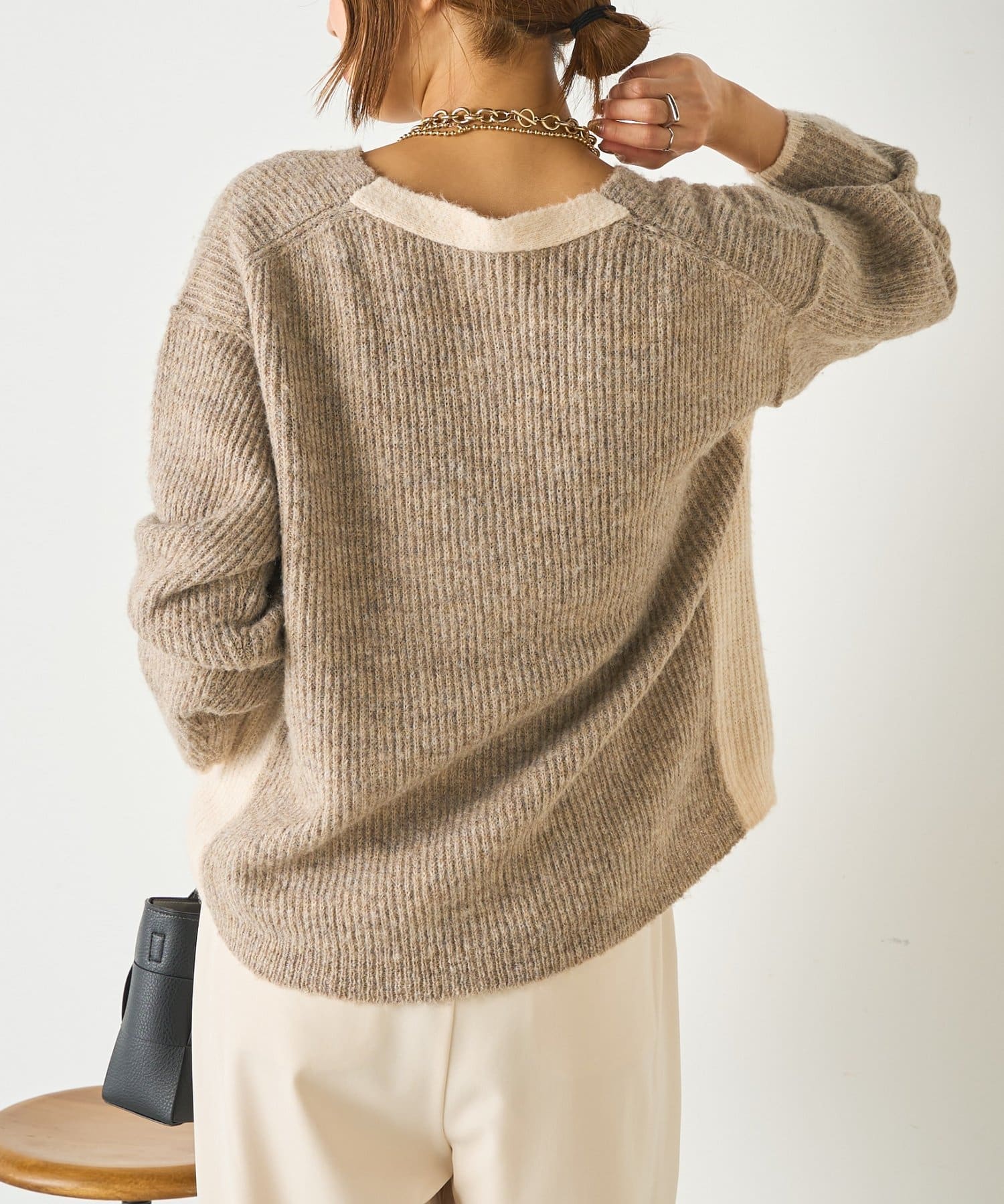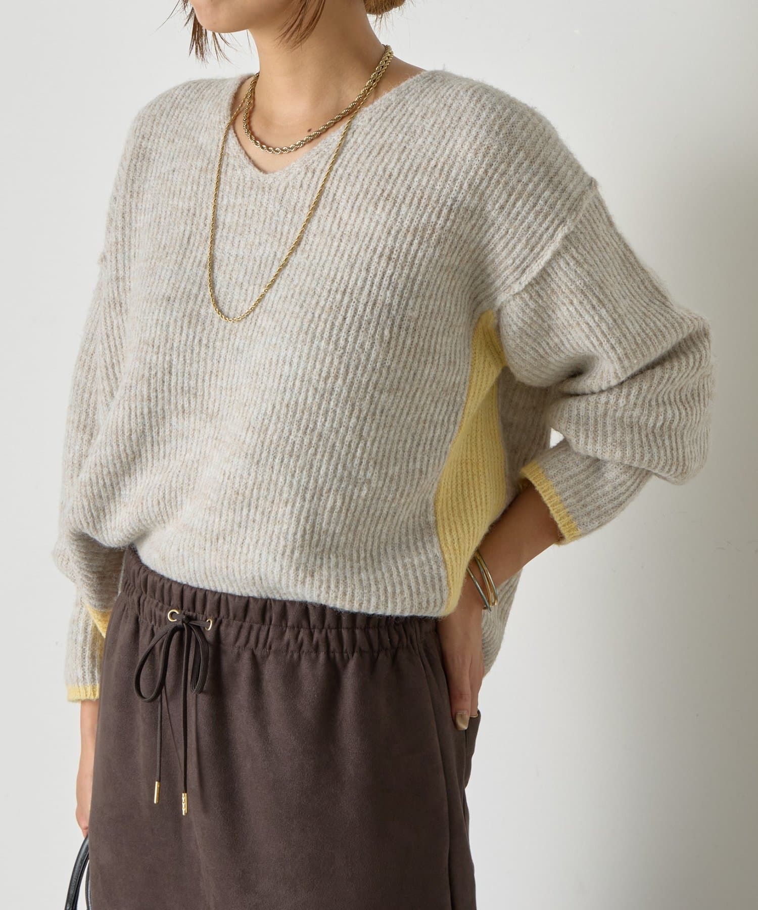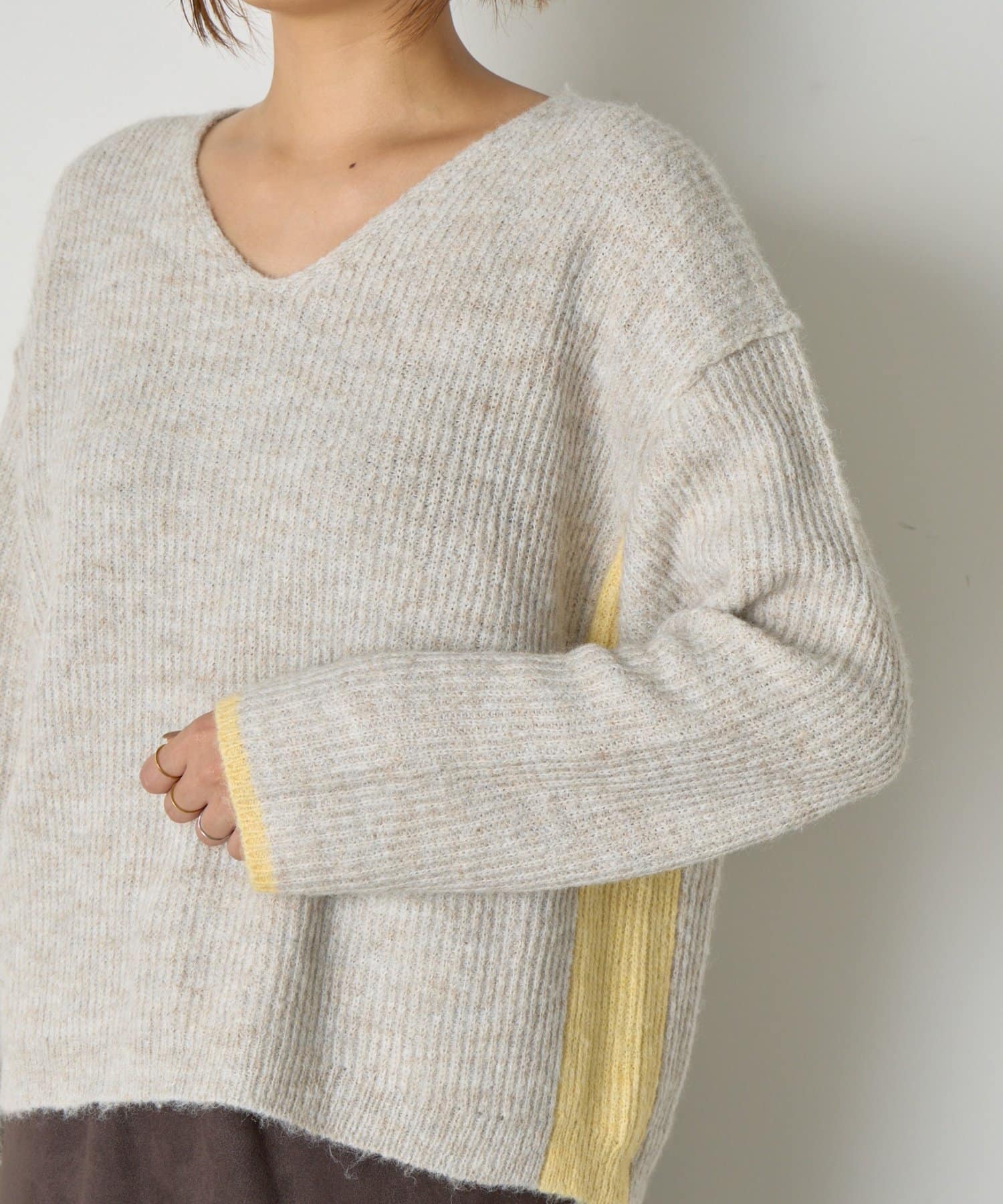 ・顔まわりをすっきり見せるVネックと、目を引く配色デザインがポイントのニット。