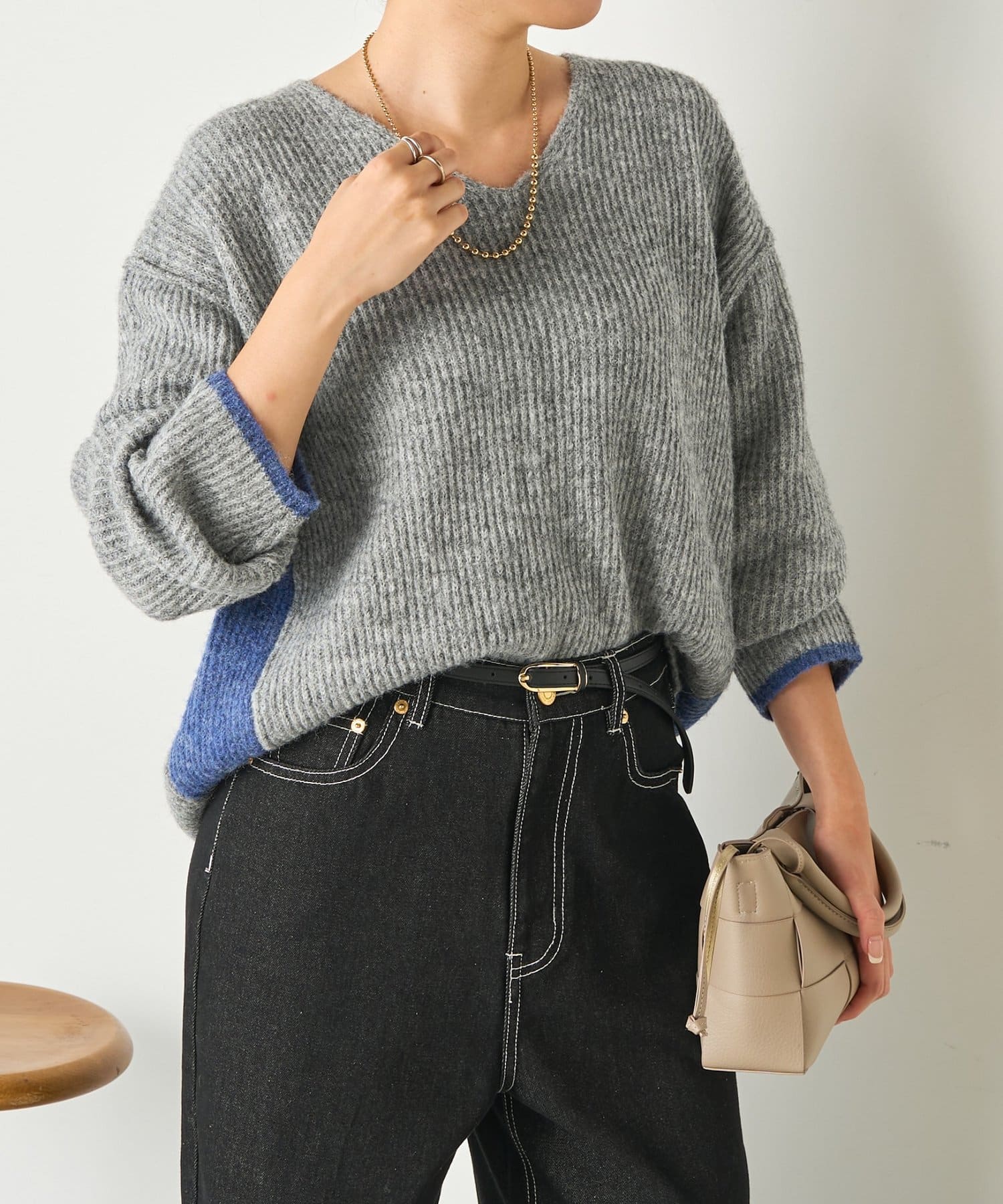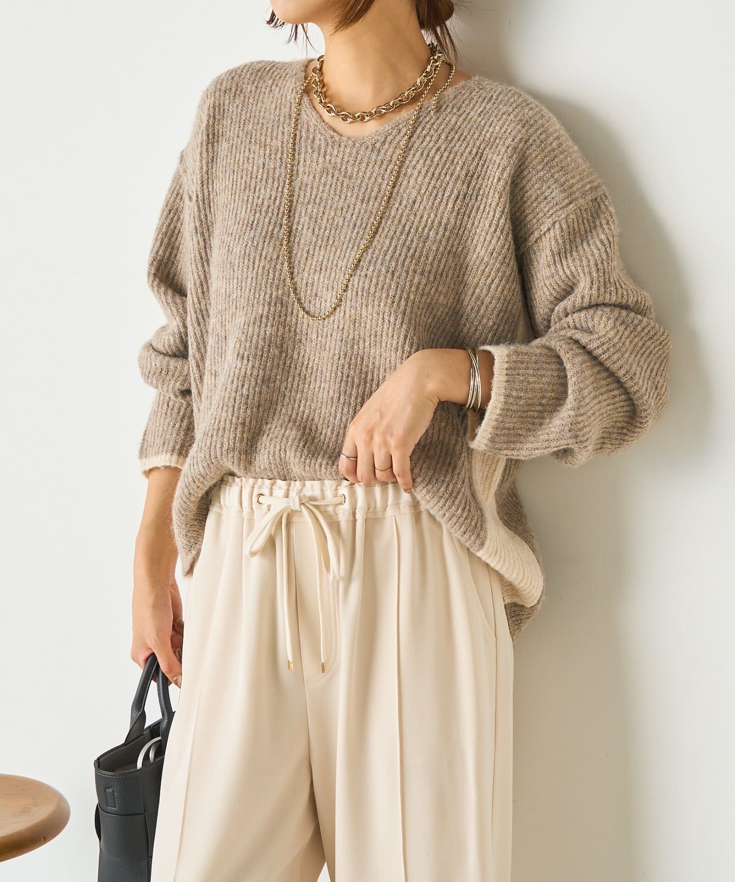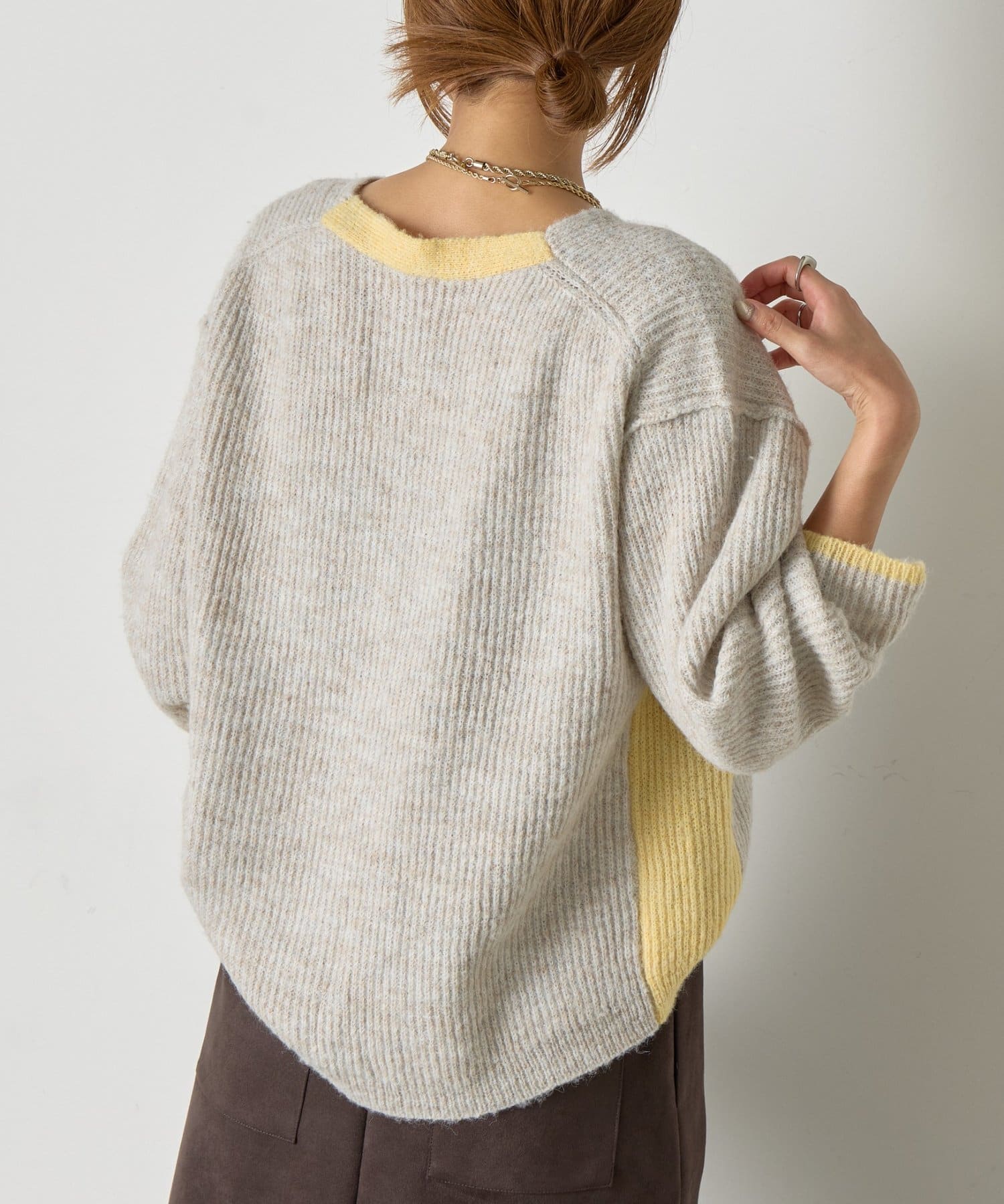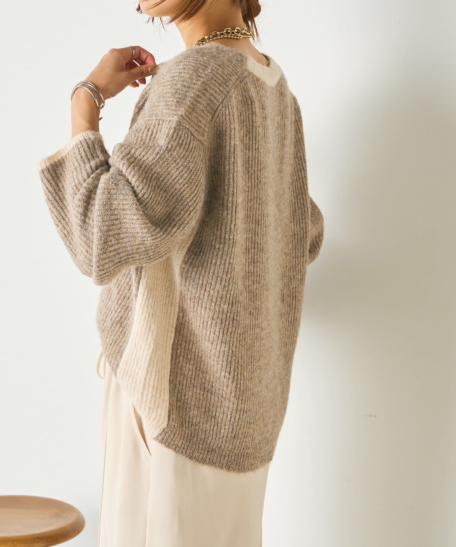 ・顔まわりをすっきり見せるVネックと、目を引く配色デザインがポイントのニット。