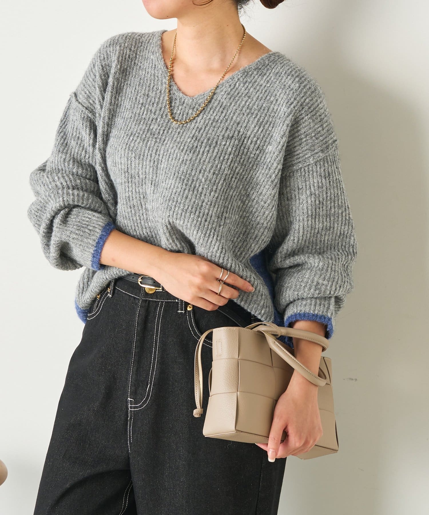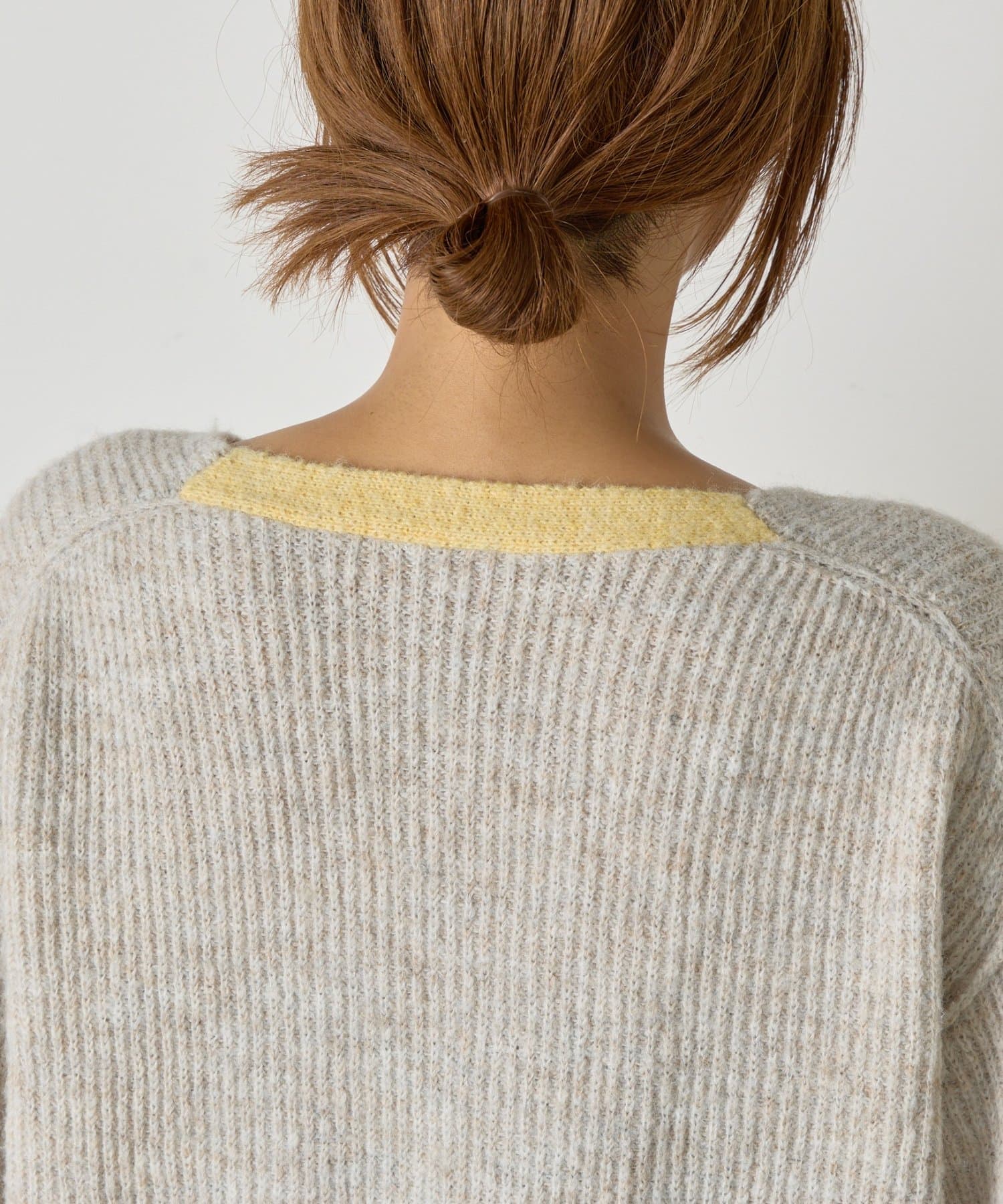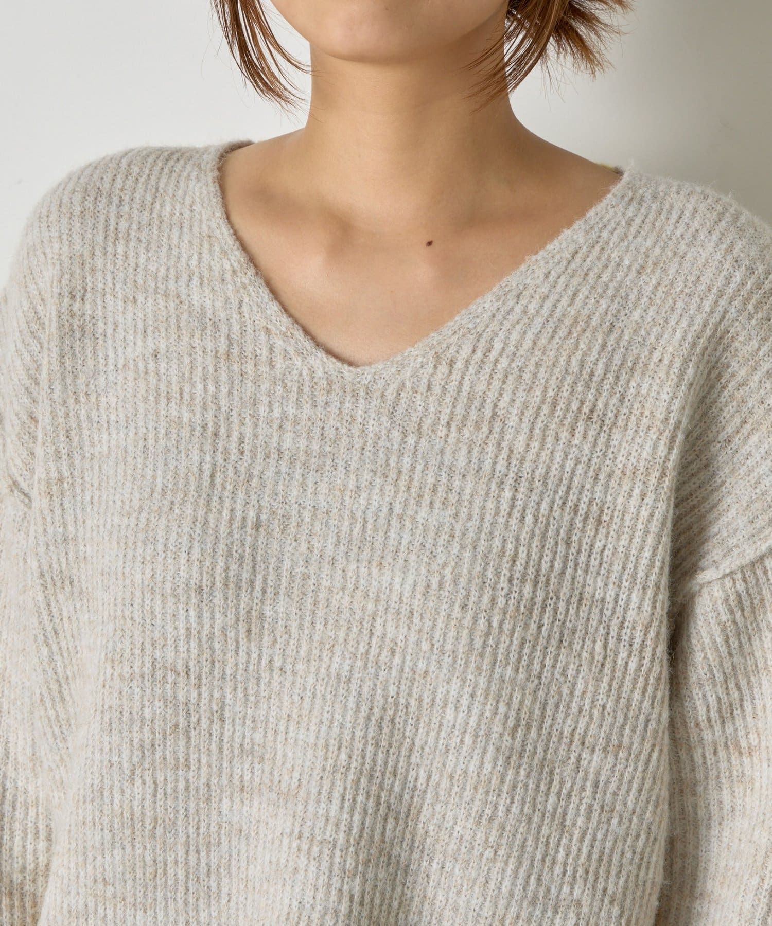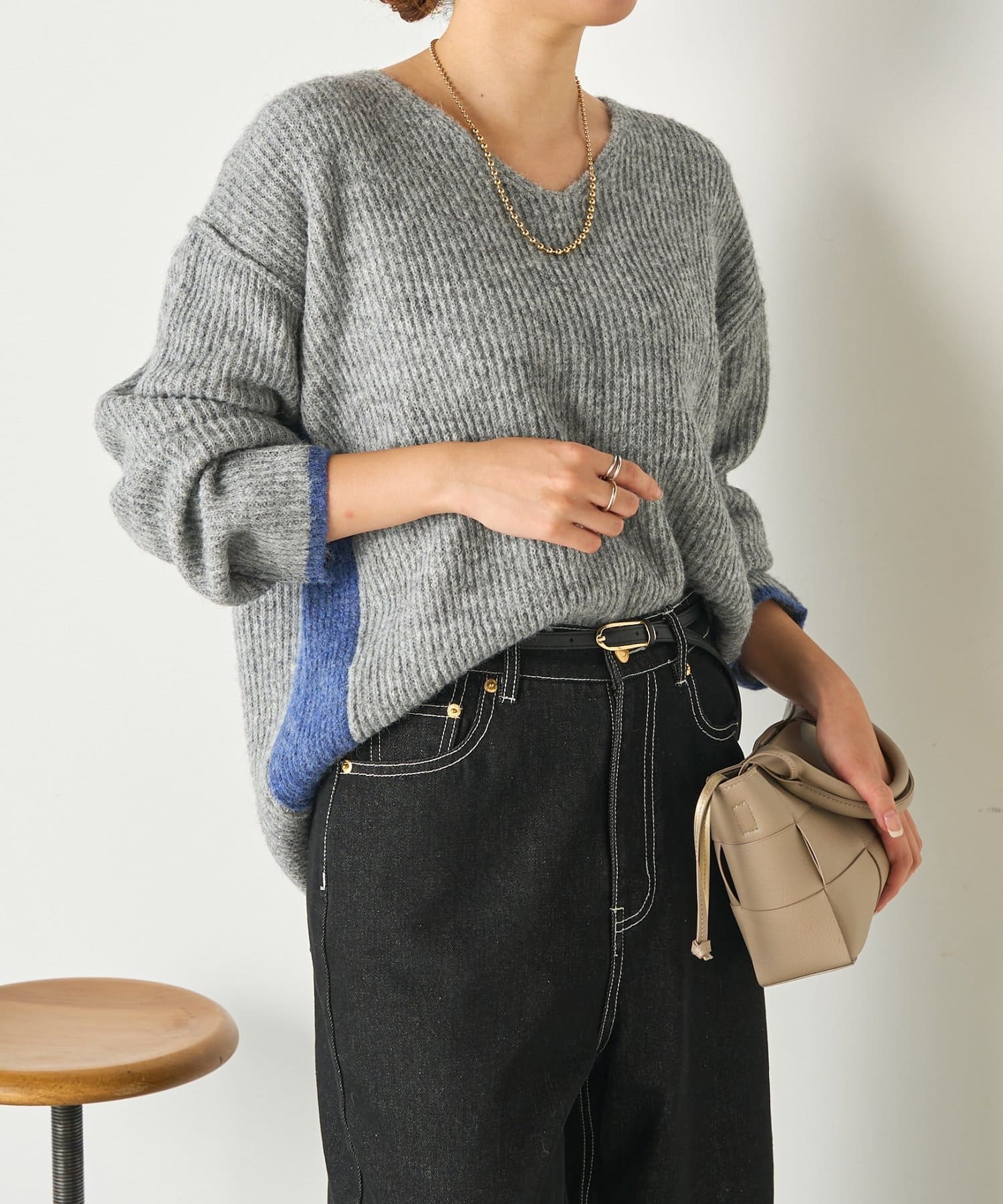 ・顔まわりをすっきり見せるVネックと、目を引く配色デザインがポイントのニット。