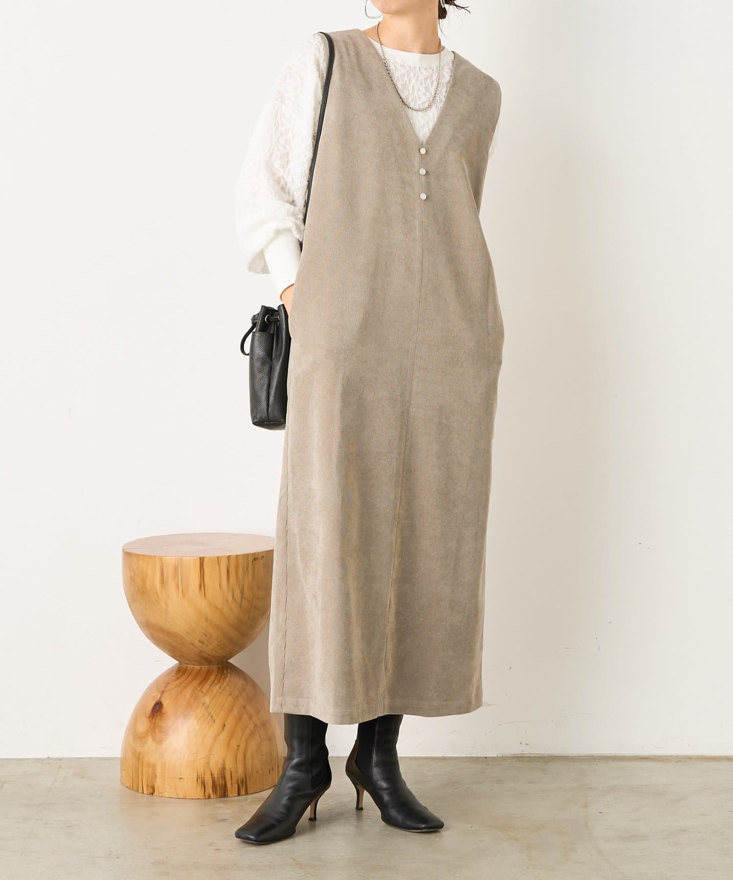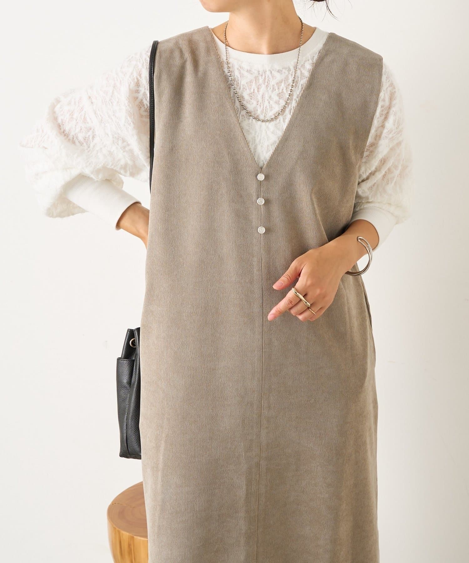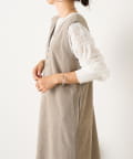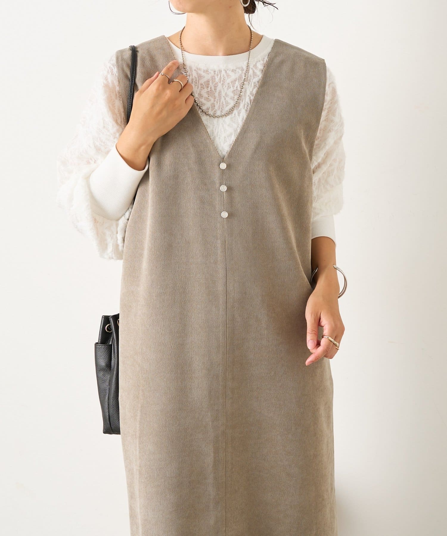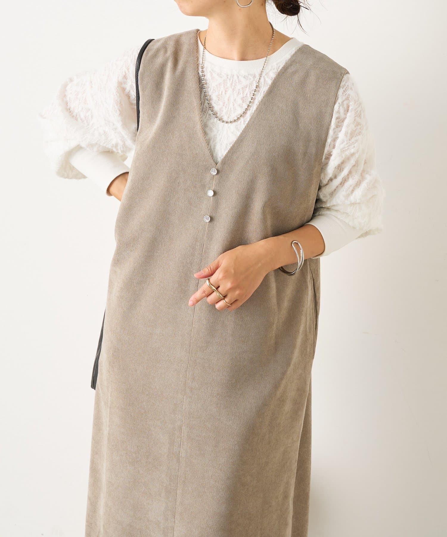 ・胸元にボタンを施した、オトナ可愛いジャンパースカート。