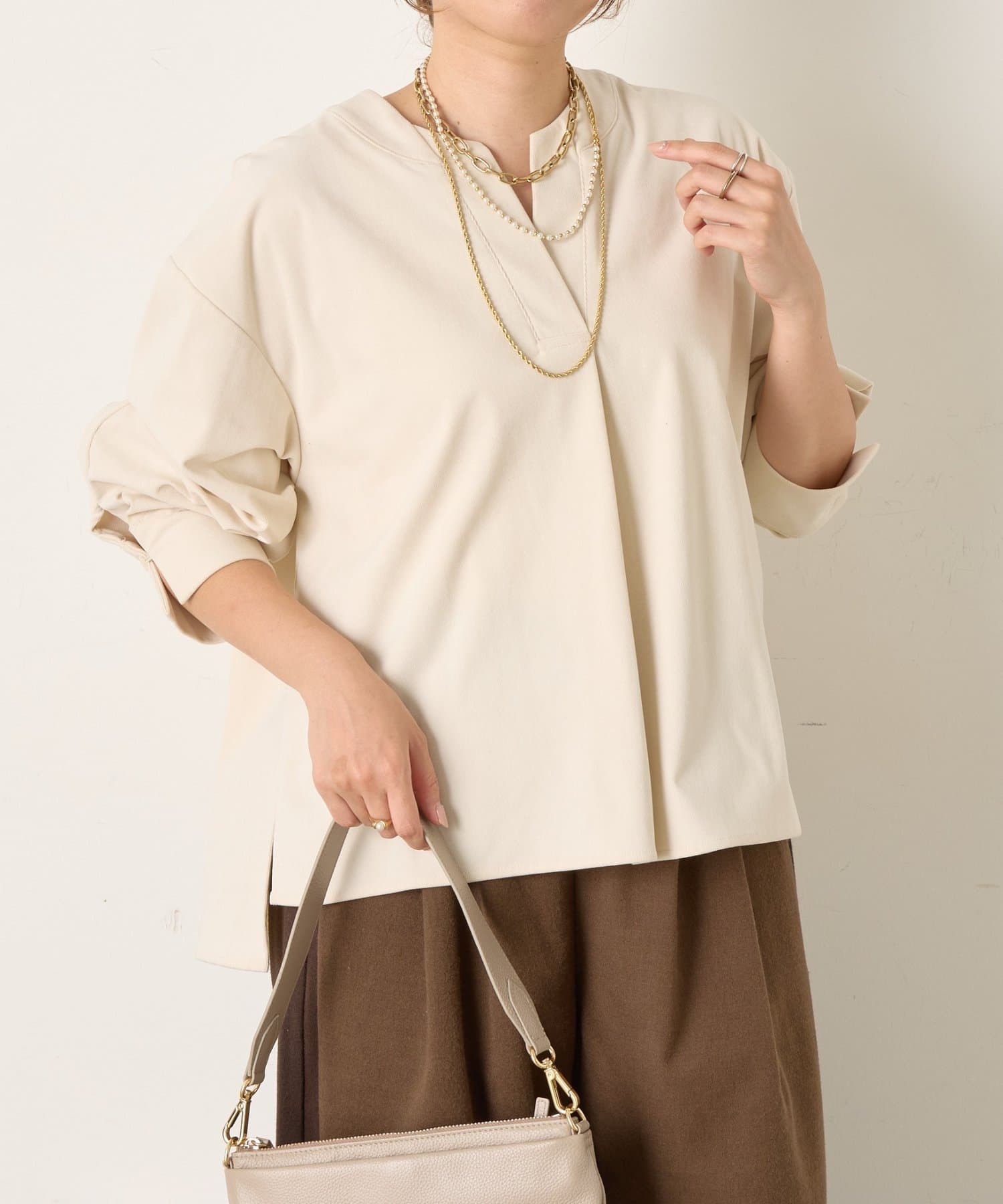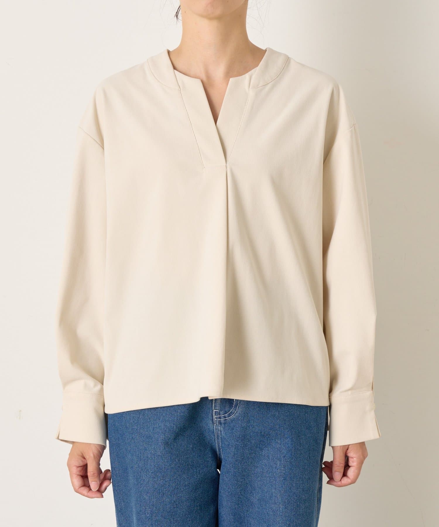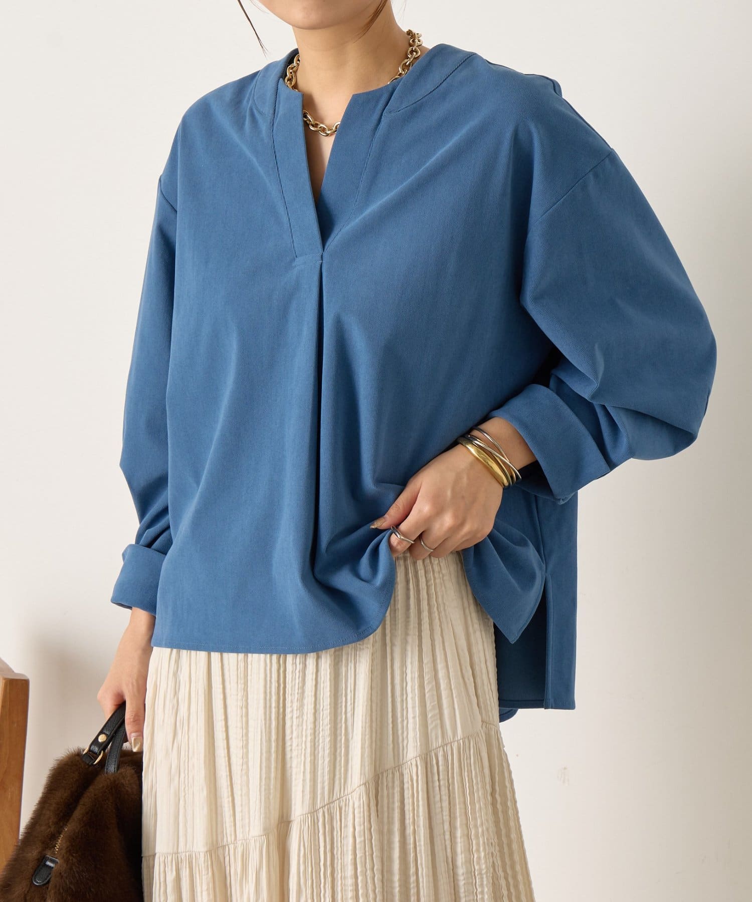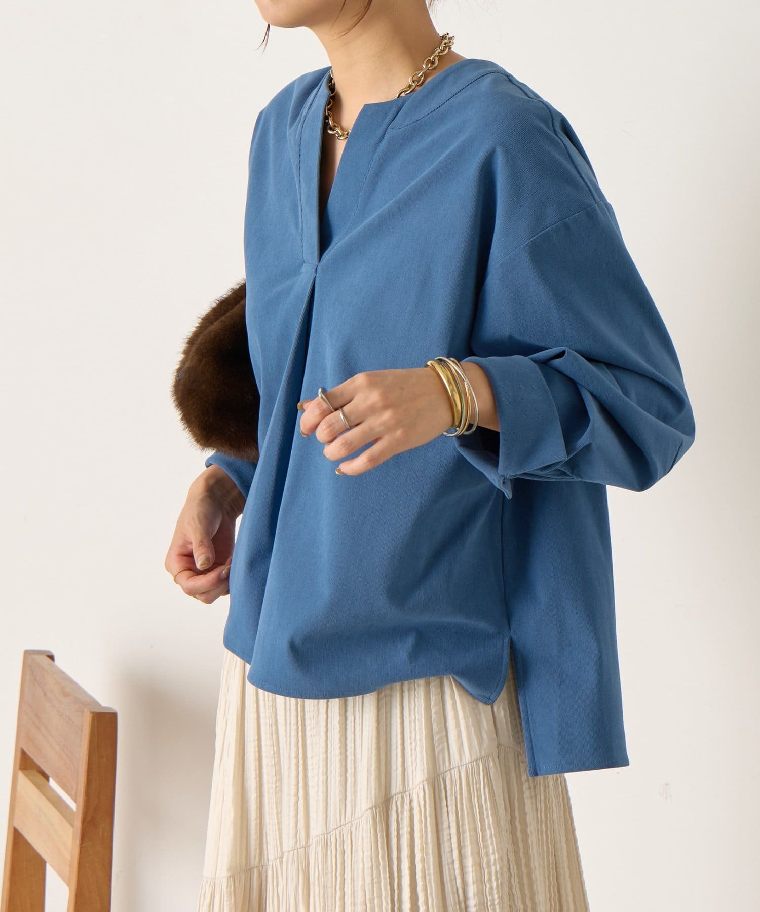 ・すっきりとした印象のVスキッパーネックがポイントのプルオーバーブラウス。