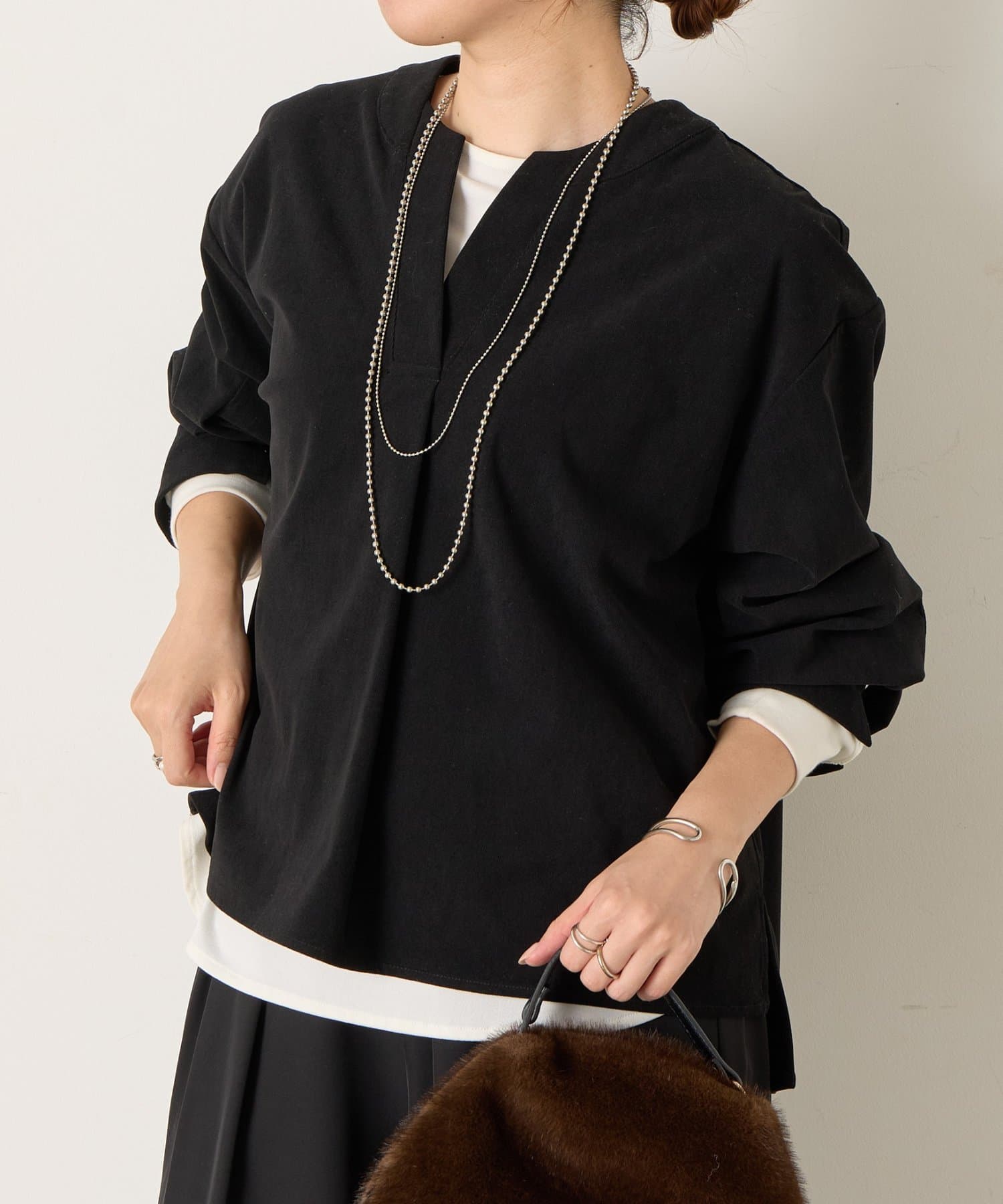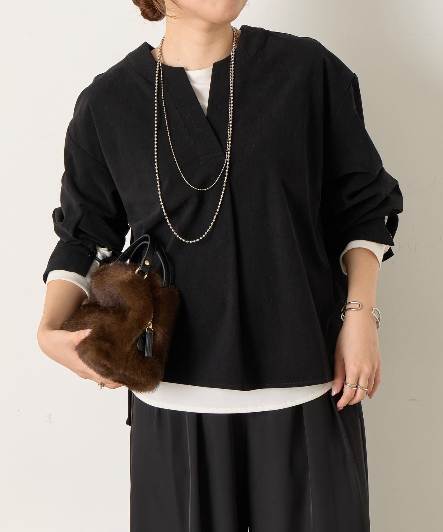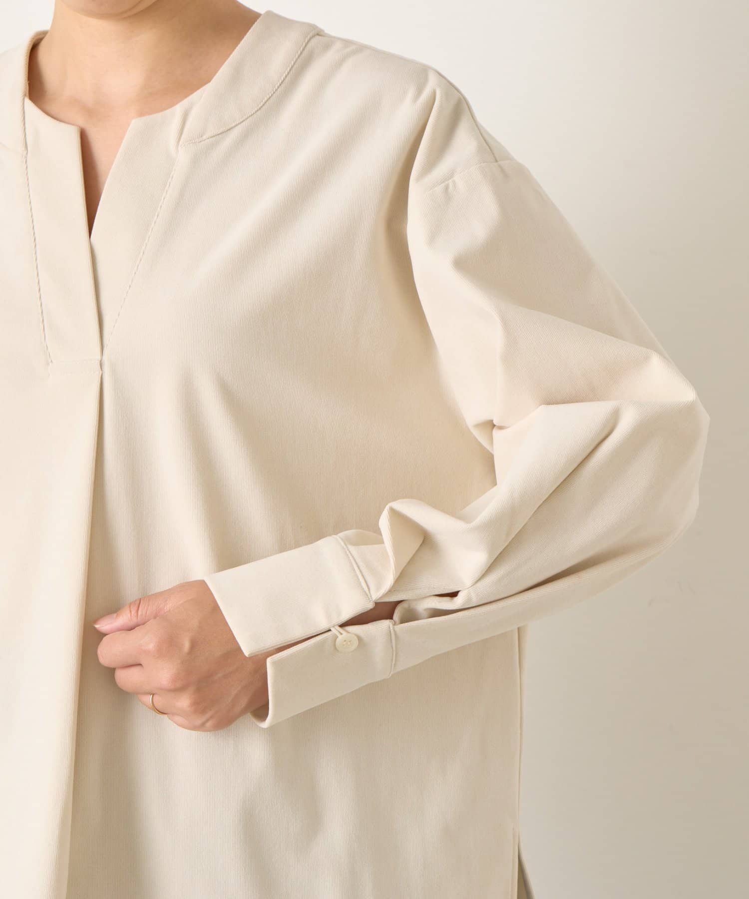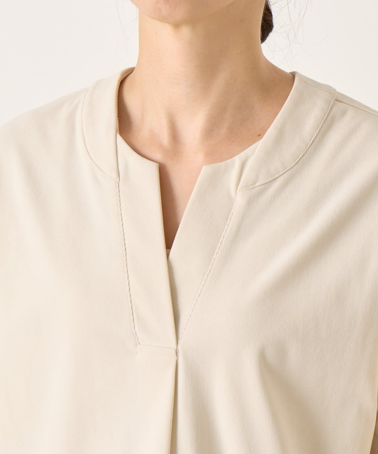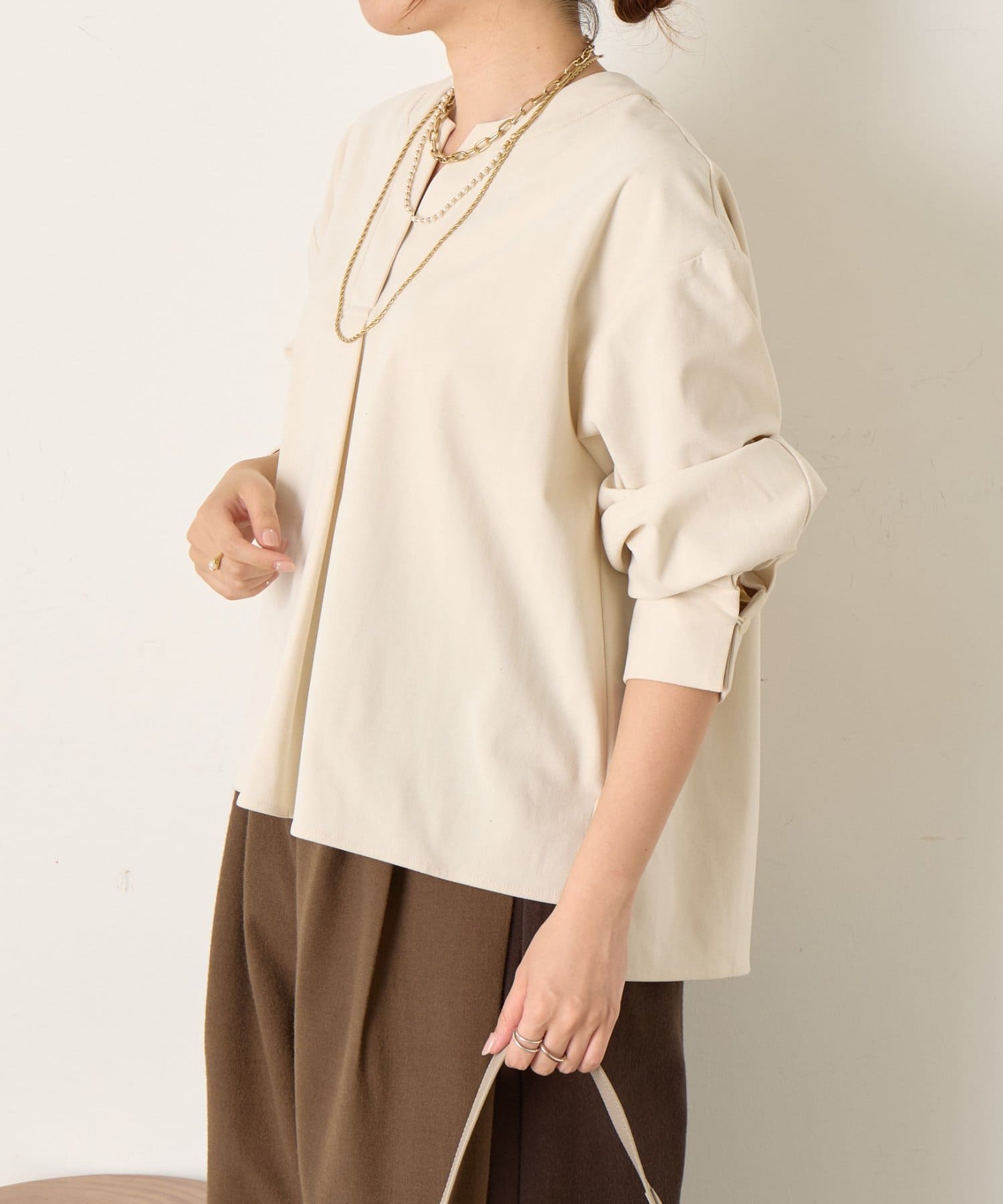 ・すっきりとした印象のVスキッパーネックがポイントのプルオーバーブラウス。