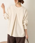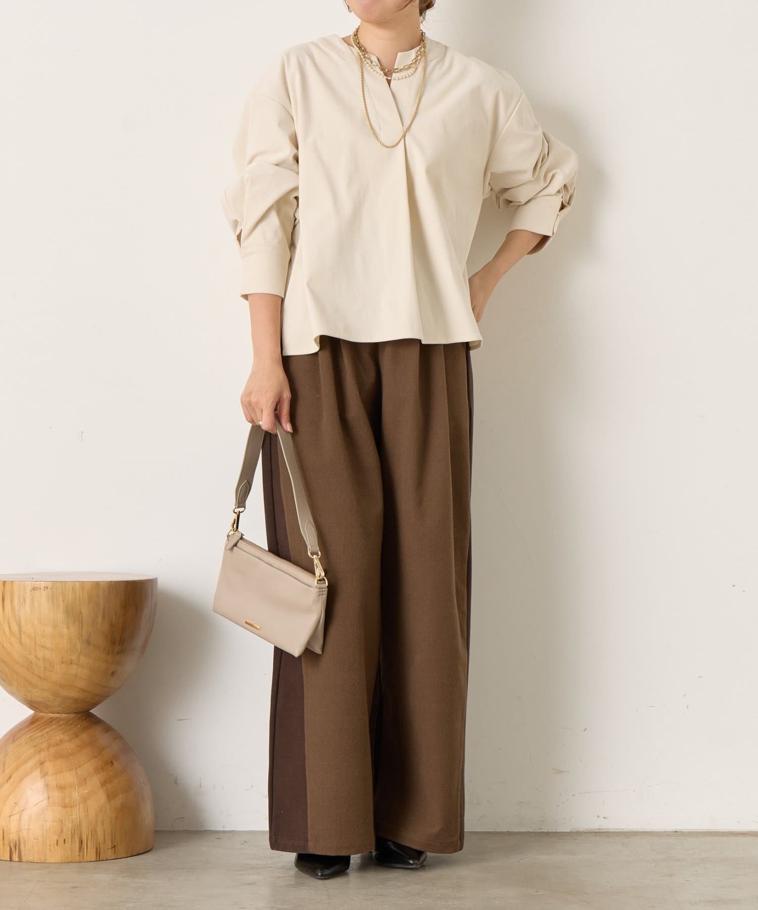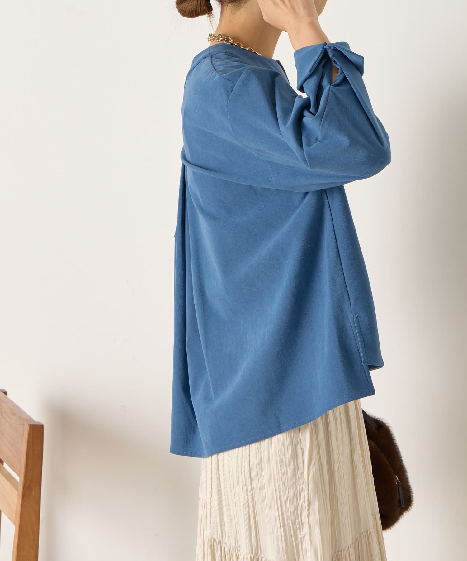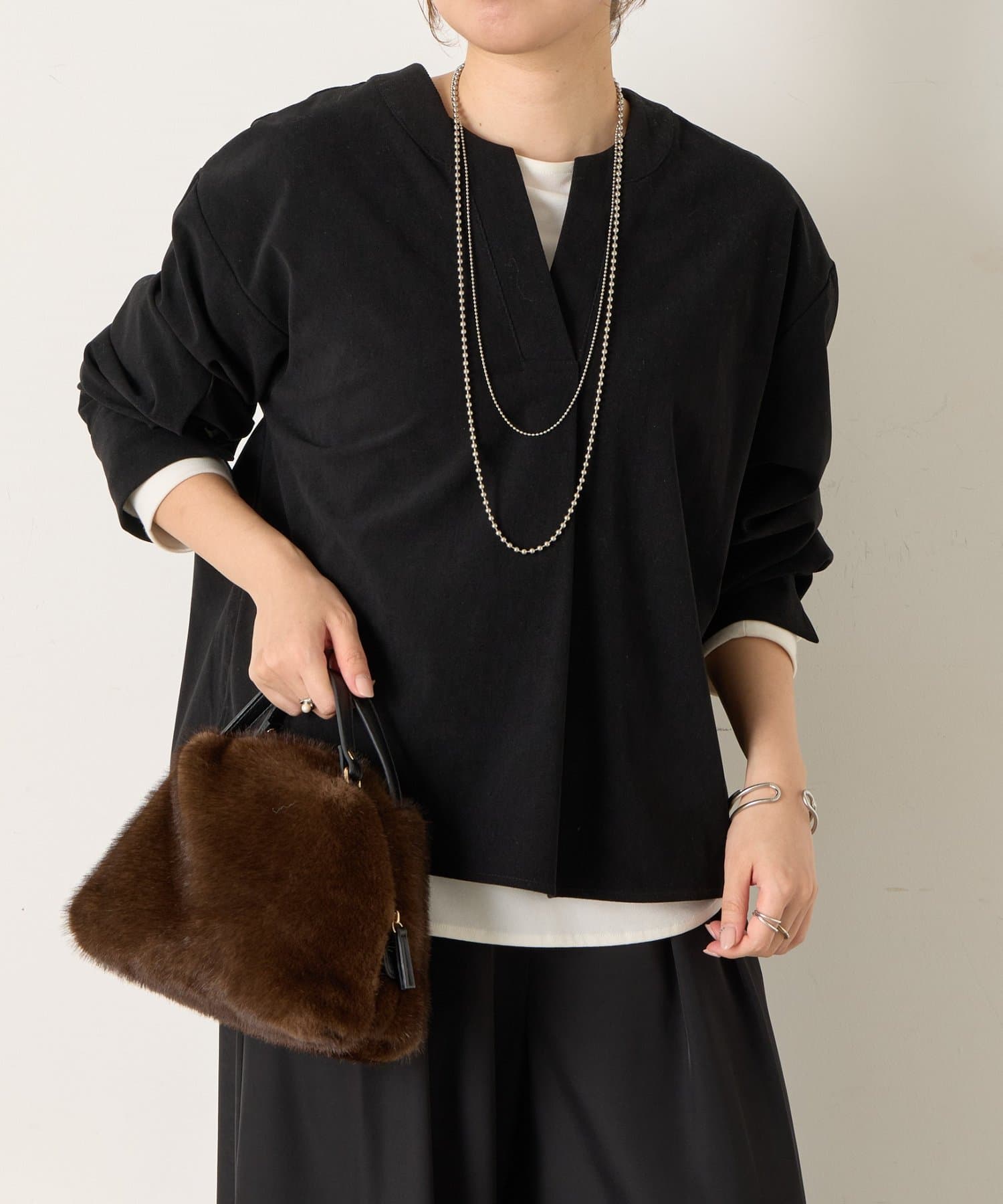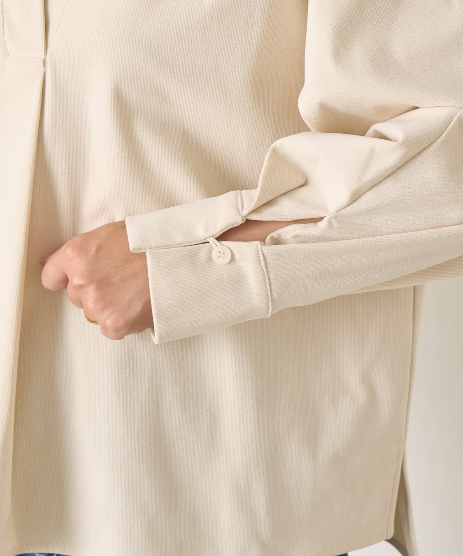 ・すっきりとした印象のVスキッパーネックがポイントのプルオーバーブラウス。