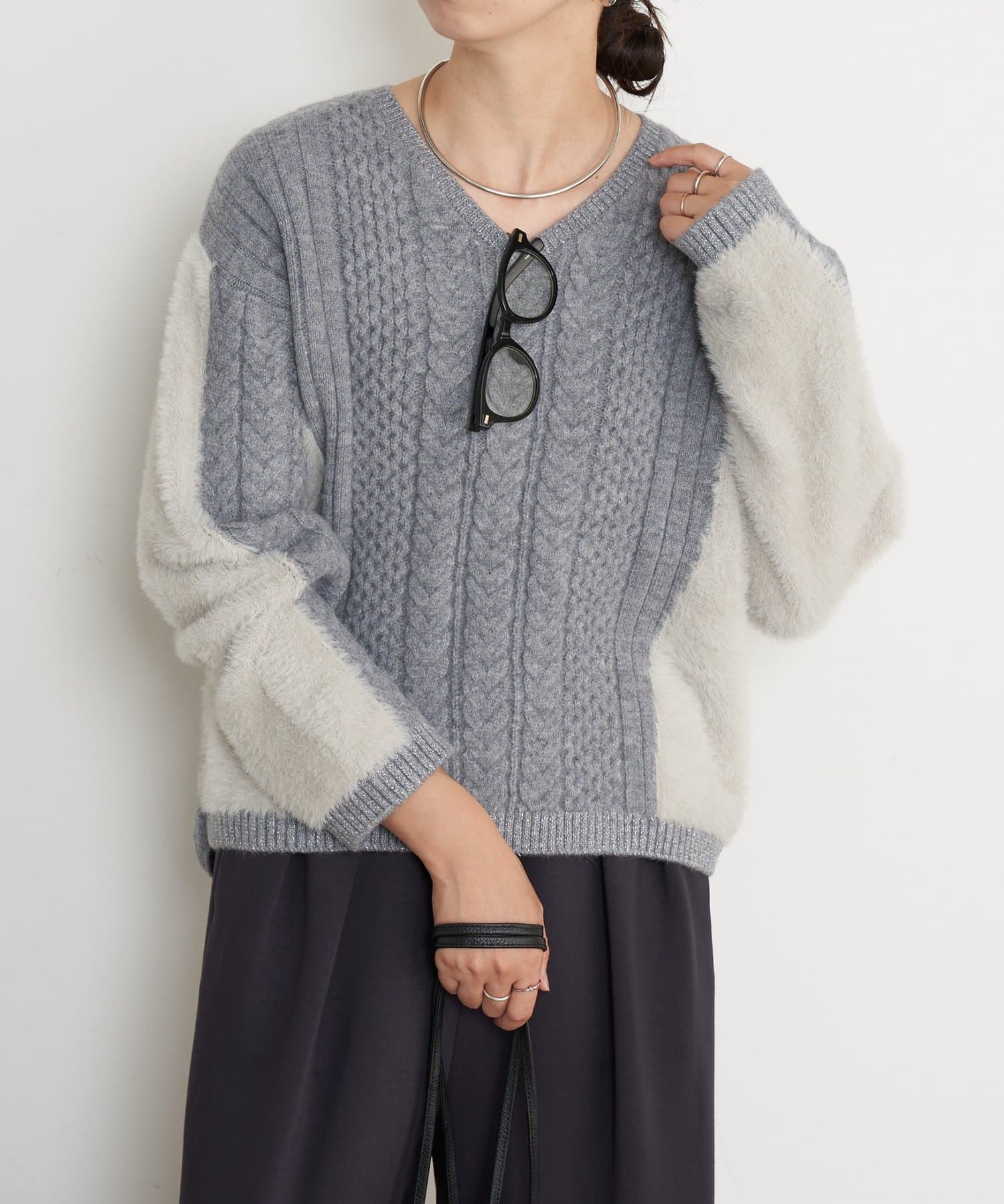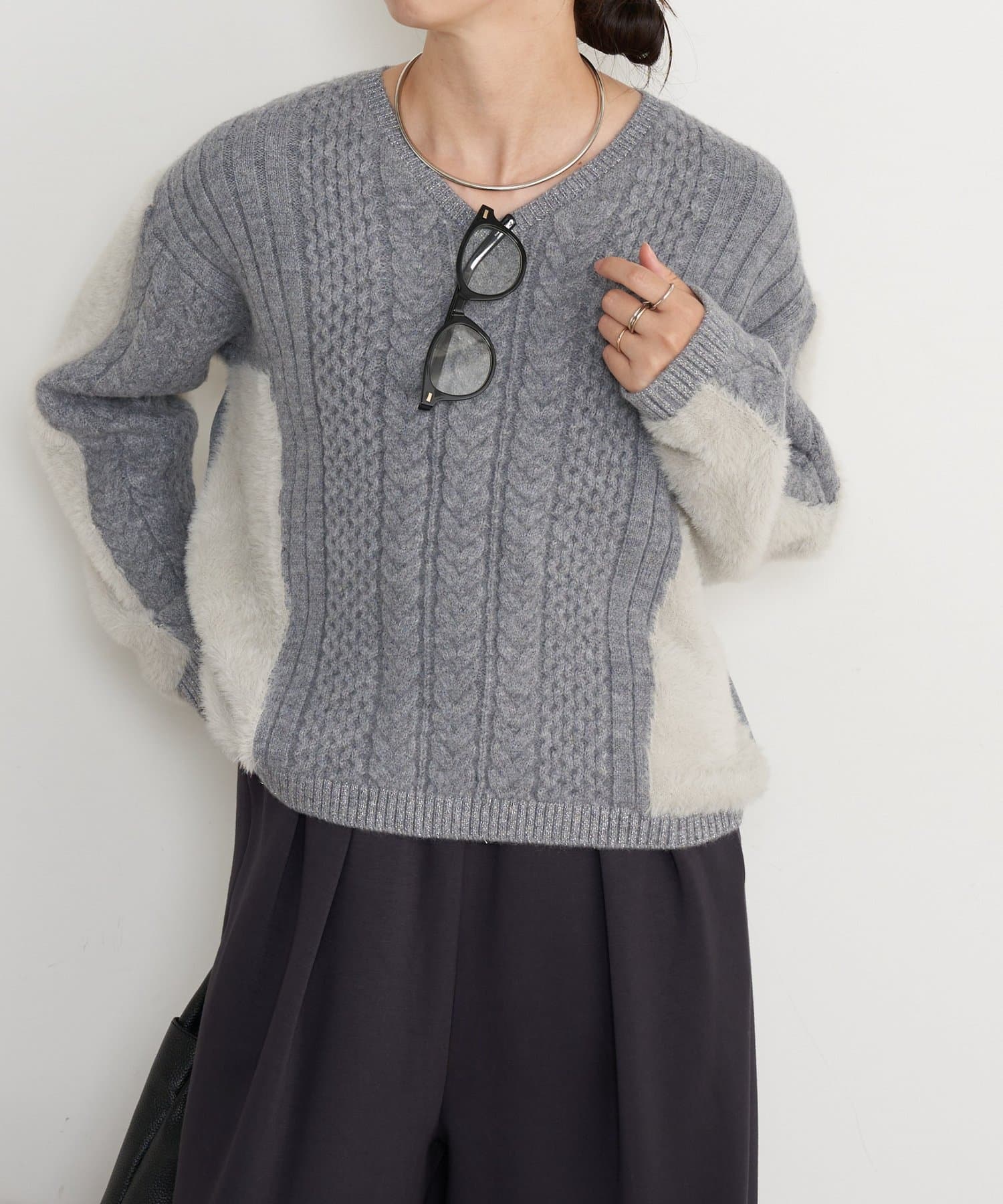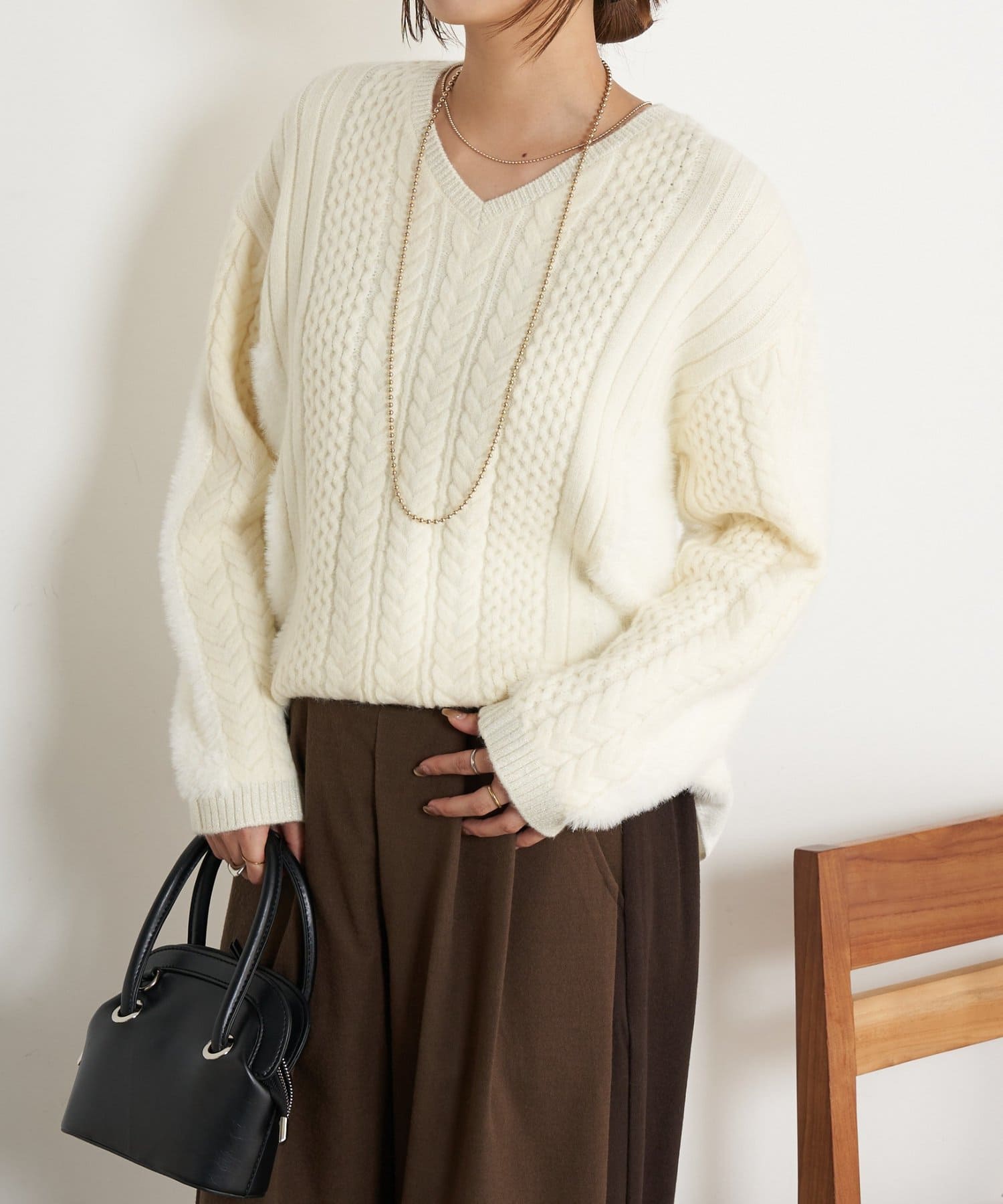 ・1枚で華やかになる、ケーブル編みとラメシャギーの主役級デザインニット。