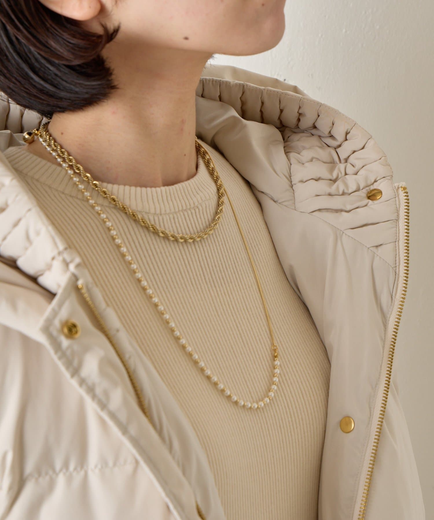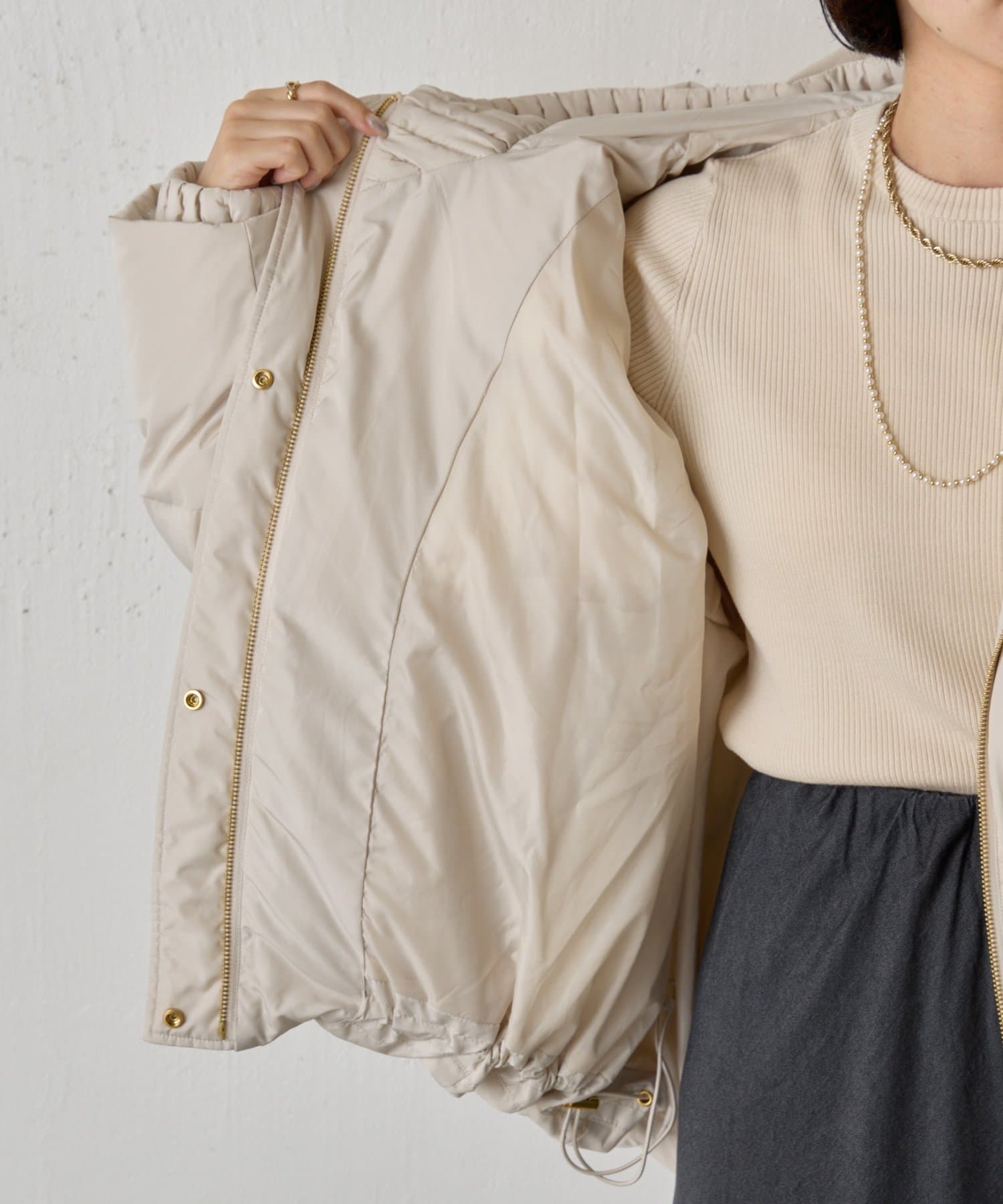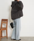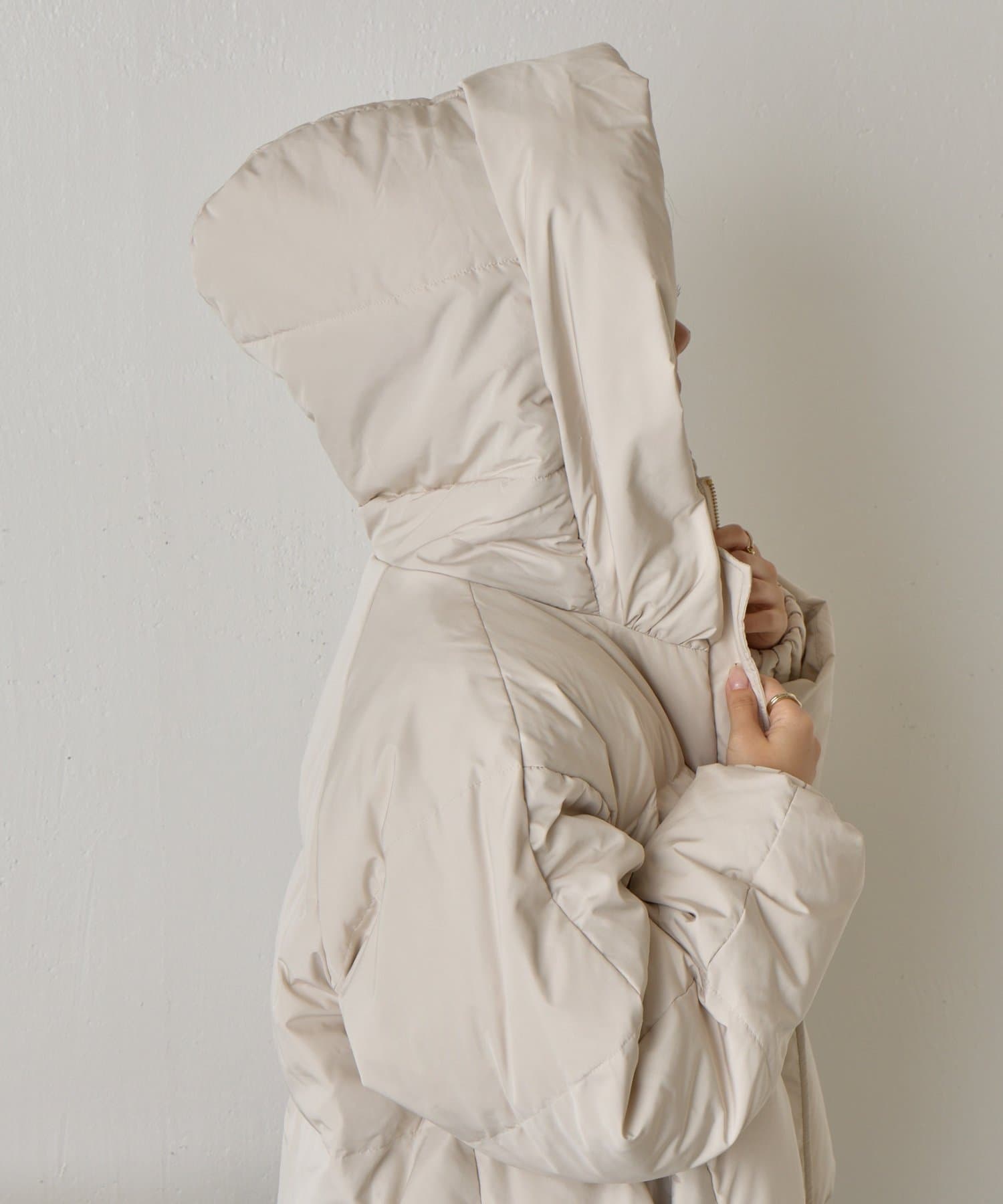 ・リブ襟と大きなフードは顔周りを包み込むデザインで小顔効果と機能性抜群◎
