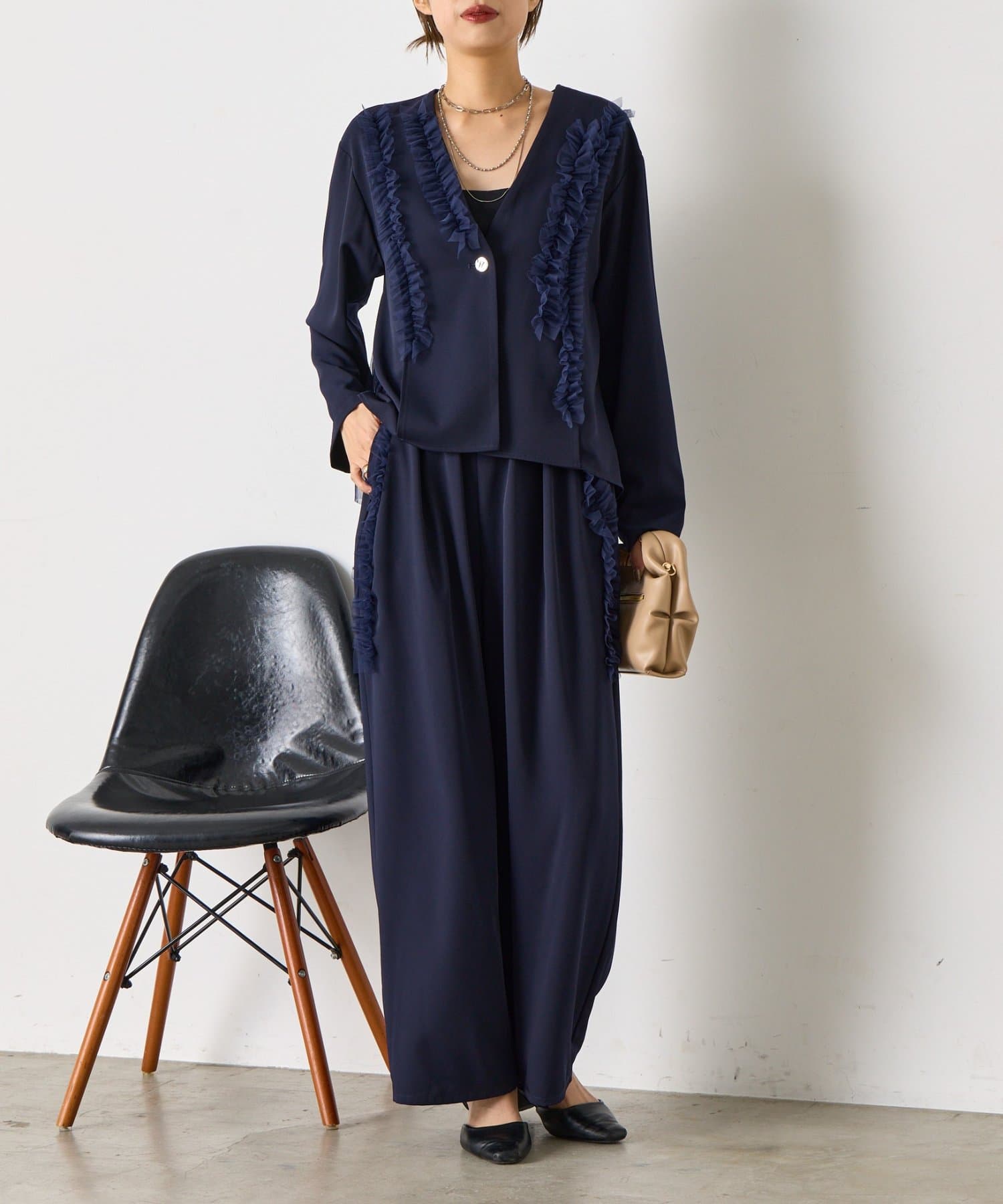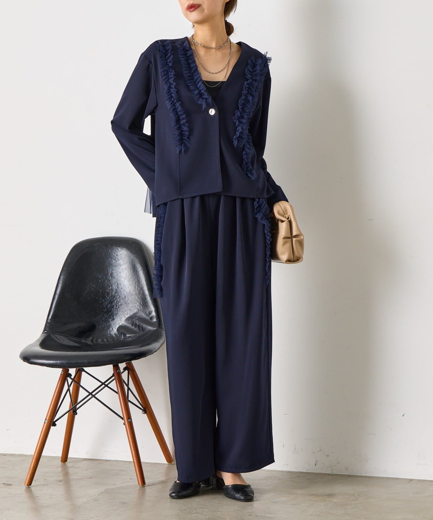・トップスはスッキリ見えが叶うV開きデザイン。
