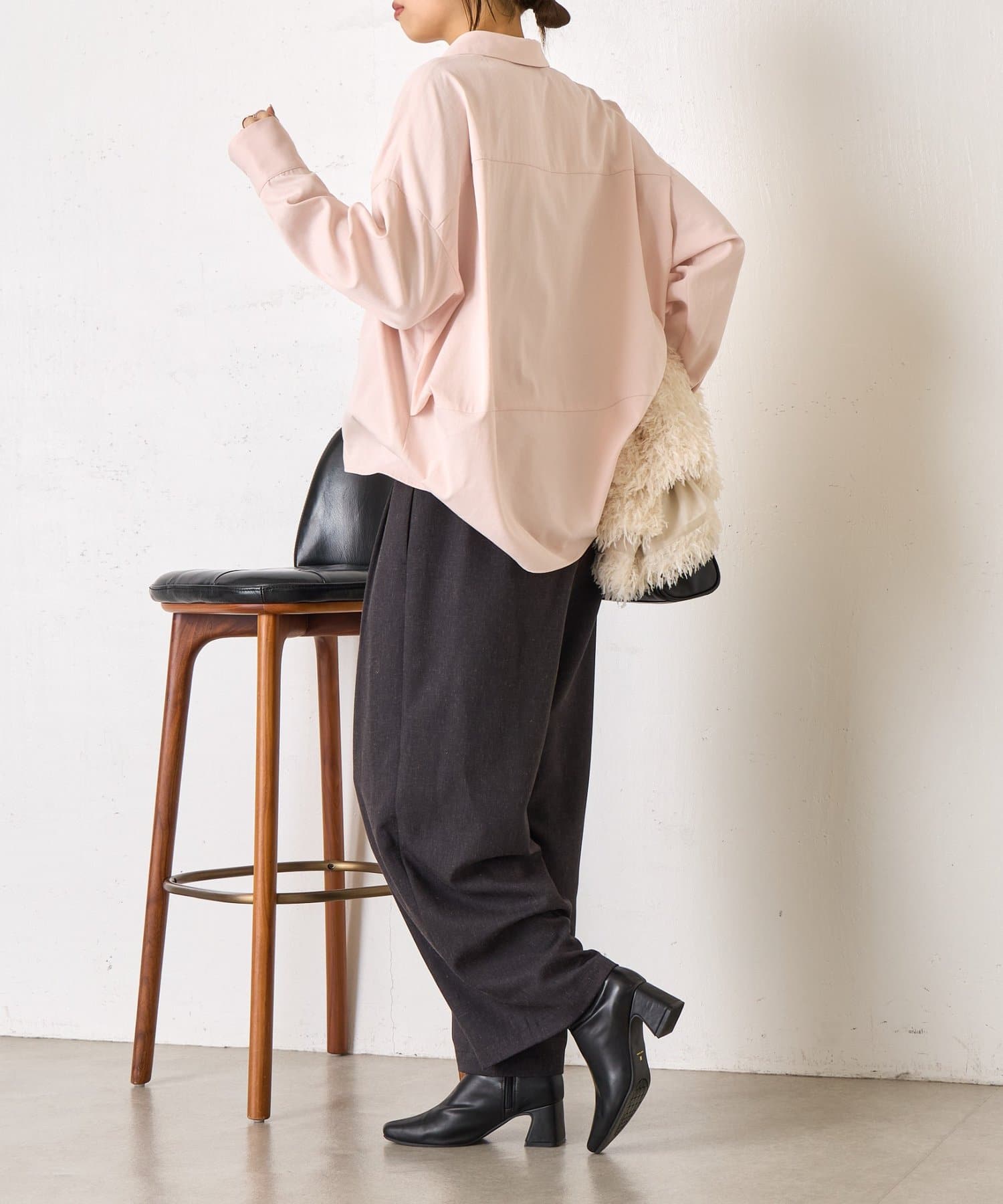 ・後ろは程よく長めの丈感で、カラダのラインが目立たないコクーンシルエット。