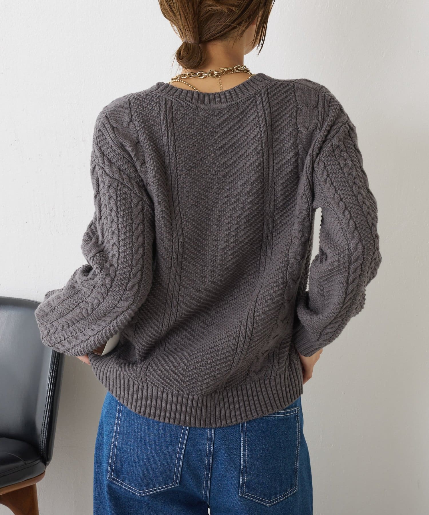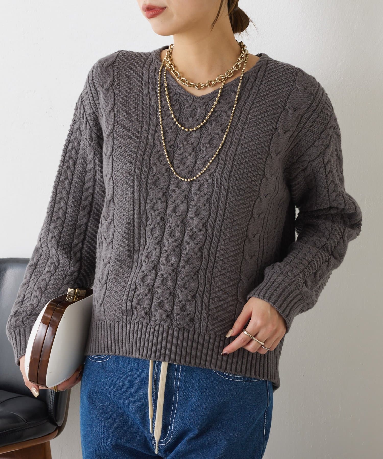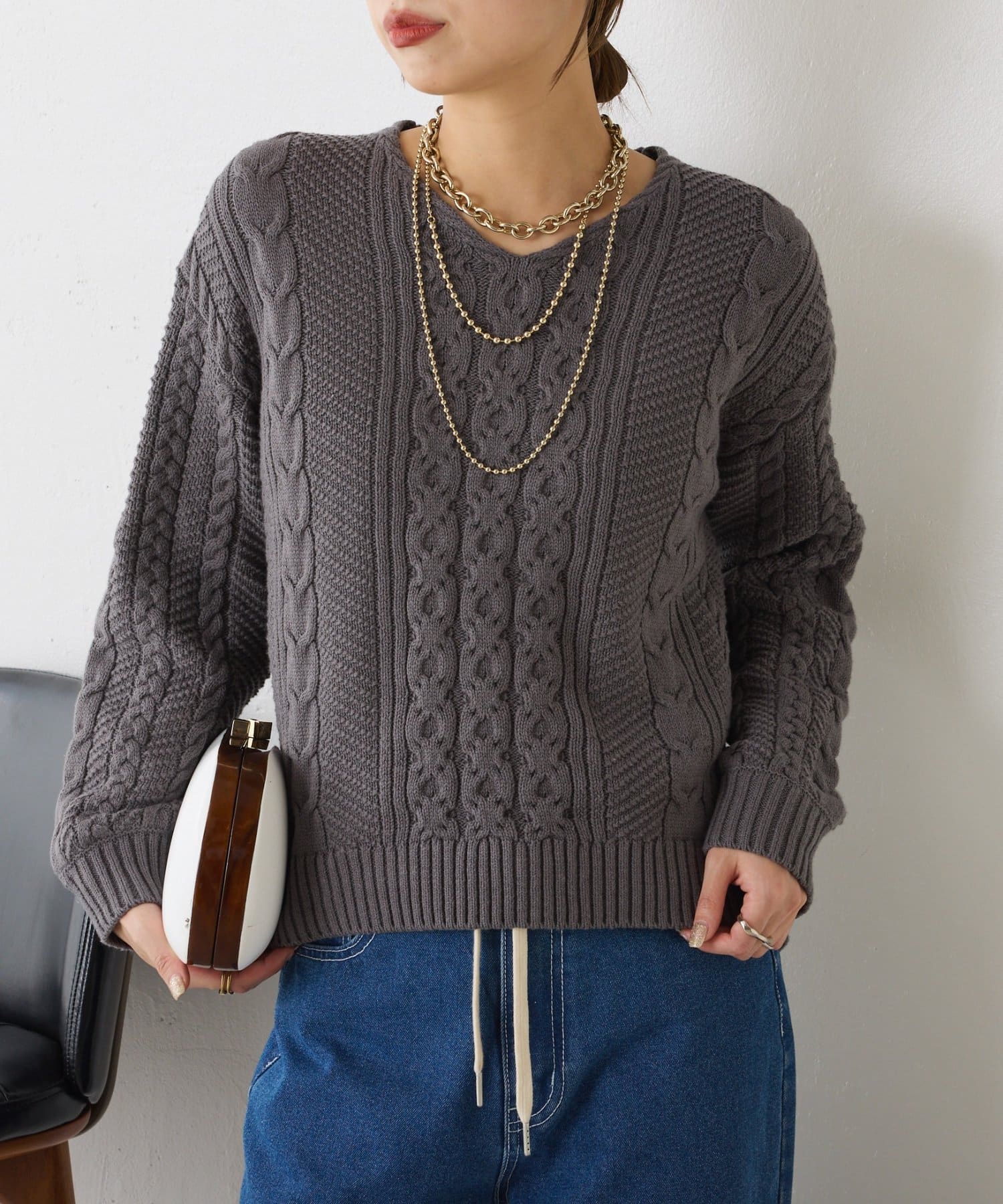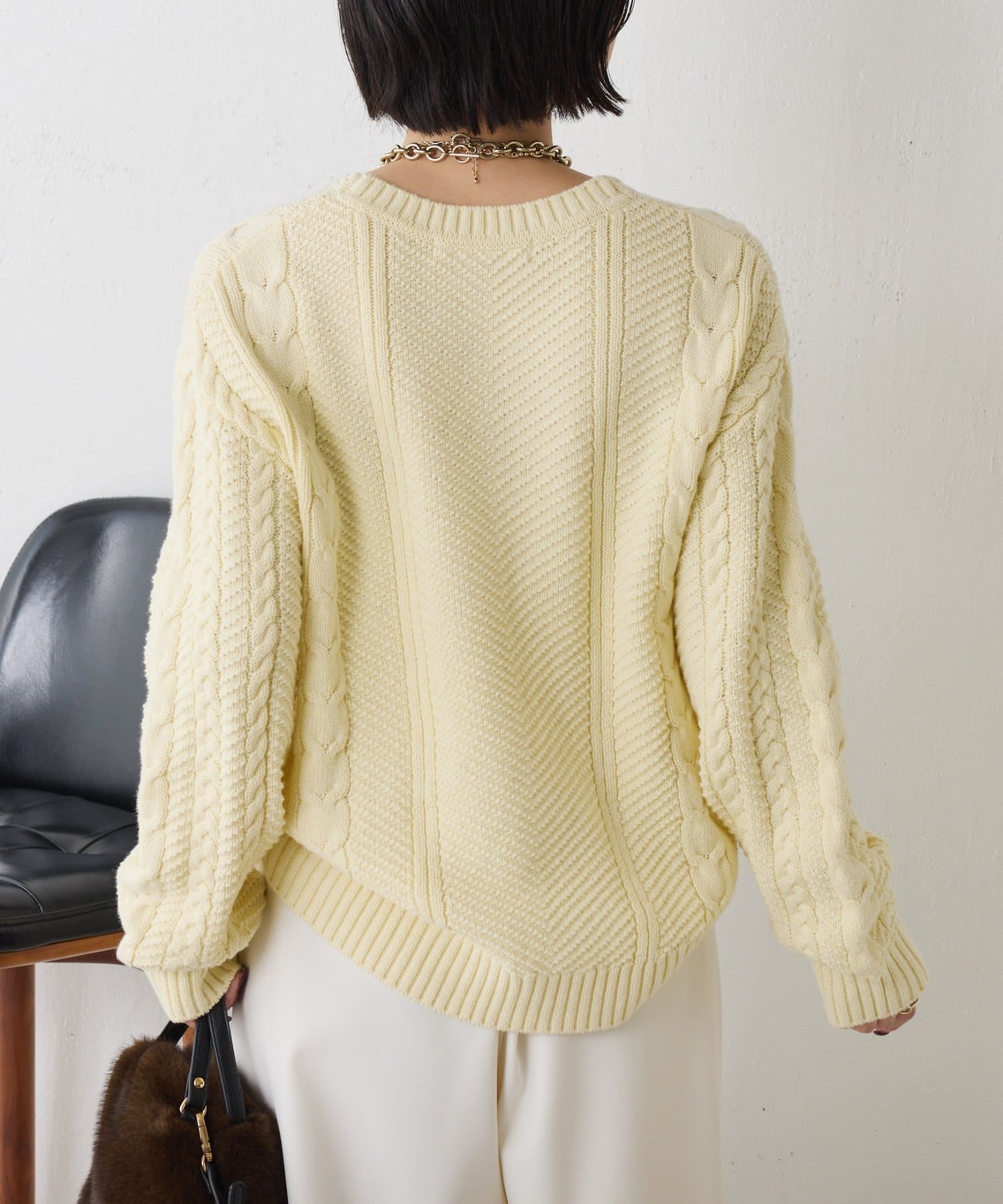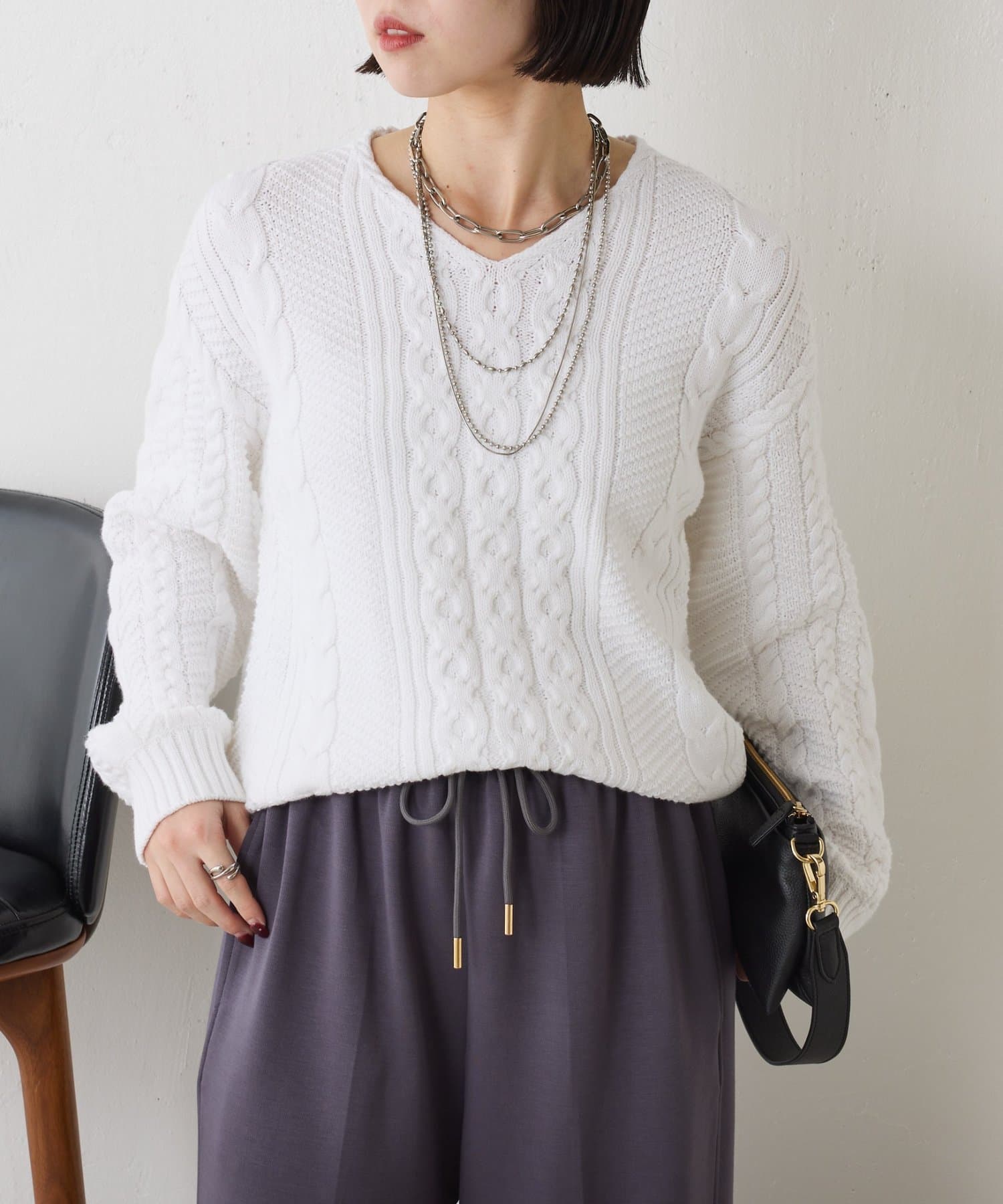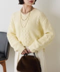 ・クラシックなケーブル編みで立体感のある編地がこなれ感を演出。