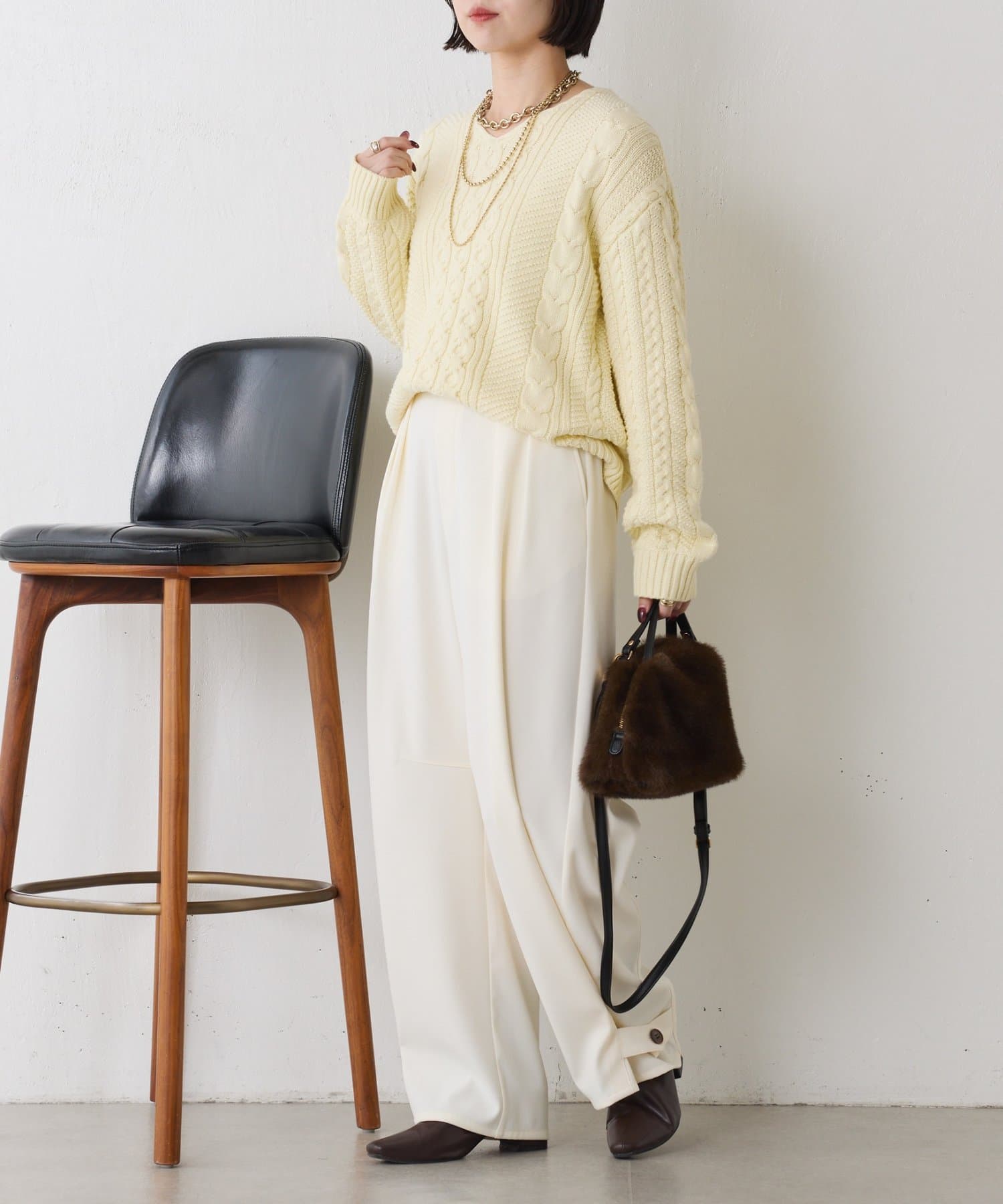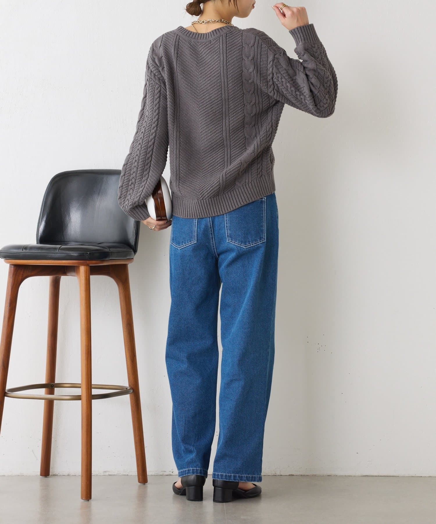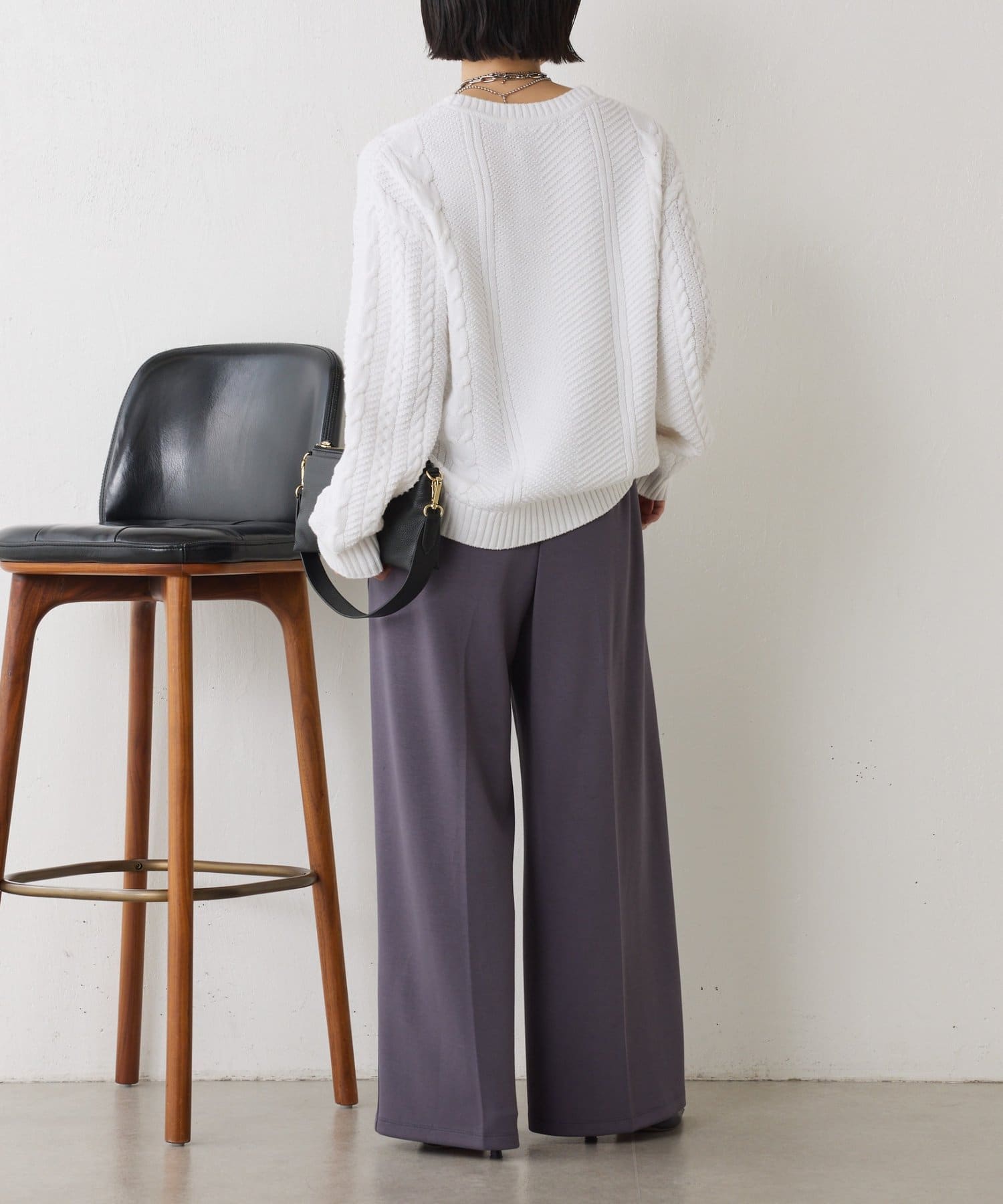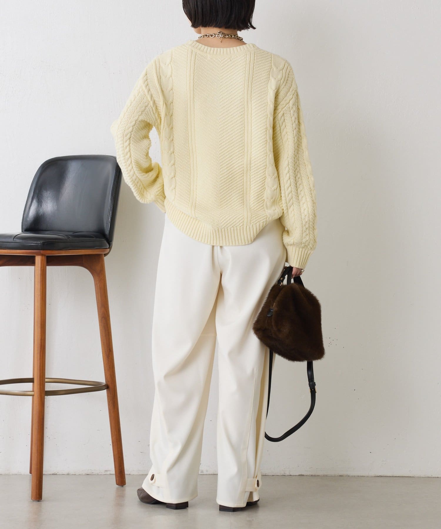 ・クラシックなケーブル編みで立体感のある編地がこなれ感を演出。