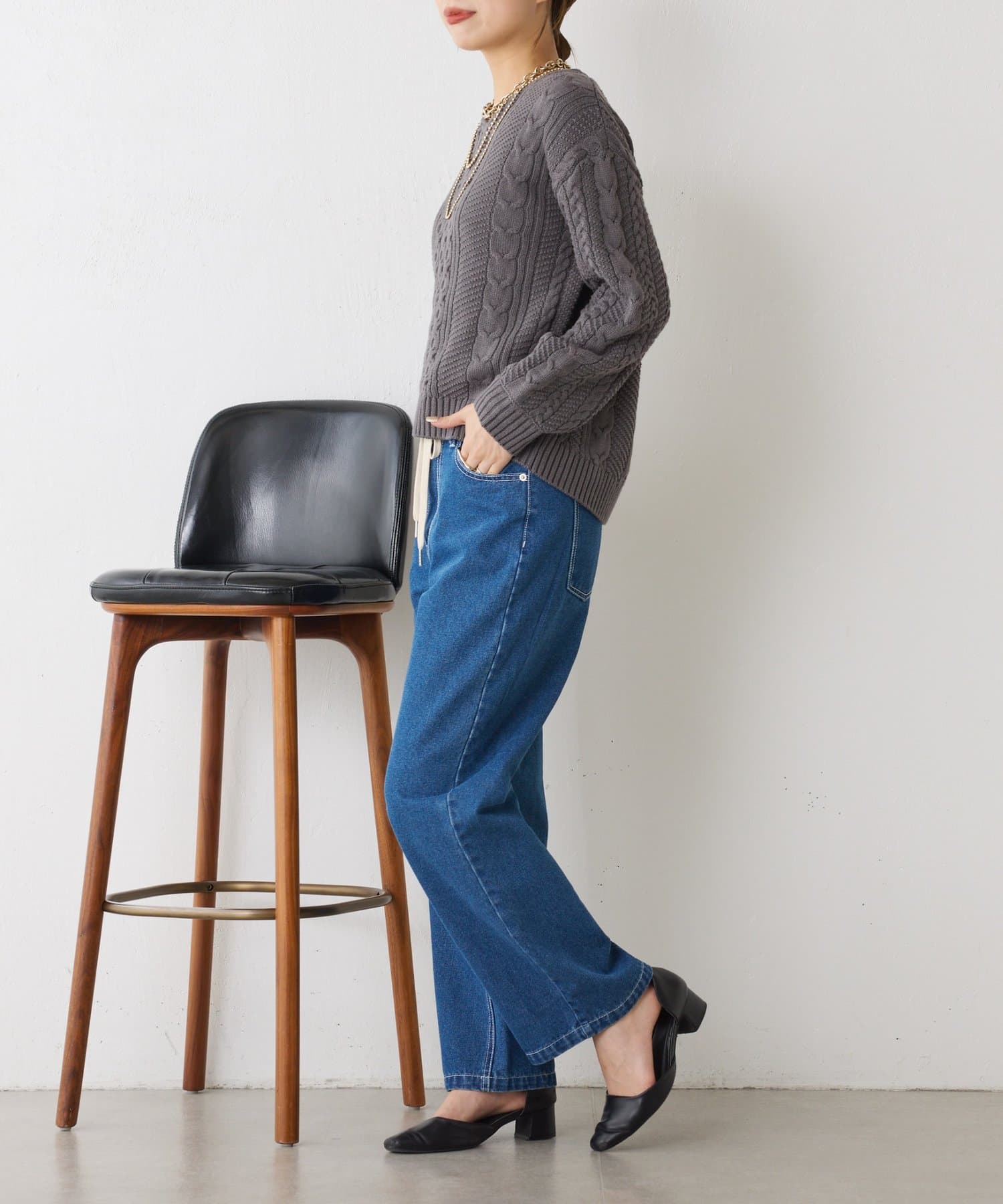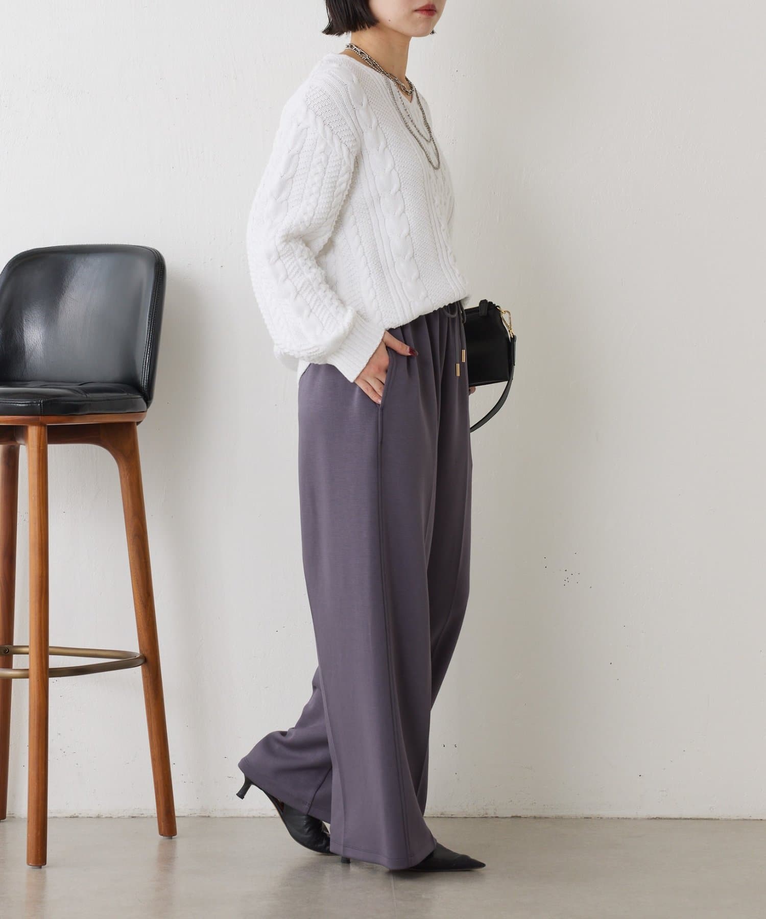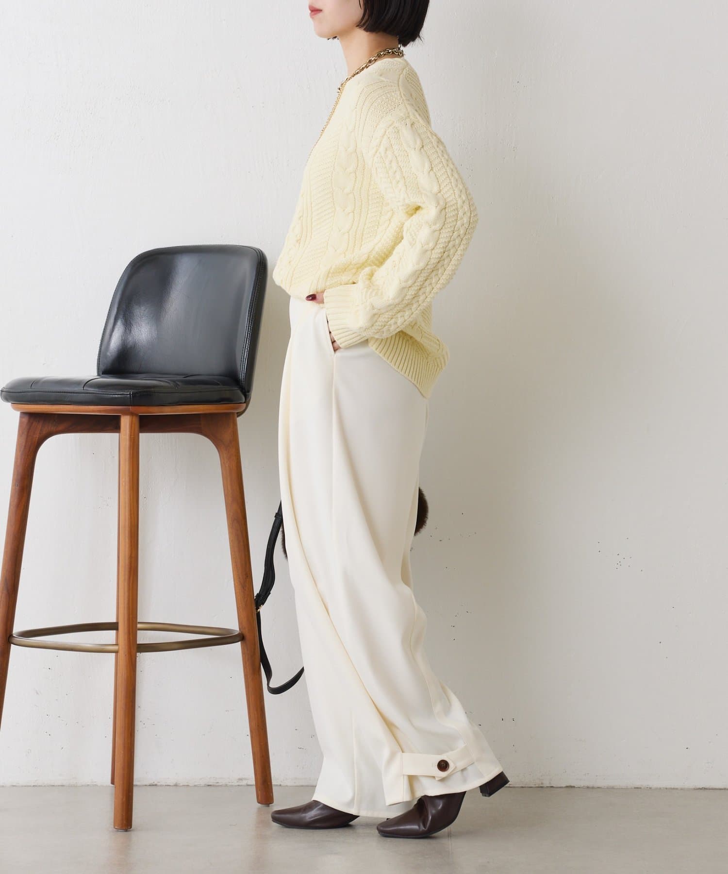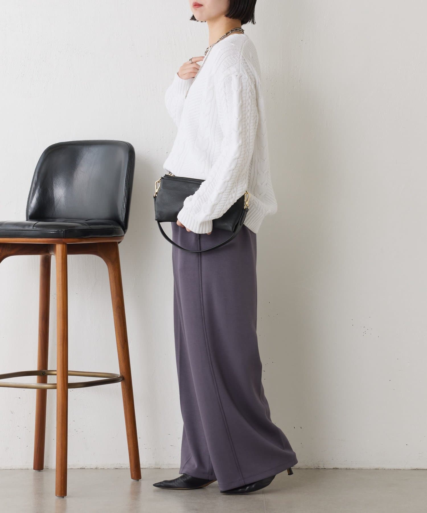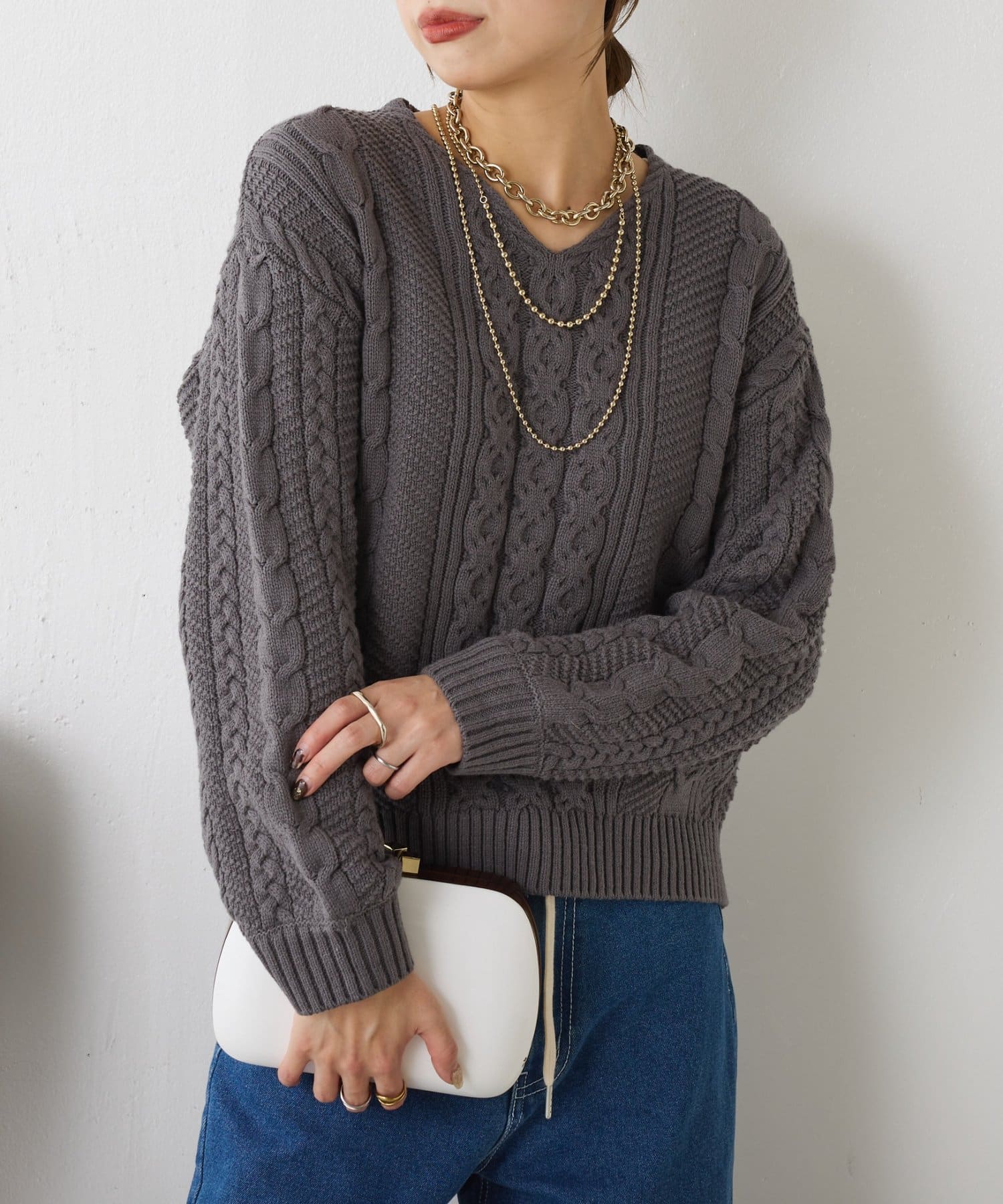・クラシックなケーブル編みで立体感のある編地がこなれ感を演出。
