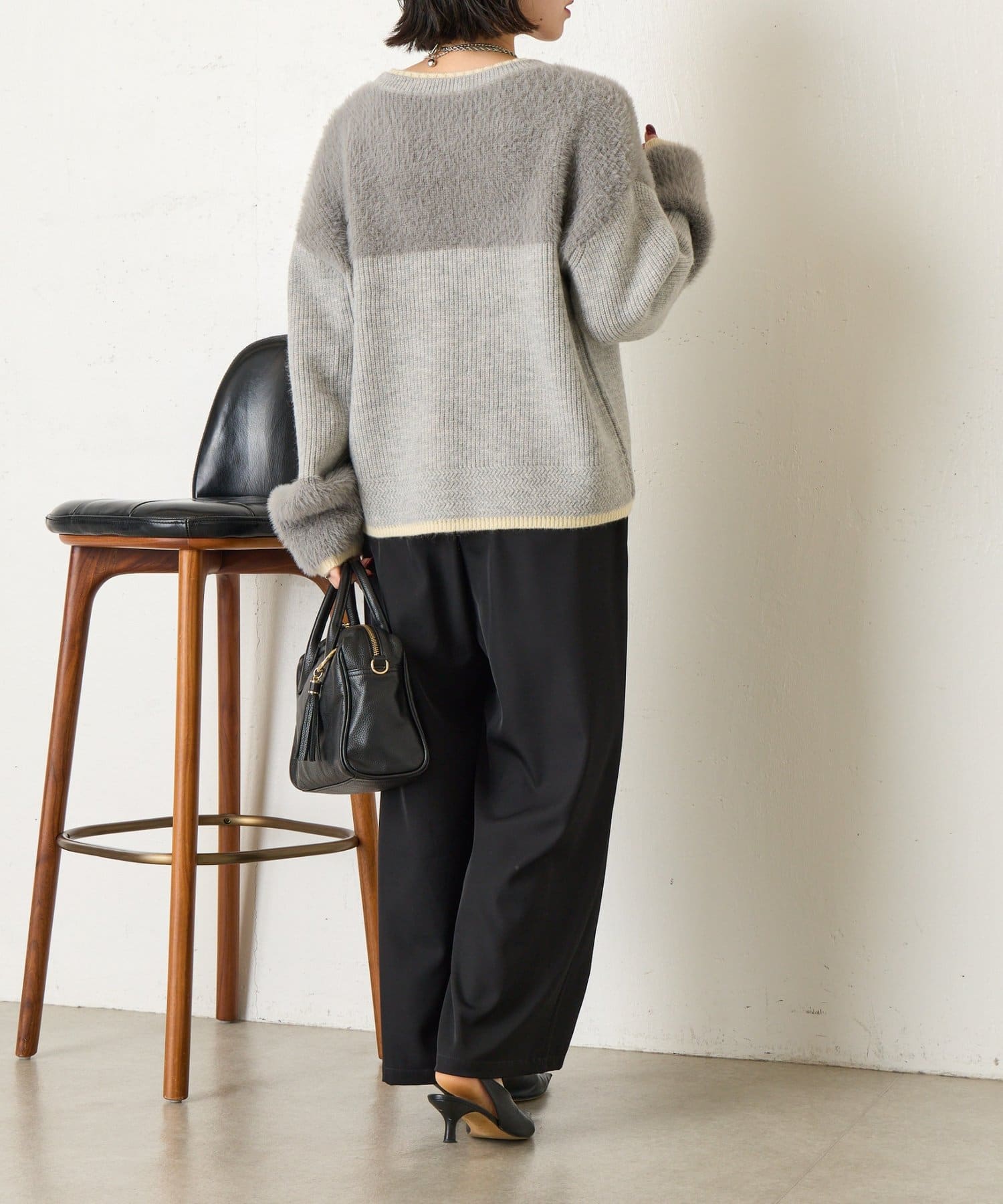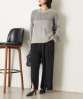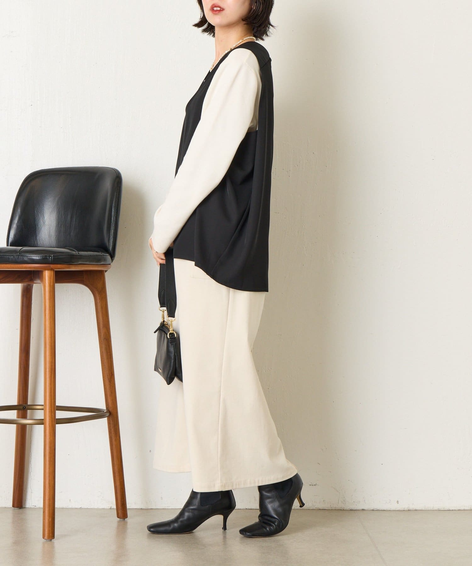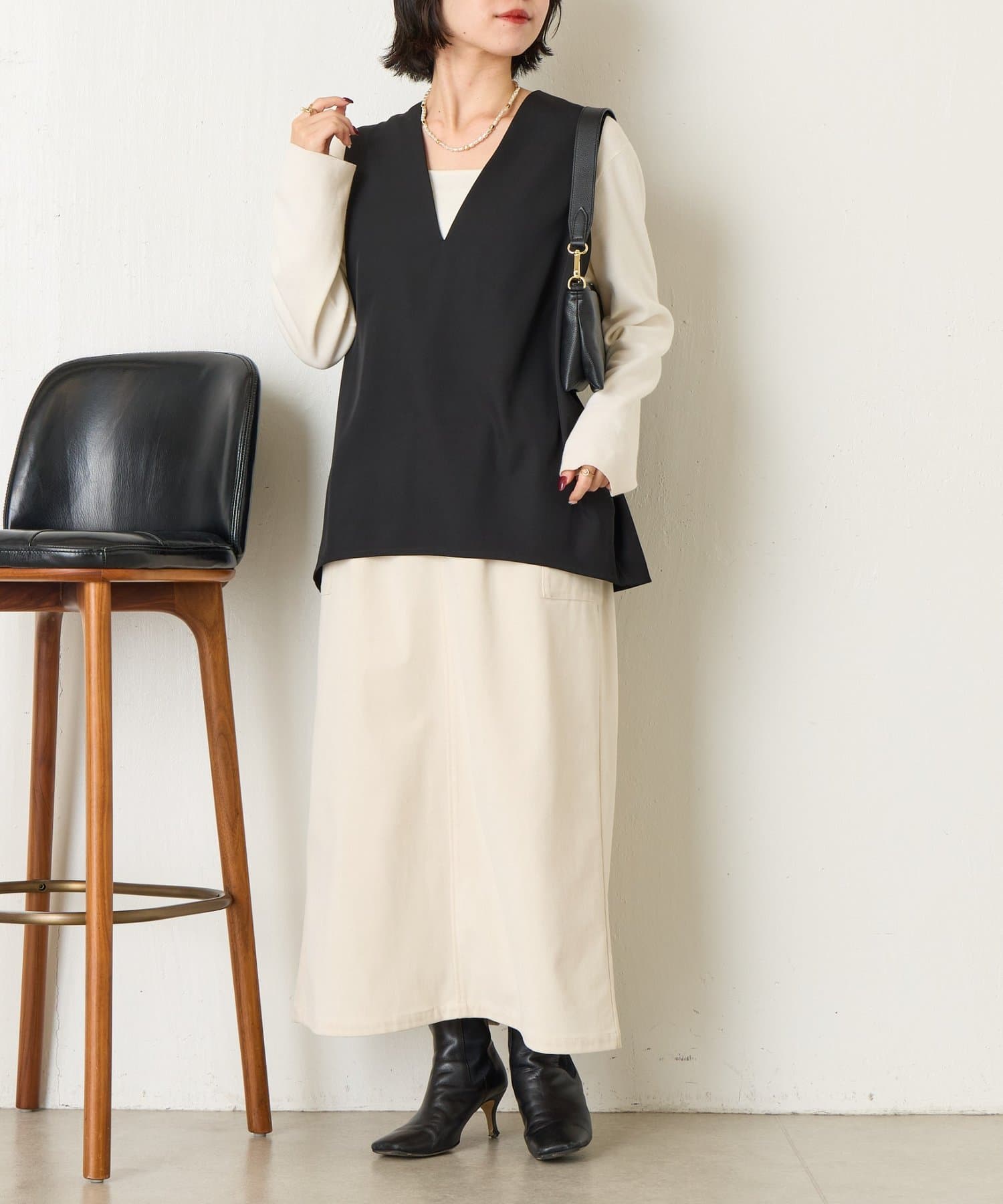 ・トップスは深めのVネックで首元をすっきり見せ、身体のラインを拾わないゆったりシルエット。