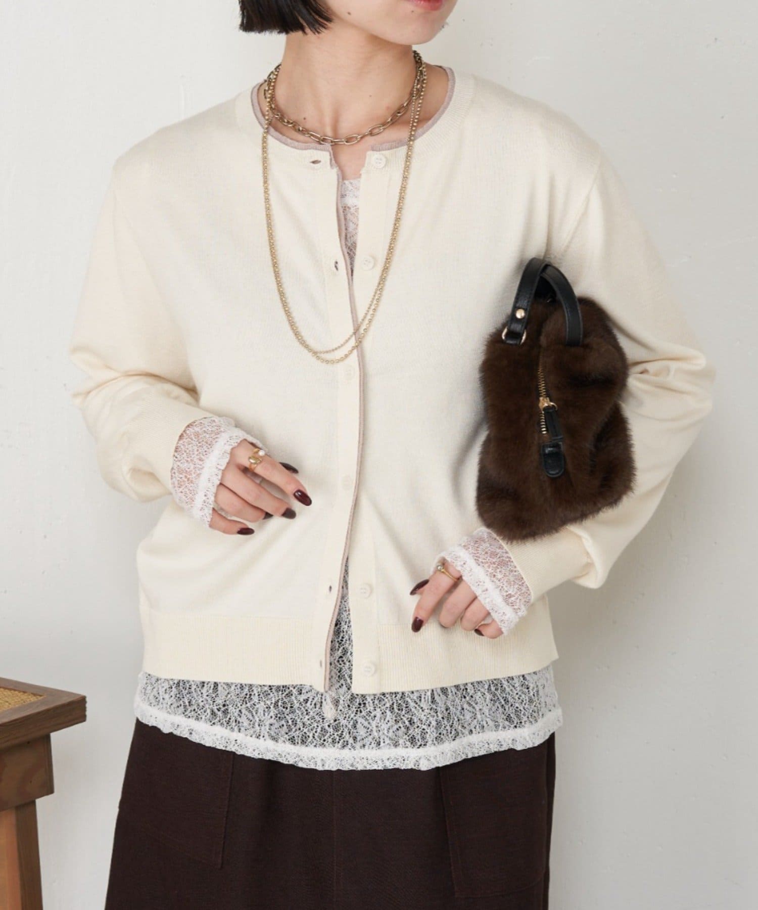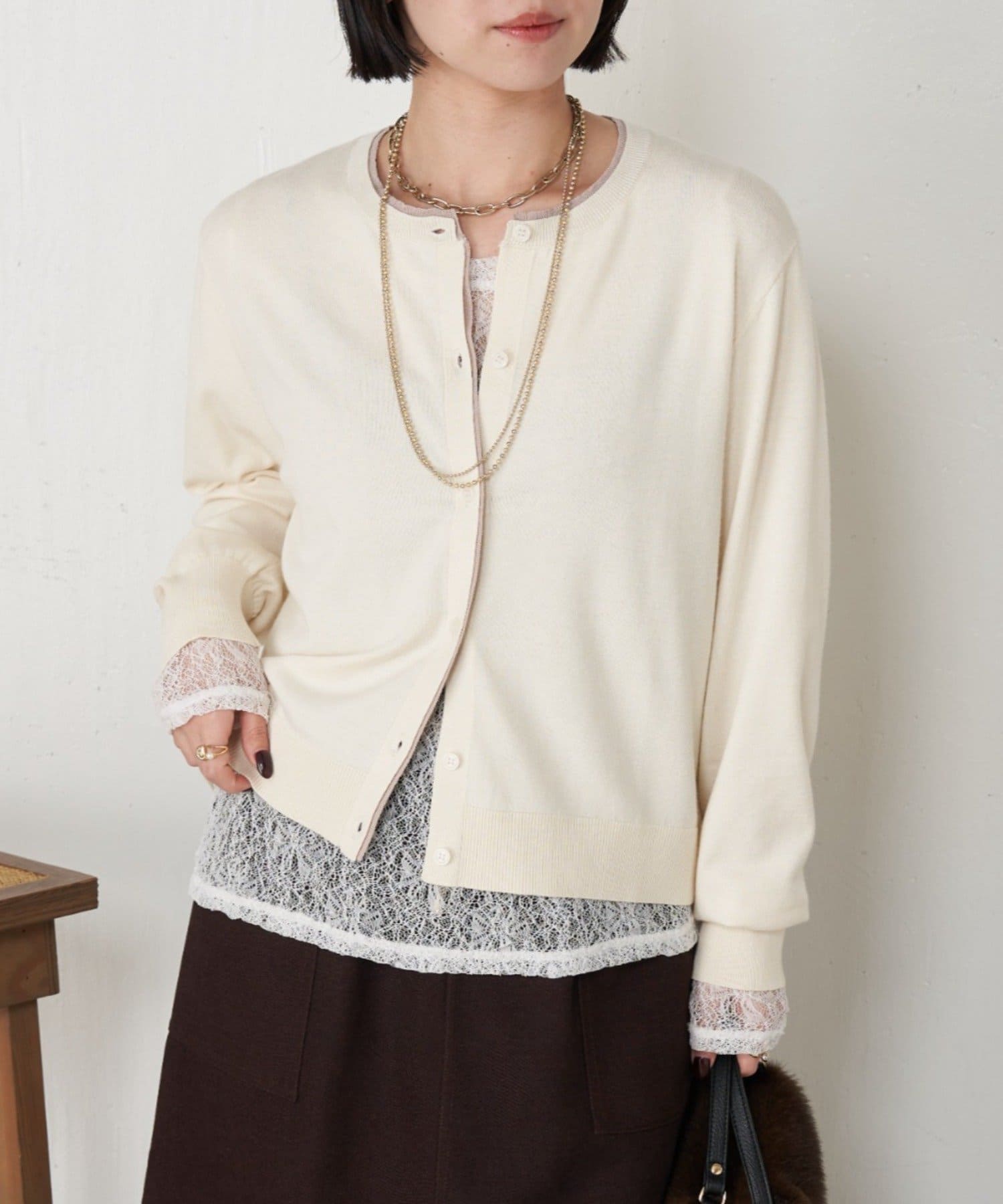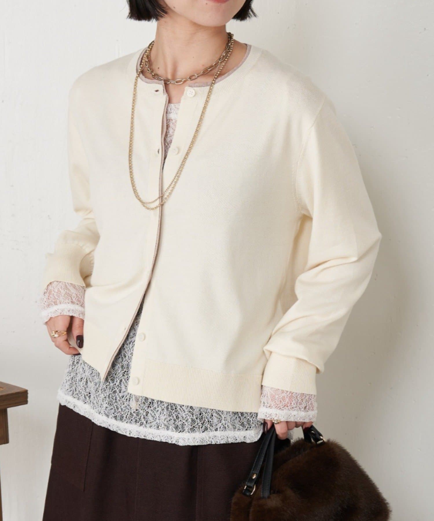 ・重ね着風のデザインが、コーデに奥行きとこなれ感を加えるカーディガン。