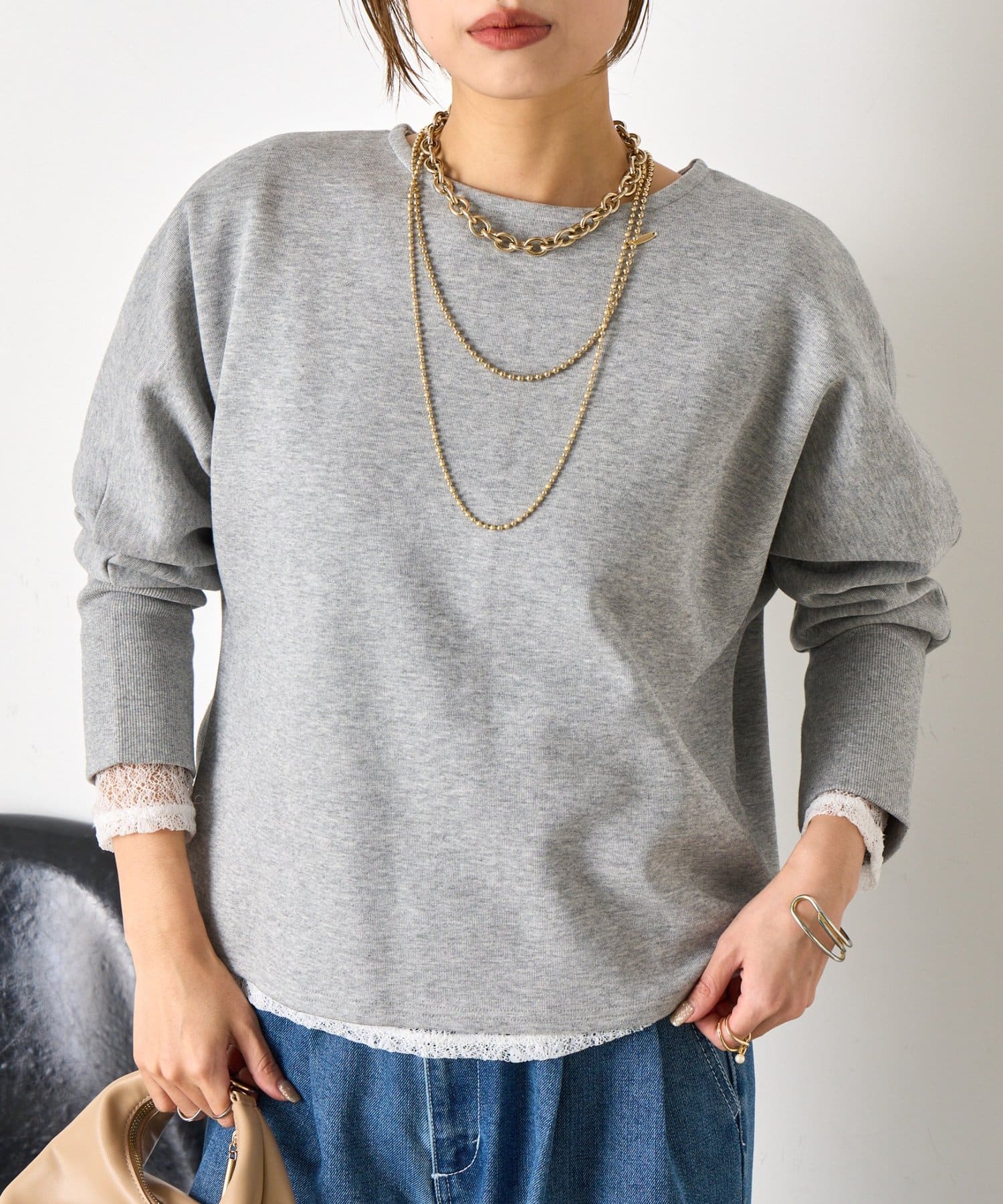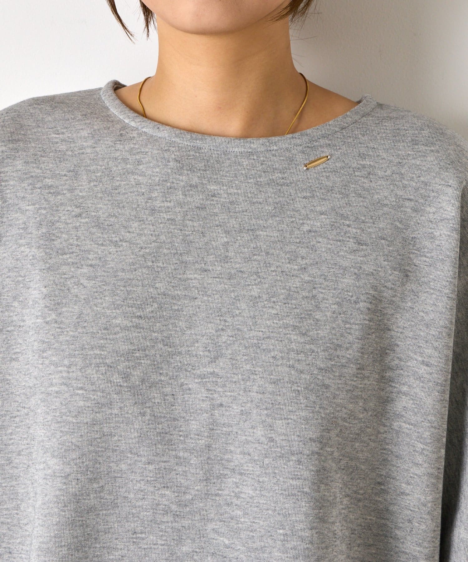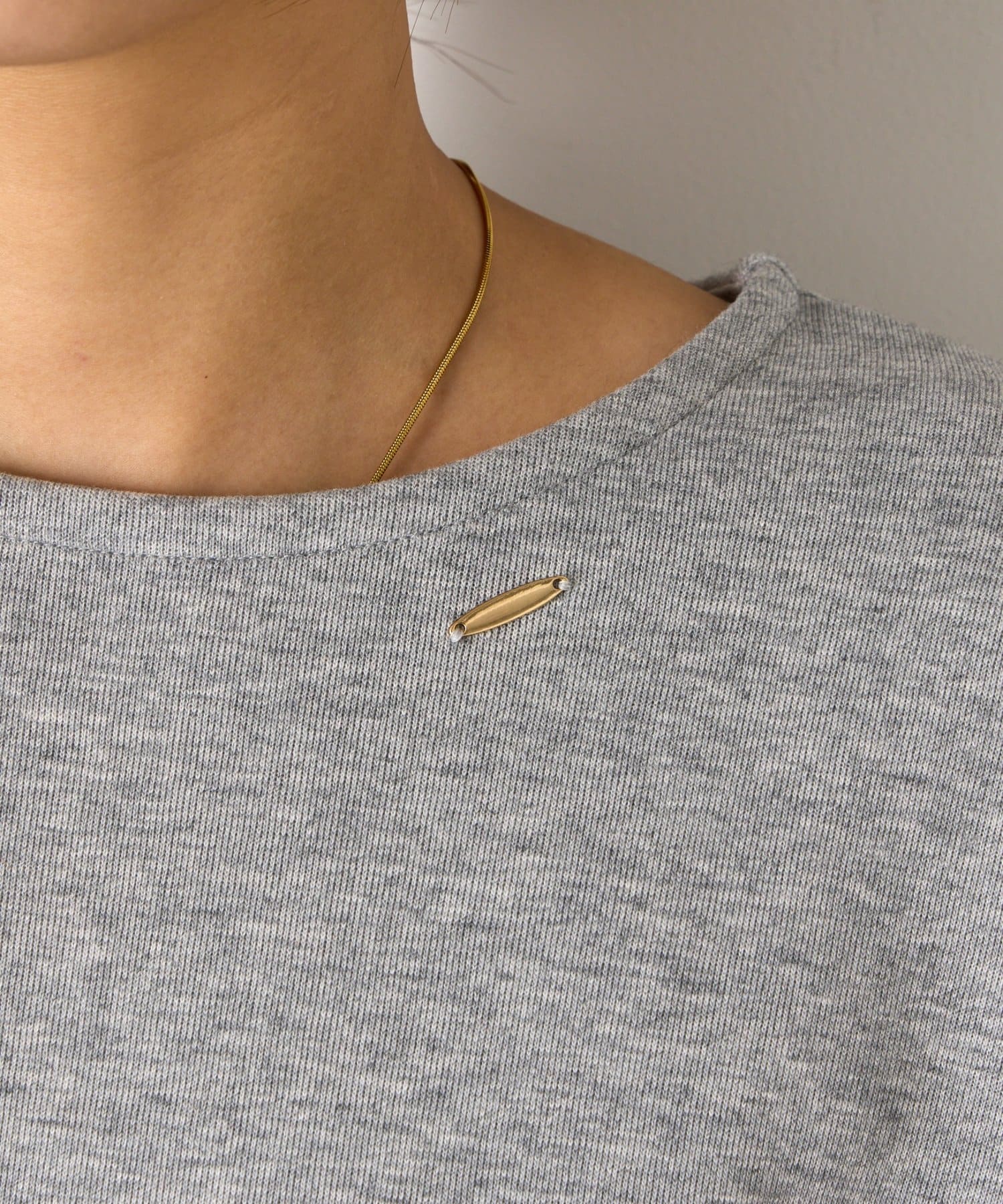 ・胸元に付いた小ぶりゴールドのプレートがアクセいらずで一枚でお洒落見えします。