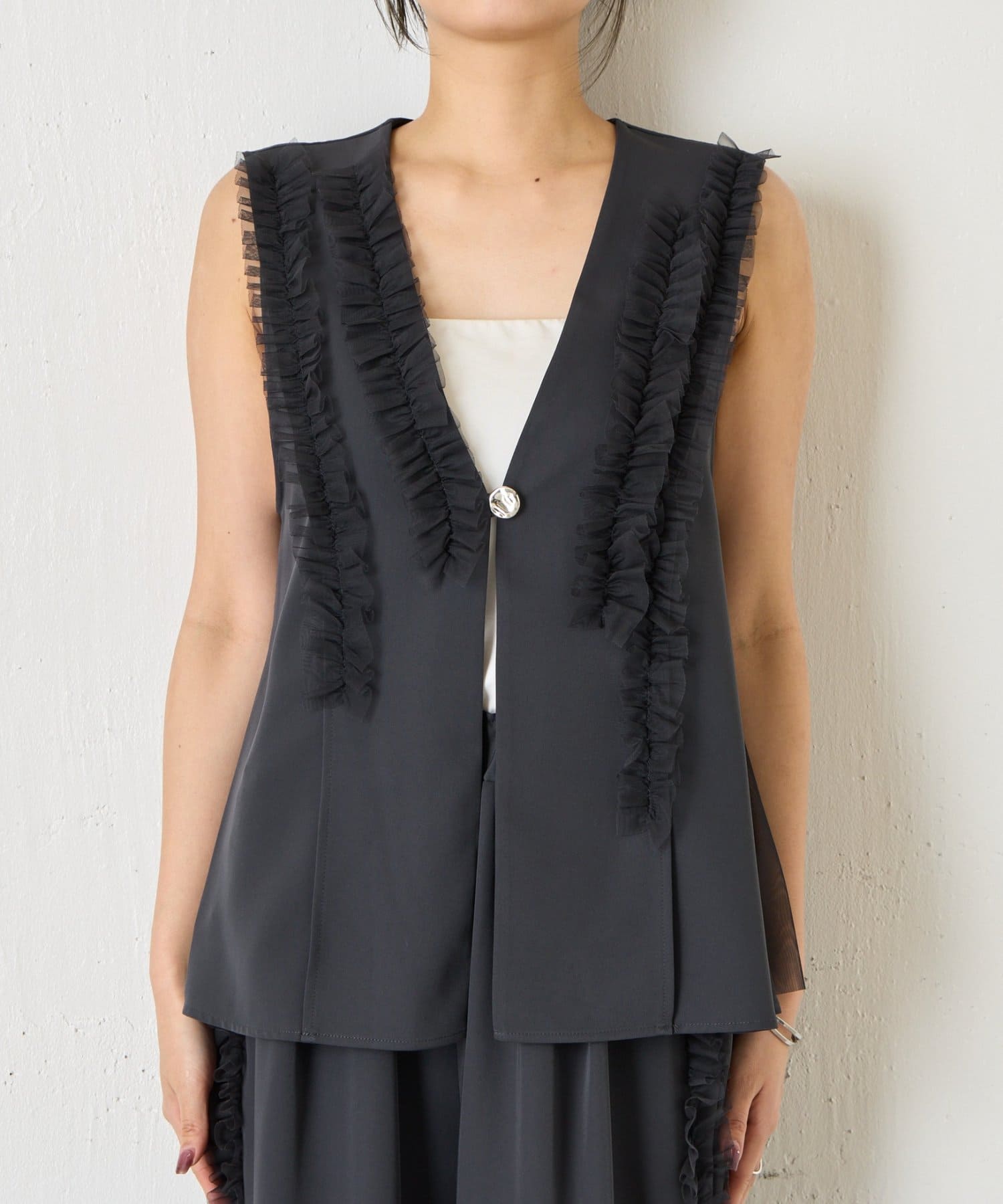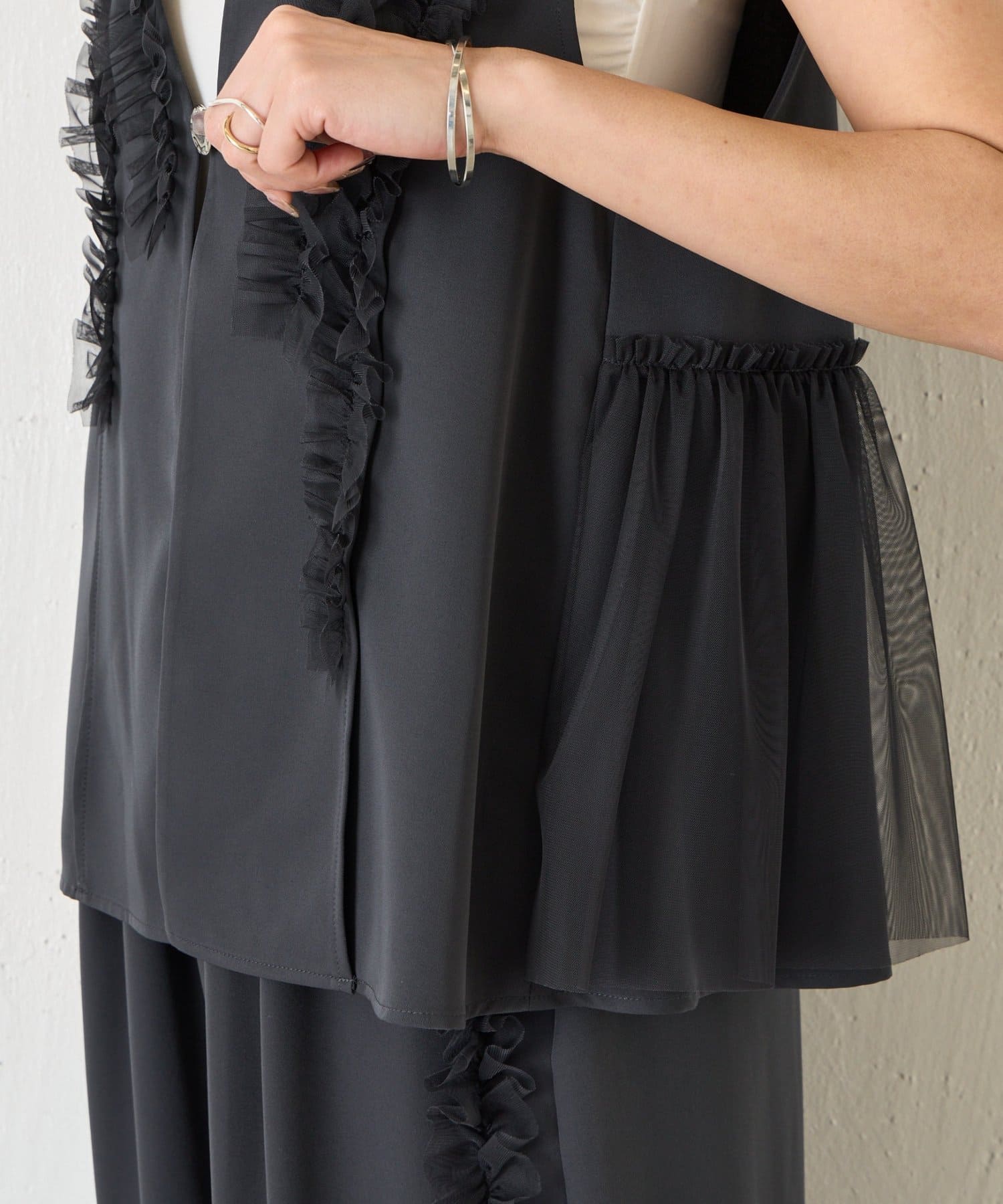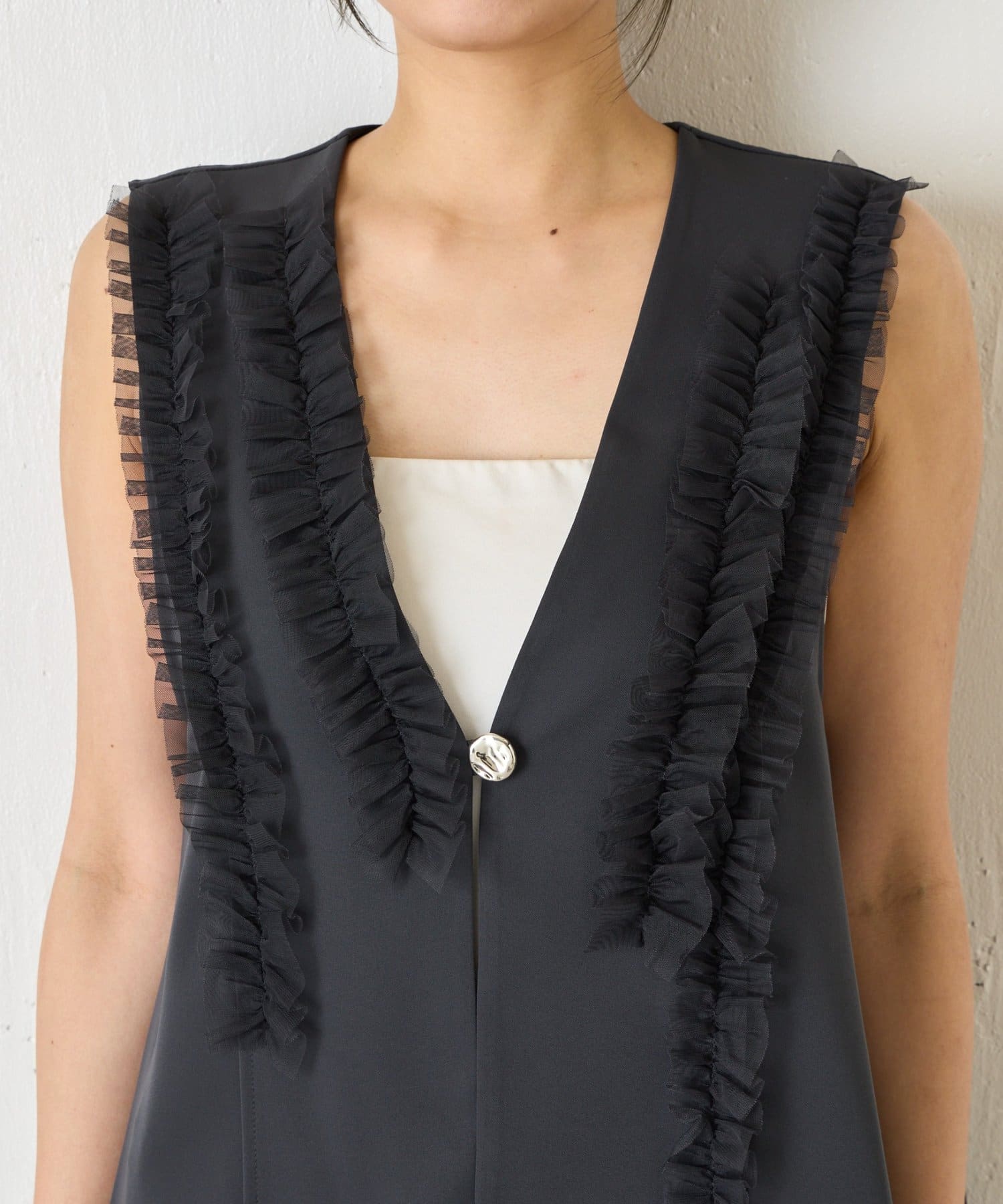 ・フリルを重ねたチュールベストが目を惹くデザインのオケージョンアイテムです。
