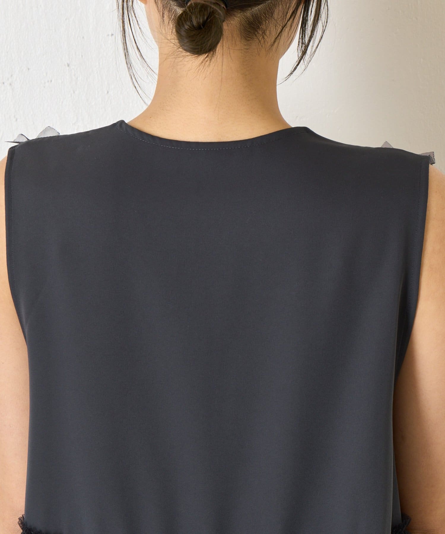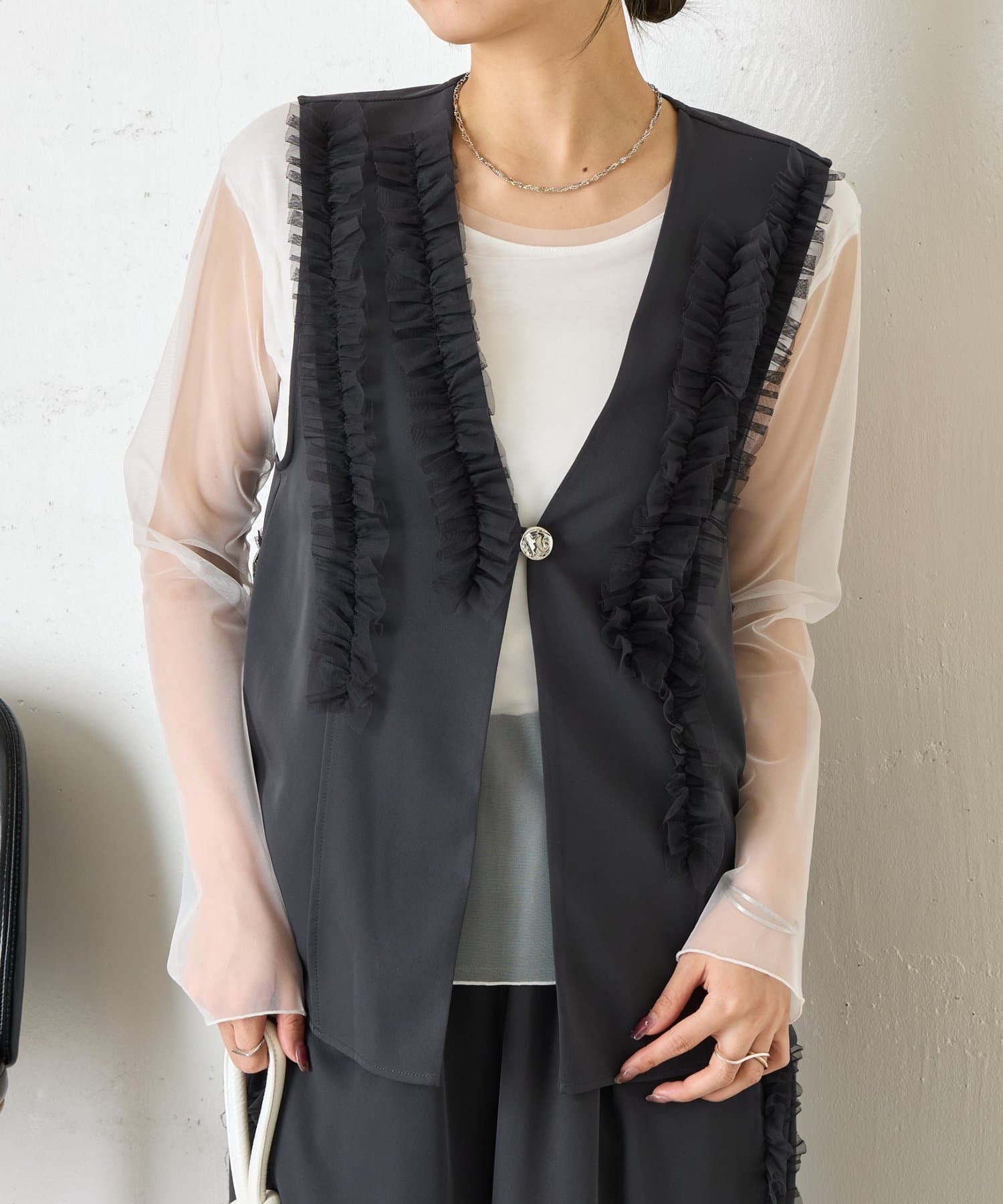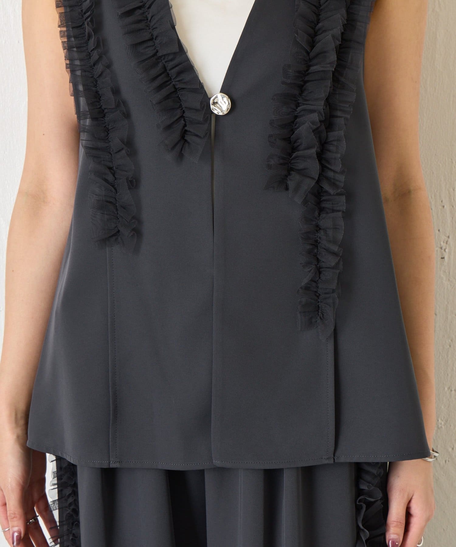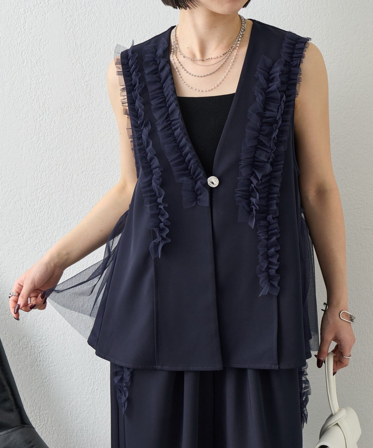 ・フリルを重ねたチュールベストが目を惹くデザインのオケージョンアイテムです。