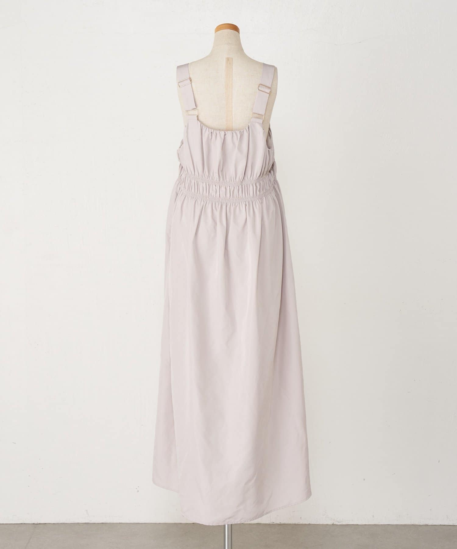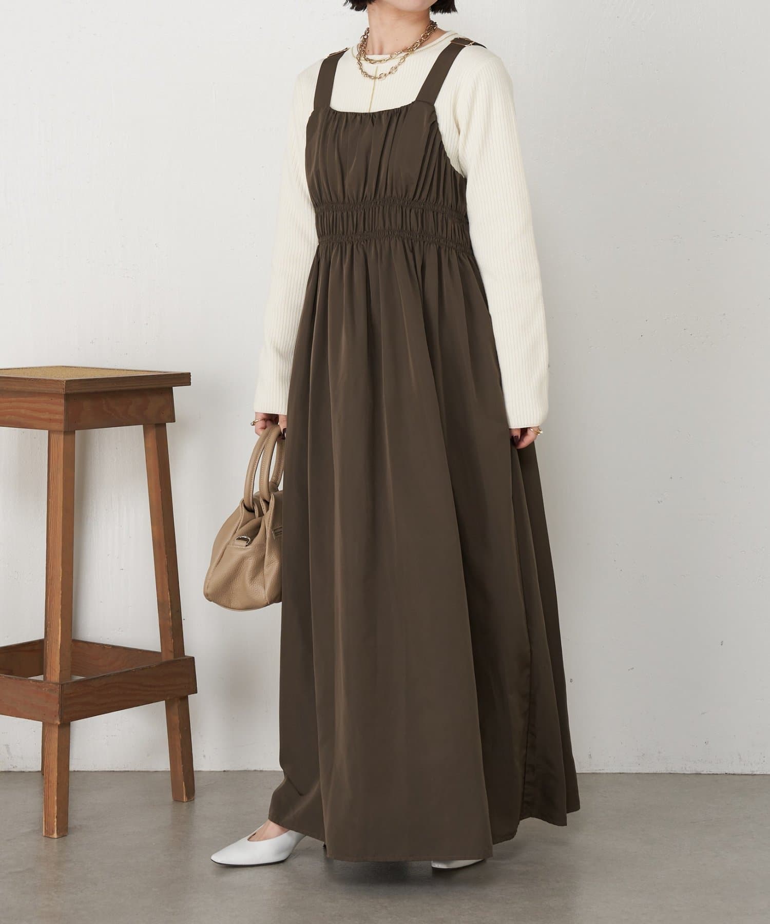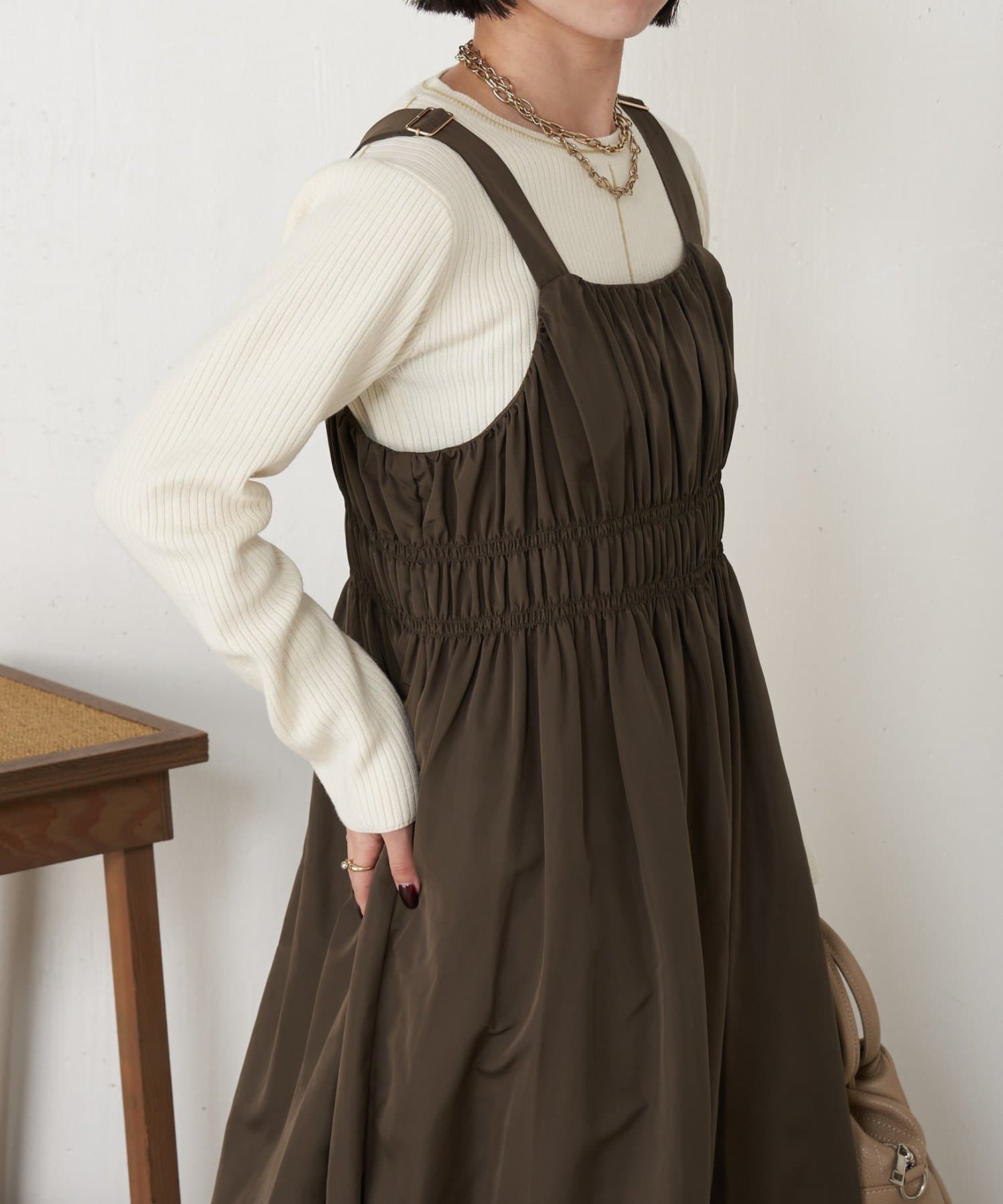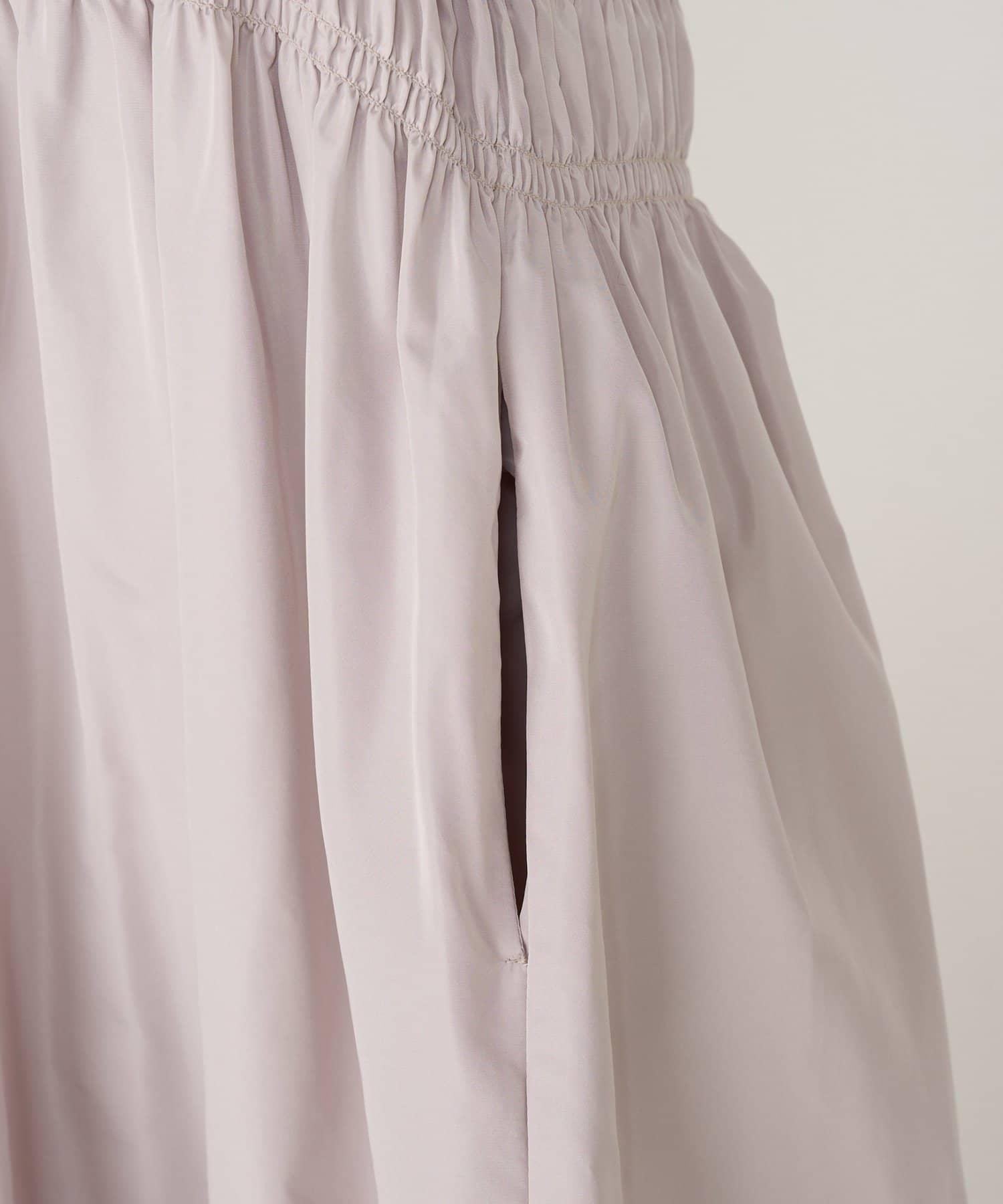 ・ウエストのシャーリングデザインが大人の甘さをプラスしたカジュアル過ぎないナイロン素材のジャンスカ。