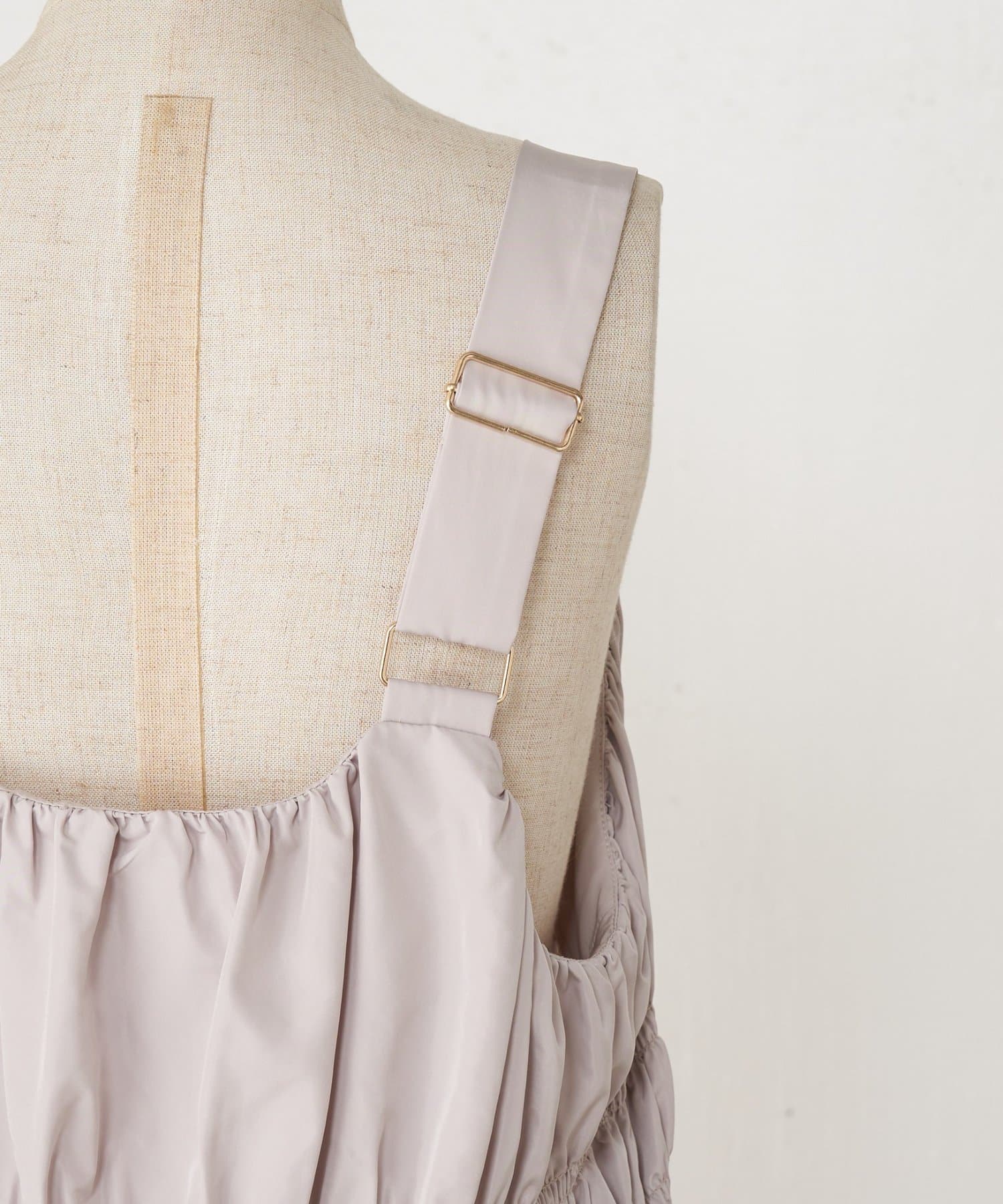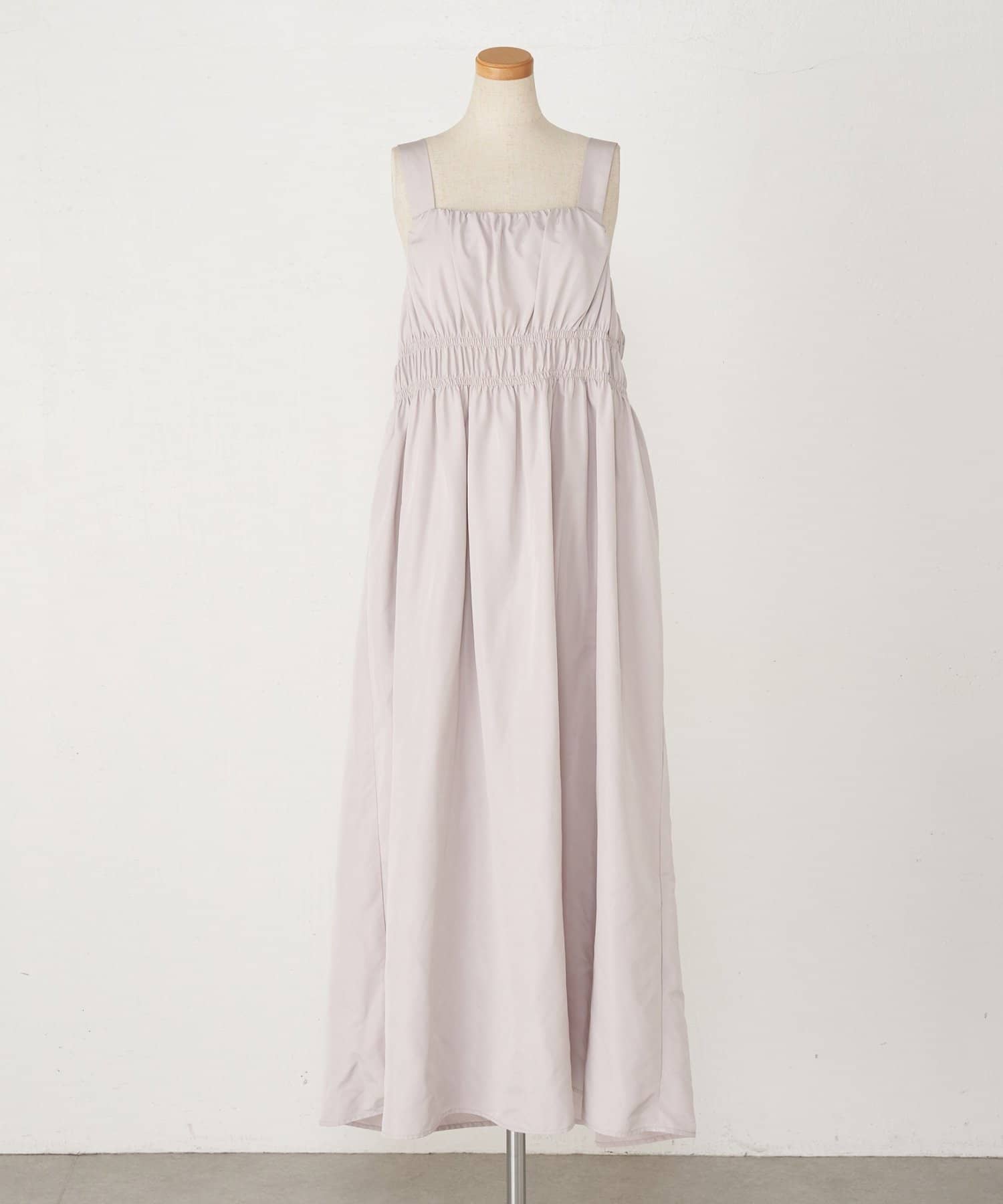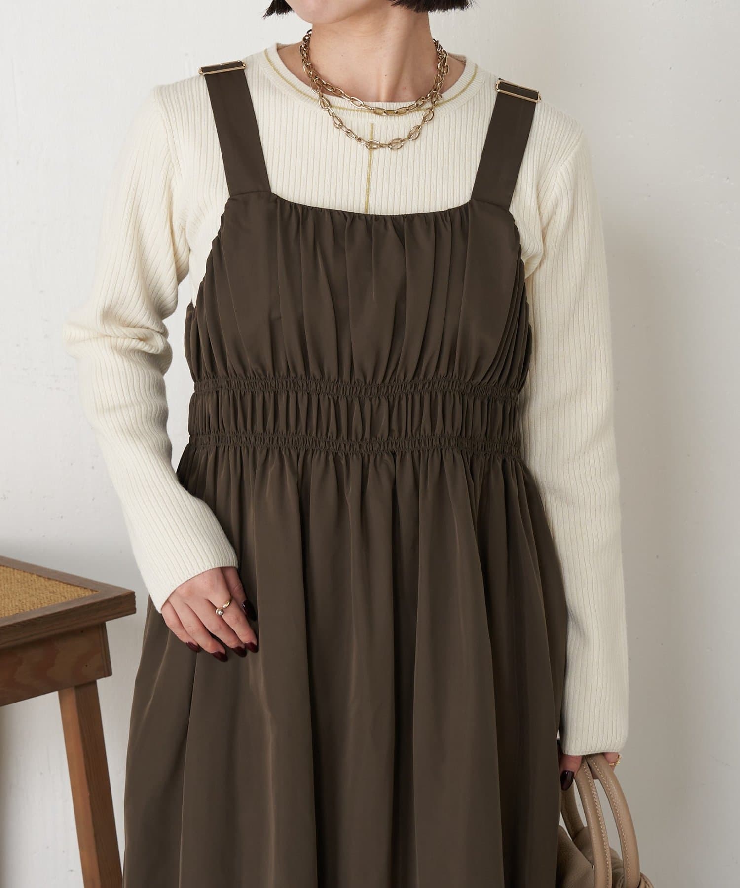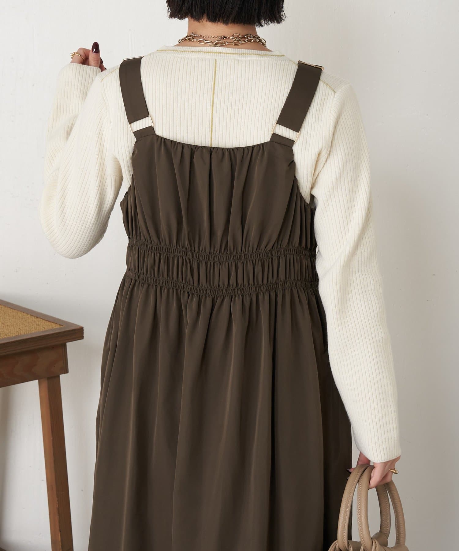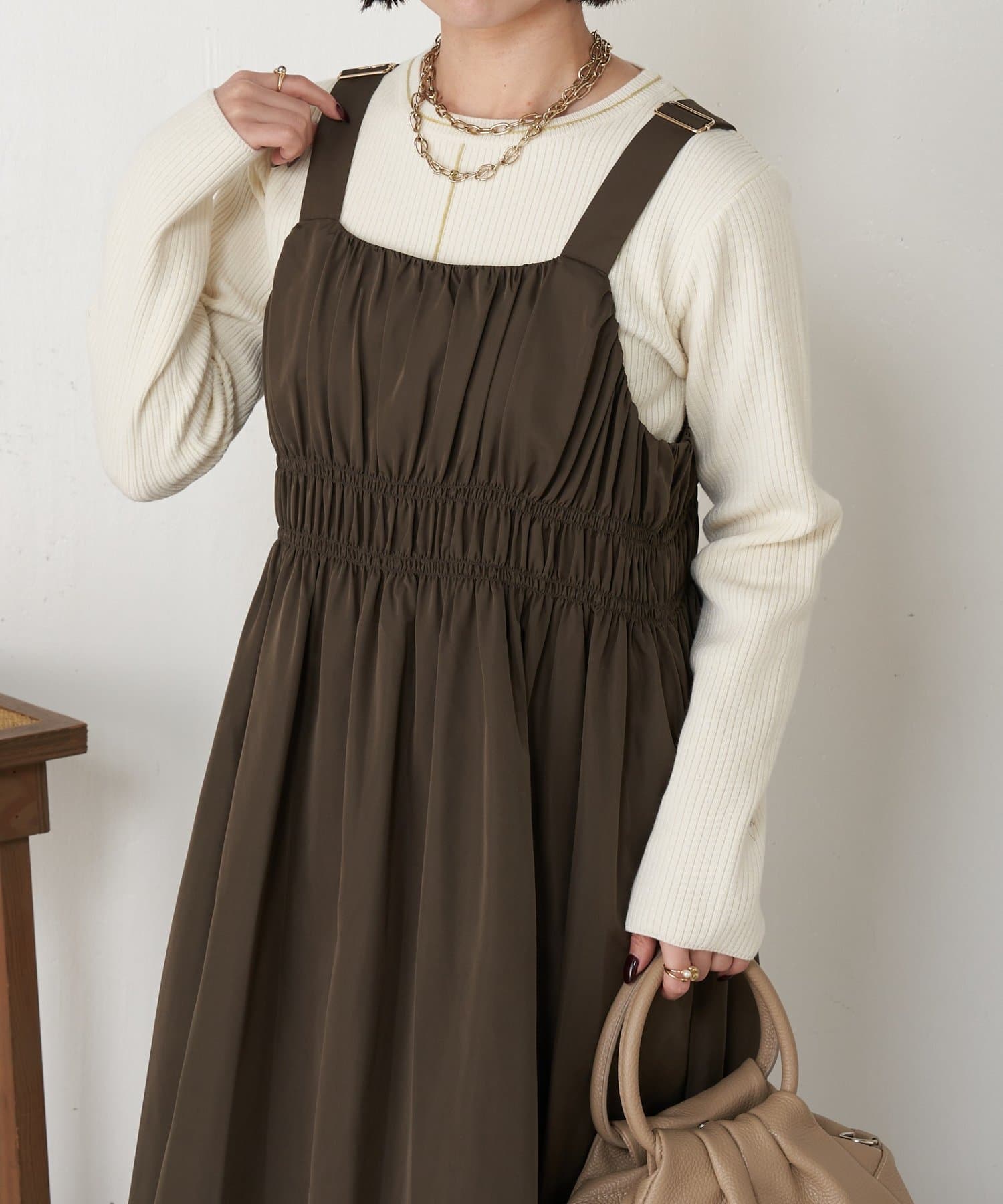 ・ウエストのシャーリングデザインが大人の甘さをプラスしたカジュアル過ぎないナイロン素材のジャンスカ。
