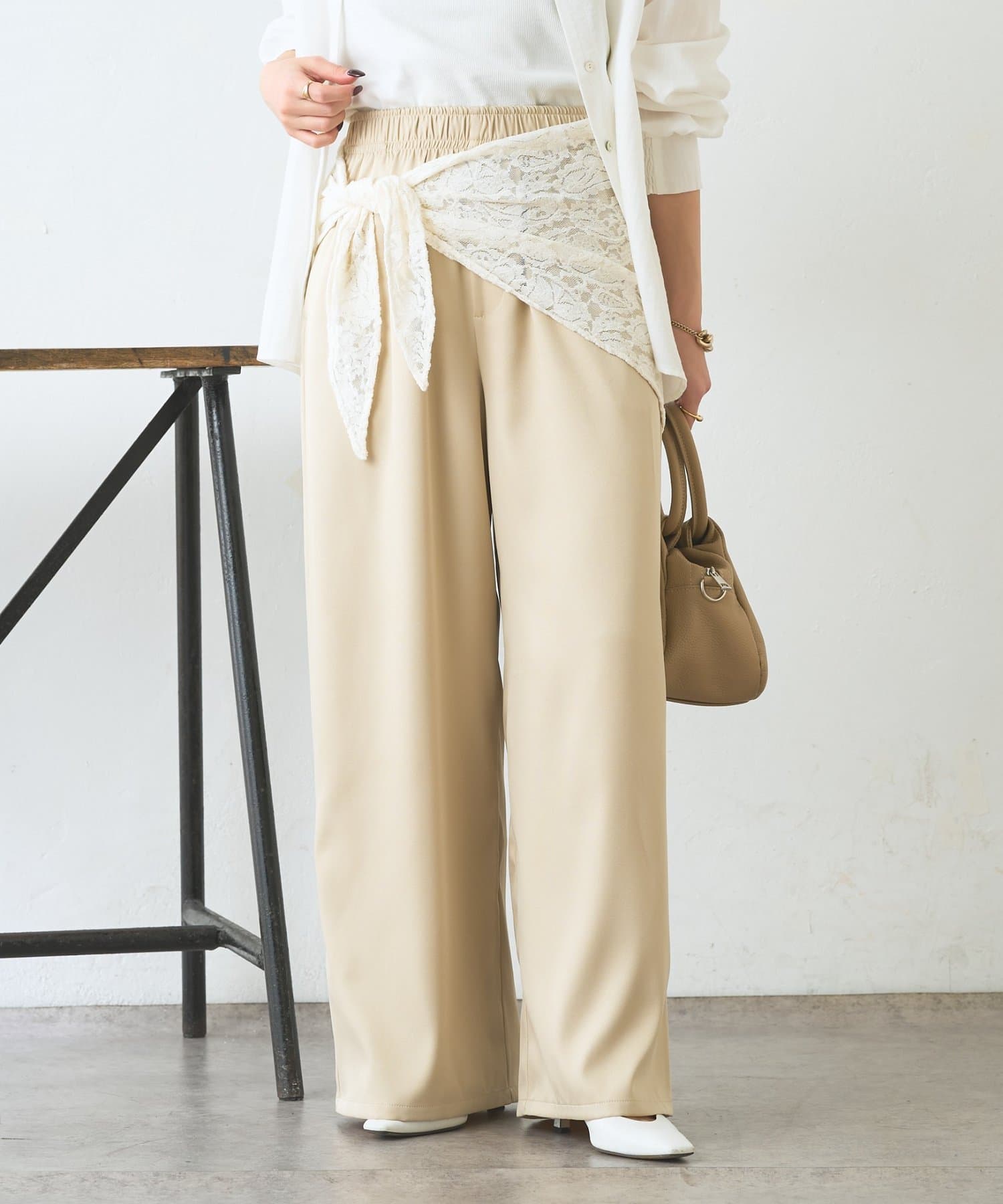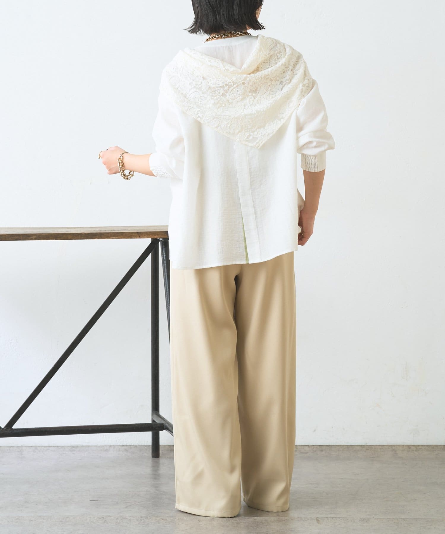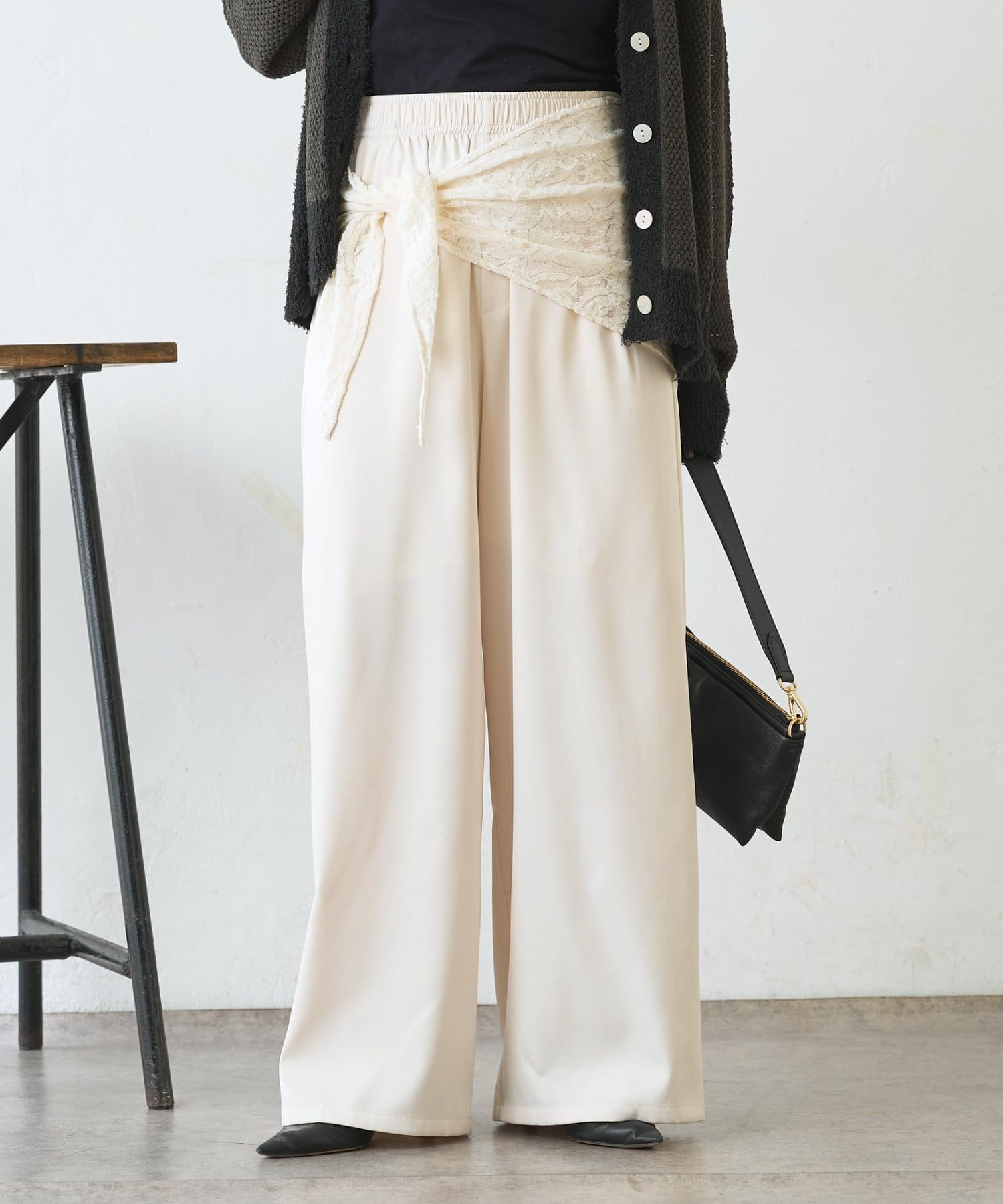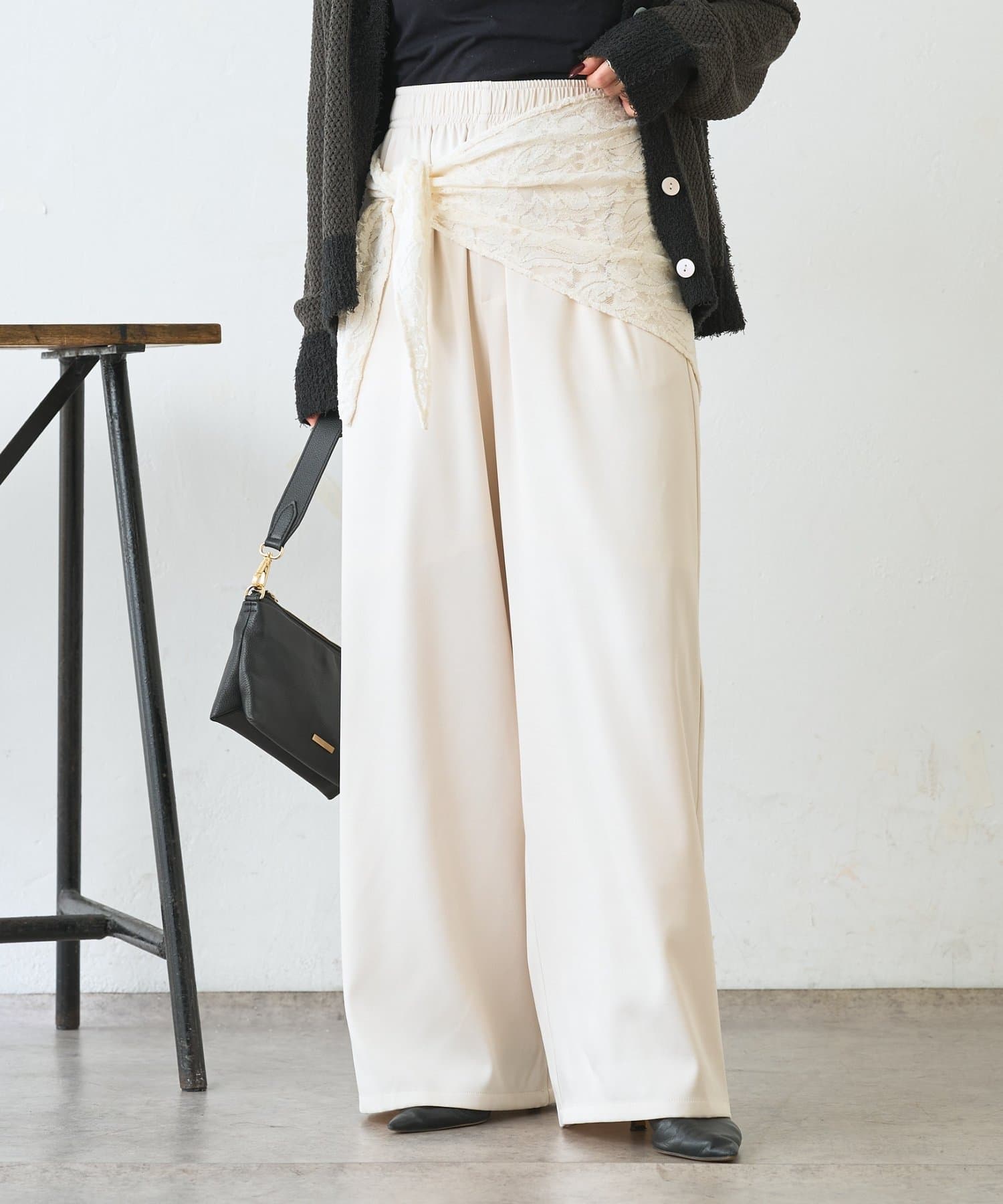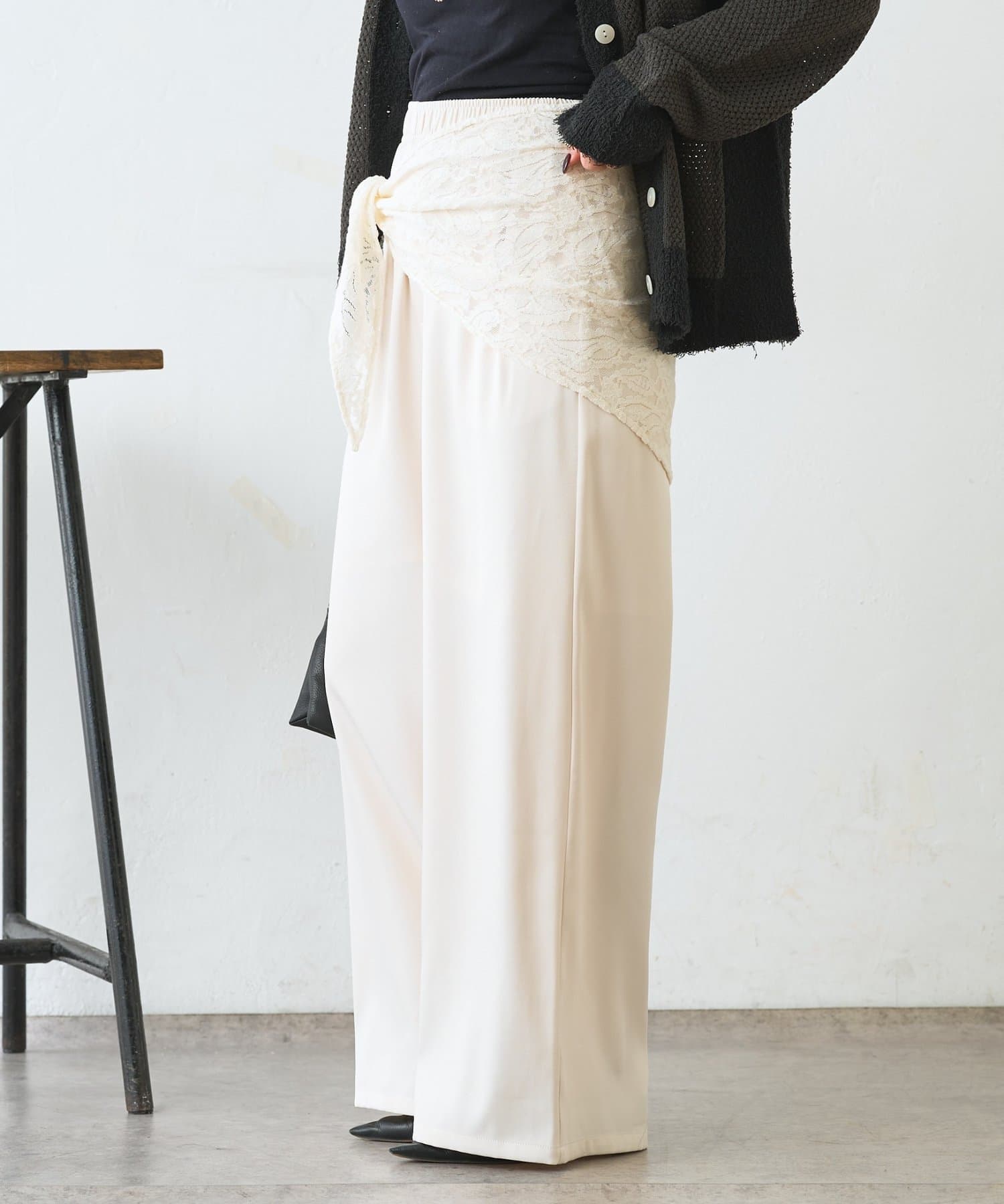 ・レーススカーフ付きで、いつものワイドパンツがぐっと華やぐデザイン