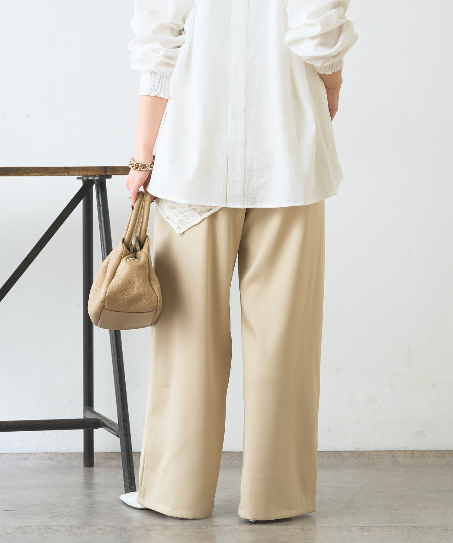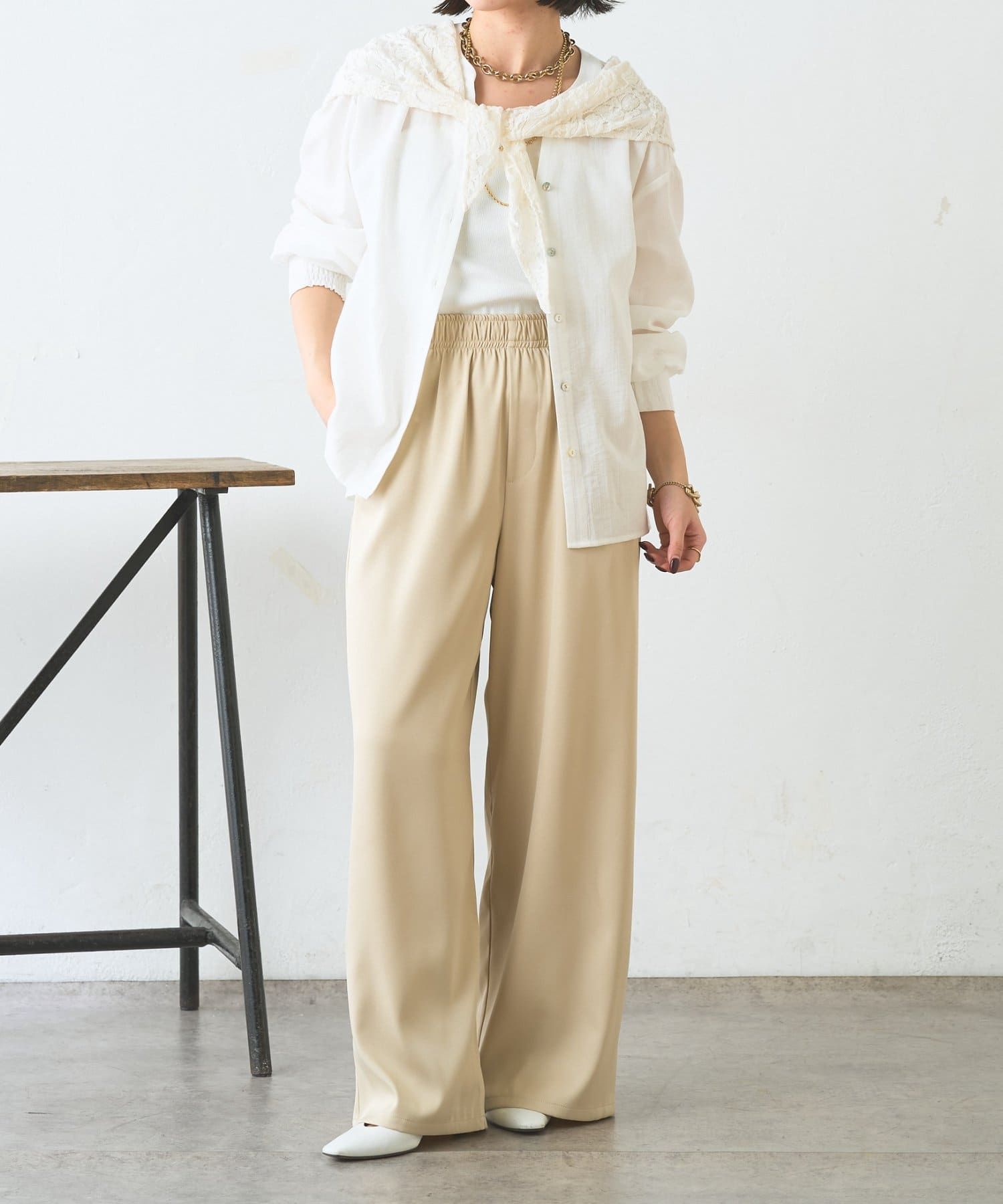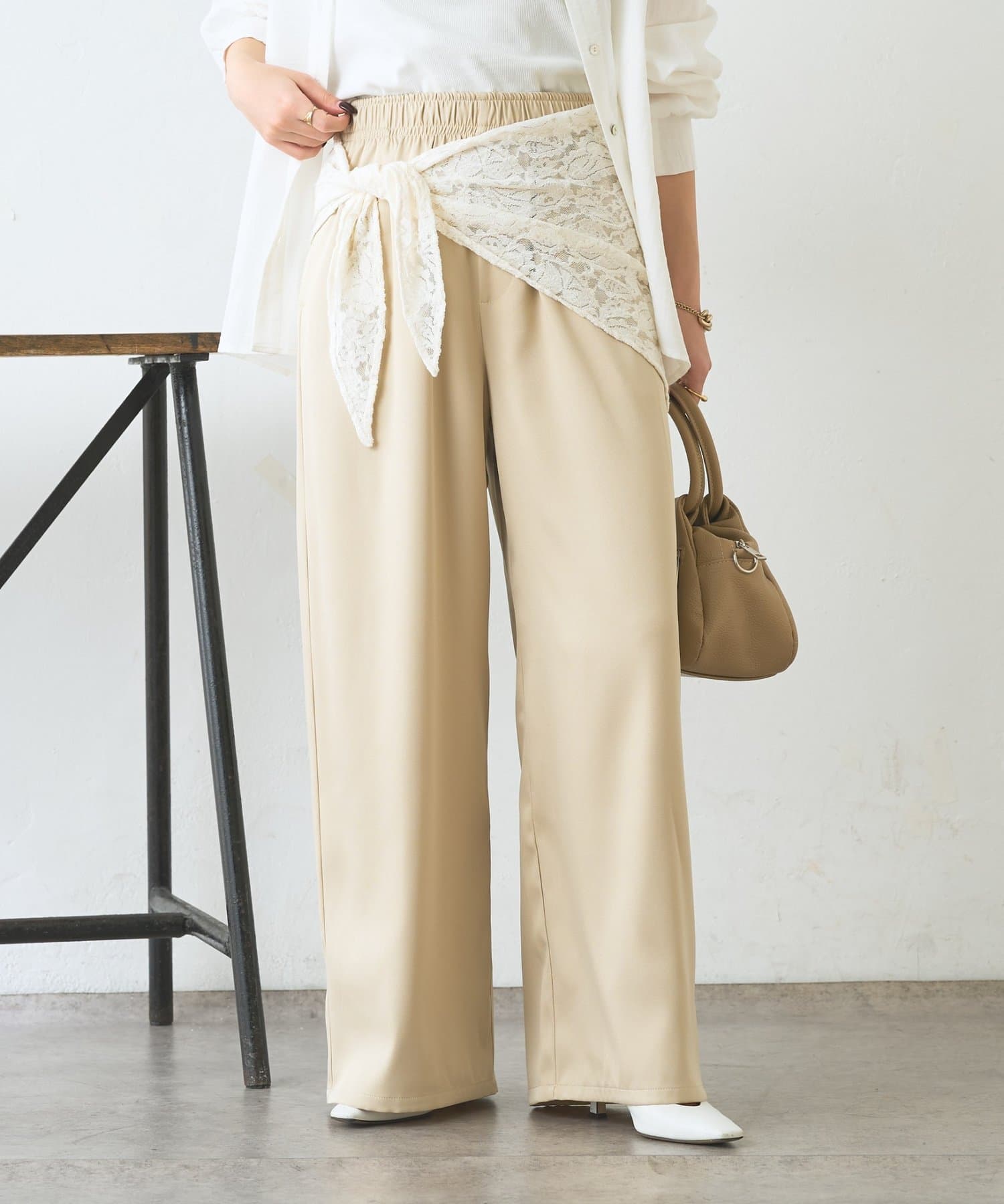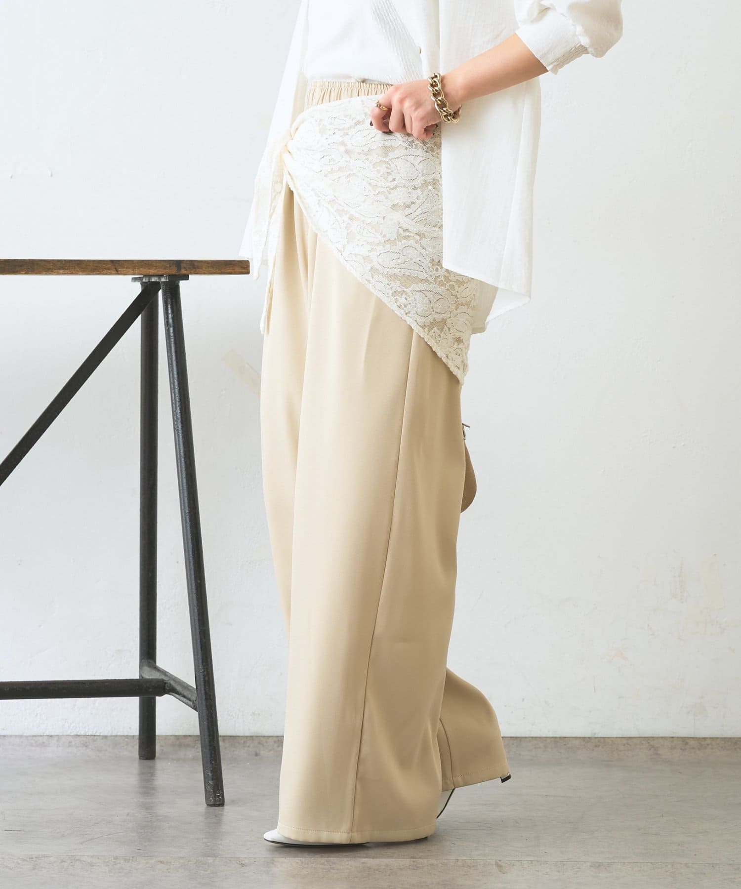 ・レーススカーフ付きで、いつものワイドパンツがぐっと華やぐデザイン