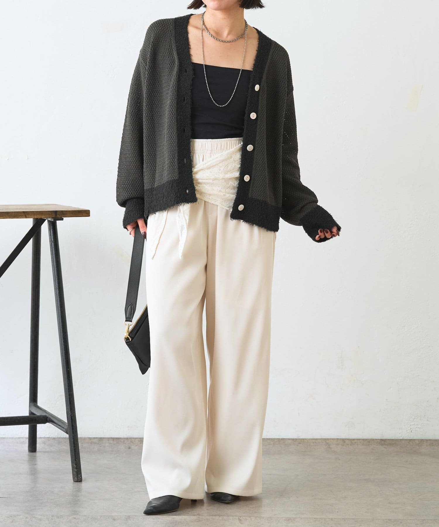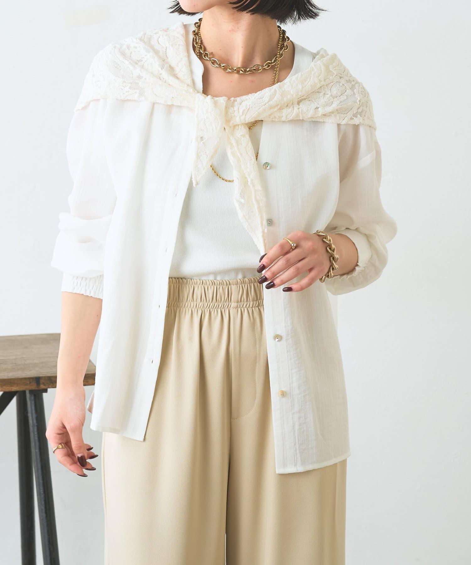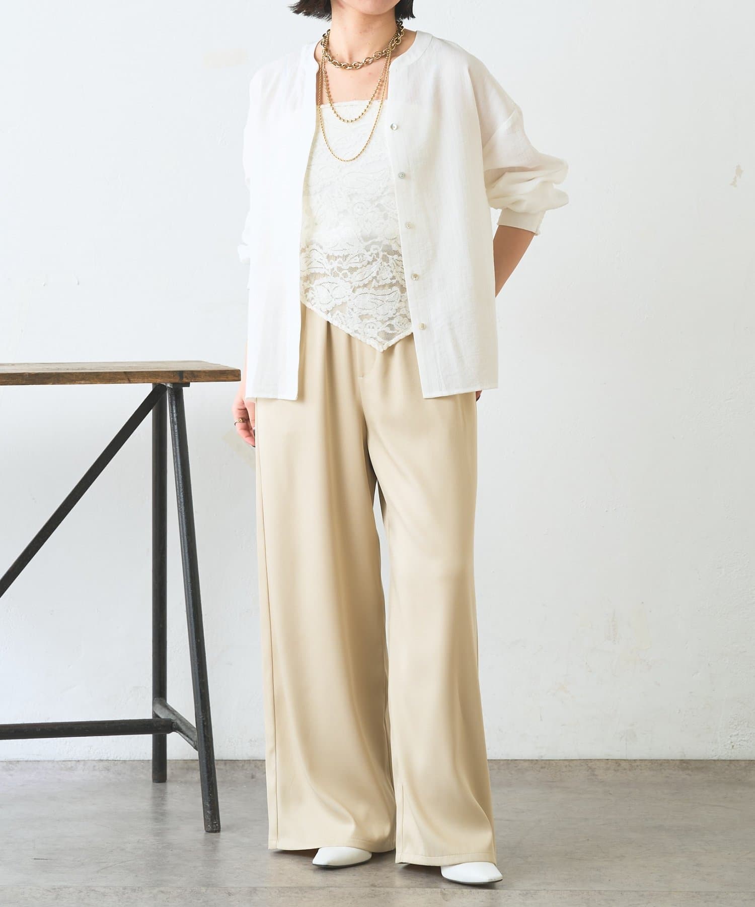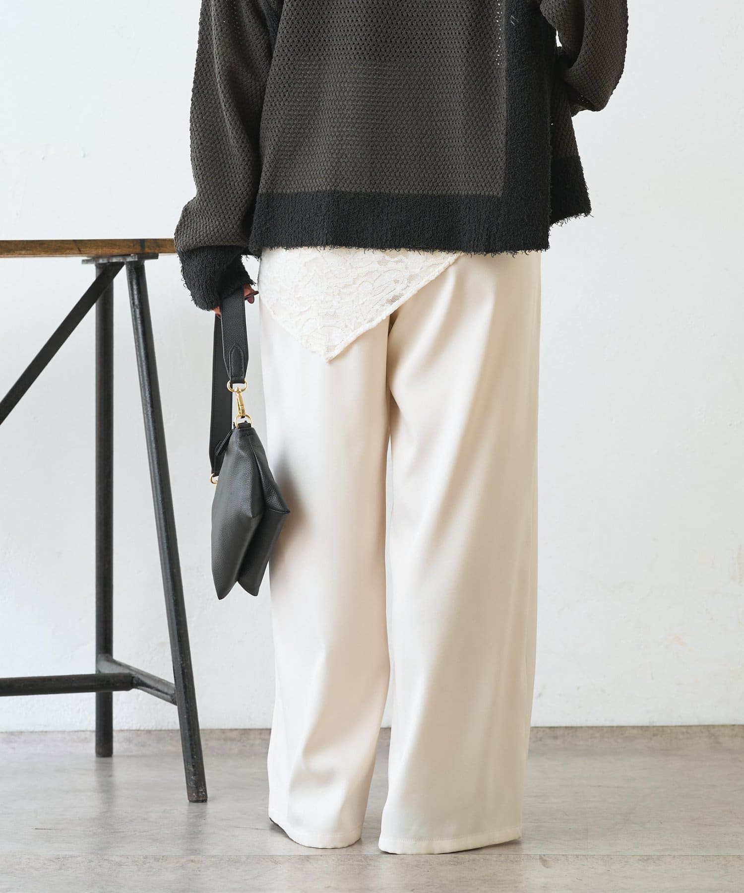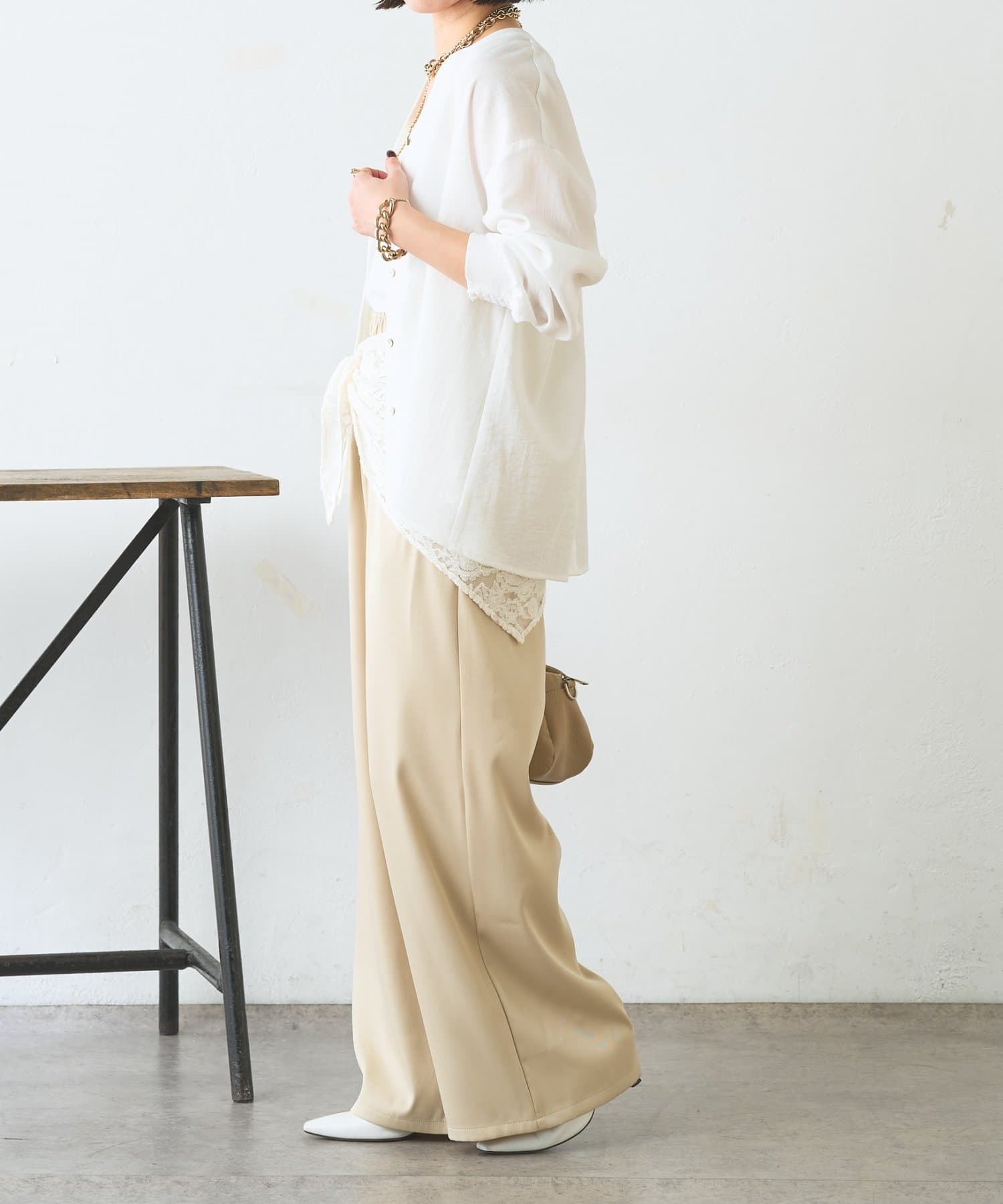 ・レーススカーフ付きで、いつものワイドパンツがぐっと華やぐデザイン
