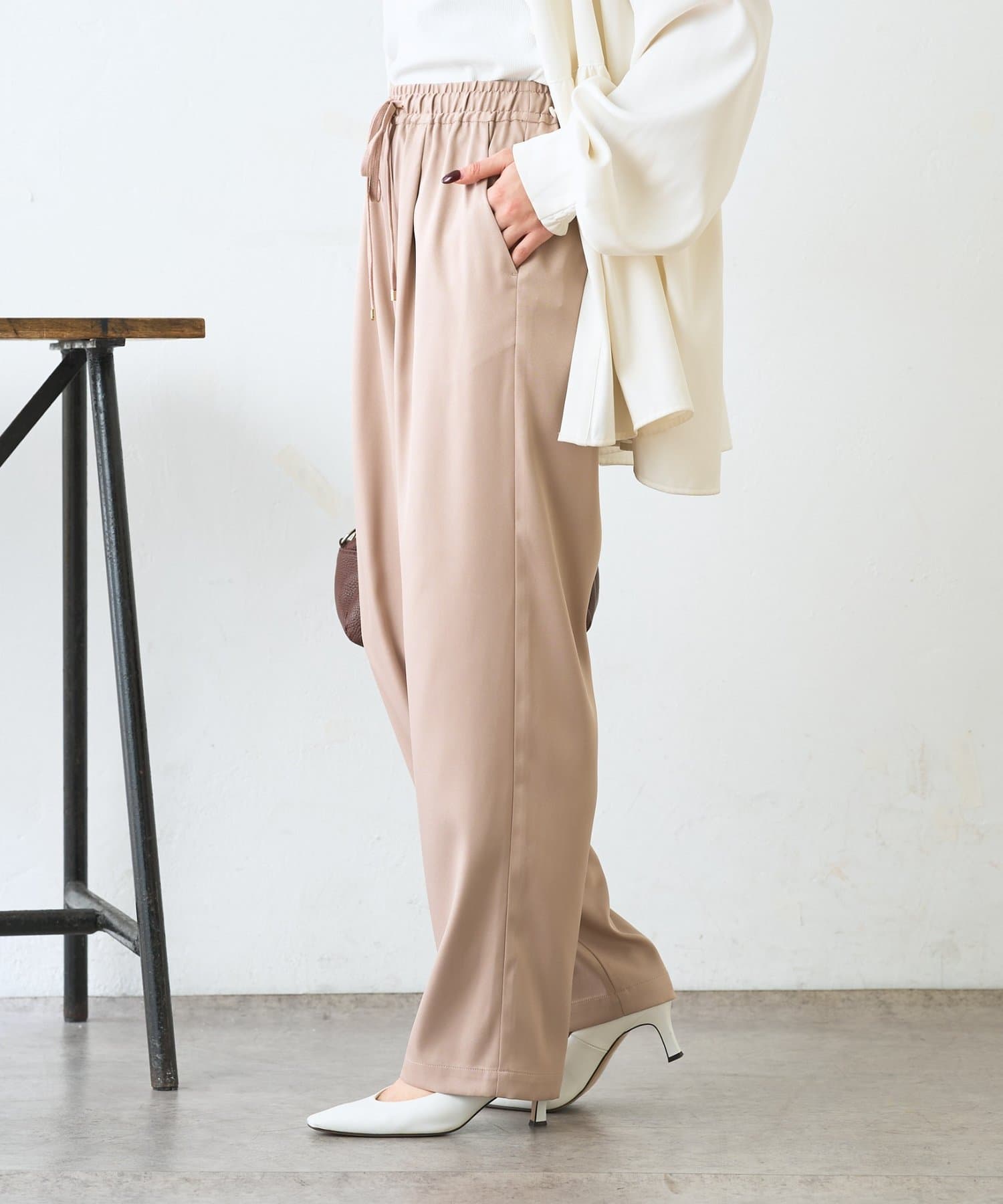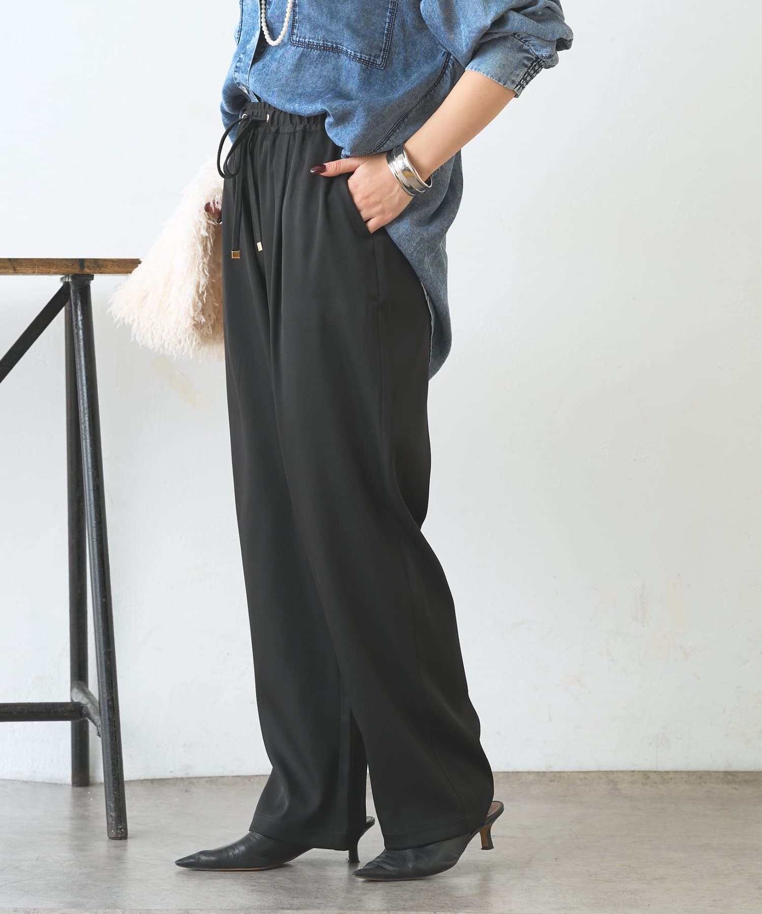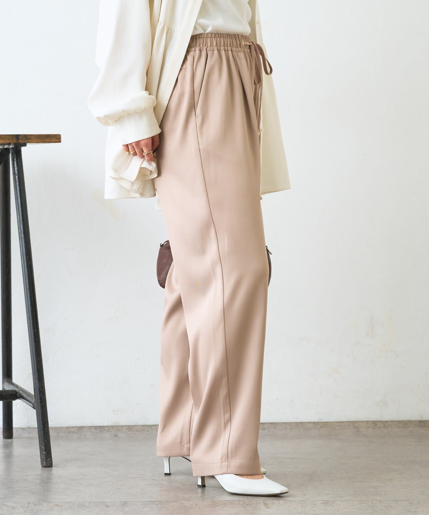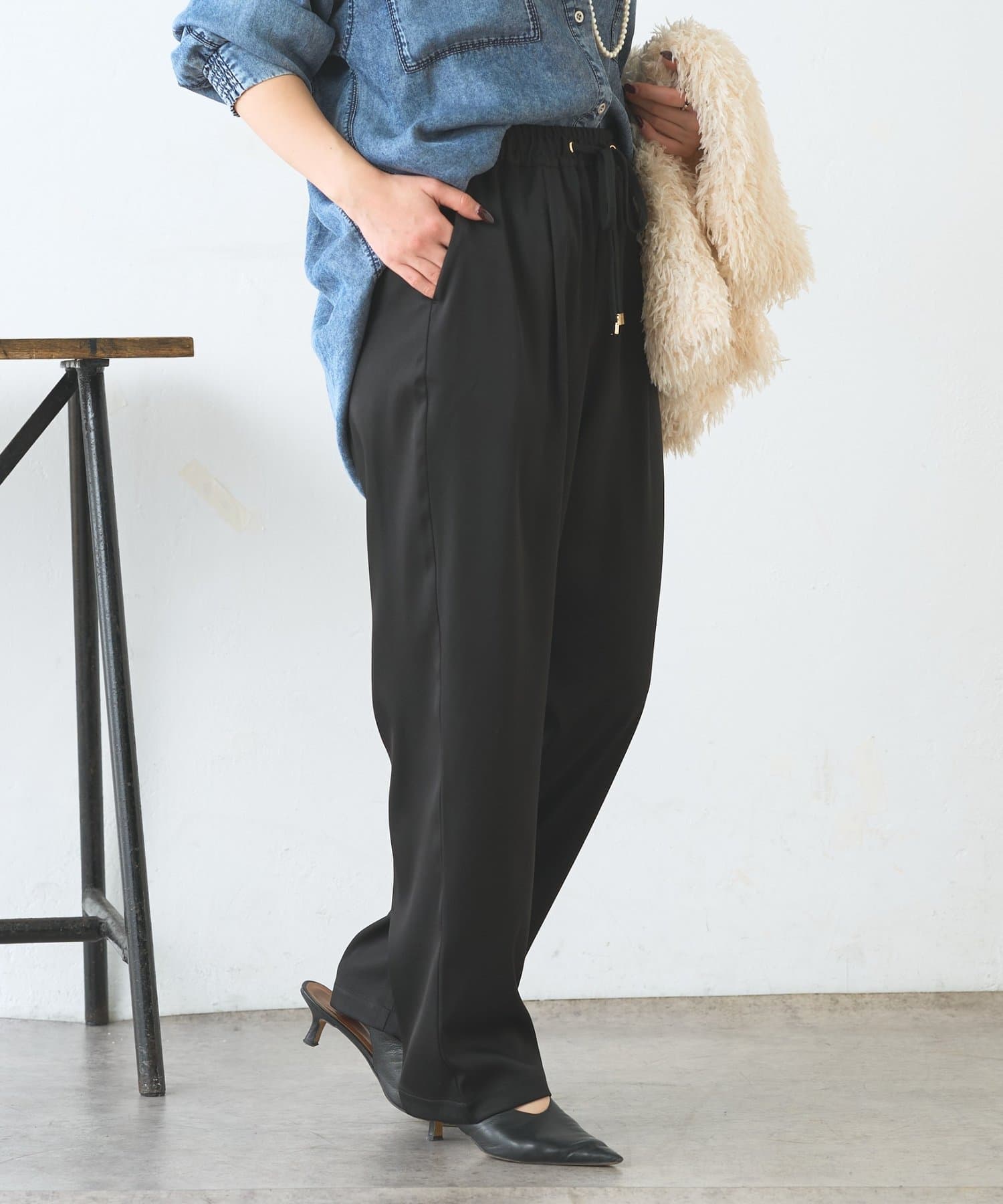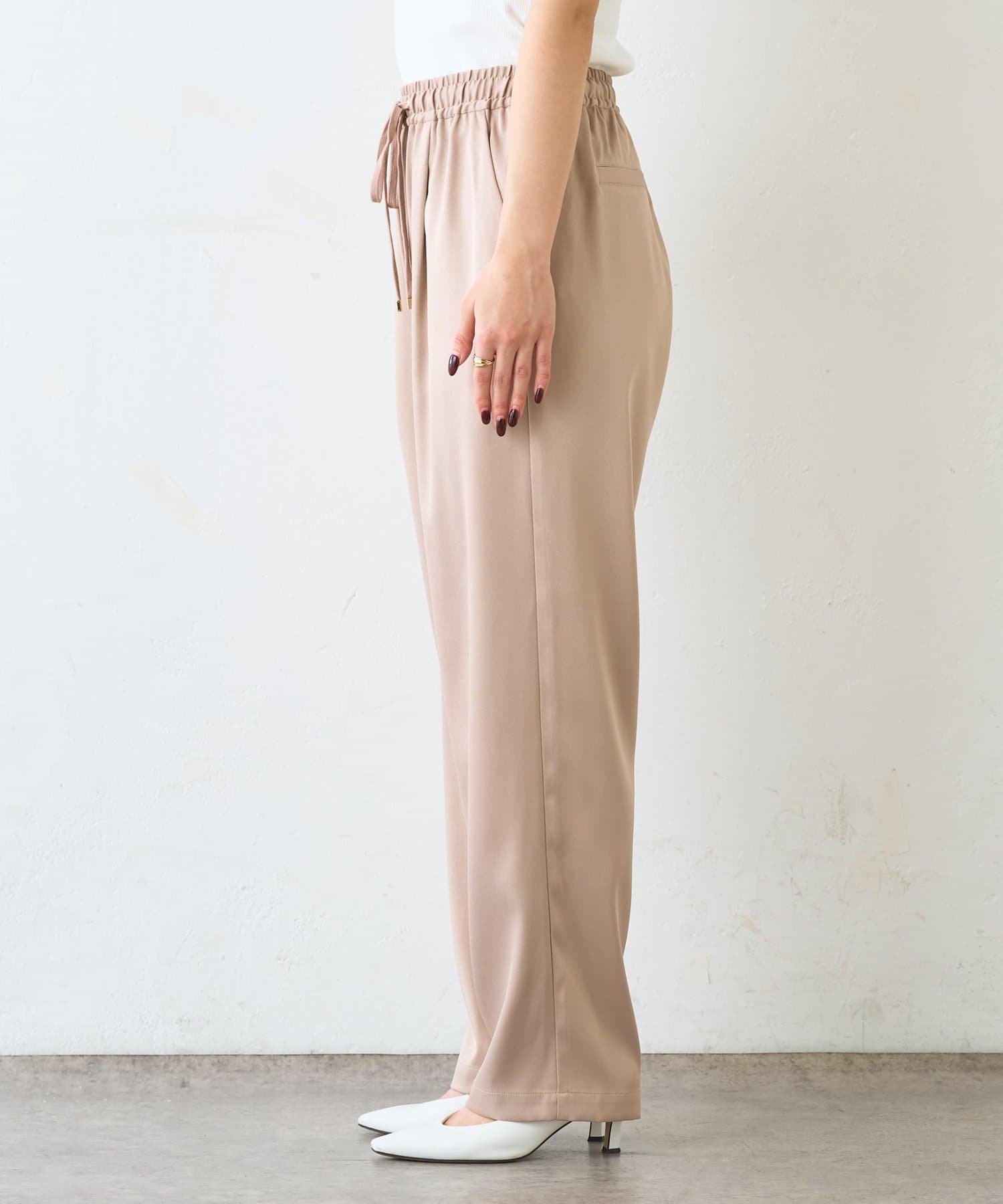 ・サテンライクな艶感が上品で、イージーパンツでもきれい見えします。