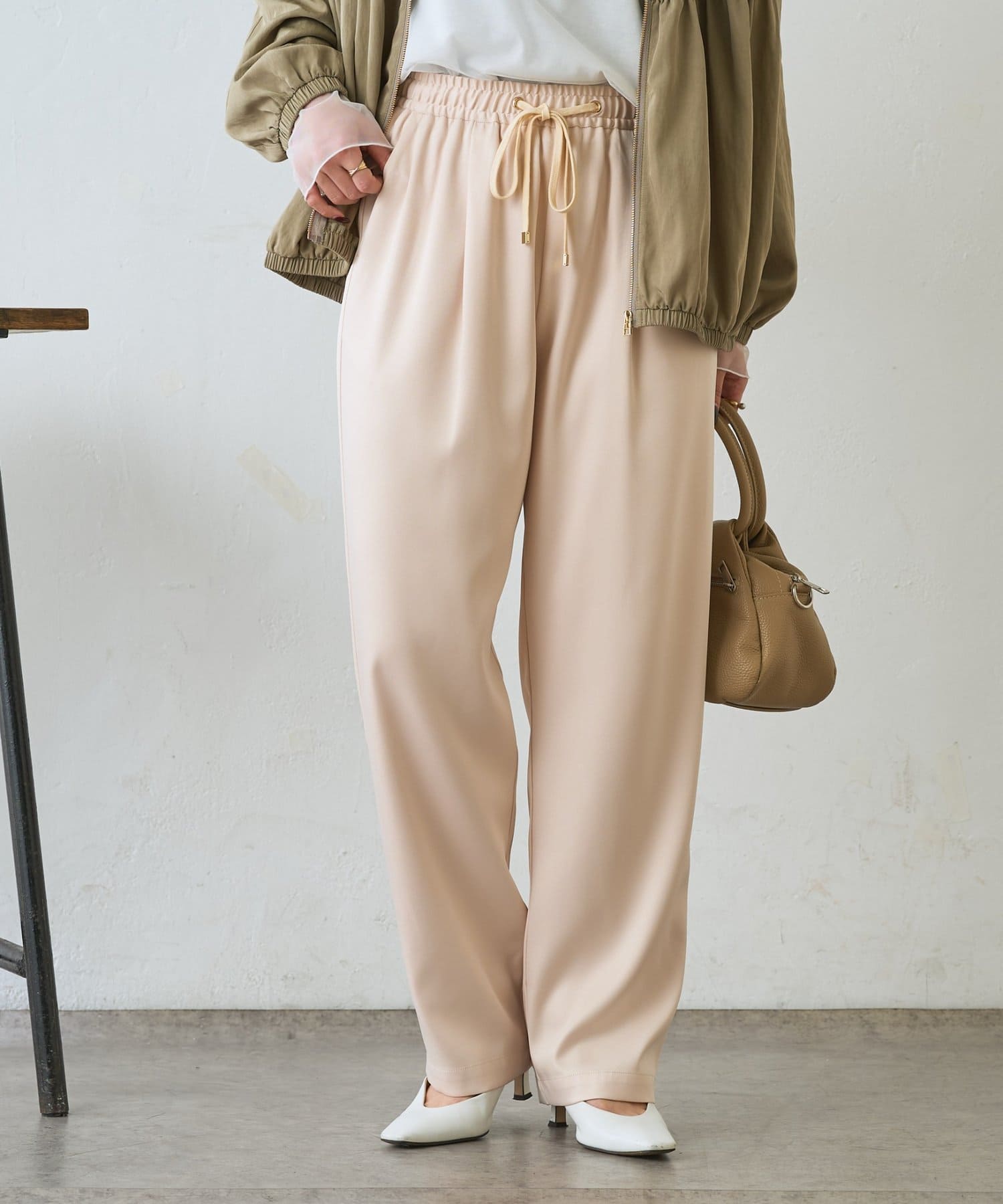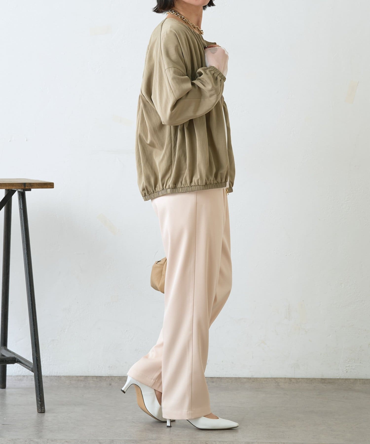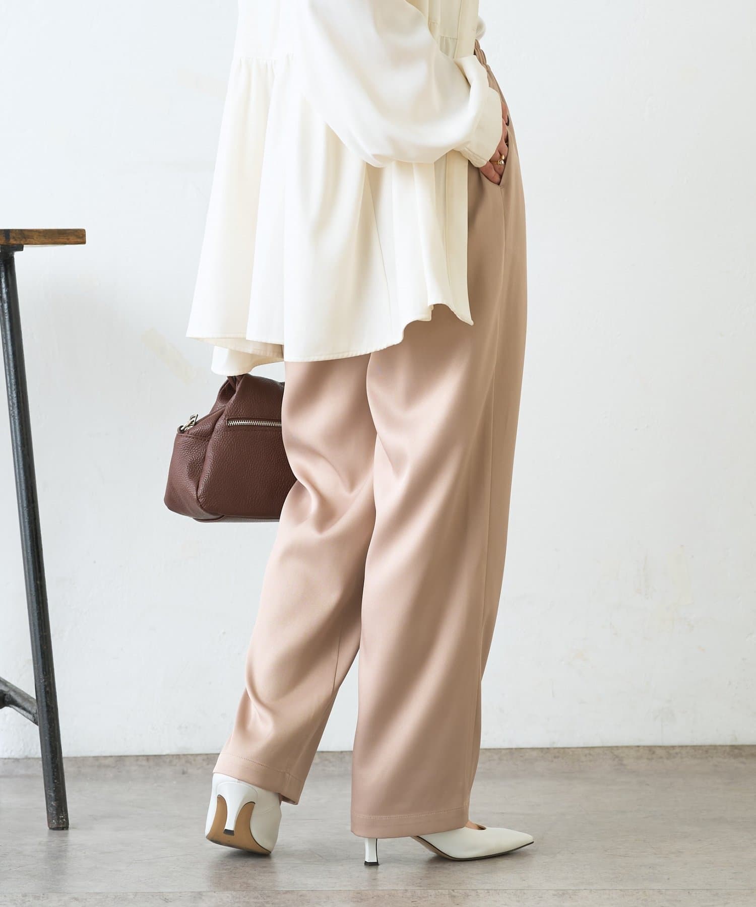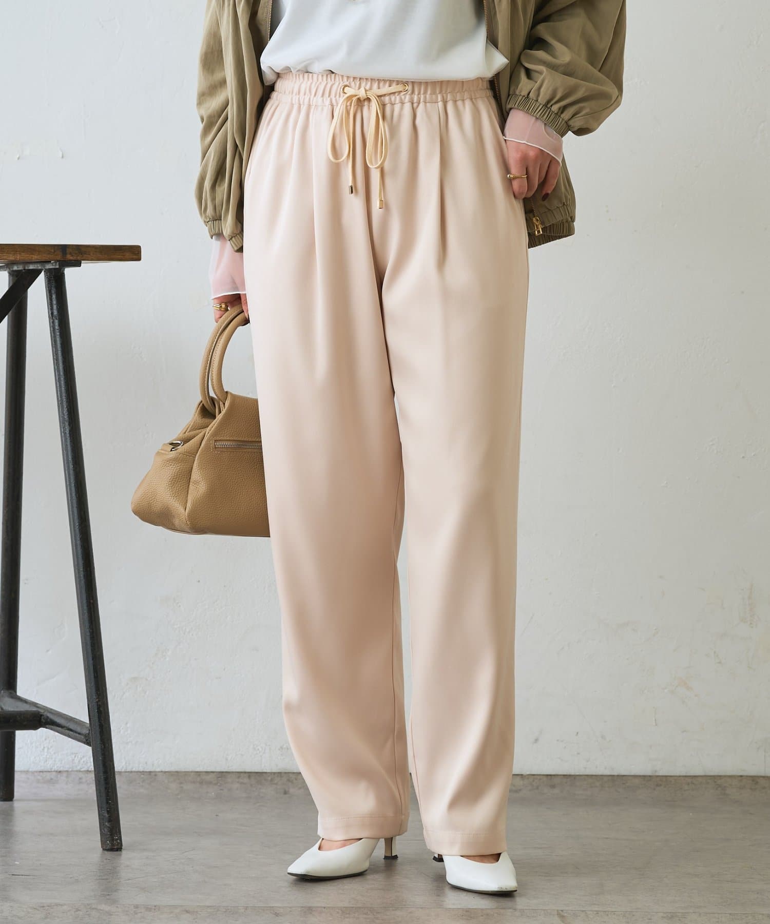 ・サテンライクな艶感が上品で、イージーパンツでもきれい見えします。