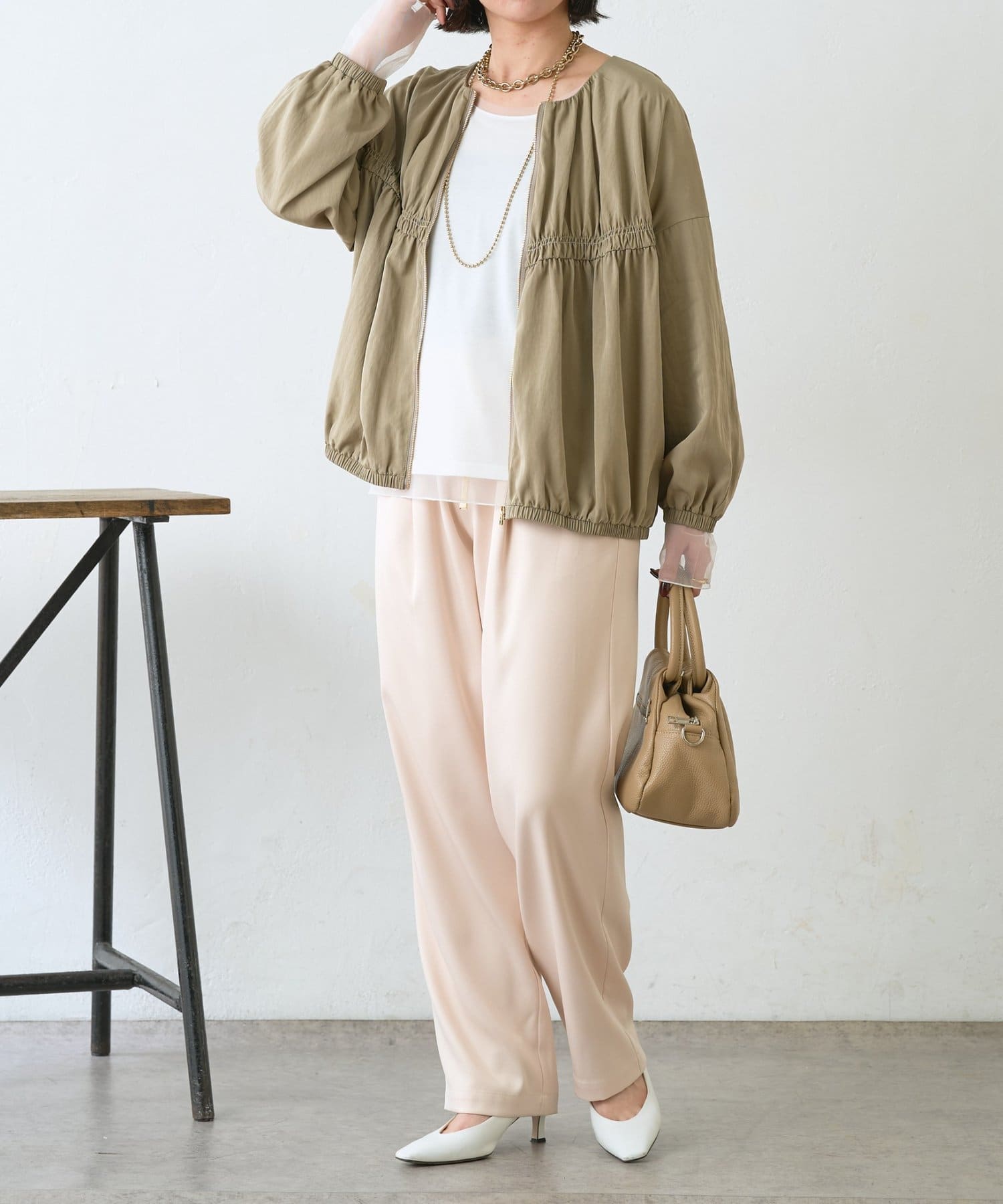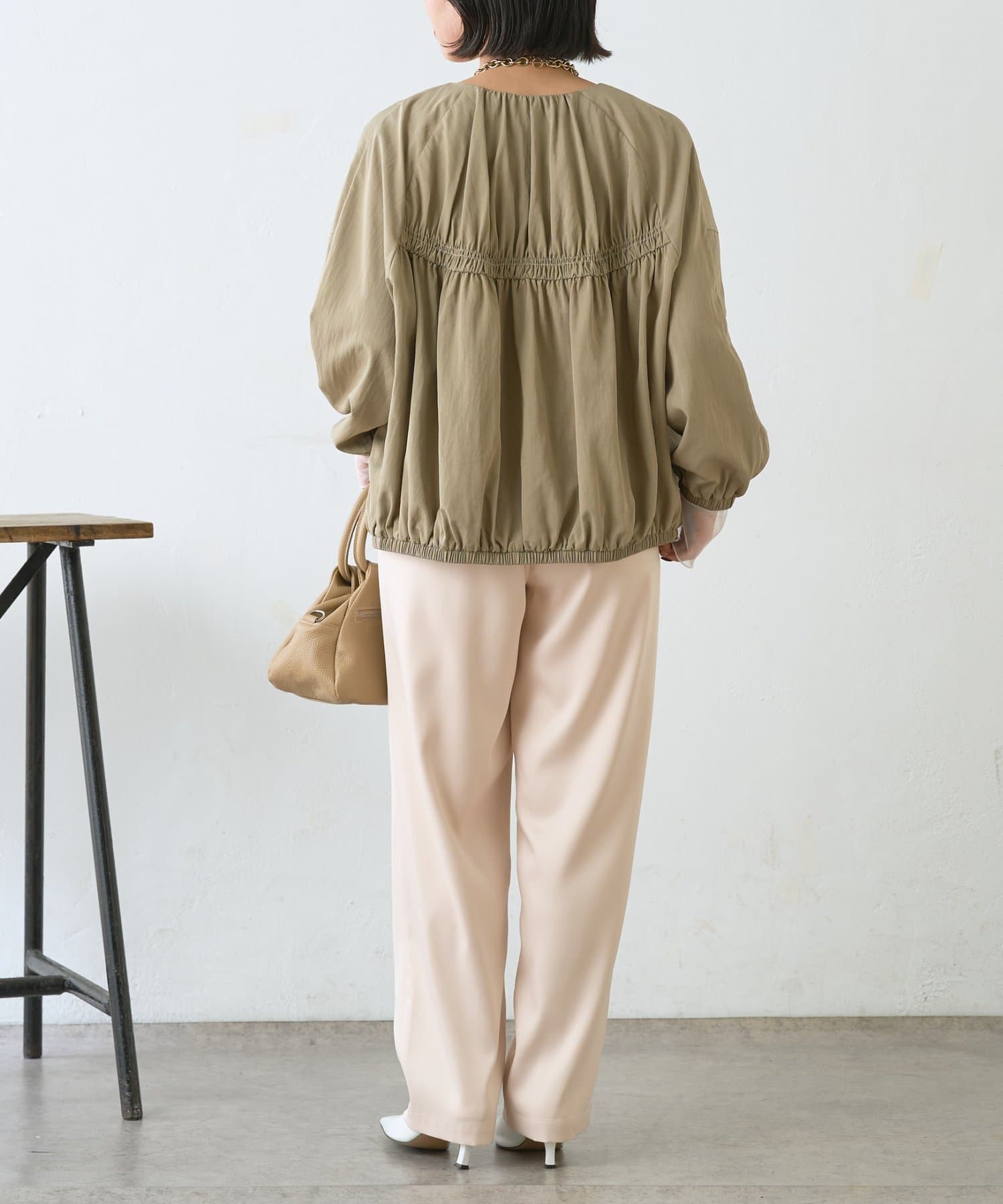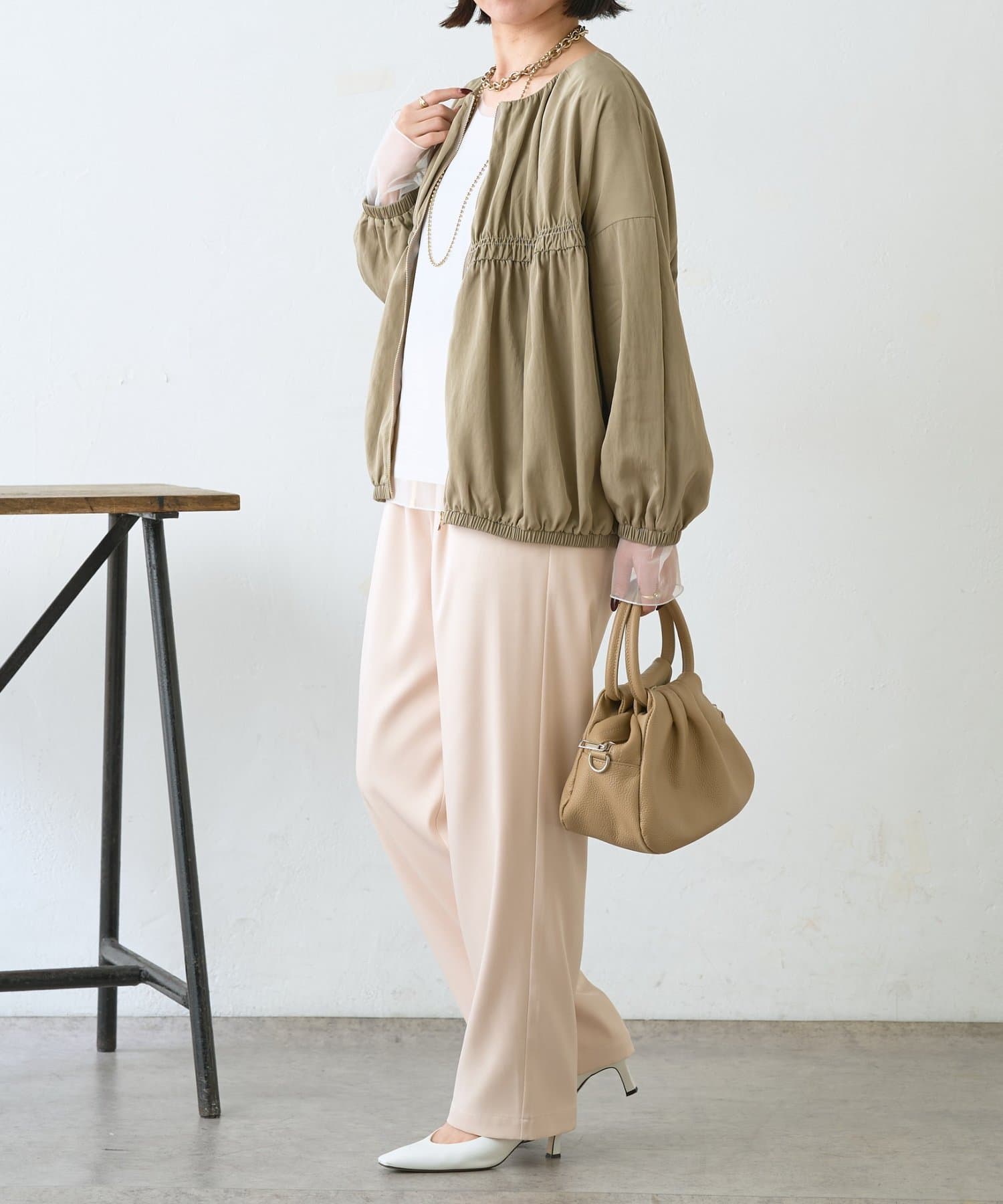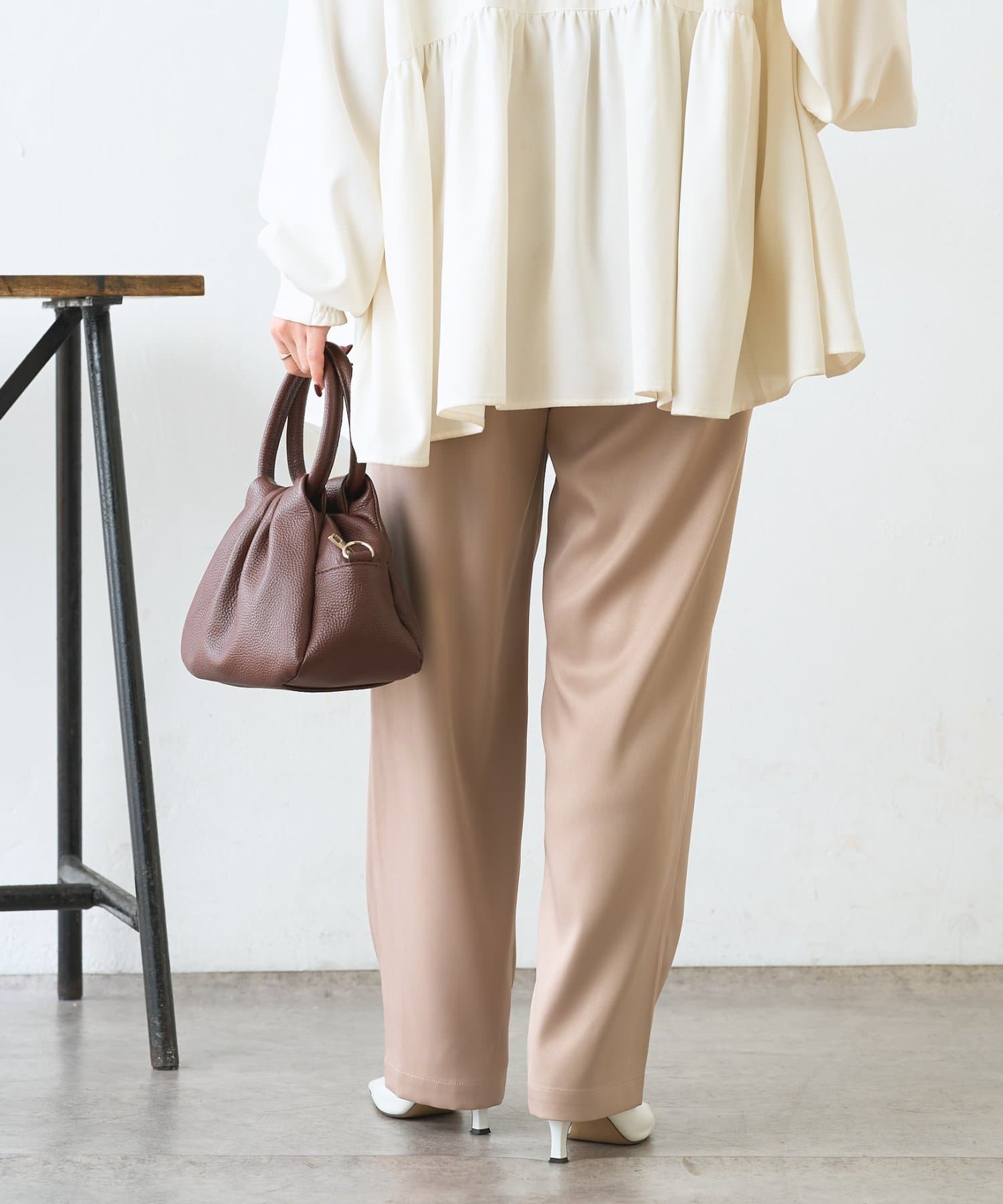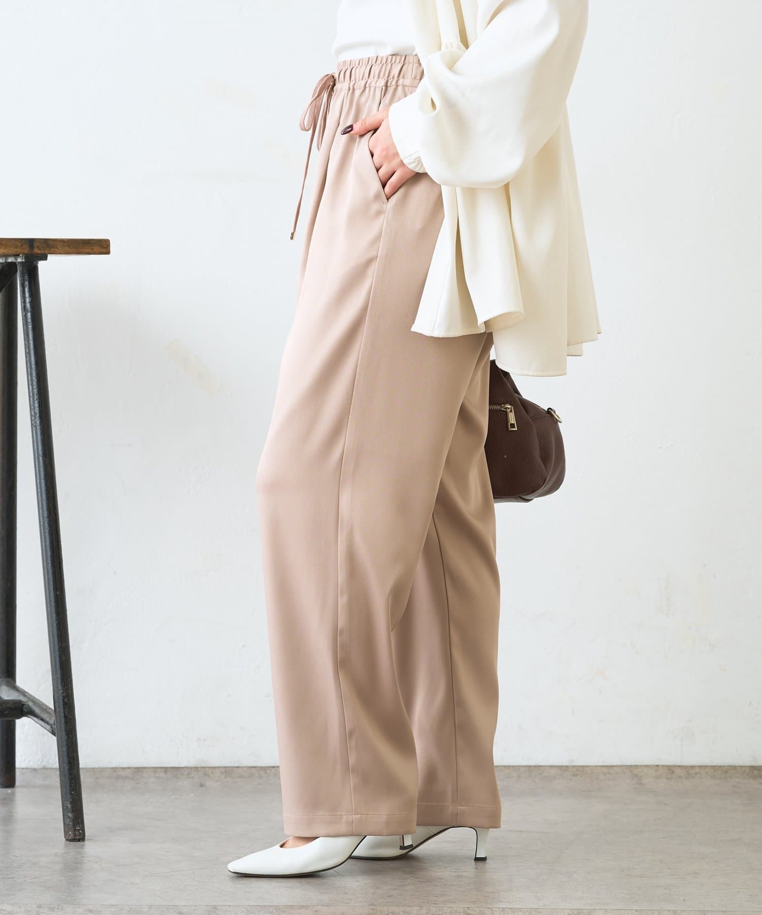 ・サテンライクな艶感が上品で、イージーパンツでもきれい見えします。