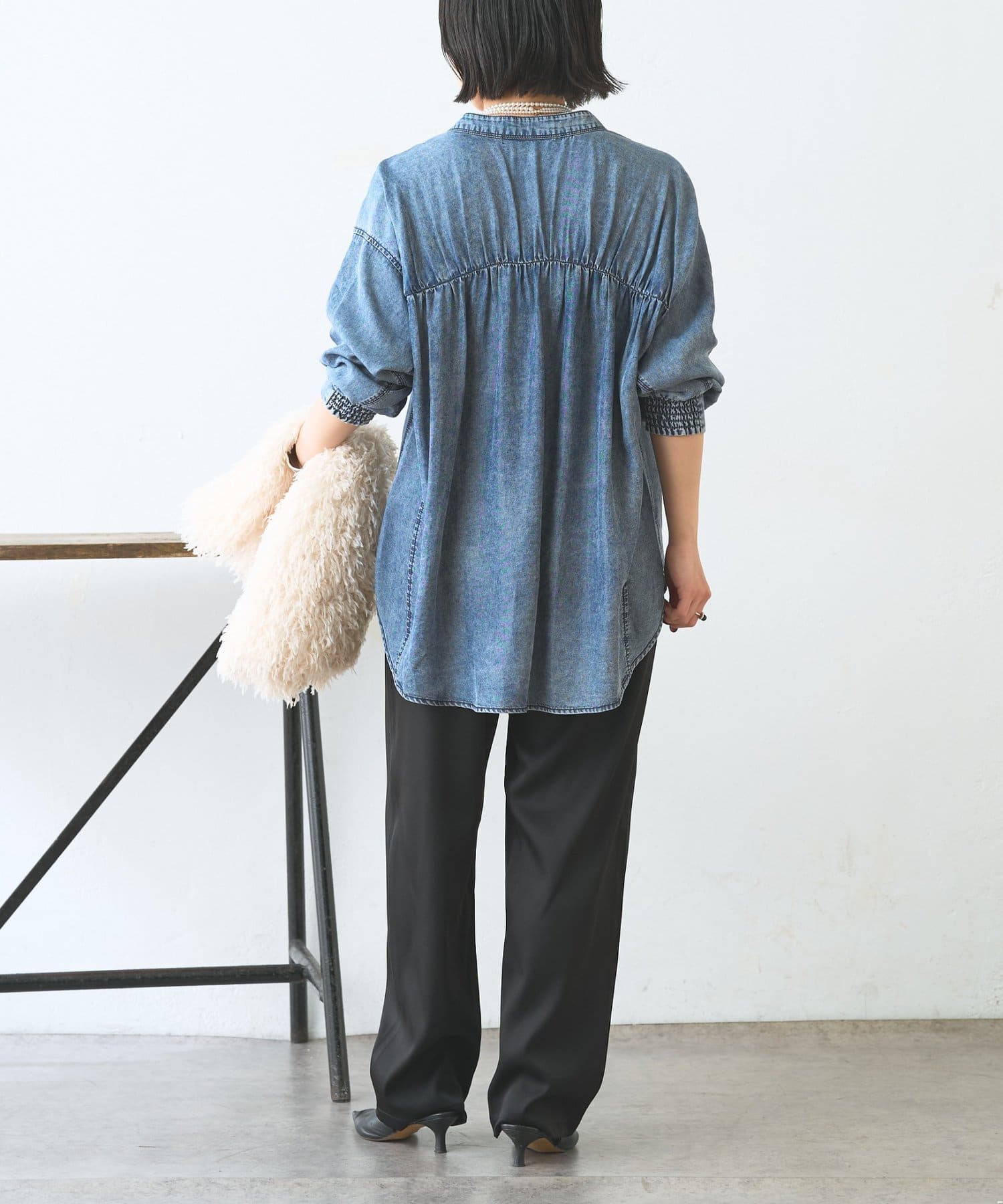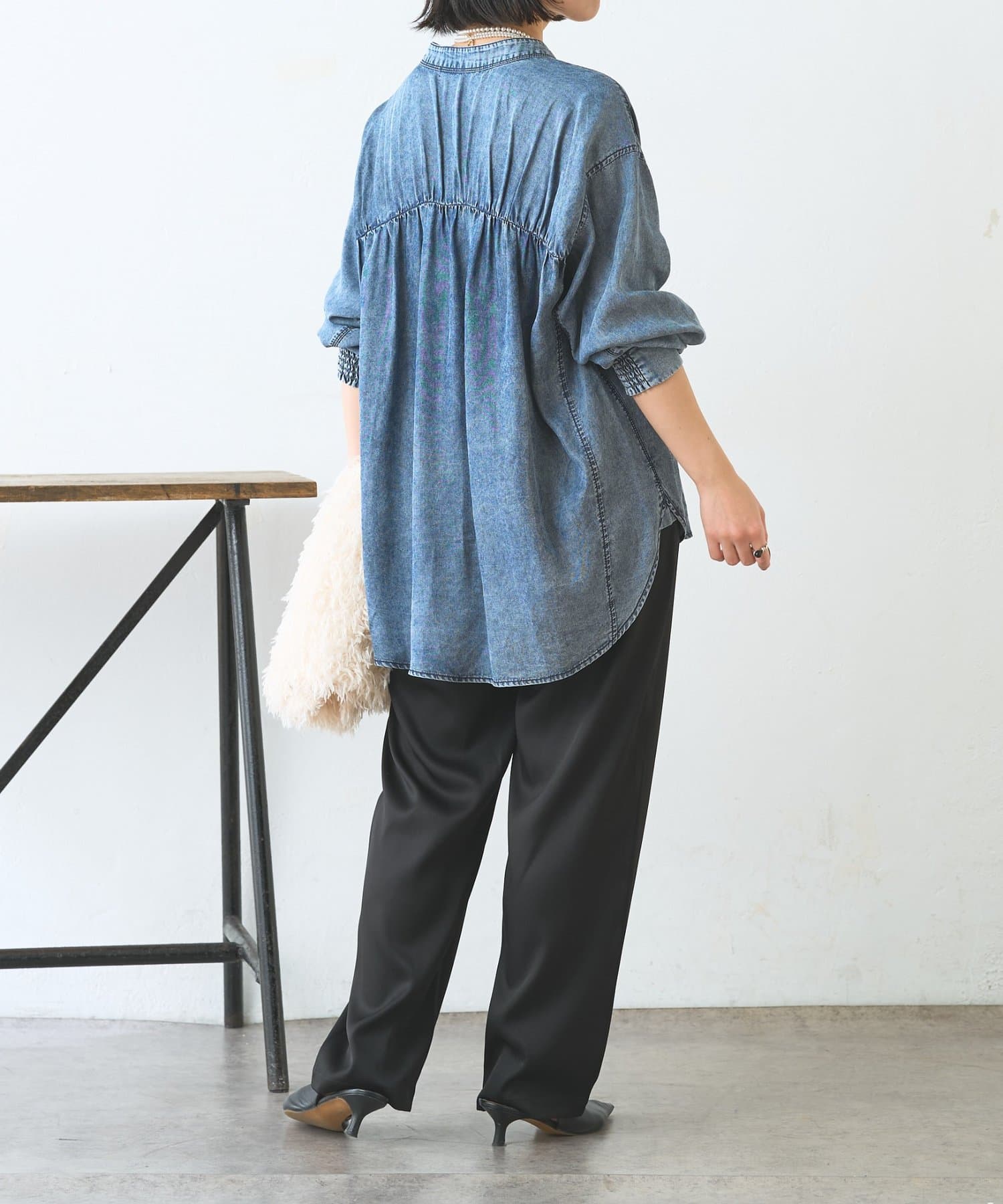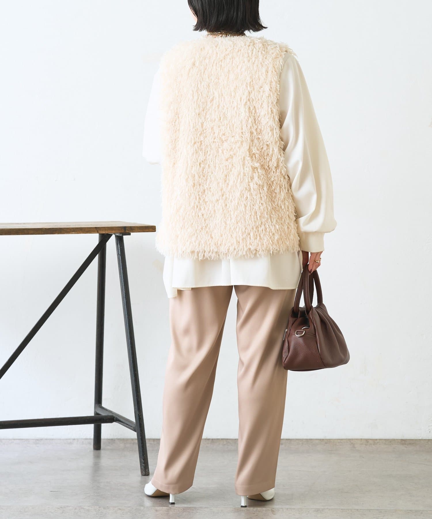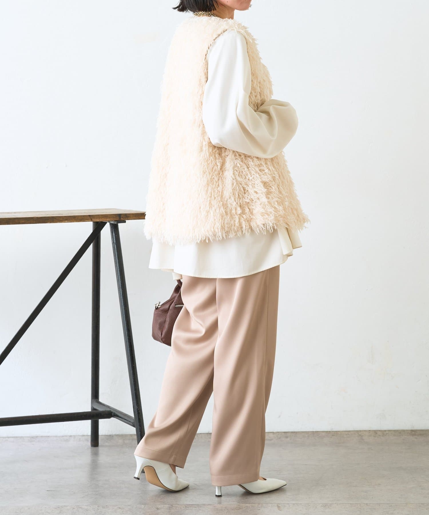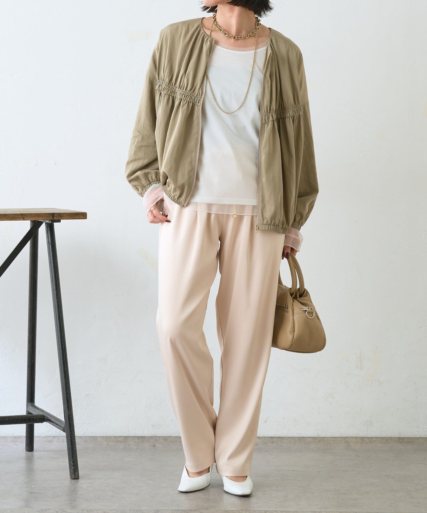 ・サテンライクな艶感が上品で、イージーパンツでもきれい見えします。
