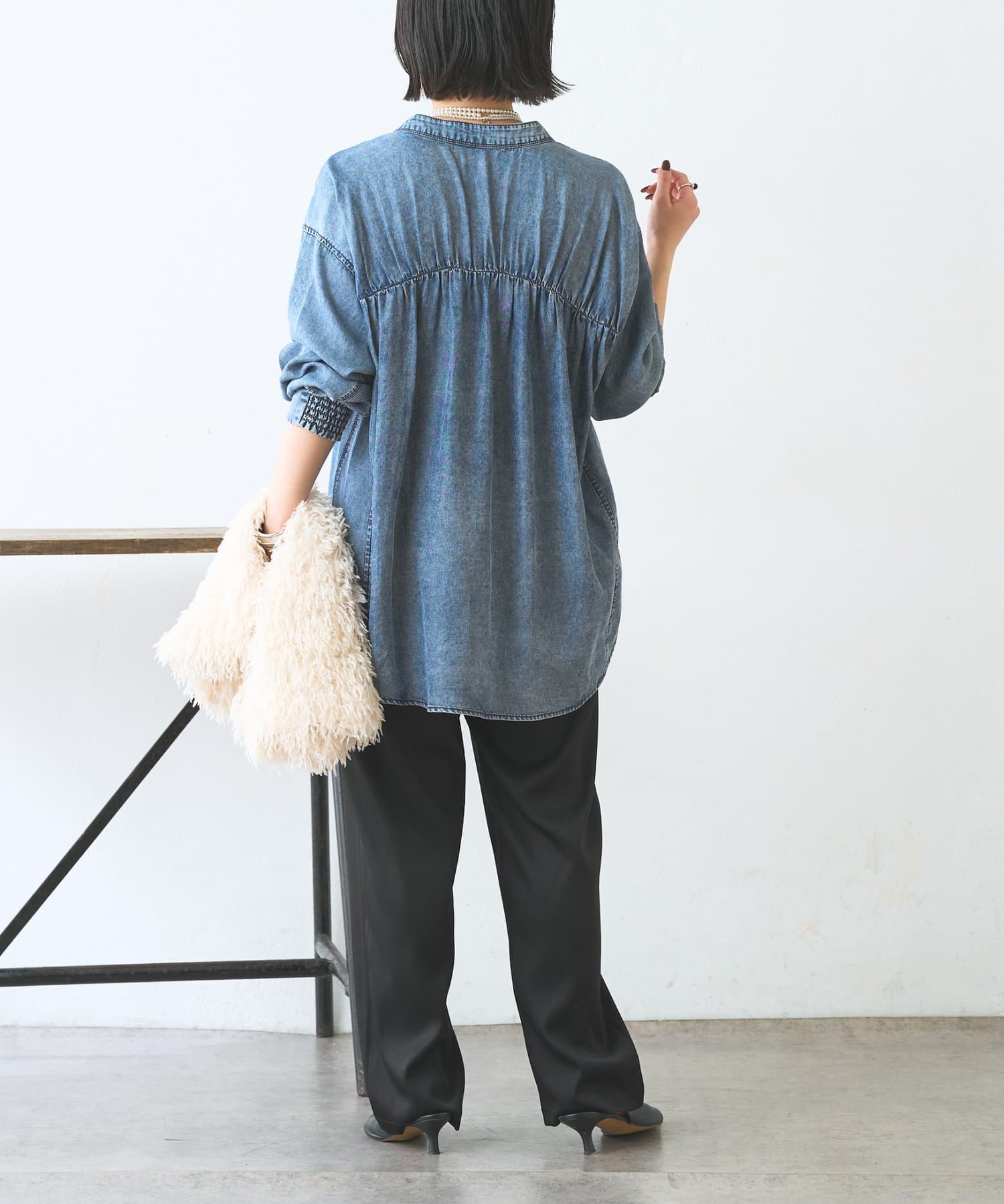 ・シンプルなトップスと合わせるだけで、ほどよく華やかなスタイリングが完成。