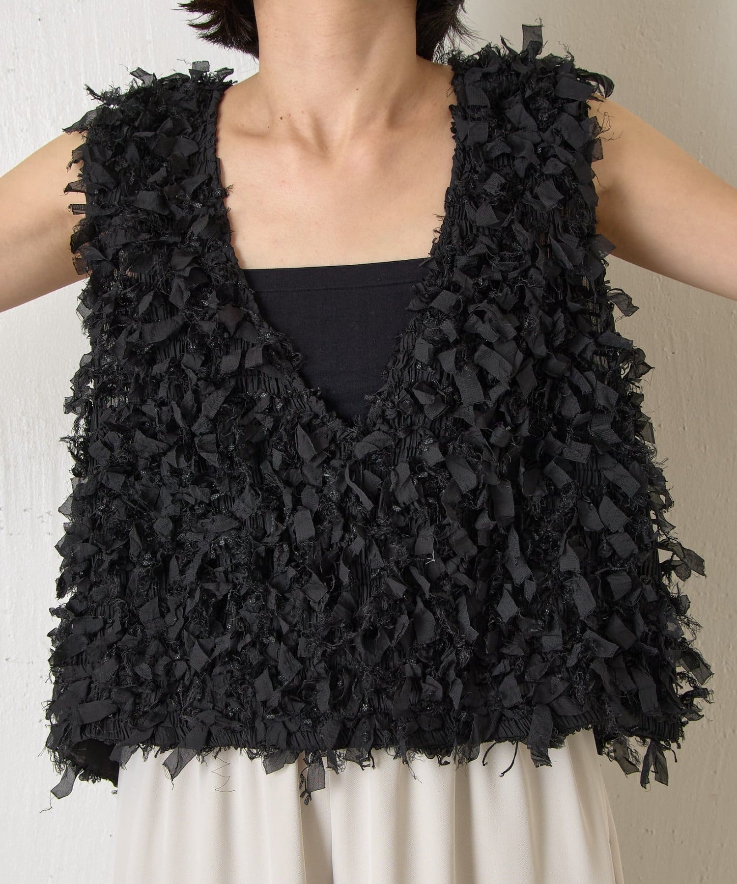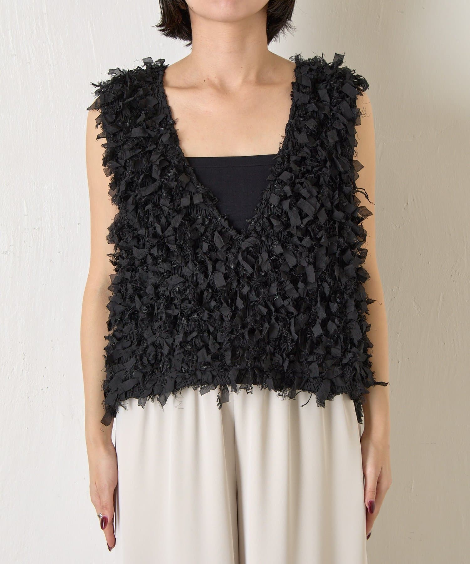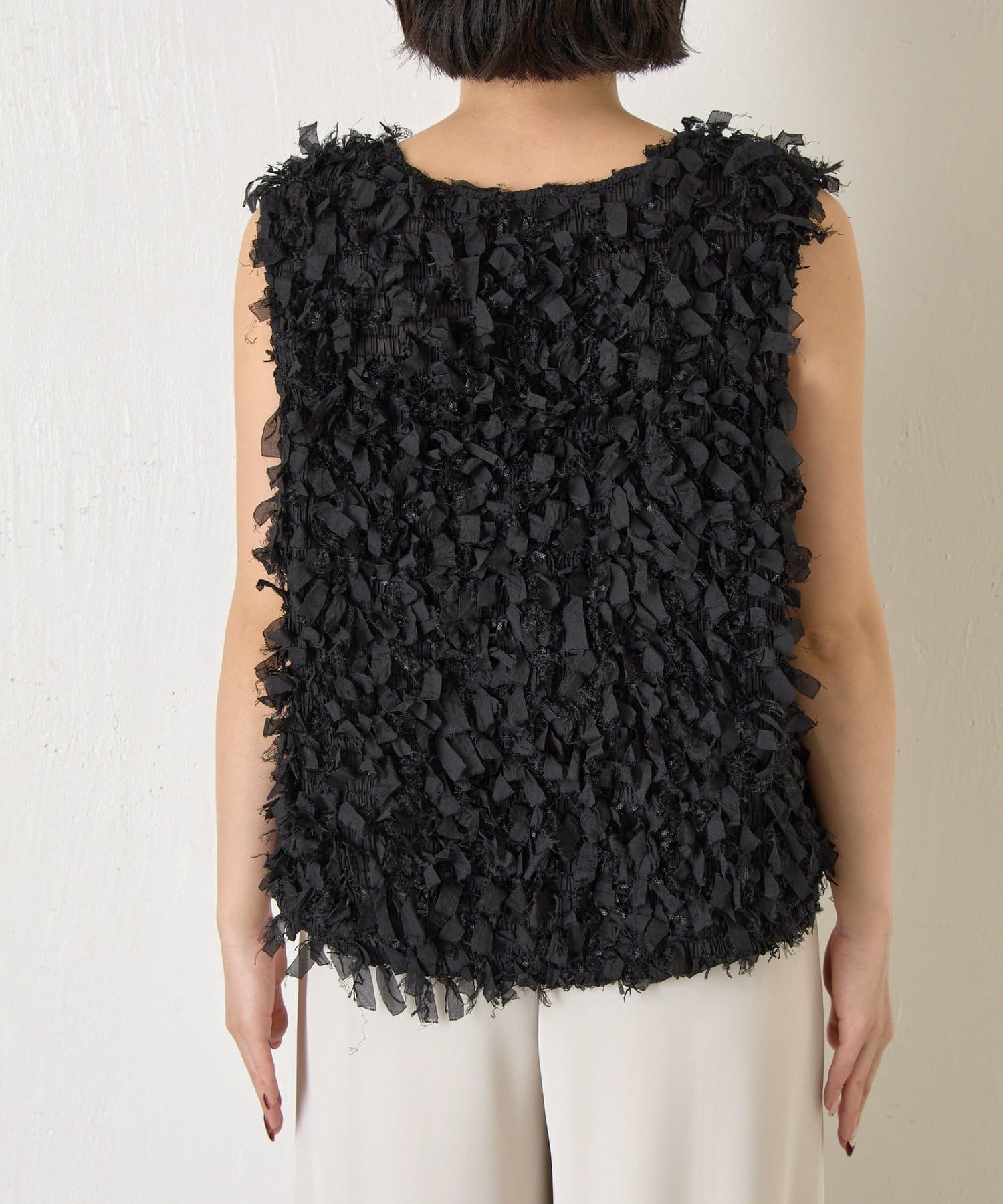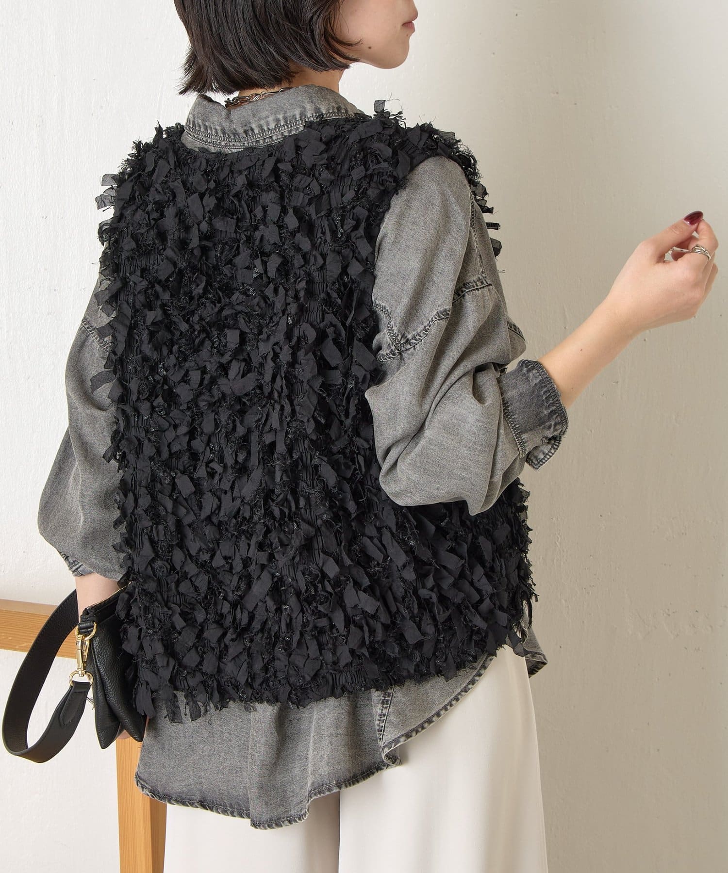 ・トレンド感のある大人のためのリボンフリンジベスト。