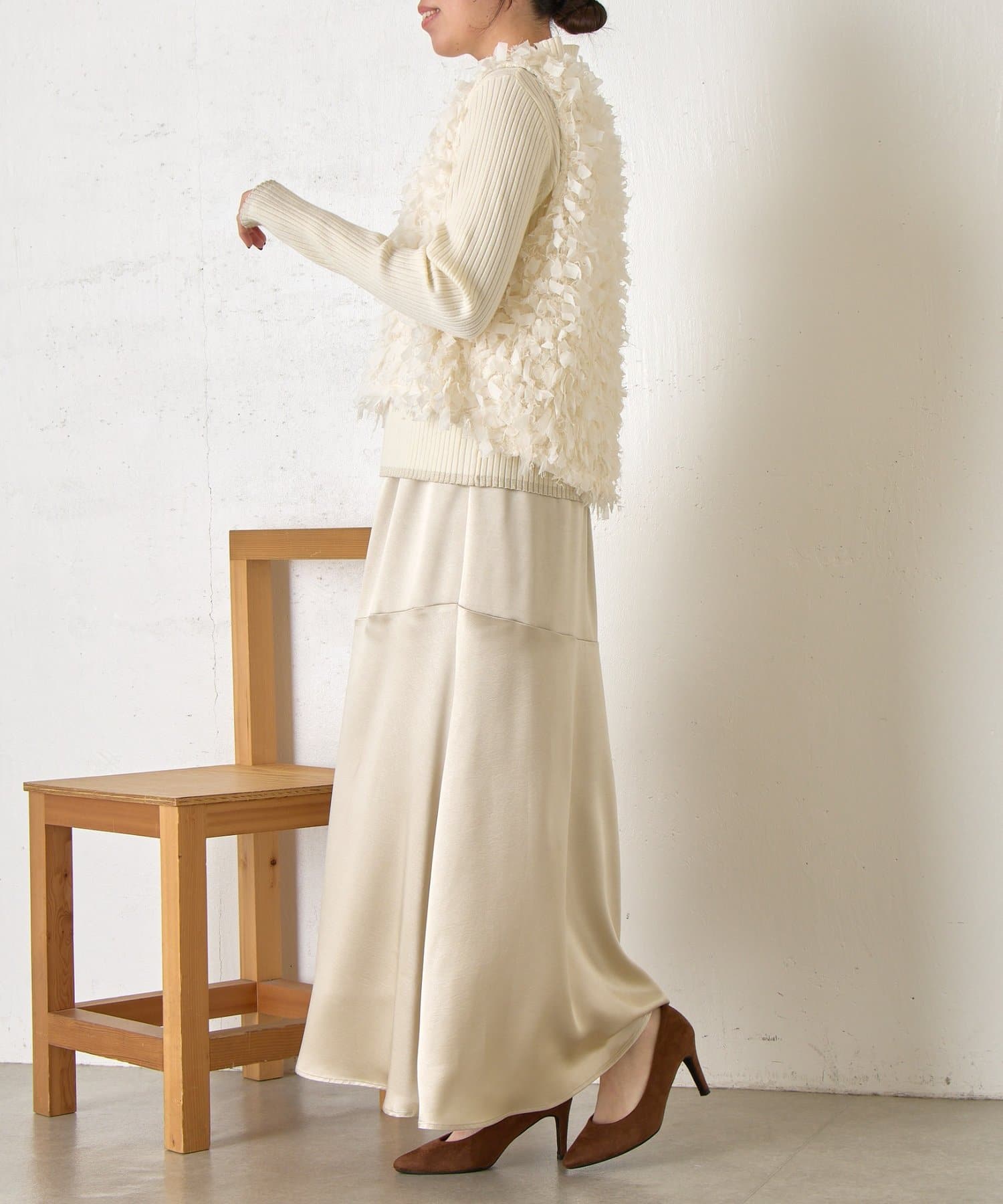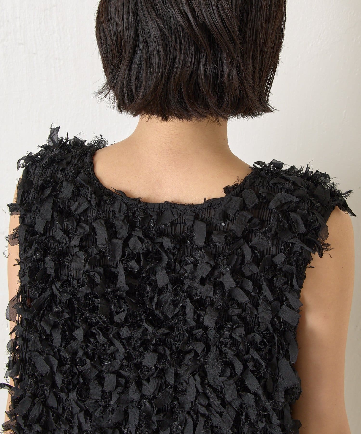 ・繊細にカットされた生地が重なり合い、ボリューム感を出しつつもエアリーで優しい印象に。