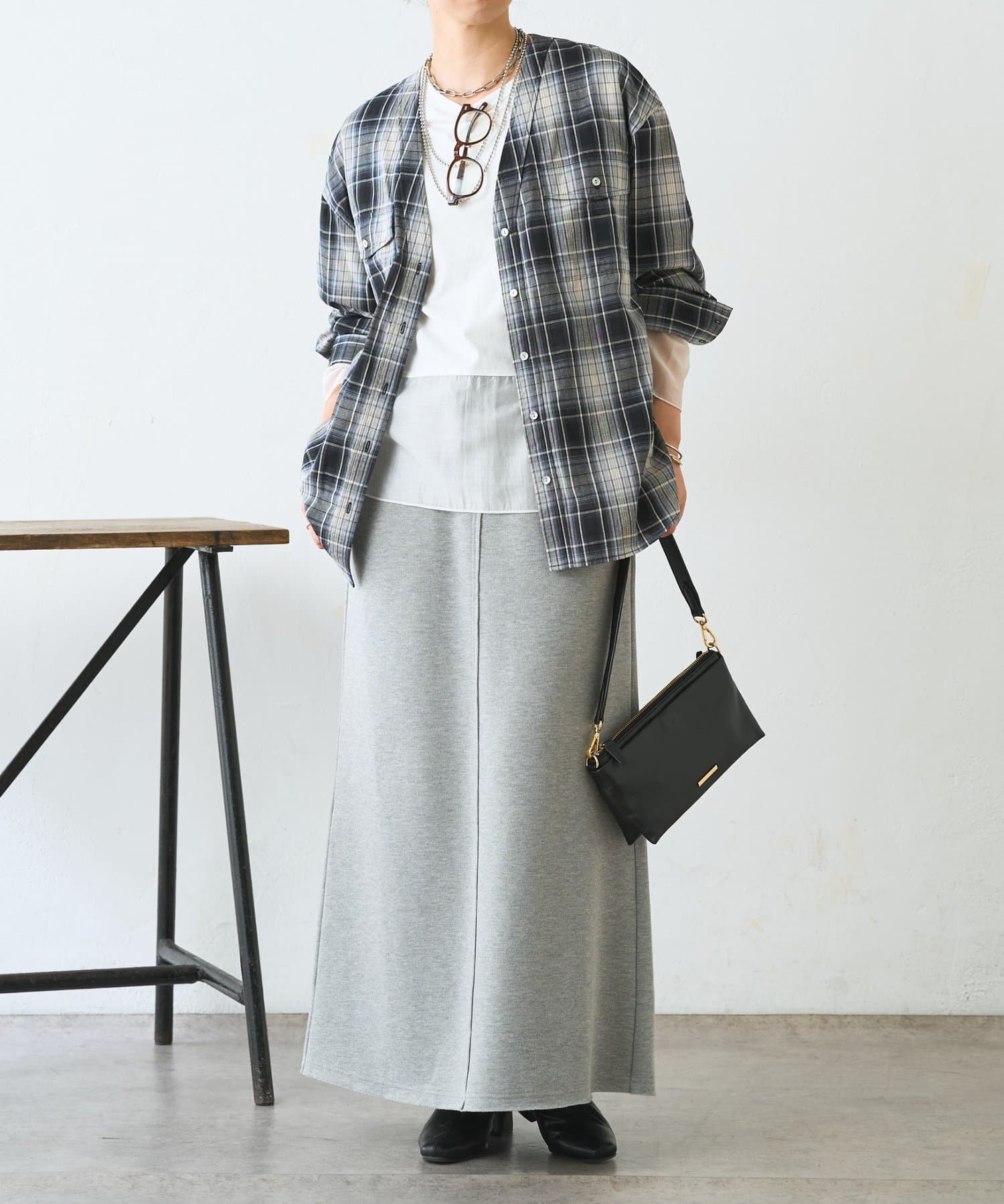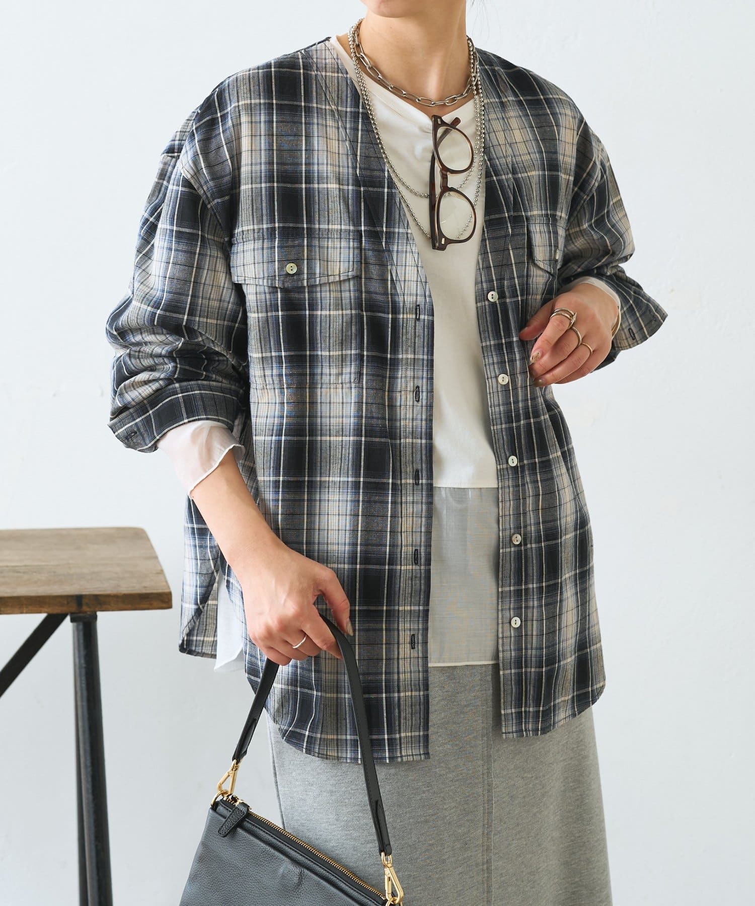 ・チェック柄でも重く見えない、抜け感のあるダブルVネックデザイン