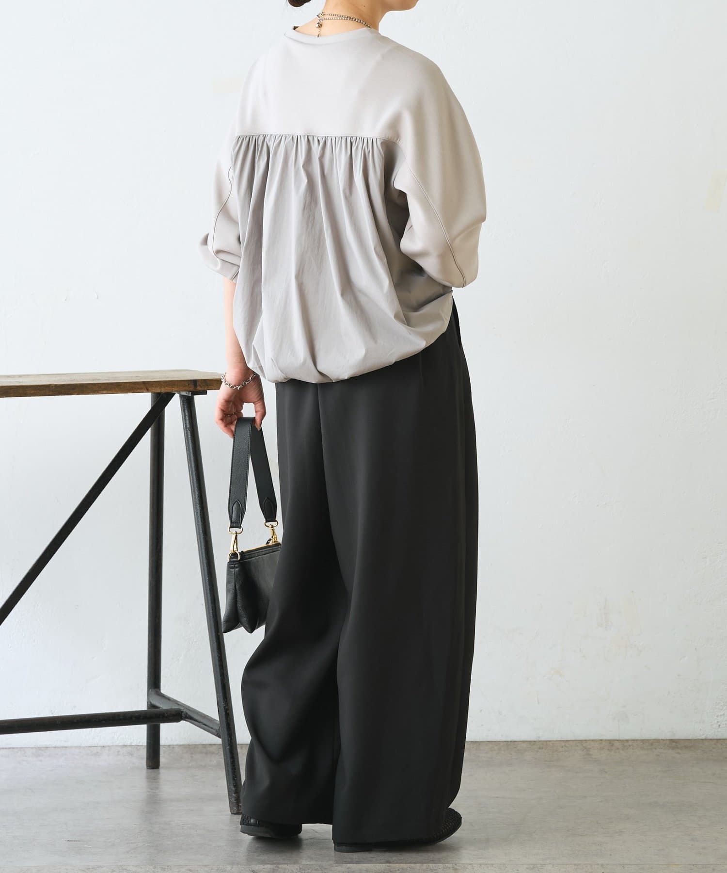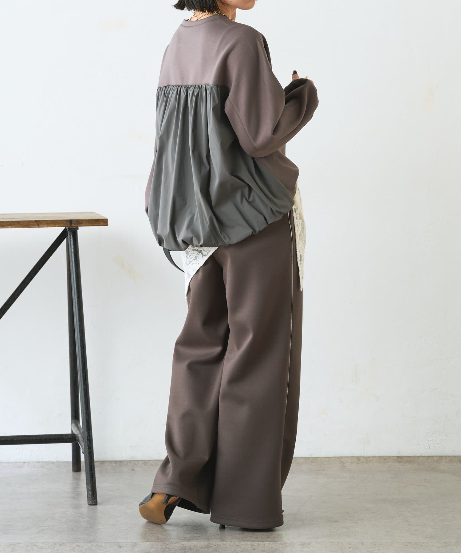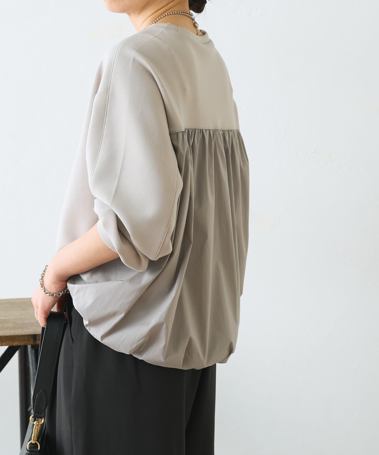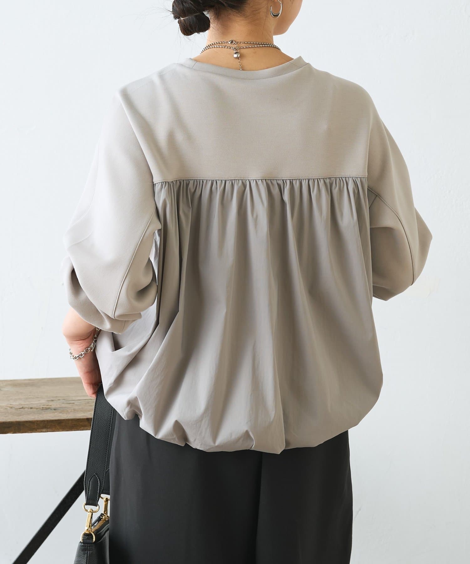 ・バックバルーンで後ろ姿に立体感が生まれ、シンプルでもサマになる1枚。