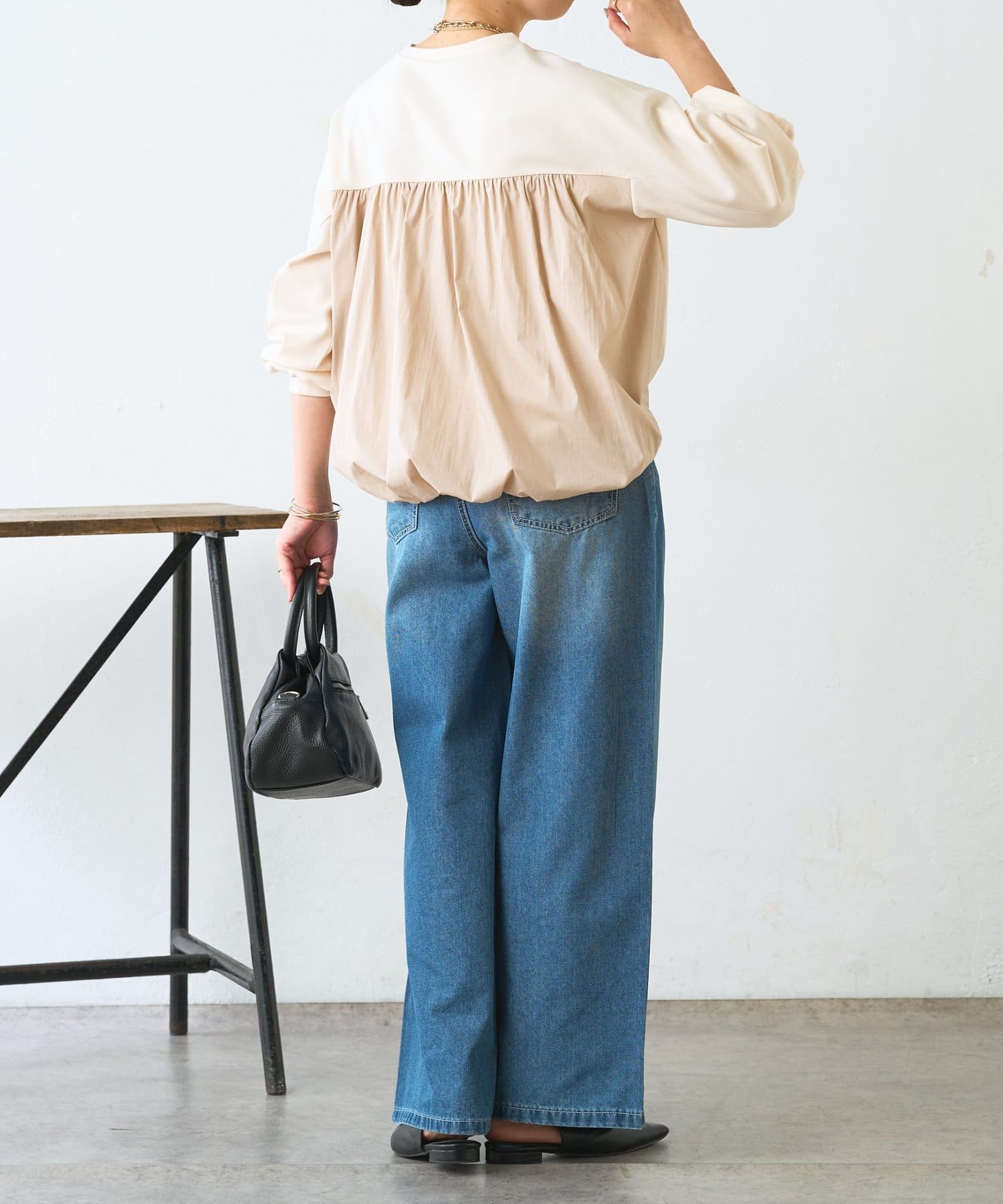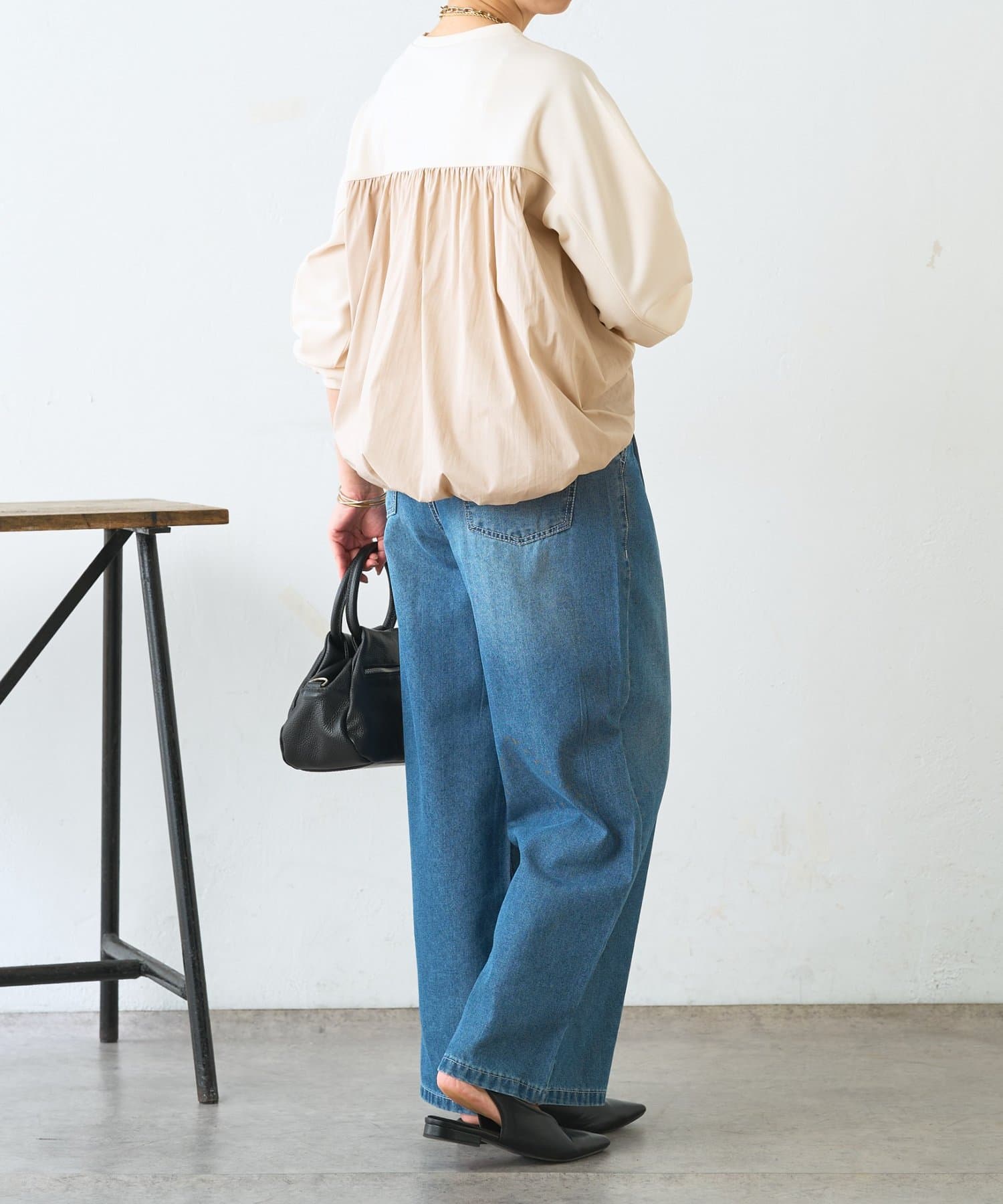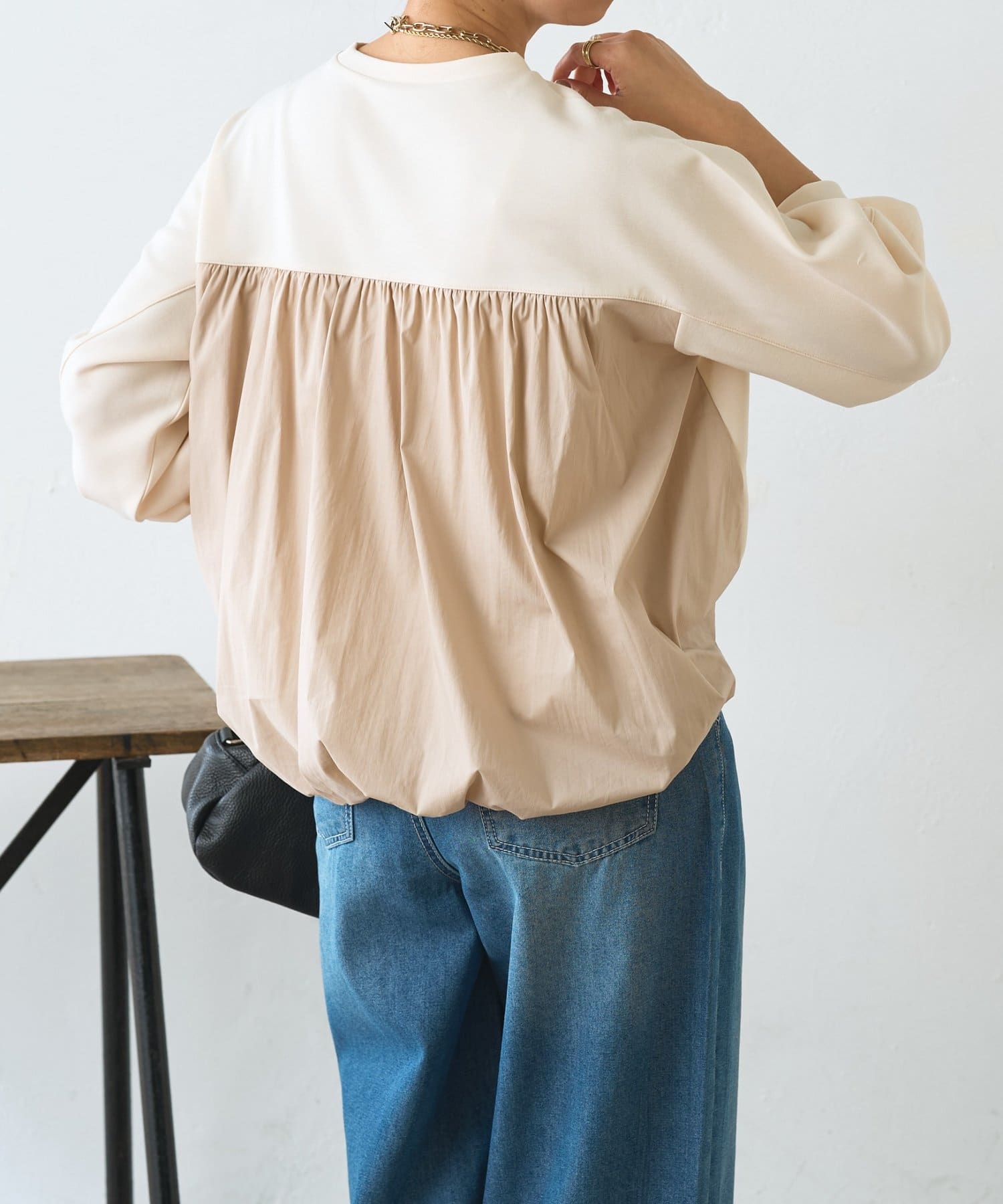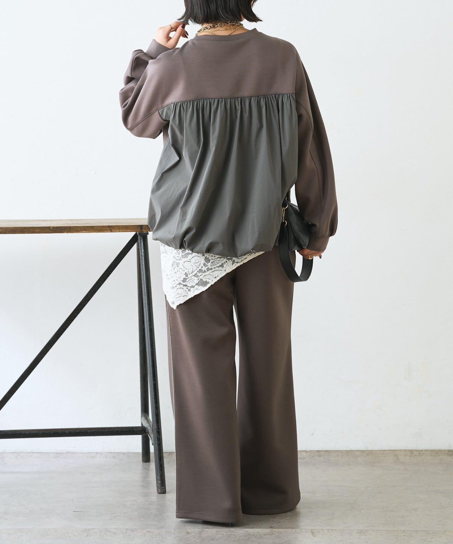 ・バックバルーンで後ろ姿に立体感が生まれ、シンプルでもサマになる1枚。