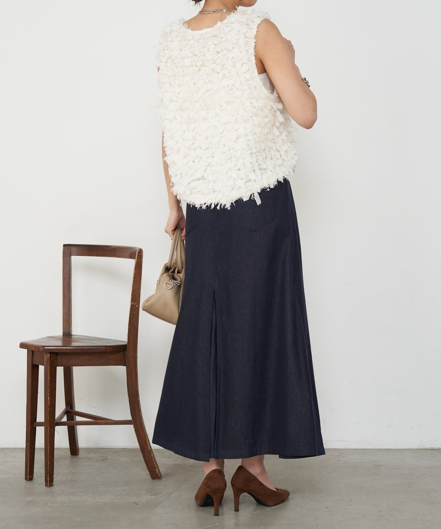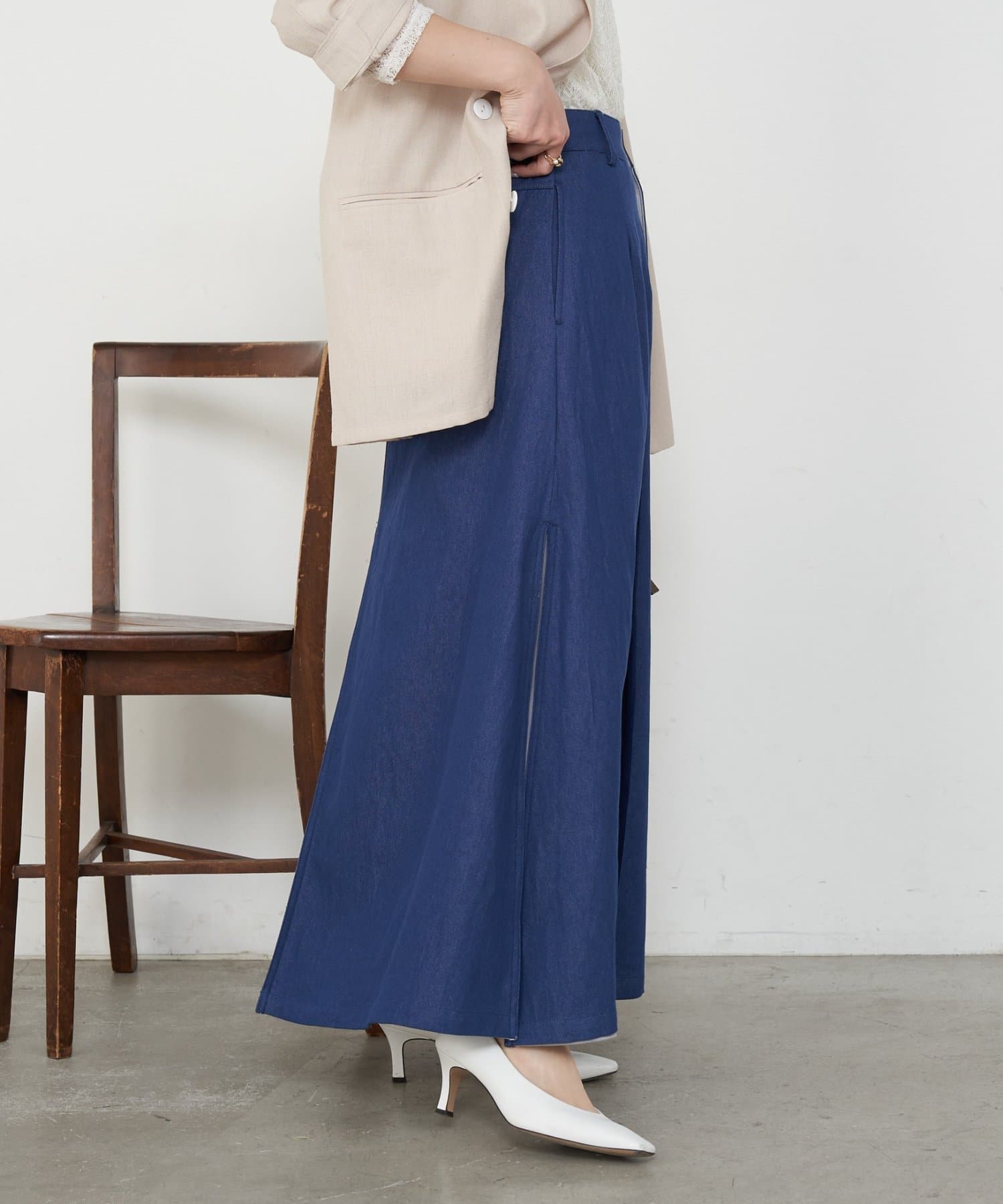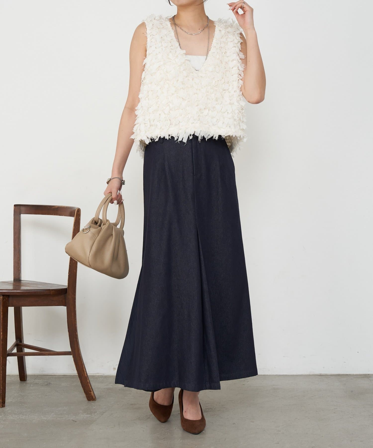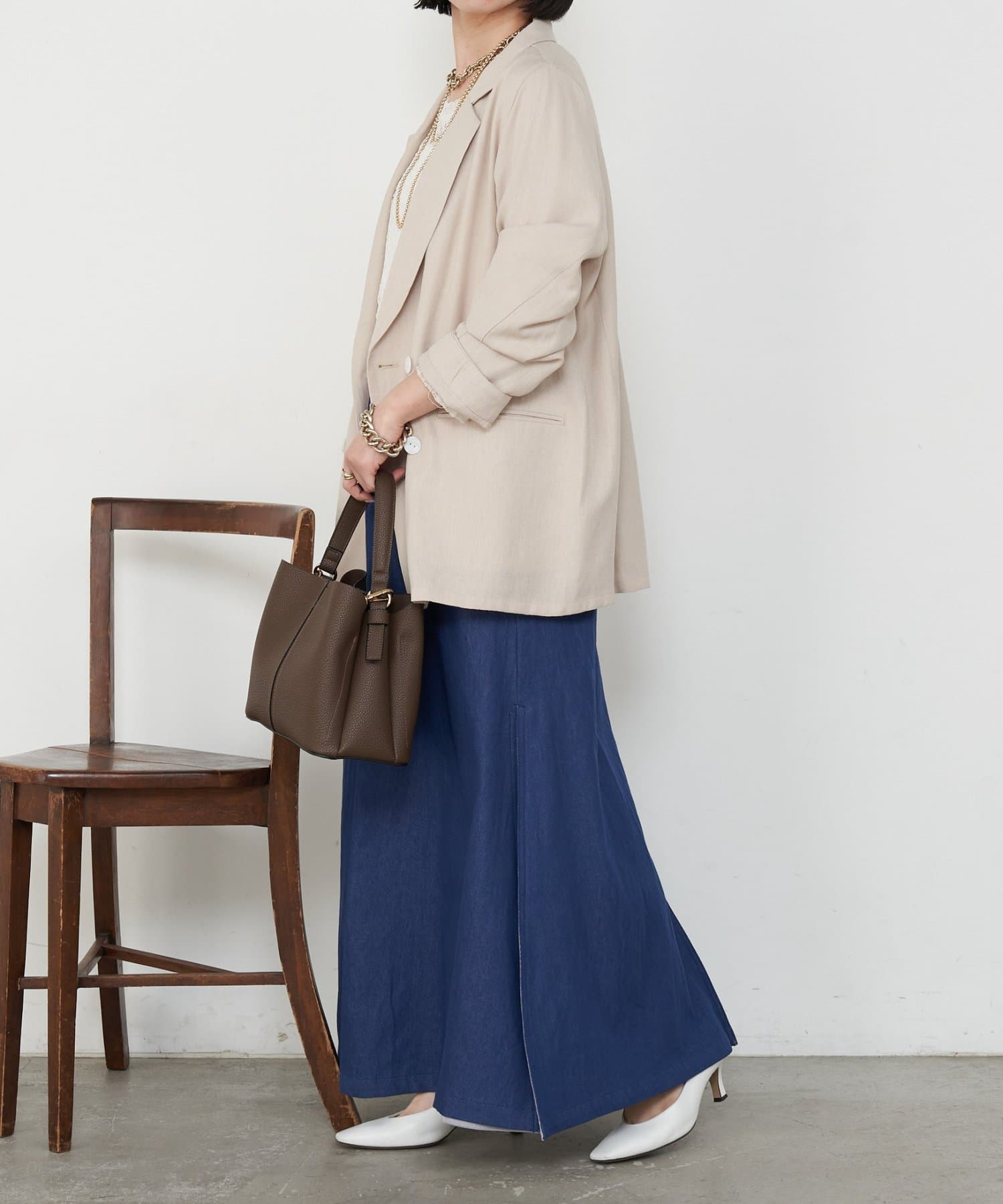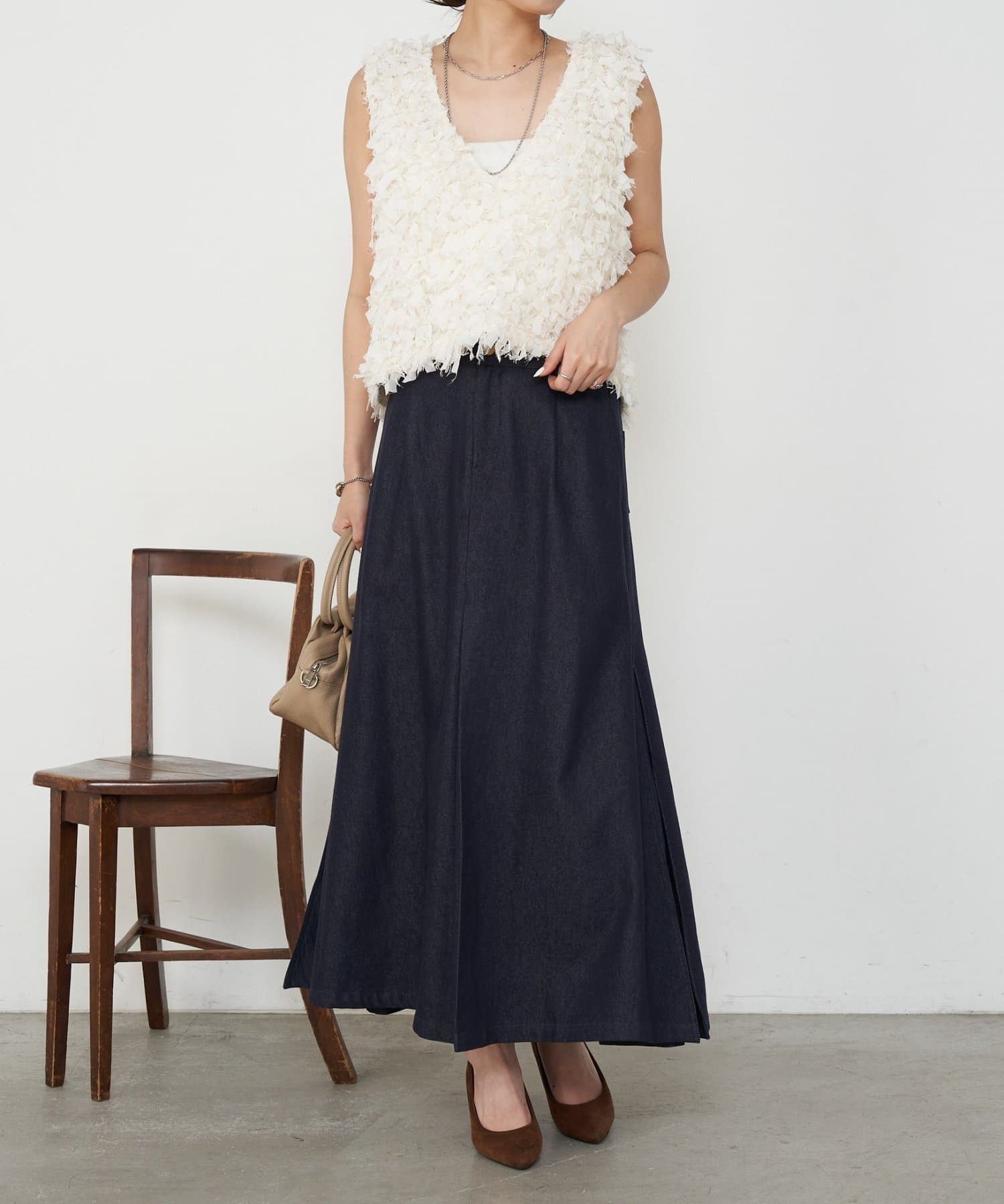 ・カジュアルなイメージの強いデニム素材を、上品なフレアシルエットで女性らしく昇華させたロングスカート。