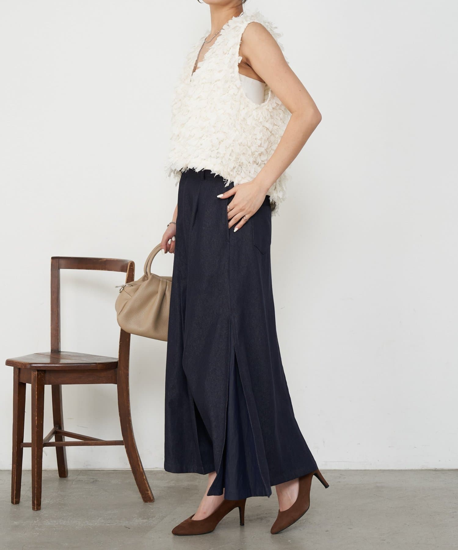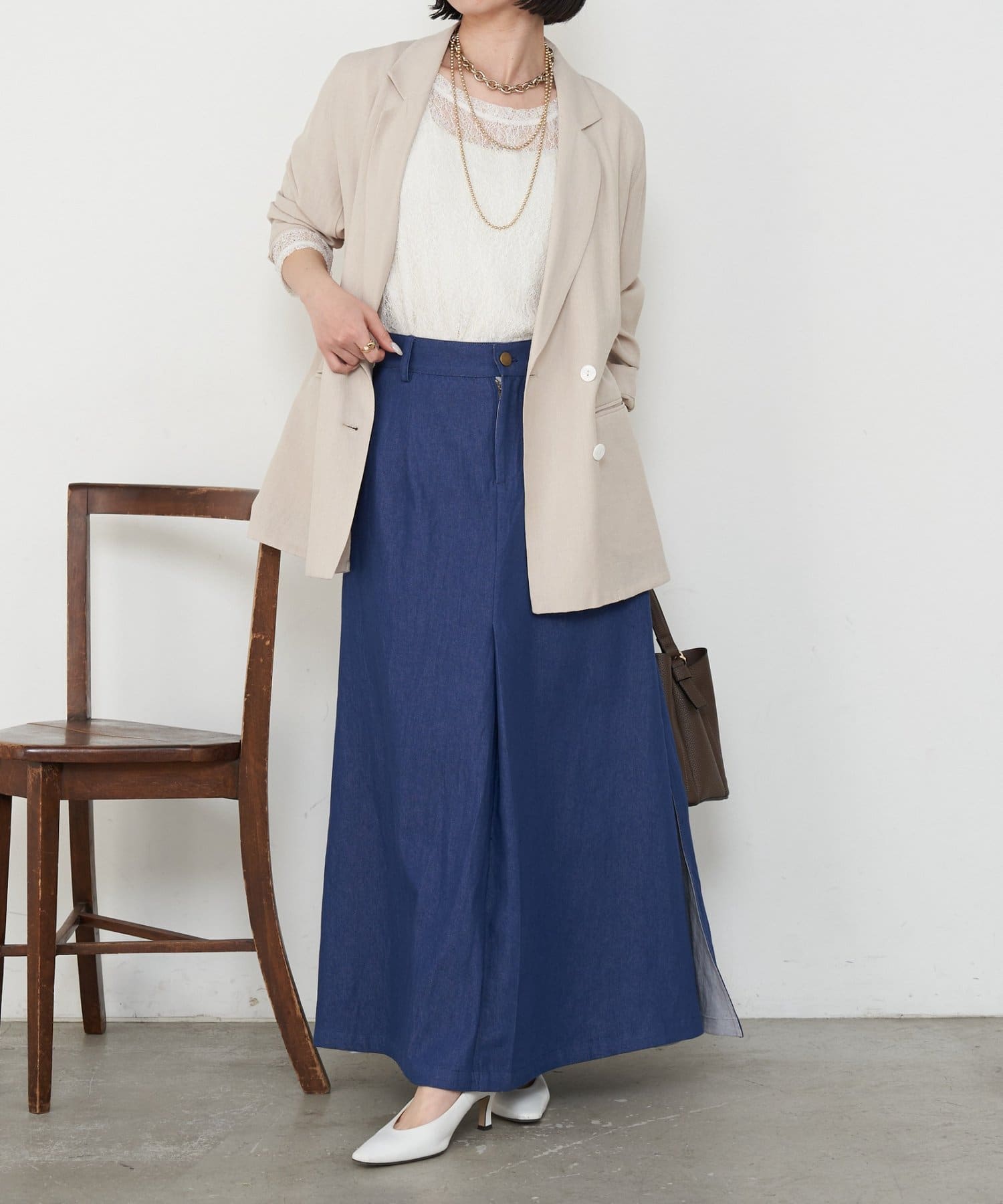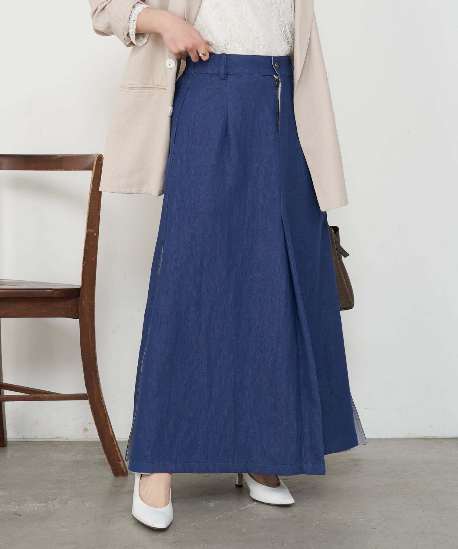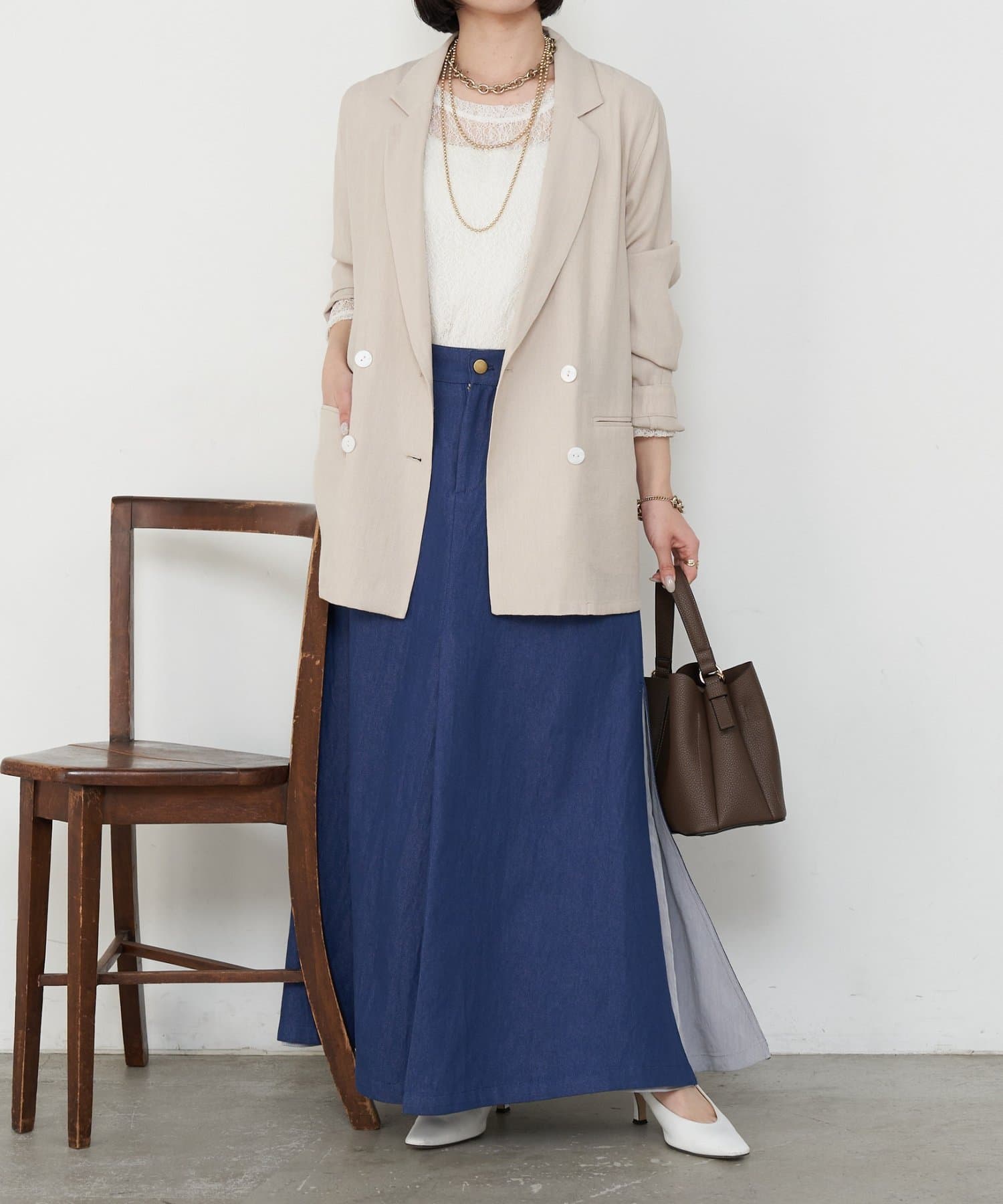 ・カジュアルなイメージの強いデニム素材を、上品なフレアシルエットで女性らしく昇華させたロングスカート。