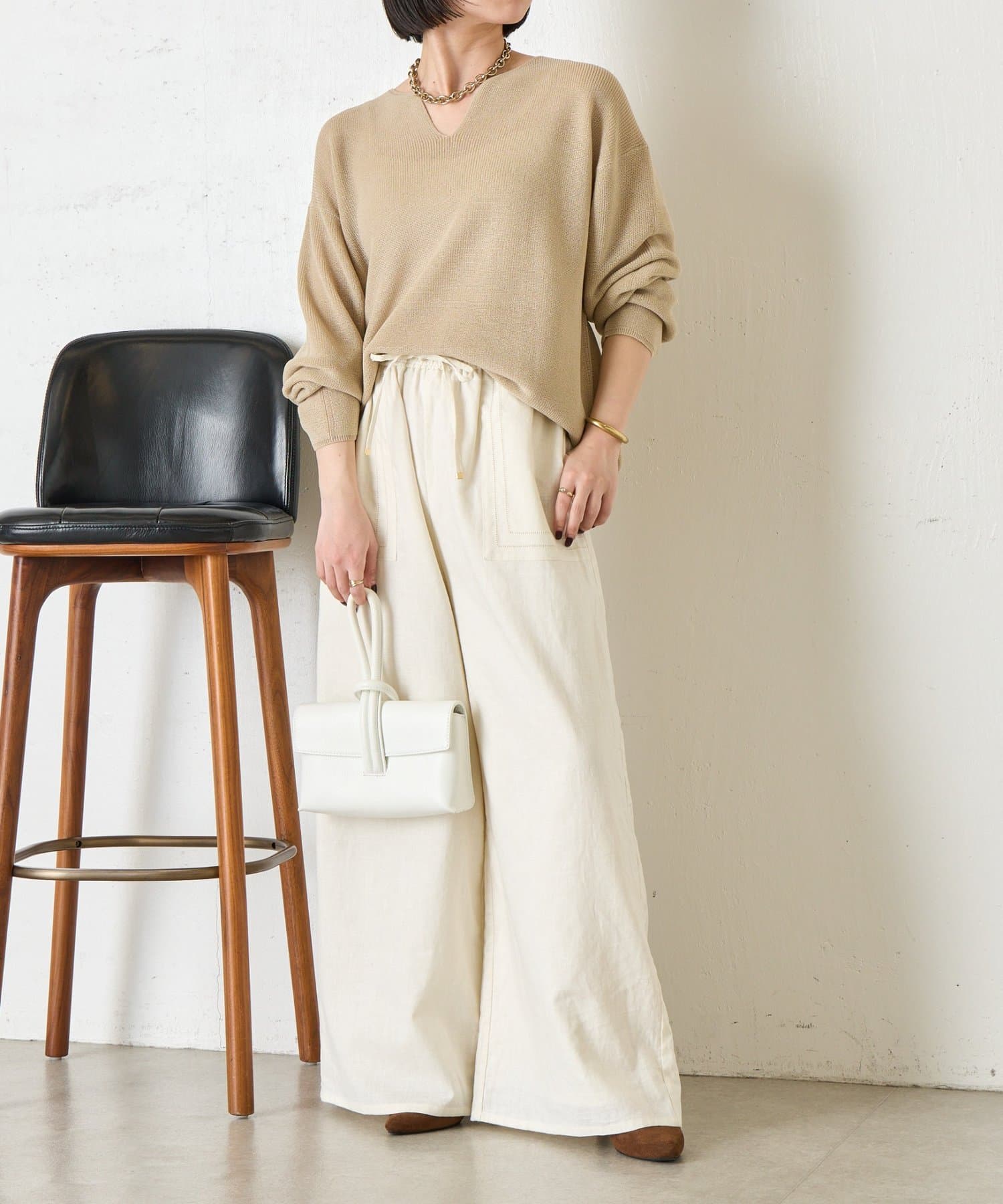 ・デコルテをすっきりきれいに見せるVネックで、抜け感をプラス