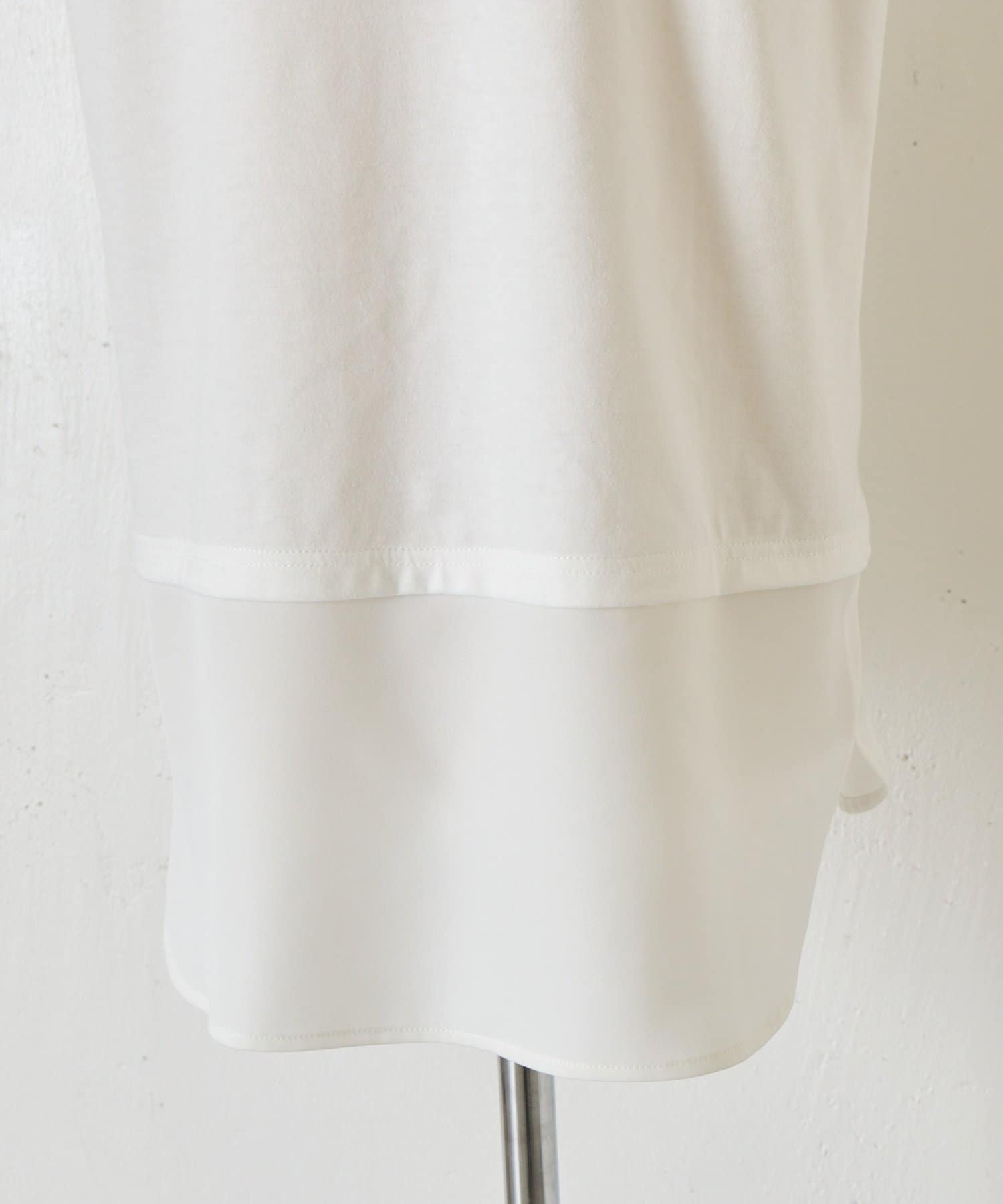・裾にツイル素材を切り替えたデザインで、レイヤード風の着こなしが1枚で完成