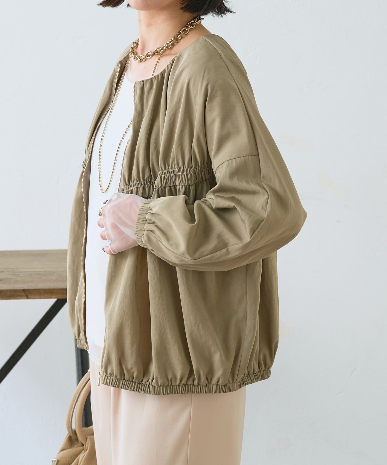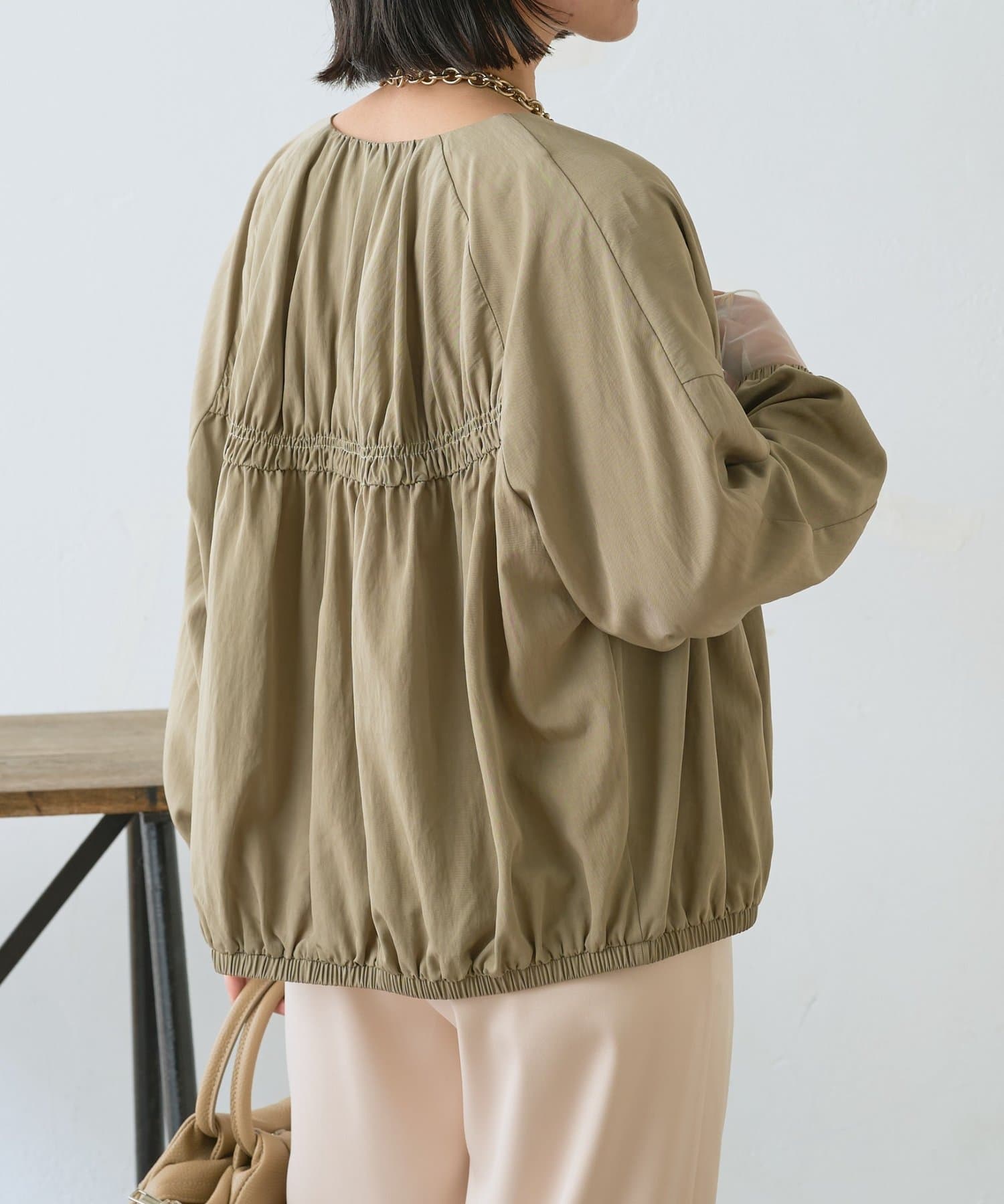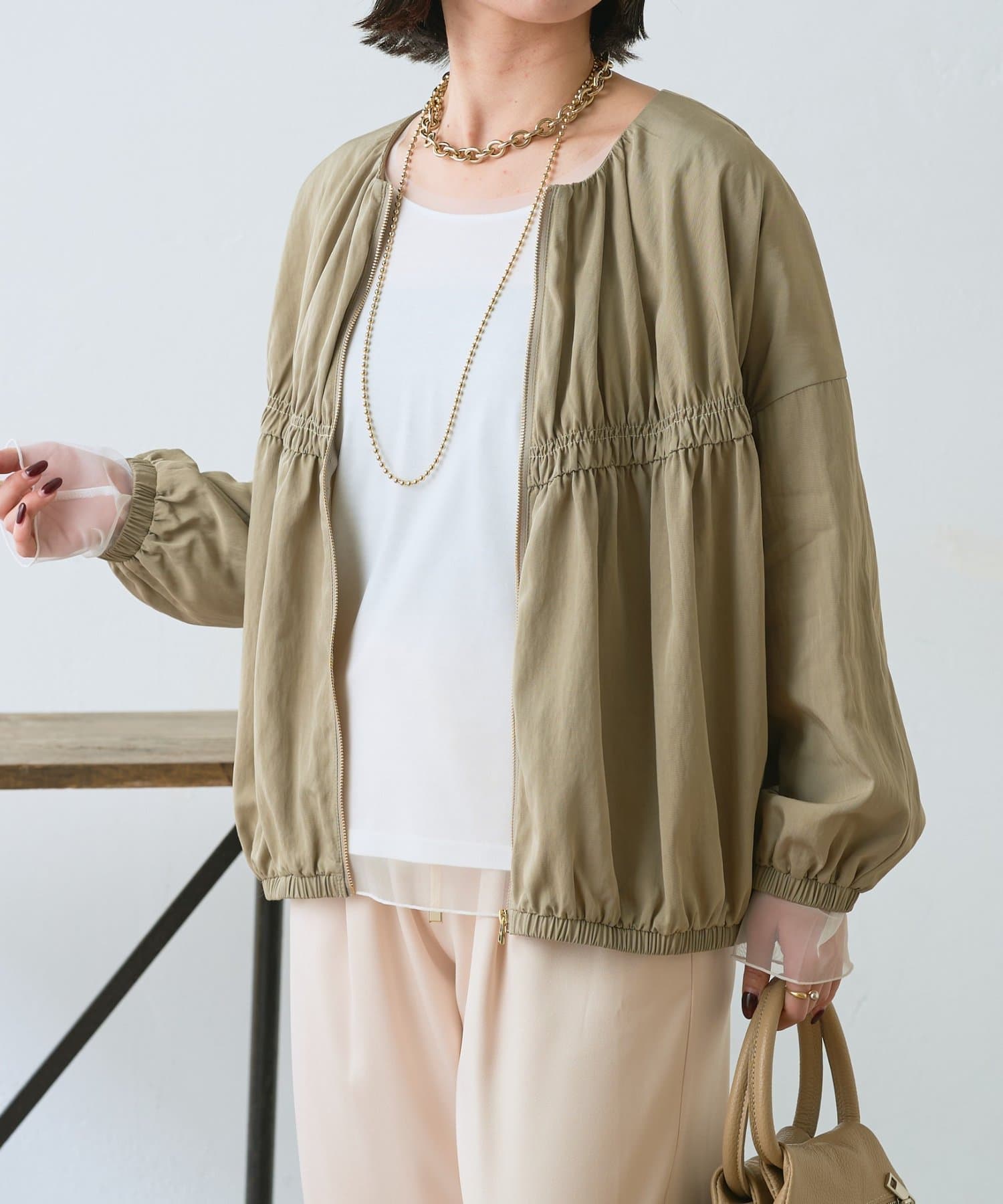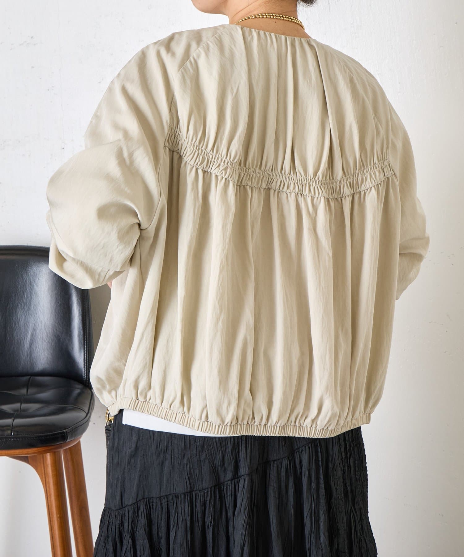 【さっと羽織れる】レーヨンナイロンギャザー切替ブルゾン