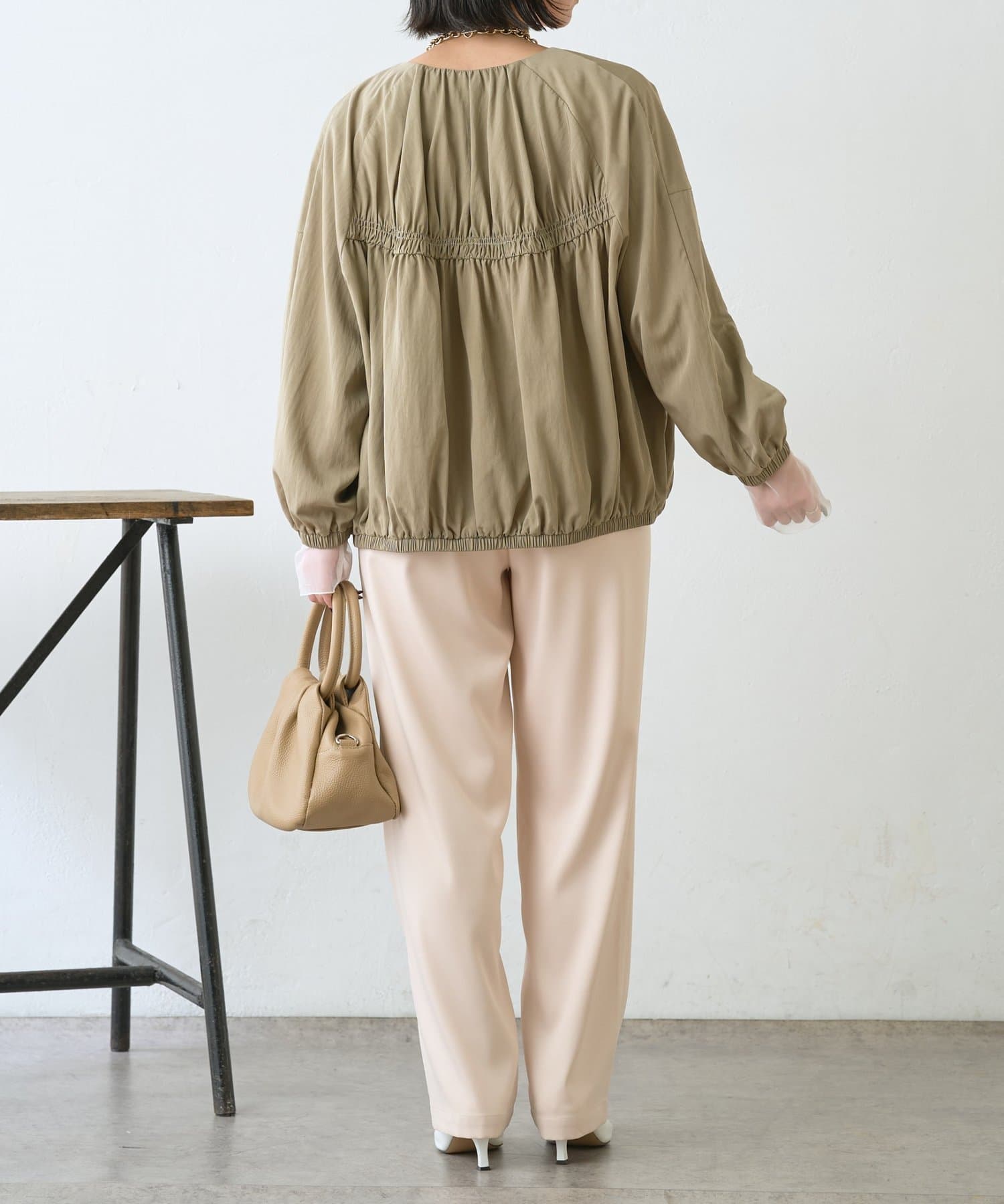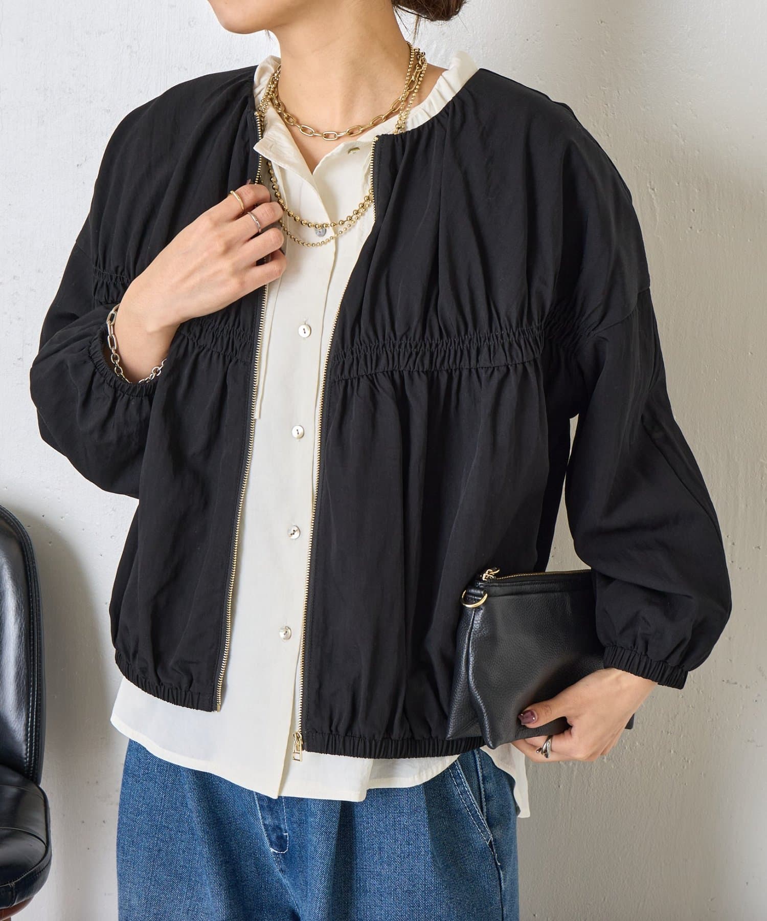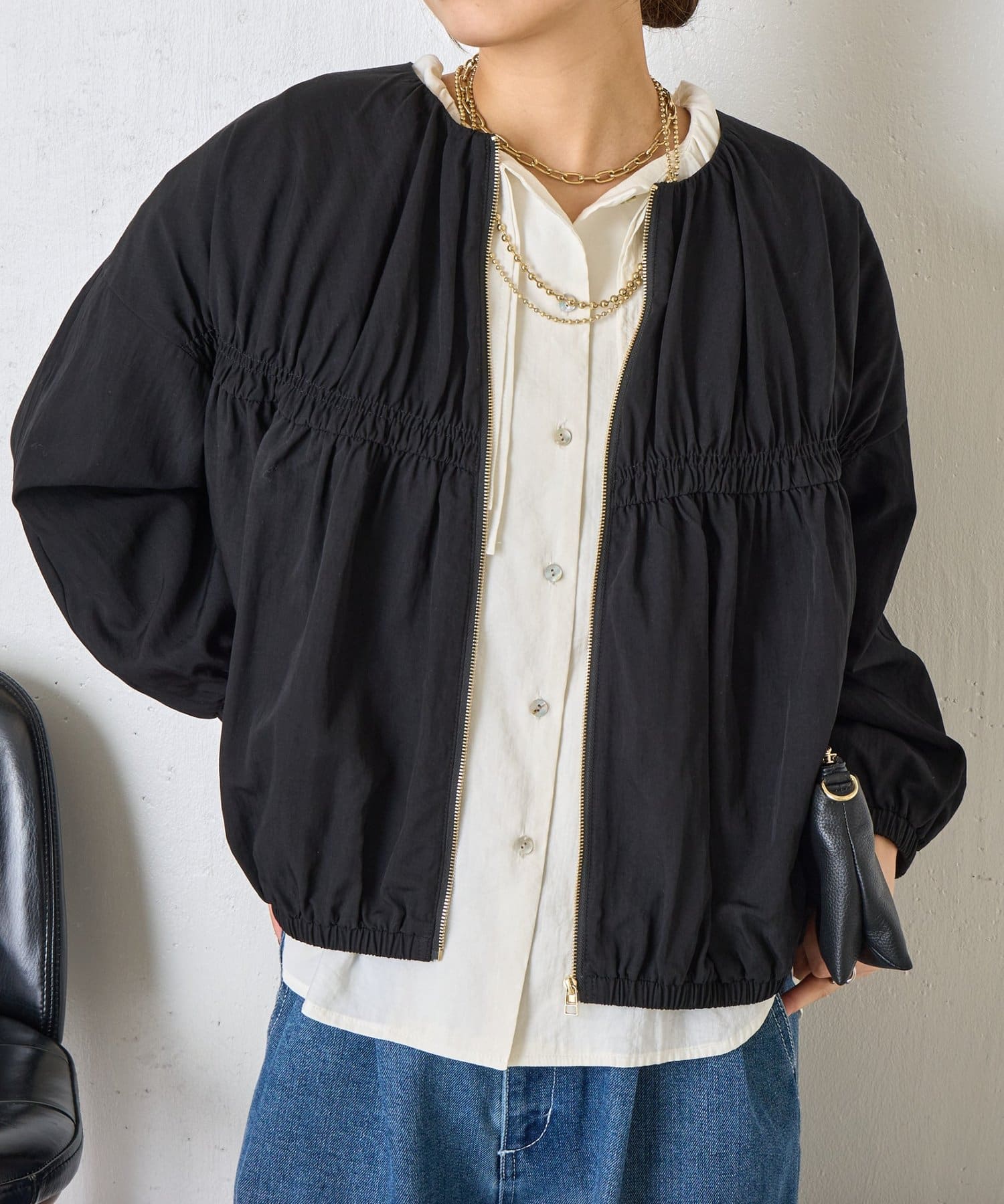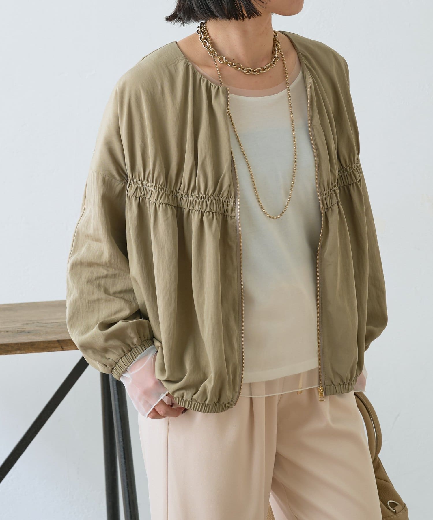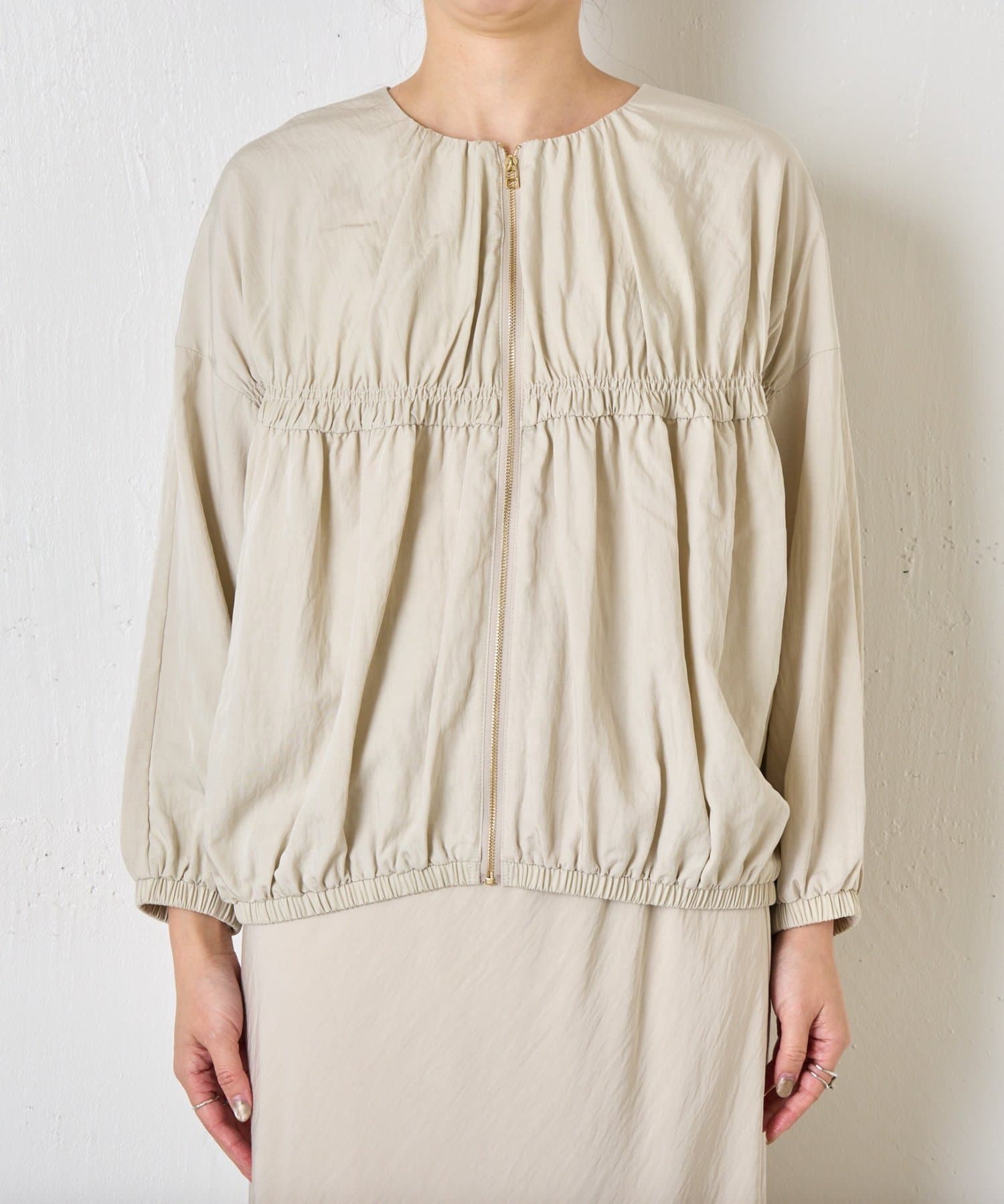 【さっと羽織れる】レーヨンナイロンギャザー切替ブルゾン