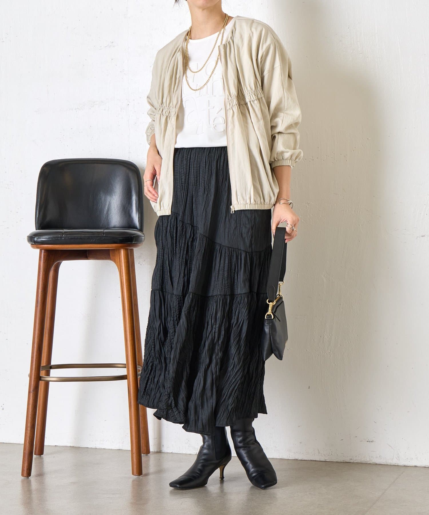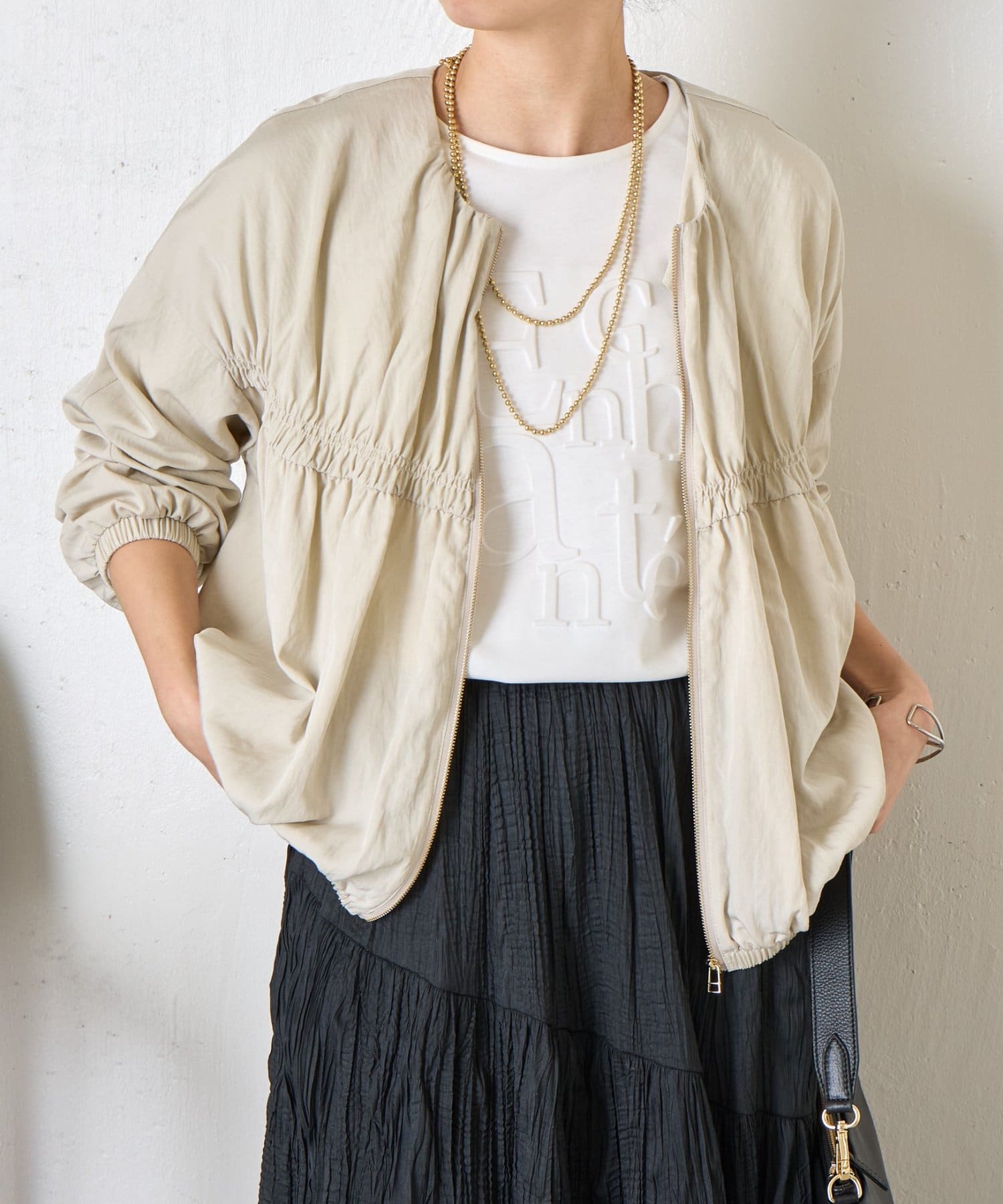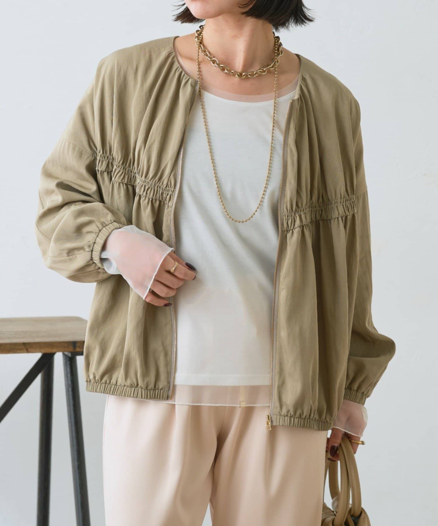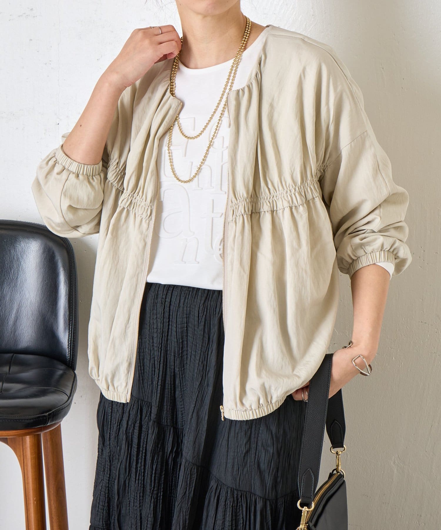 ・カジュアルになりすぎず、さっと羽織るだけでこなれ感のあるスタイリングが完成