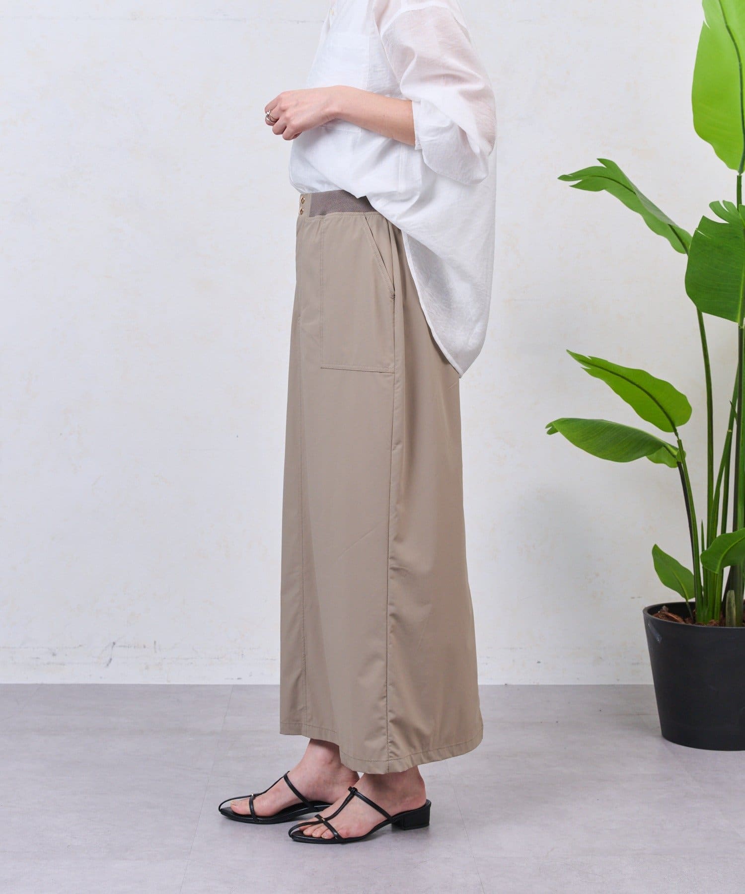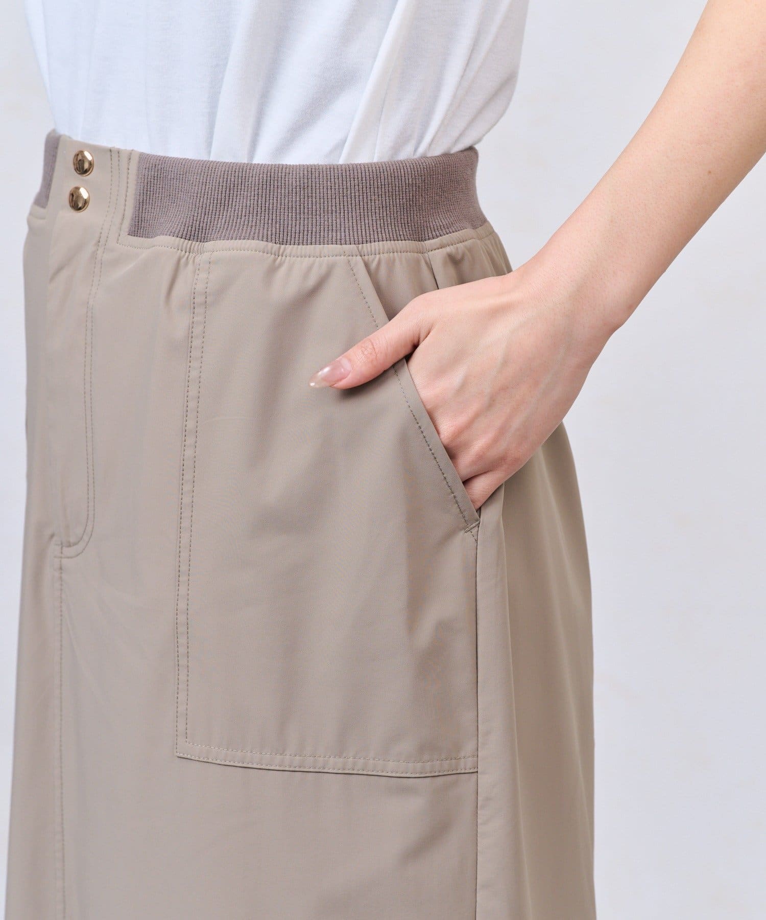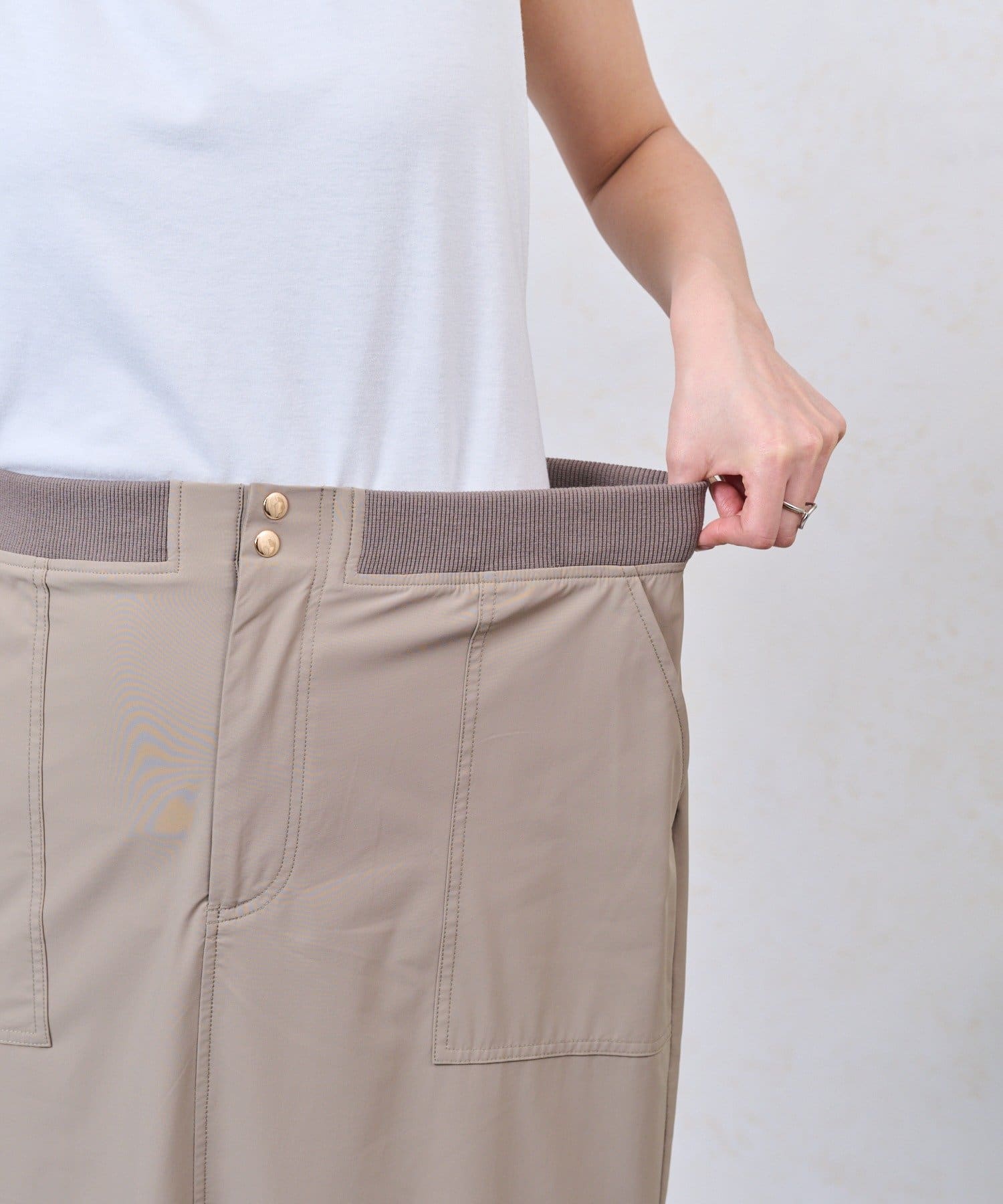 ・ウエスト部分にはリブ素材を使用し、快適なフィット感とデザイン性を両立。
