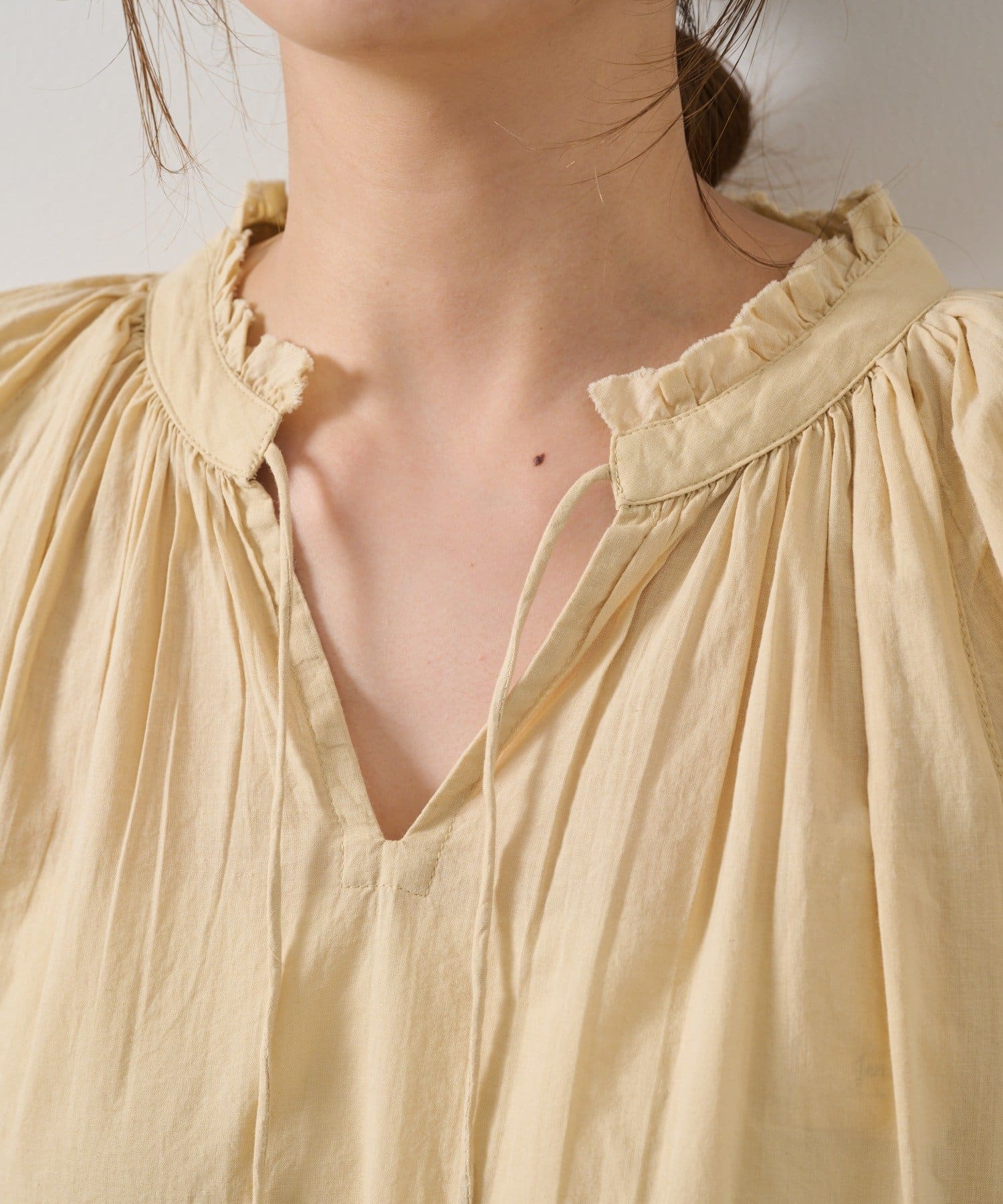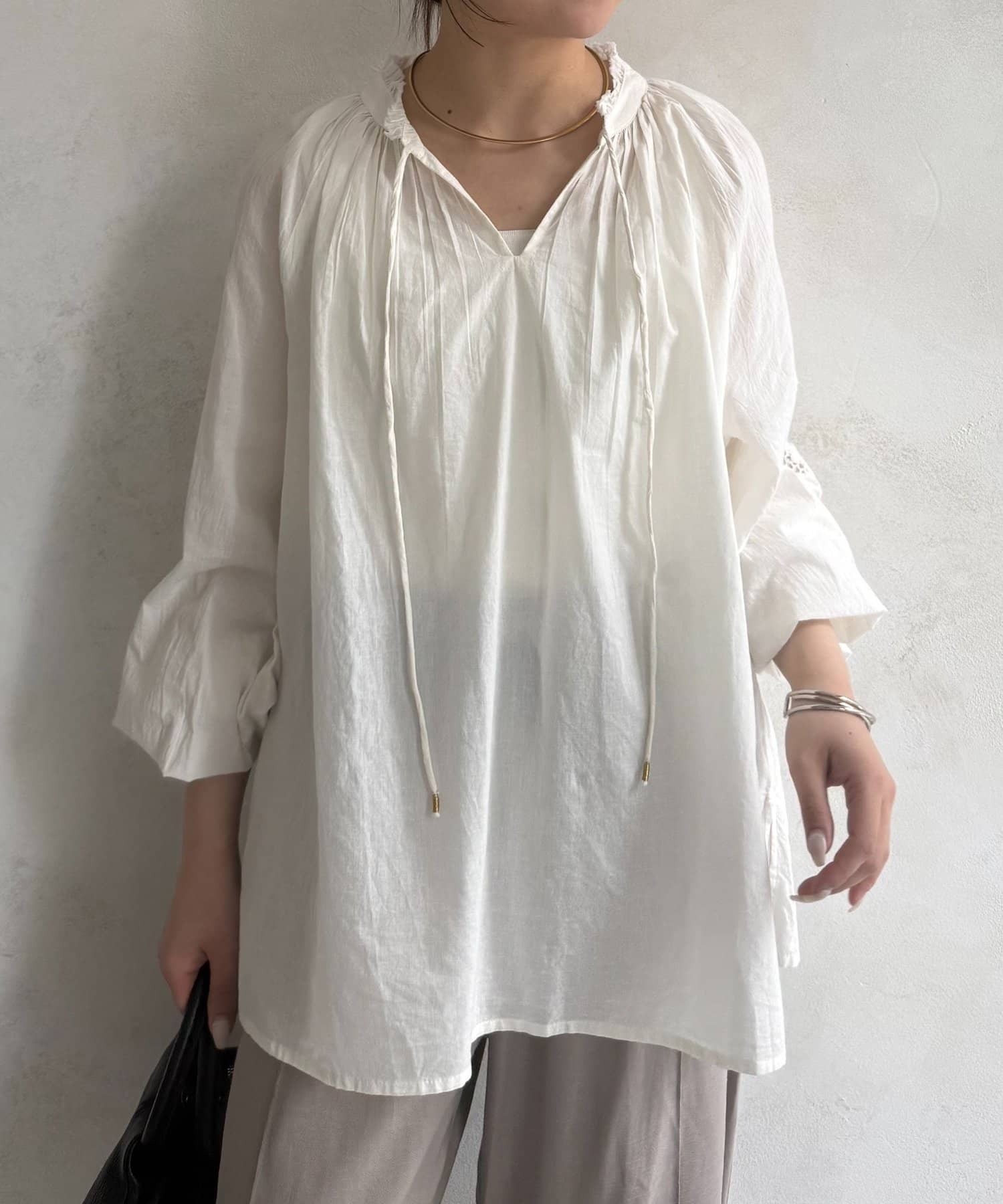 ・首元の華奢なリボンが、エレガントなアクセントになっています。