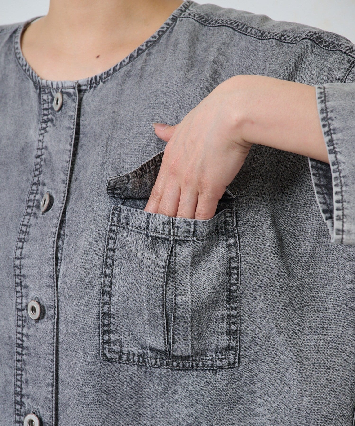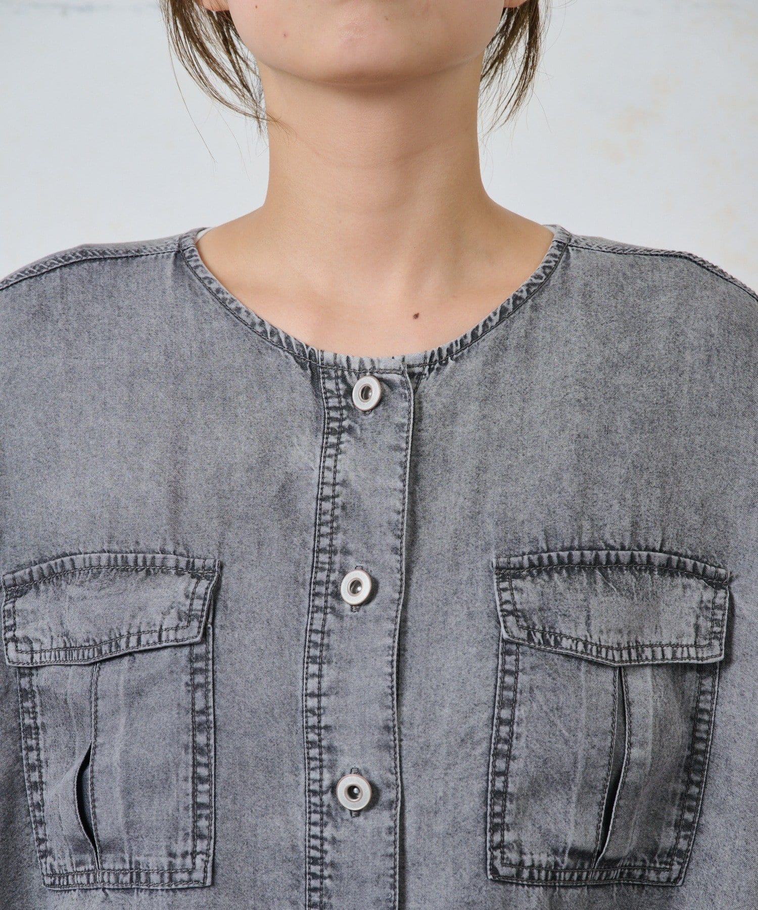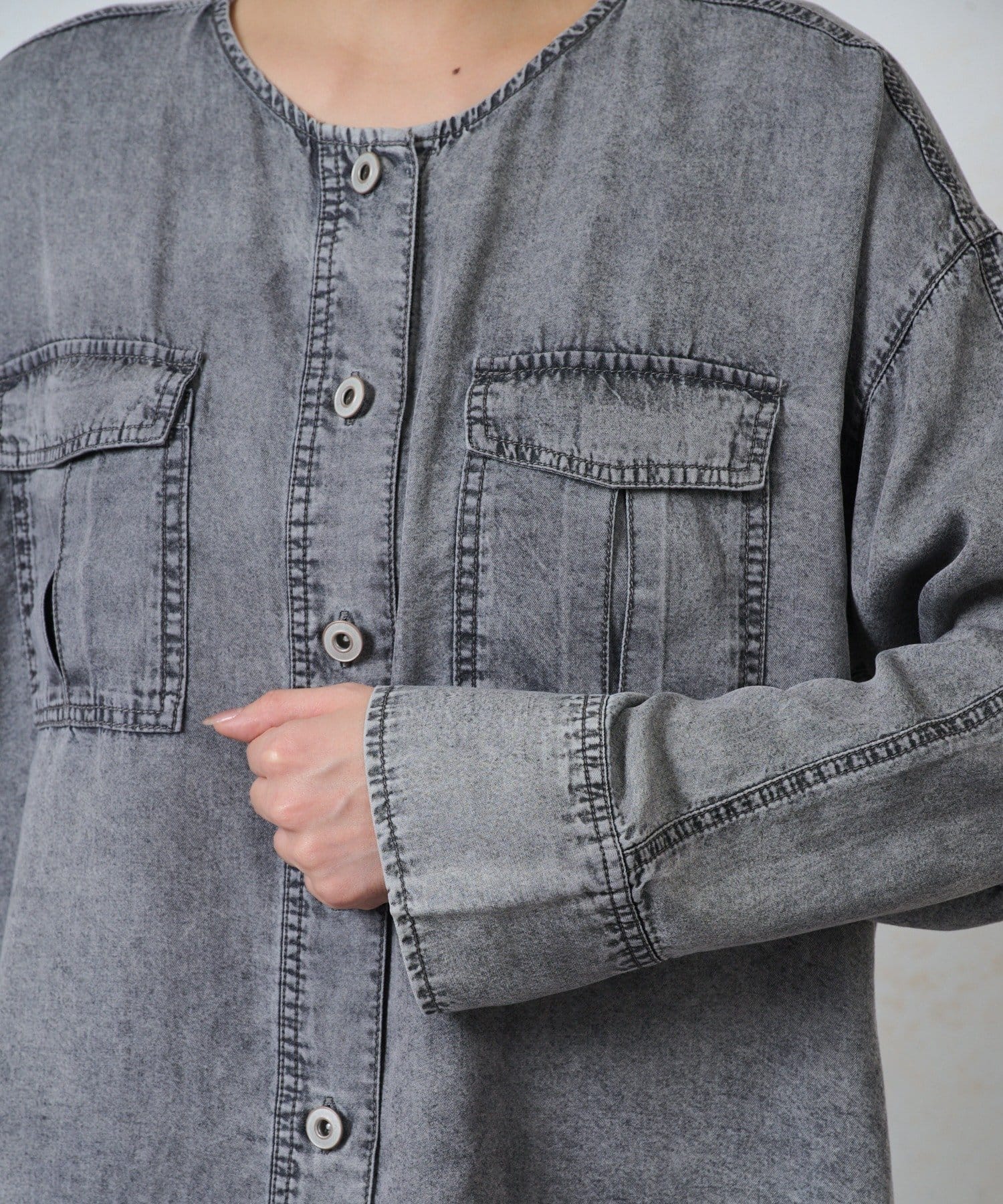 ・カジュアルになりすぎないよう、襟元はすっきりとしたバンドカラーを採用。