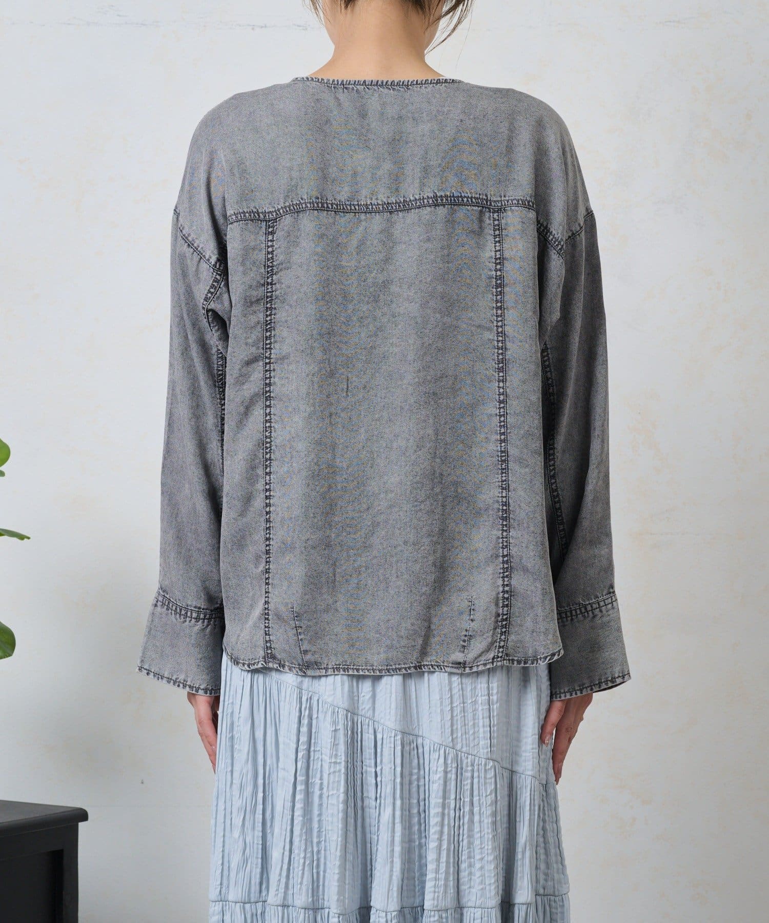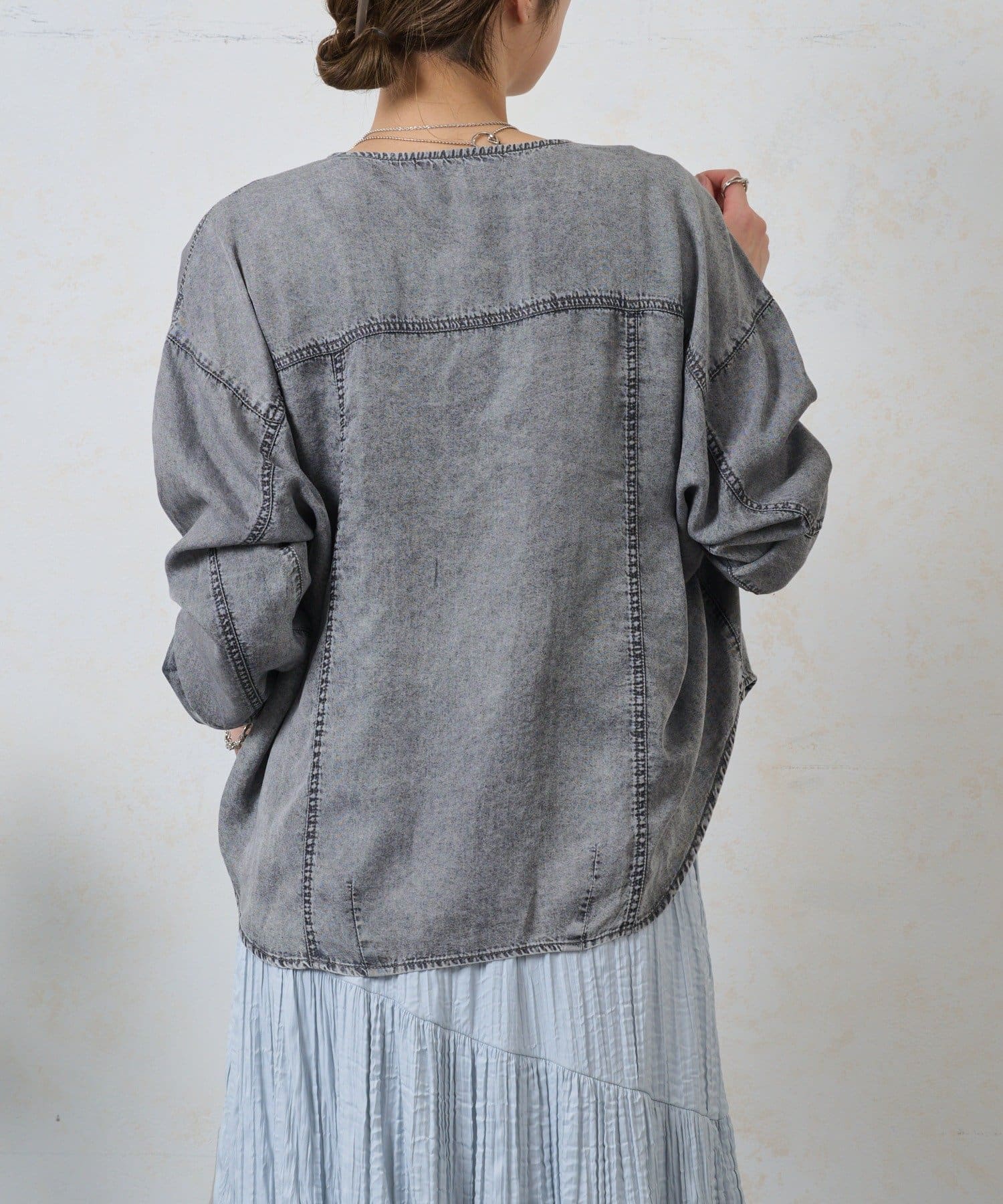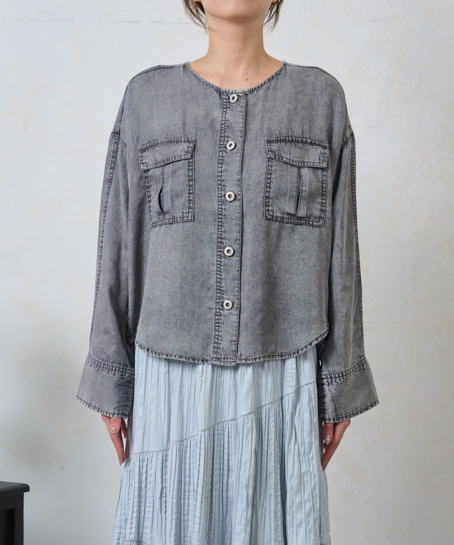 ・カジュアルになりすぎないよう、襟元はすっきりとしたバンドカラーを採用。