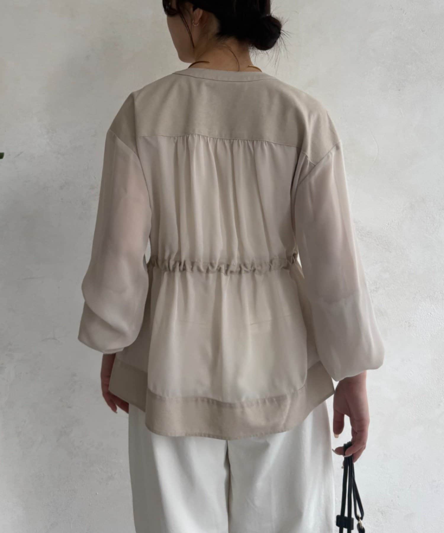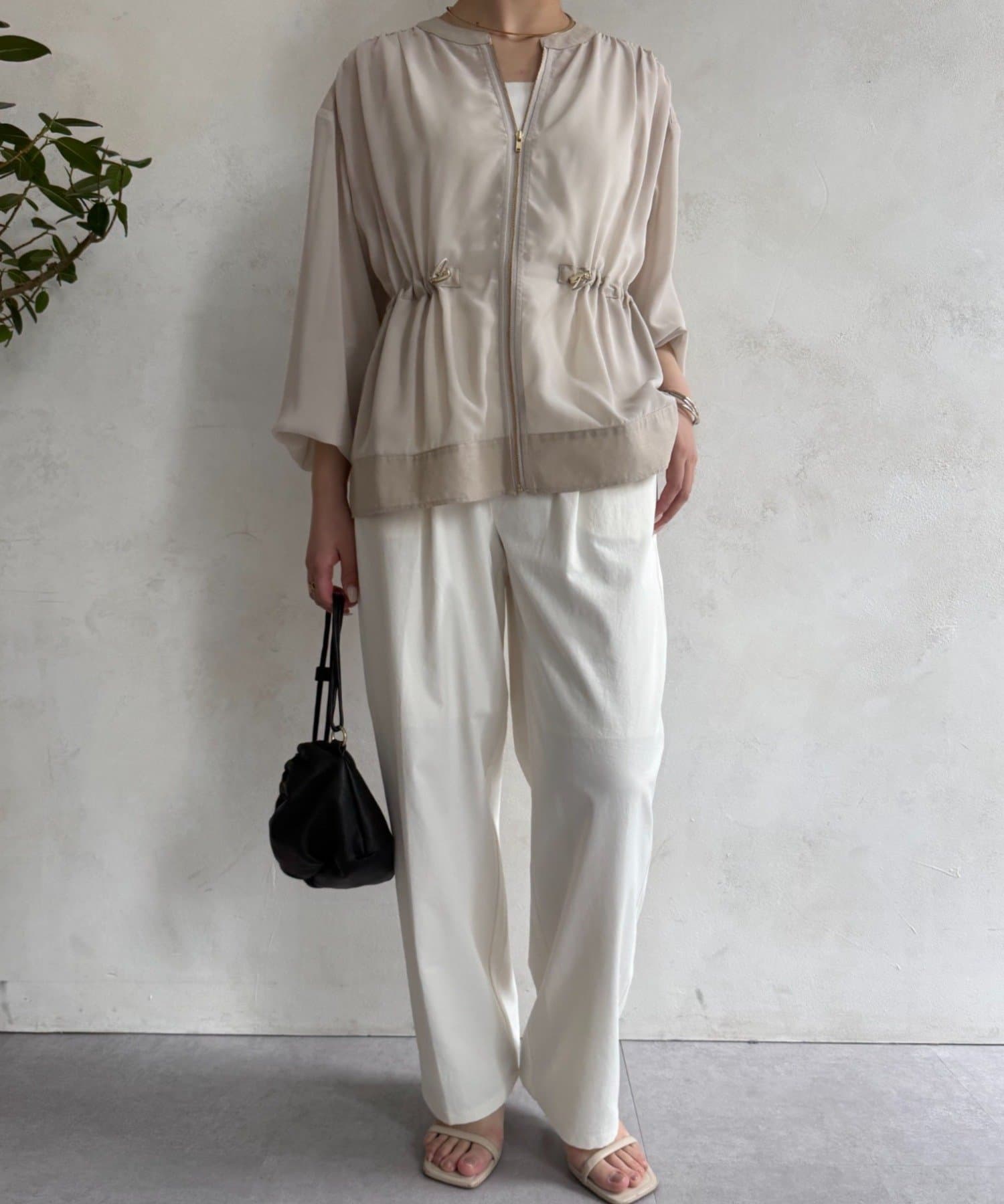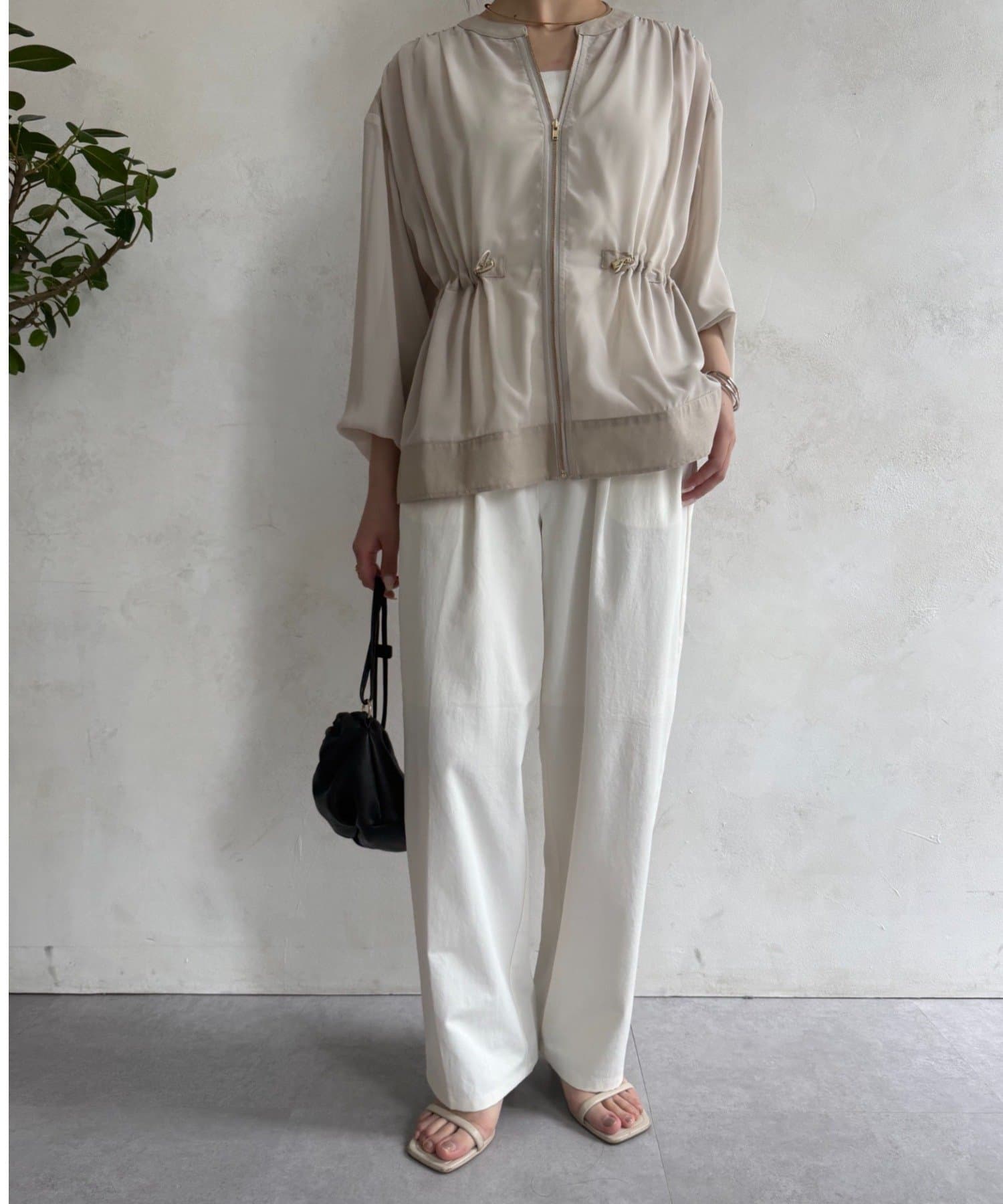 ・ ウエスト部分にはドロストコードを施し、お好みのシルエットに調整可能。絞ってフェミニンに、緩めてリラックス感のある着こなしも楽しめます。