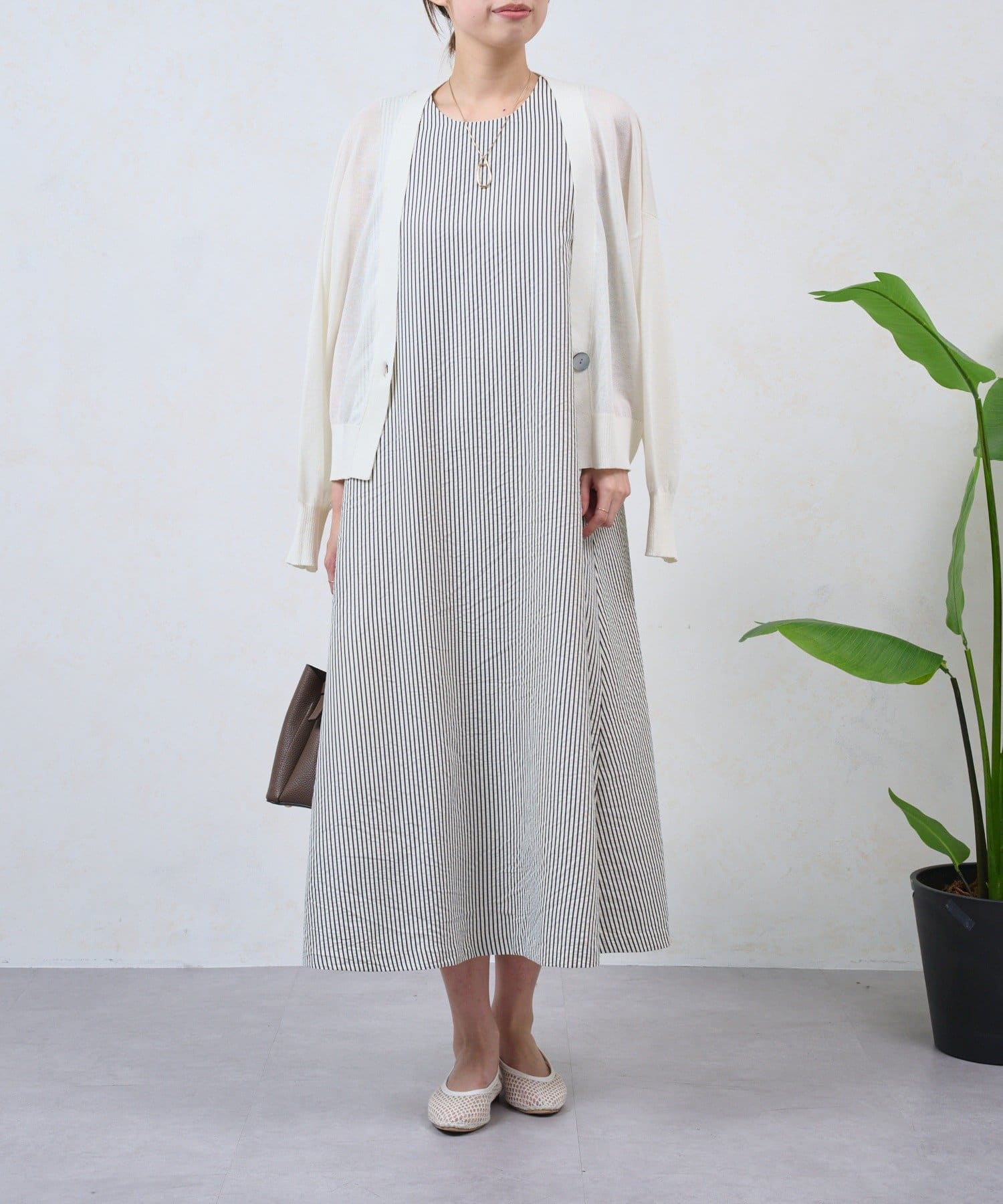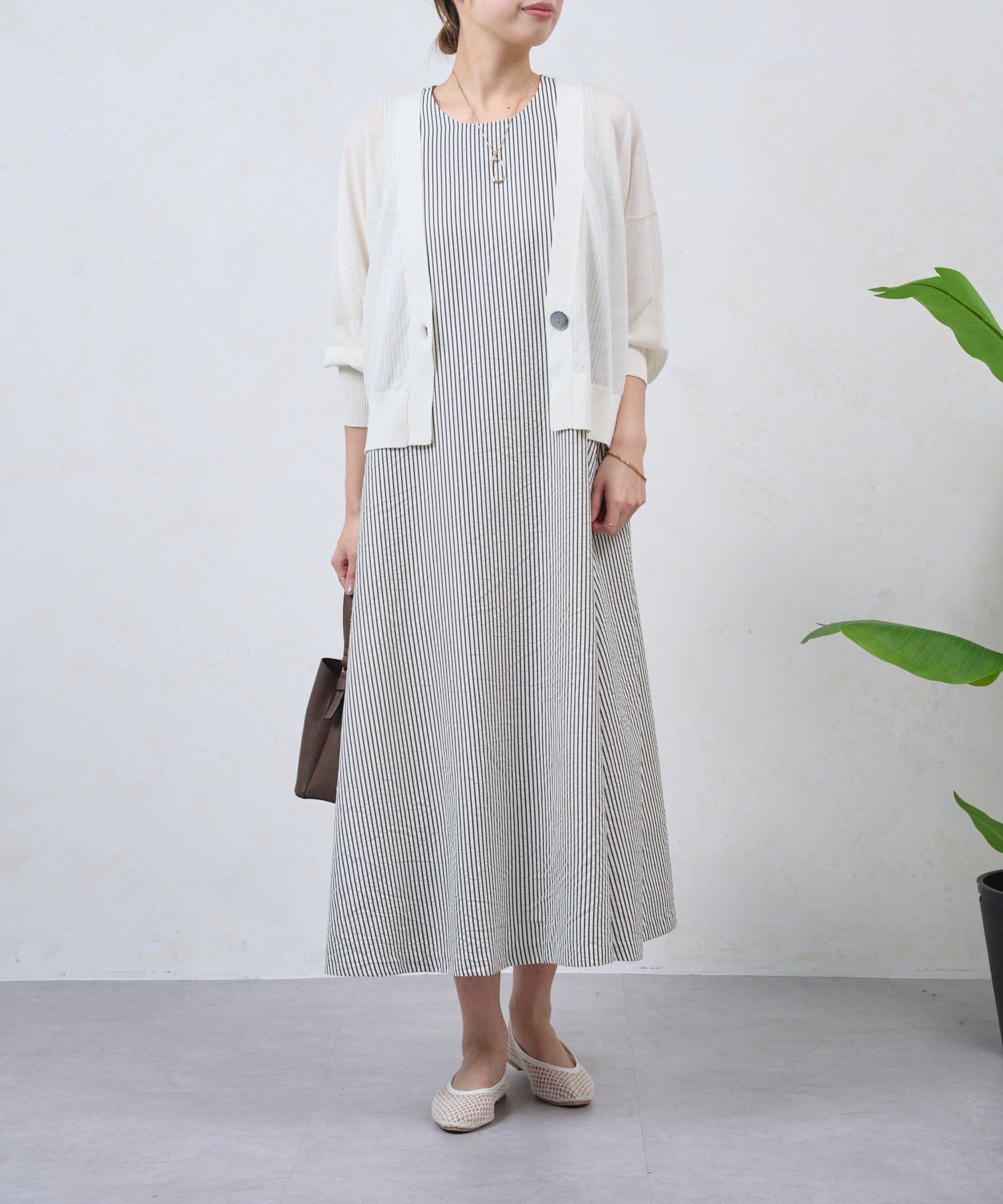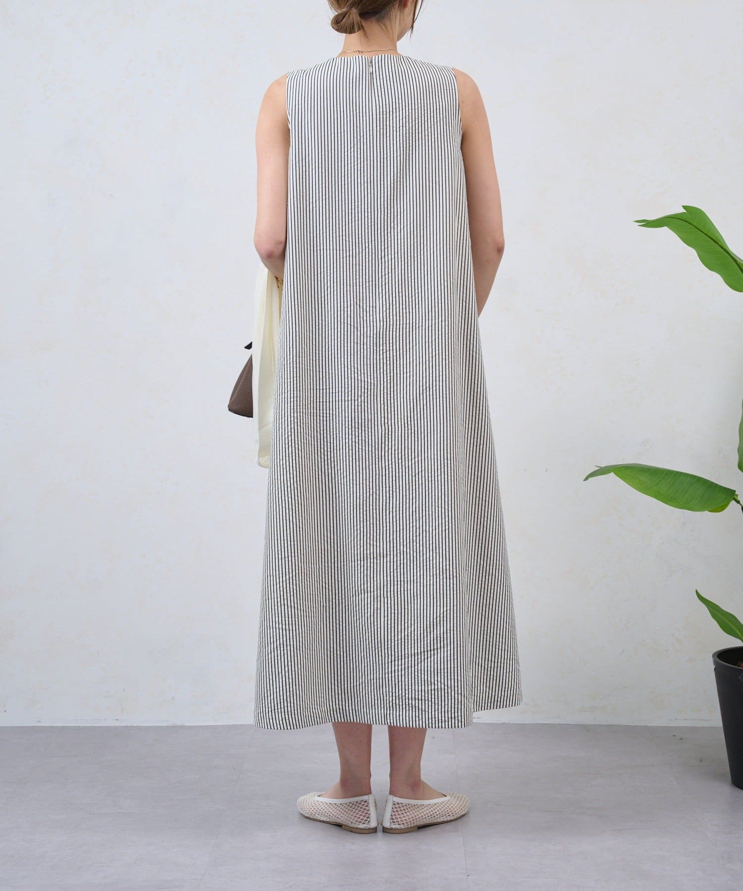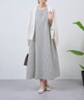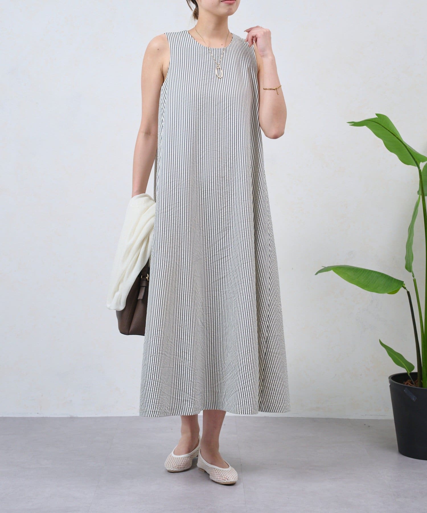 ・細めのストライプが、すっきりと上品な印象を演出してくれるノースリーブワンピース。