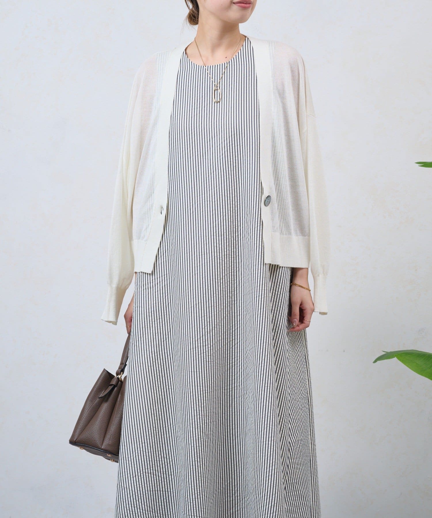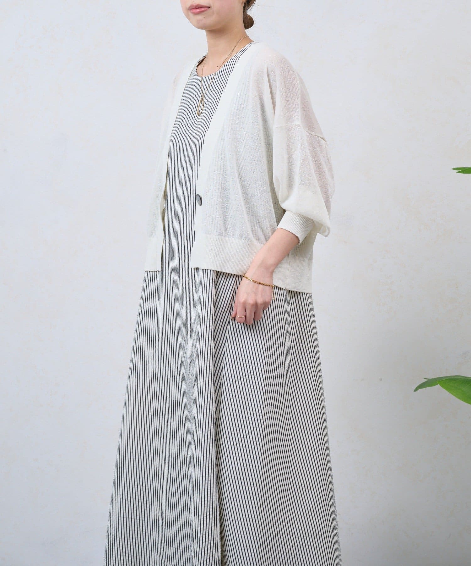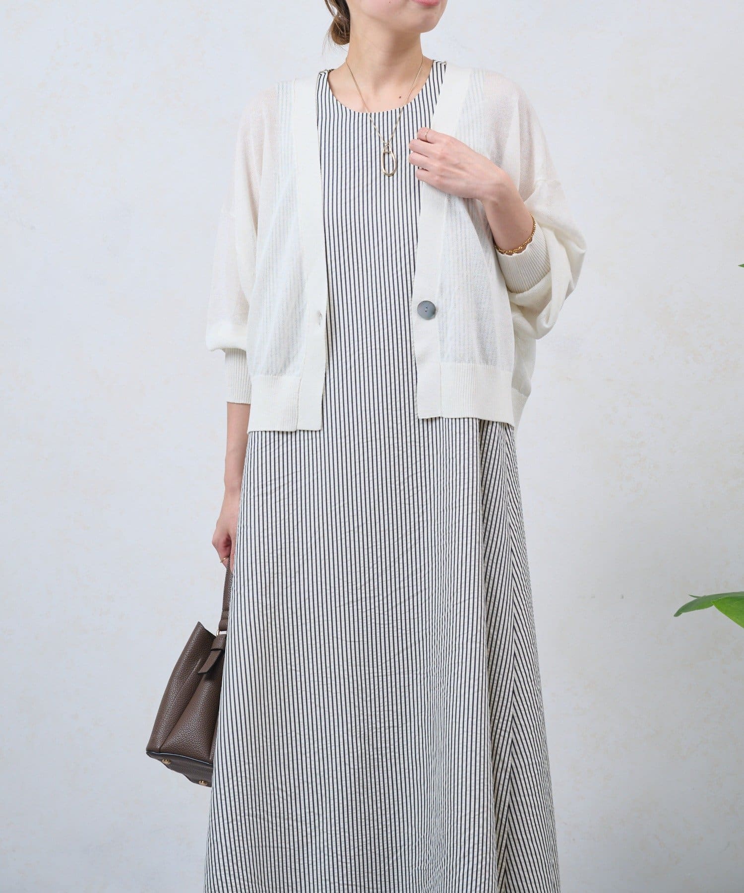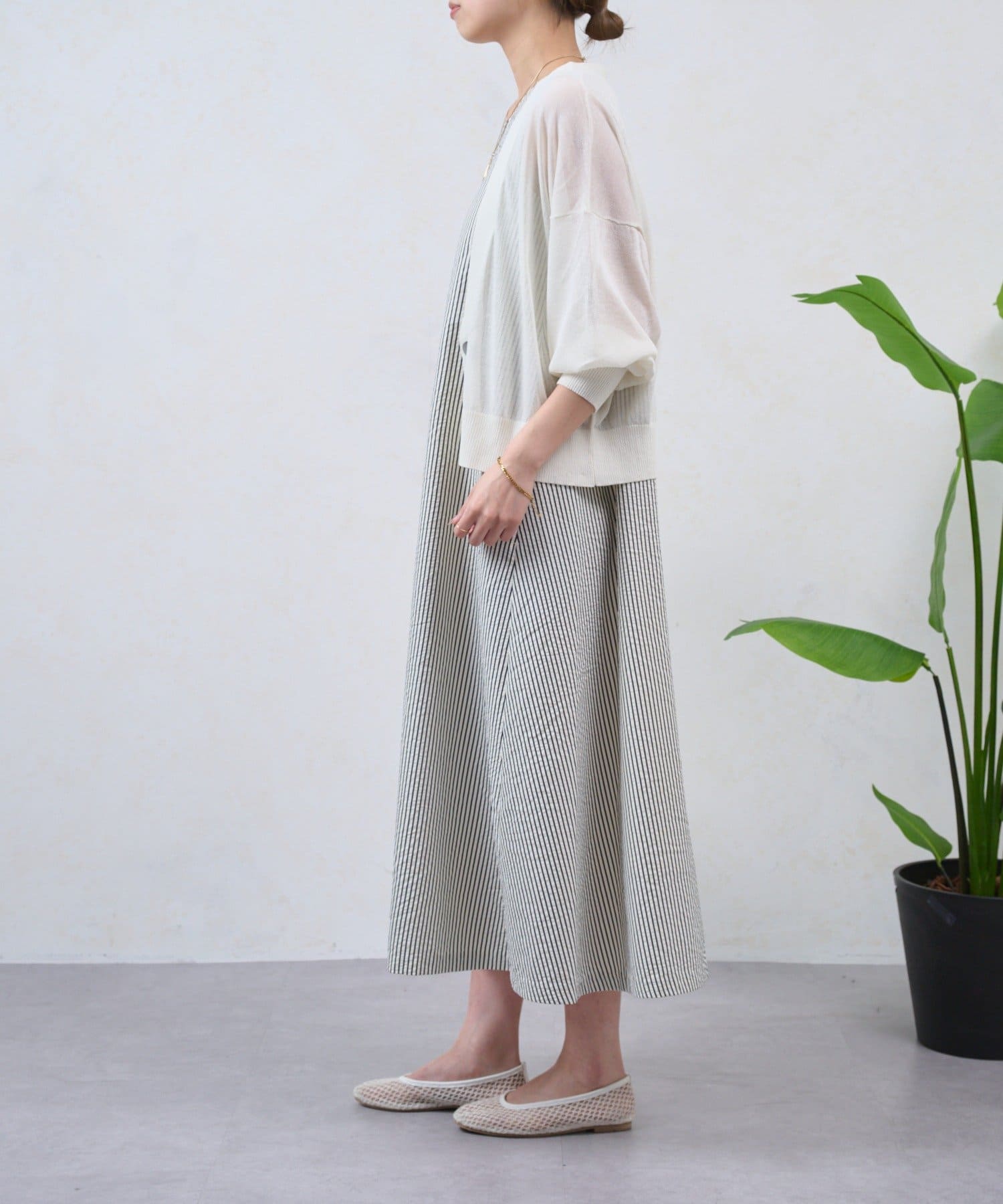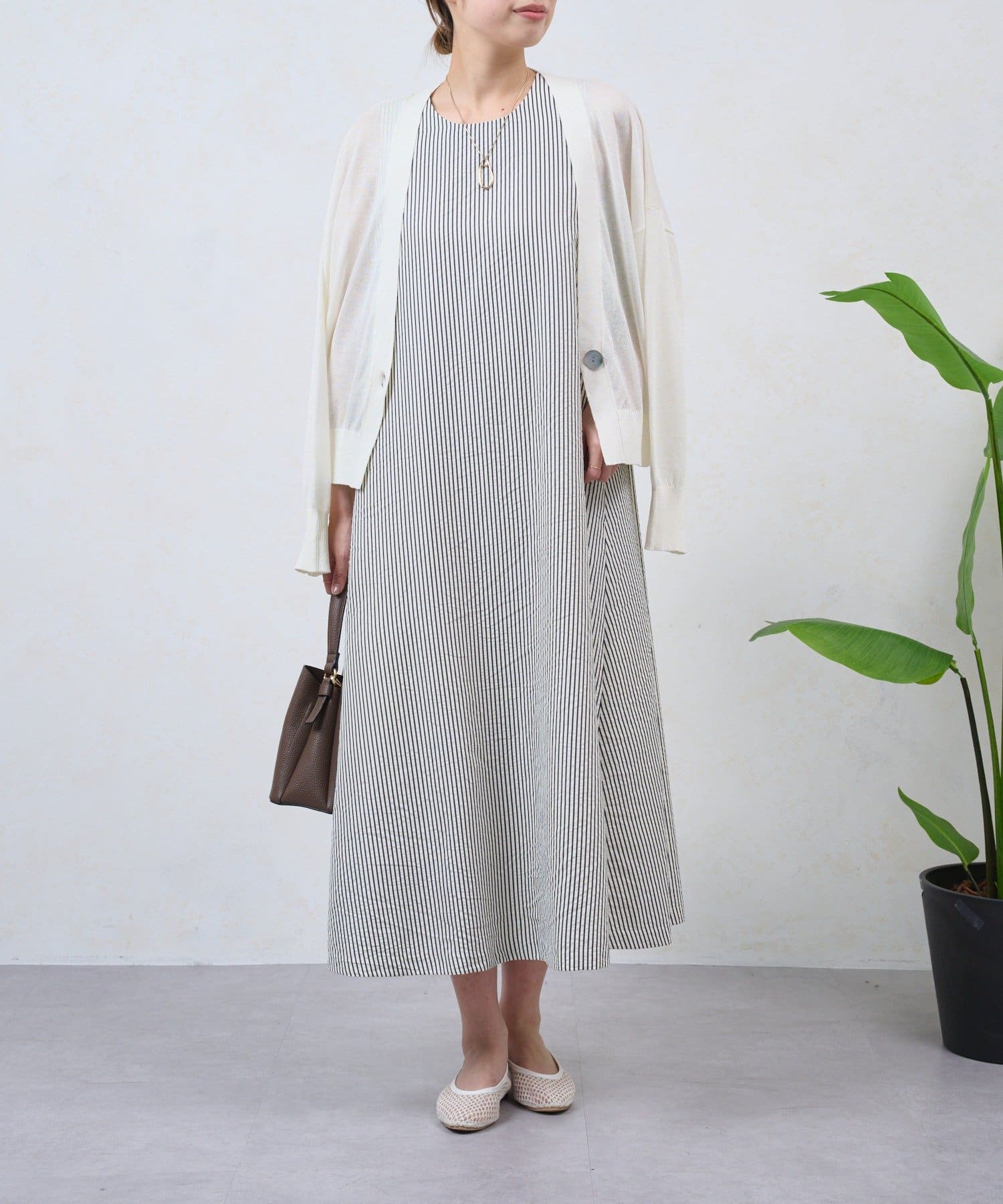 ・細めのストライプが、すっきりと上品な印象を演出してくれるノースリーブワンピース。